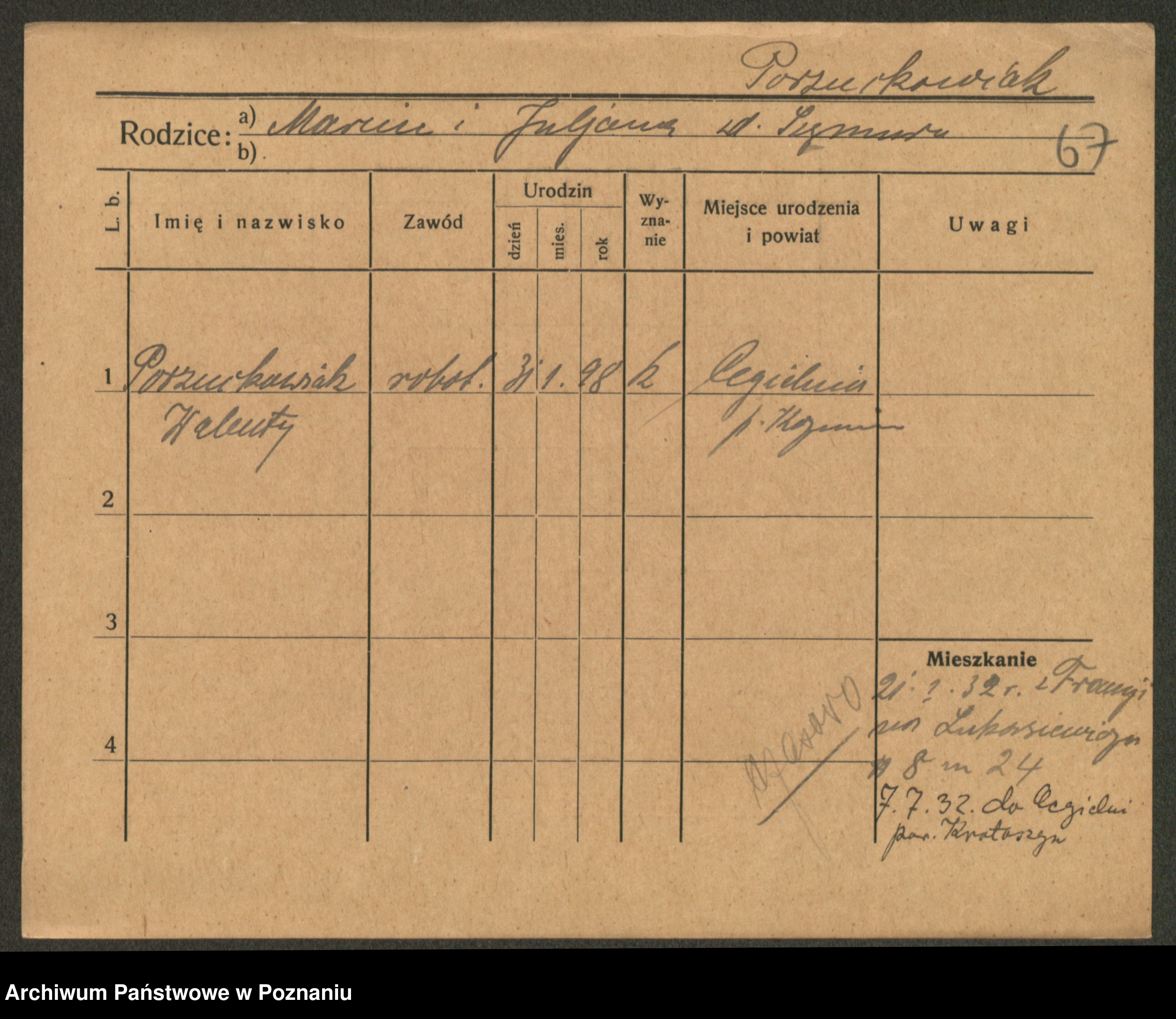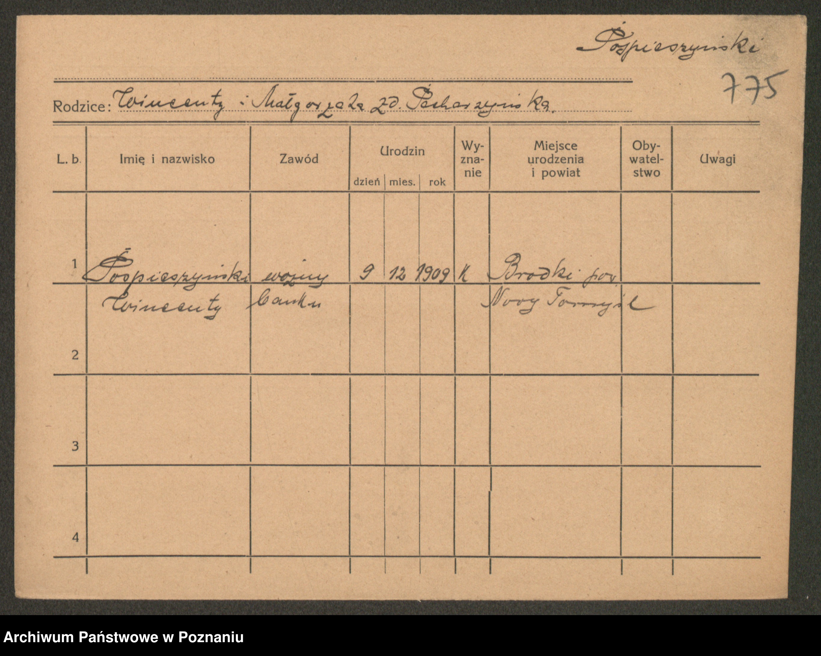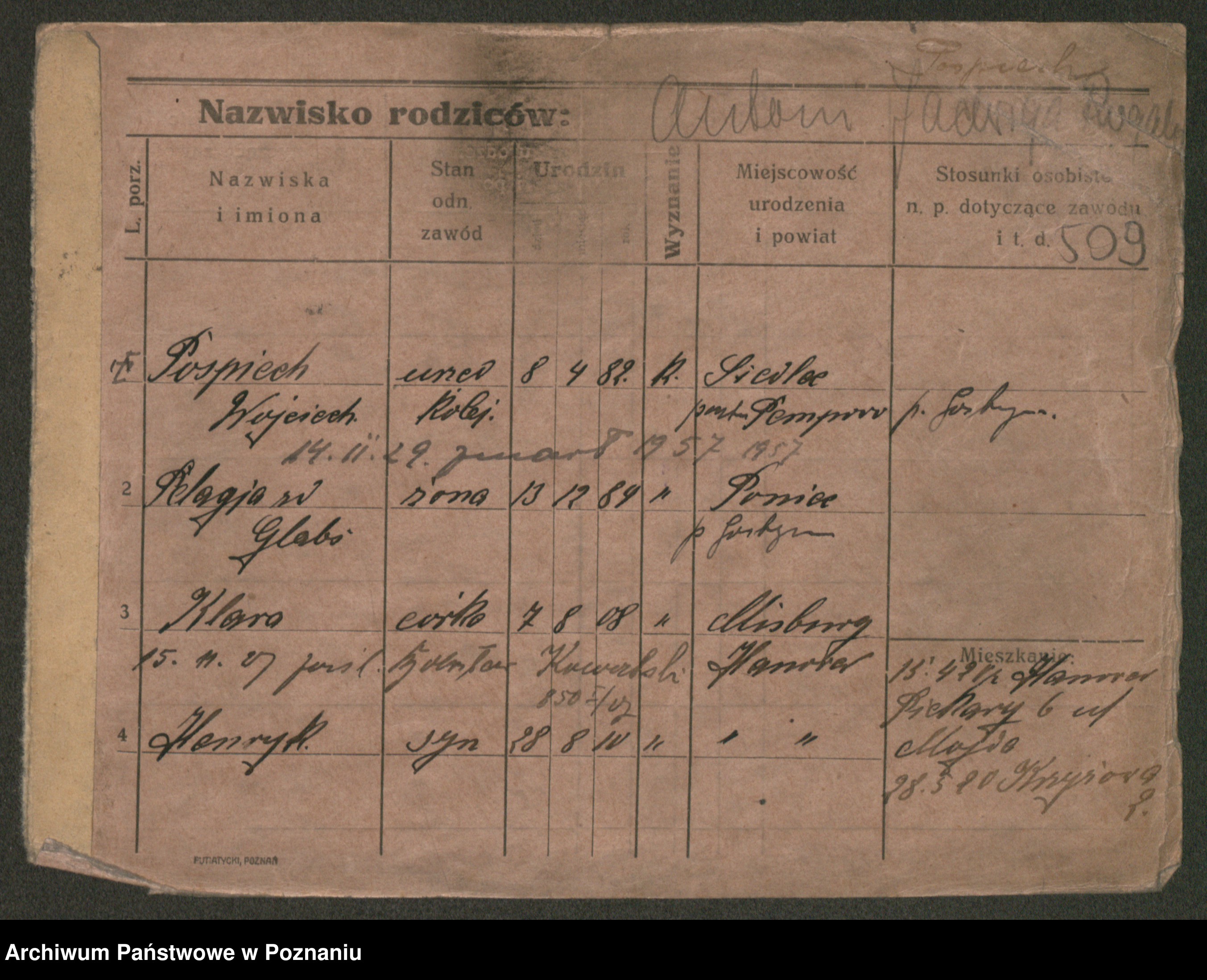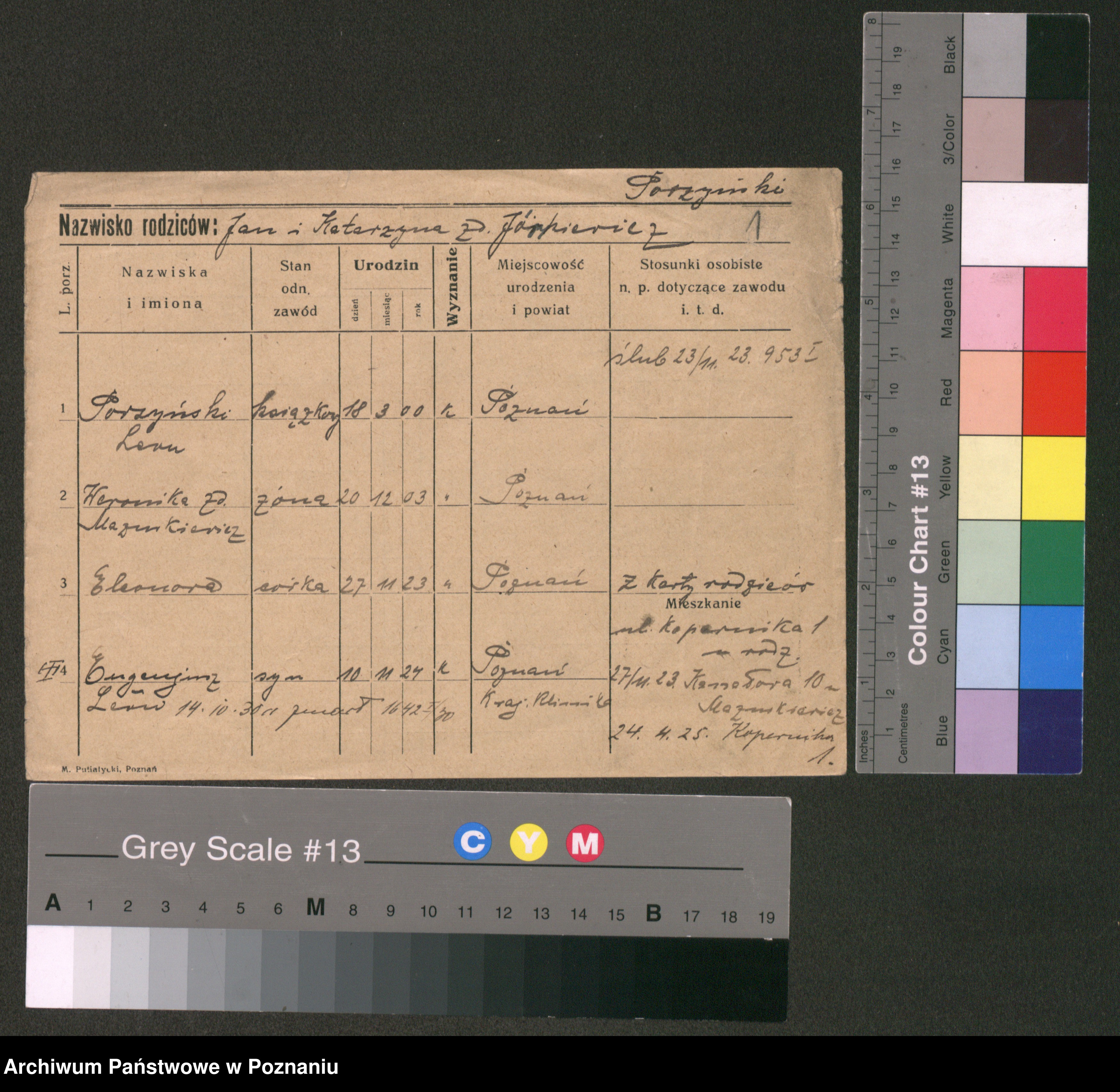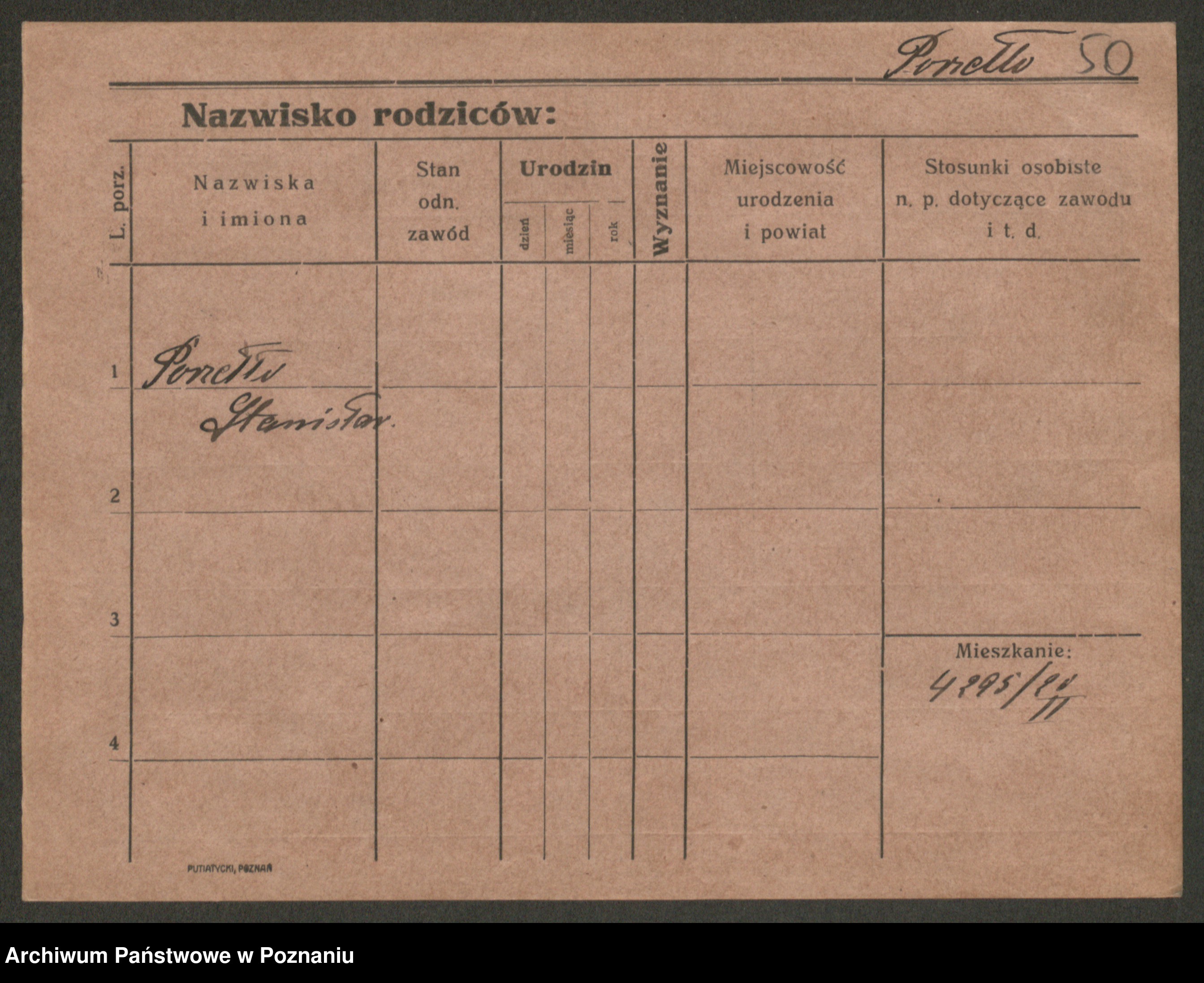 Podgląd karty osobowej dostępny jest po kliknięciu na nazwisko lub ikonkę karty. Można dokonywać powiększenia (ikony na górze) lub przechodzić między kolejnymi skanami (strzałki po bokach).