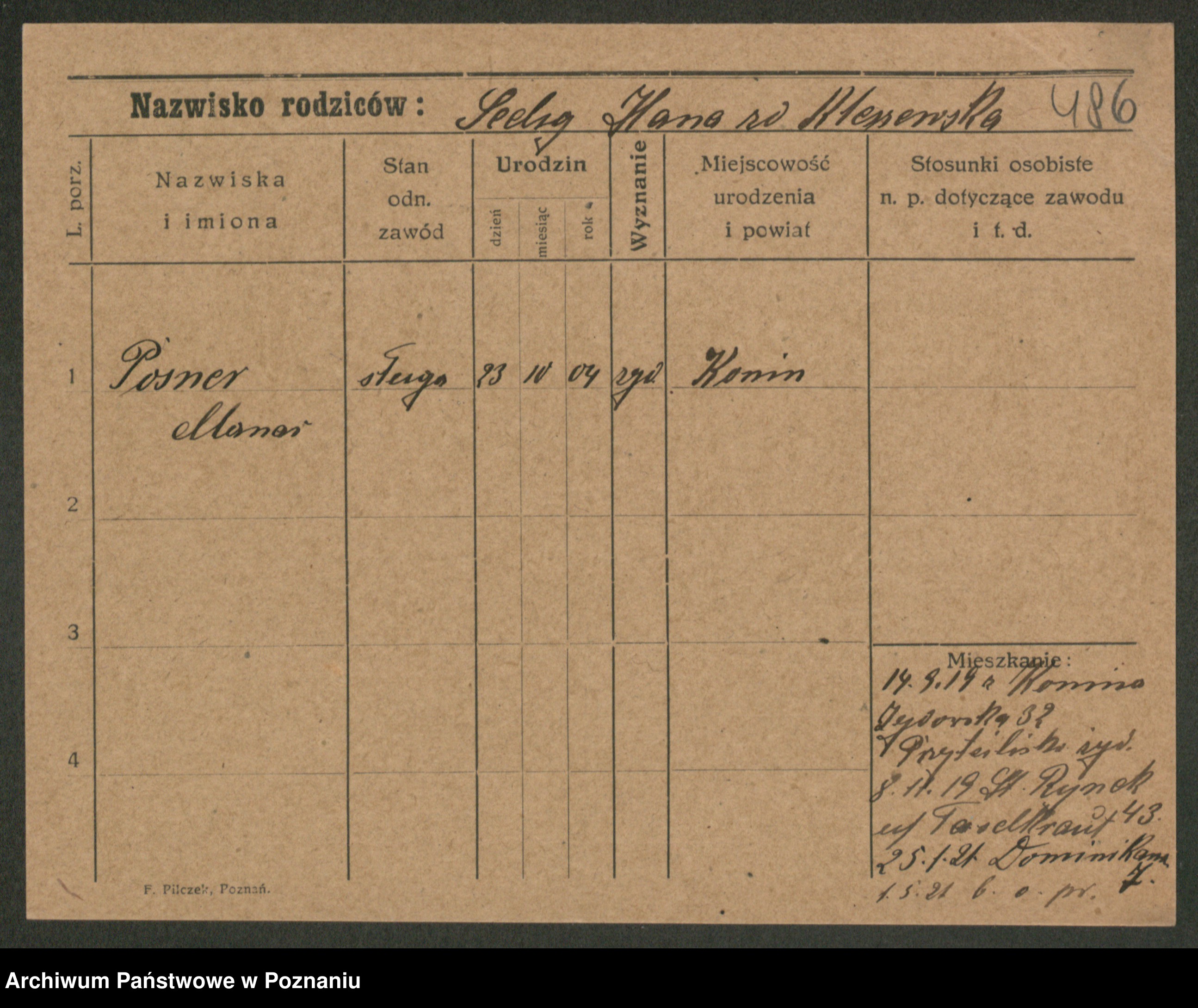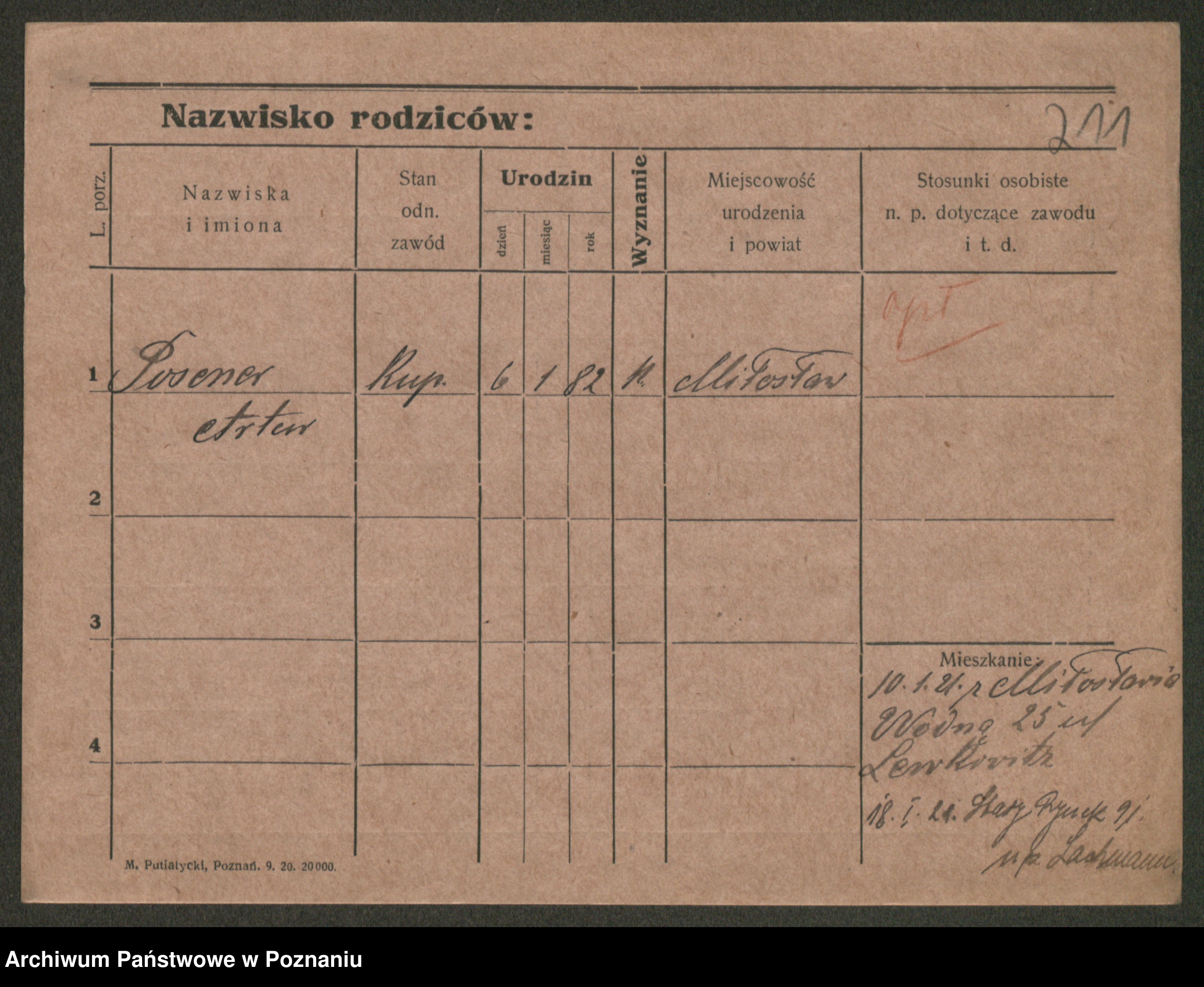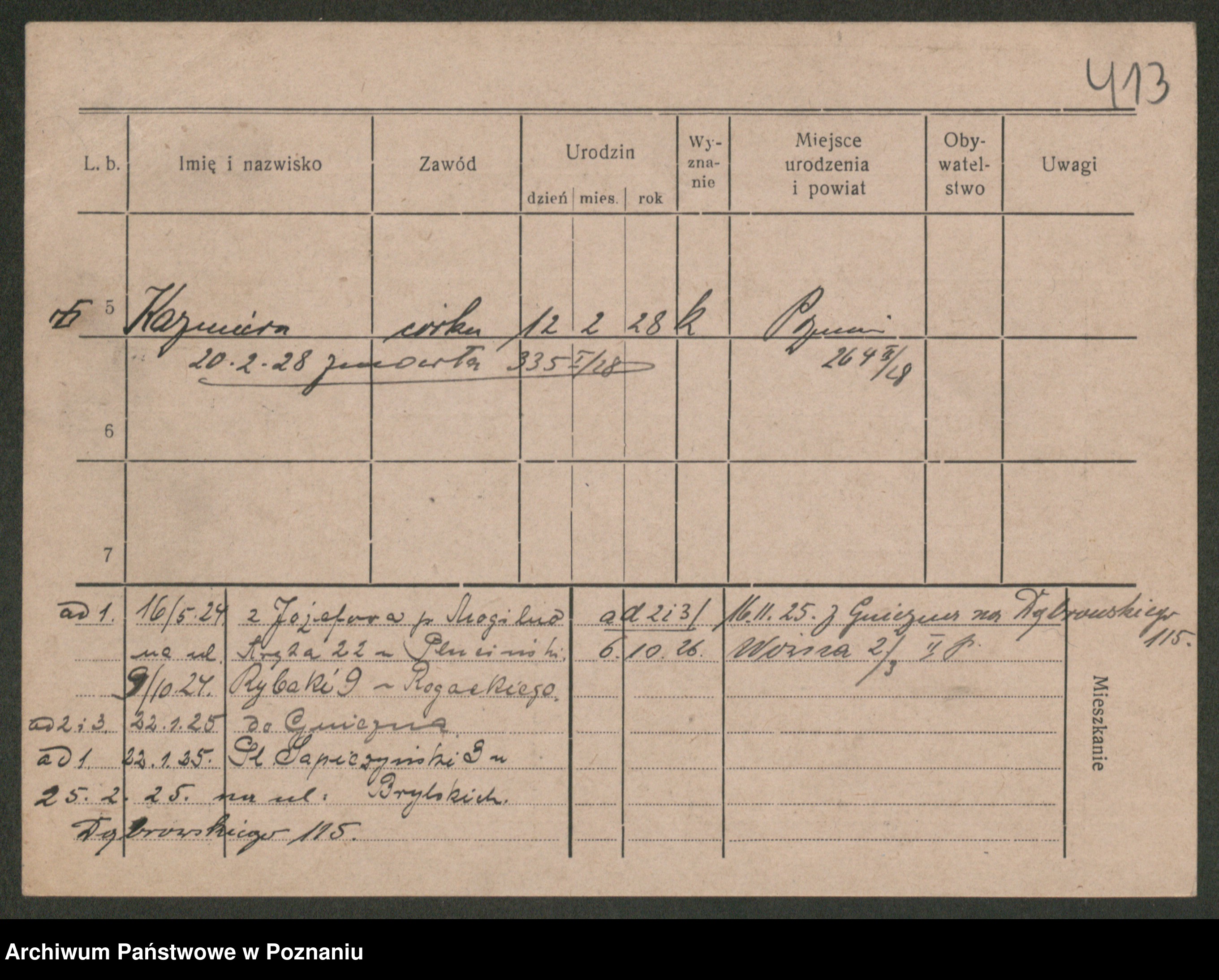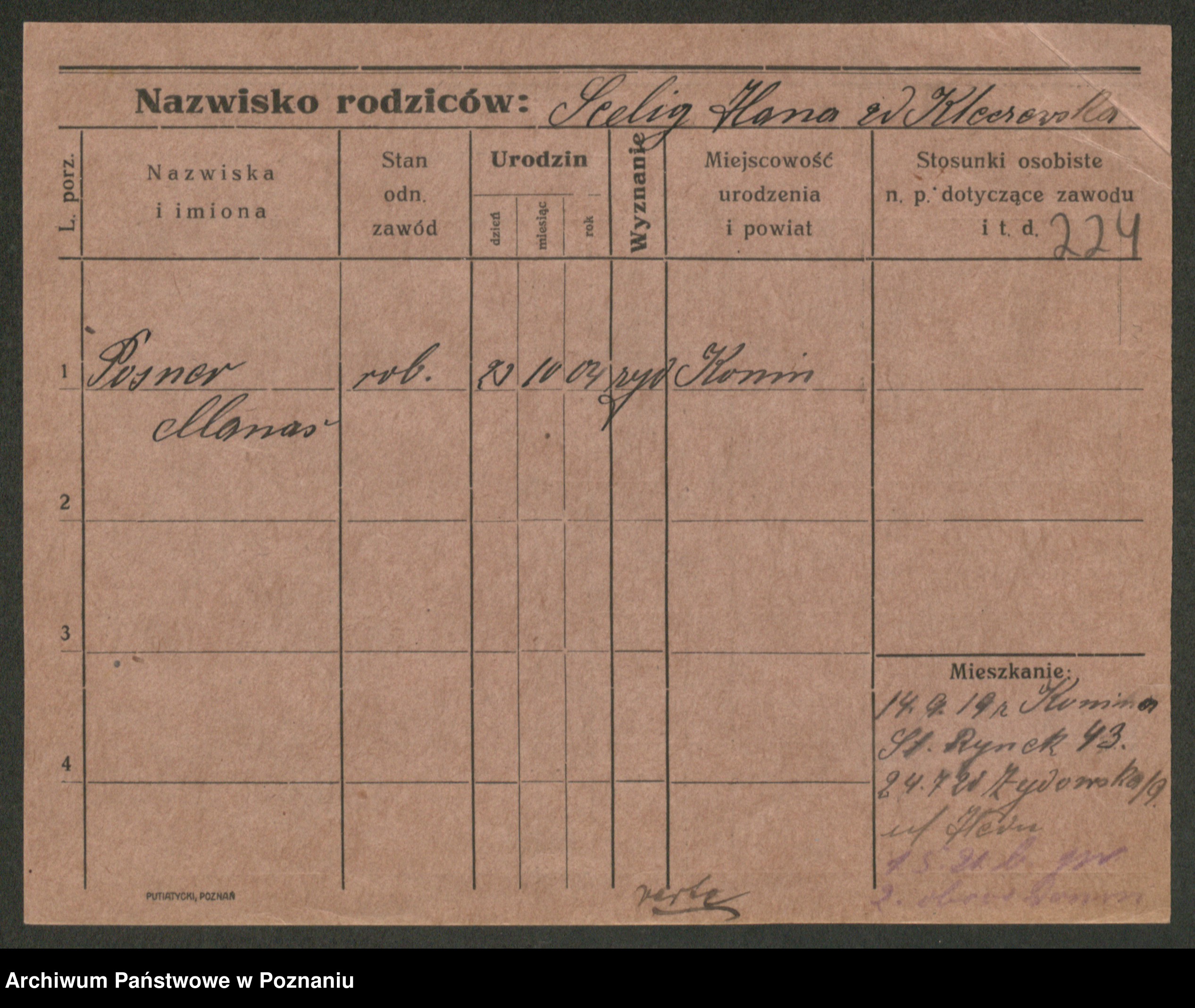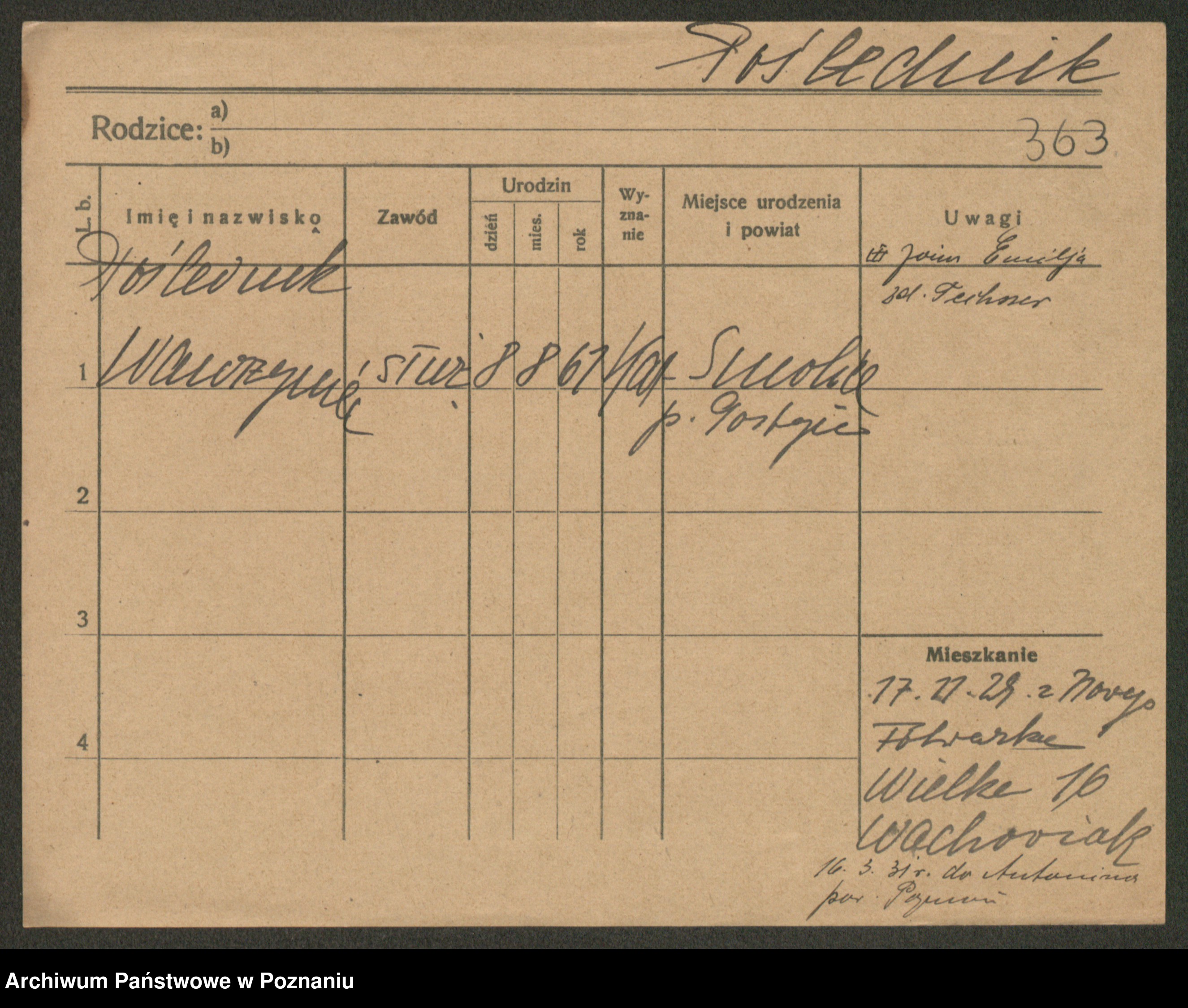 Podgląd karty osobowej dostępny jest po kliknięciu na nazwisko lub ikonkę karty. Można dokonywać powiększenia (ikony na górze) lub przechodzić między kolejnymi skanami (strzałki po bokach).