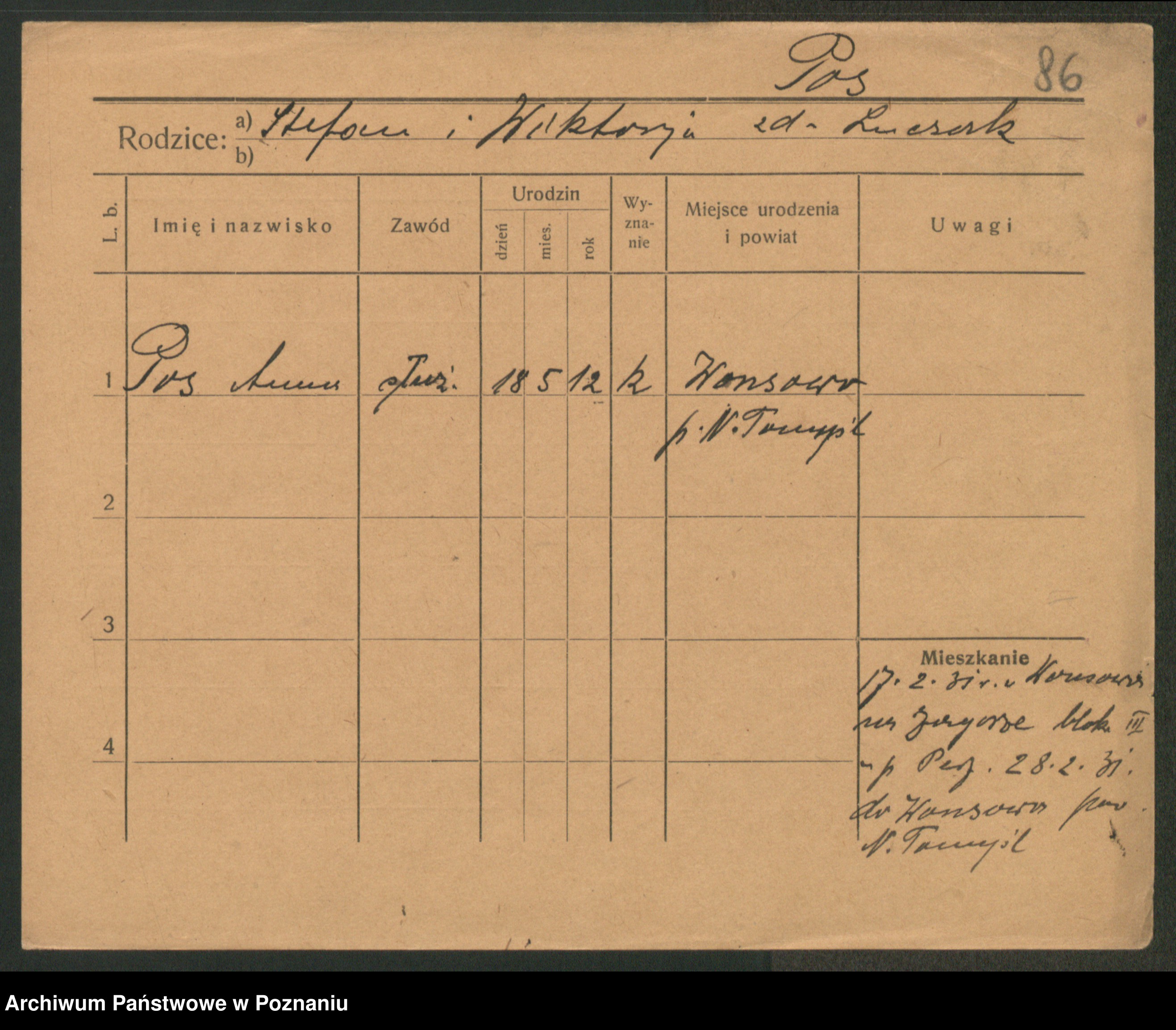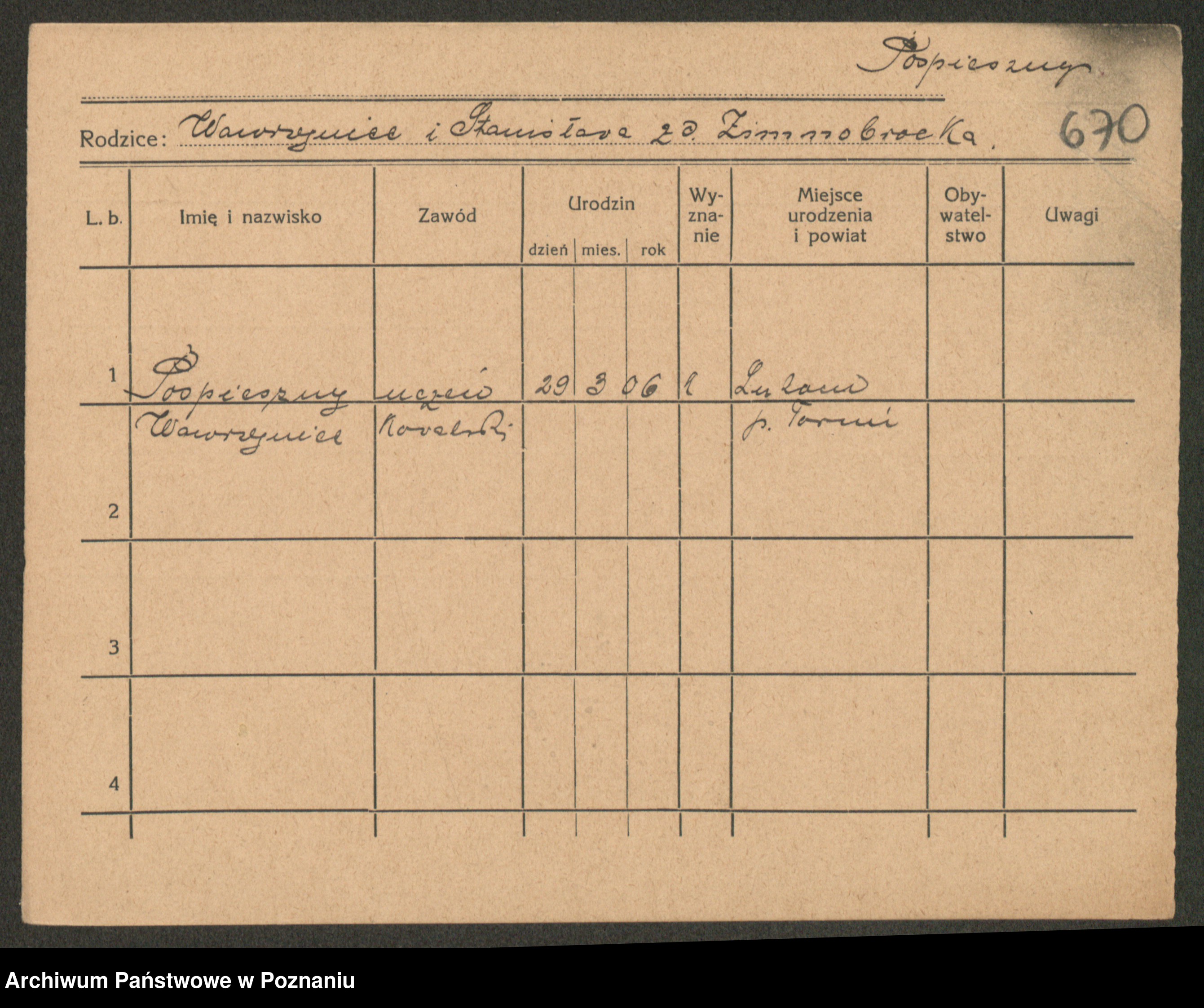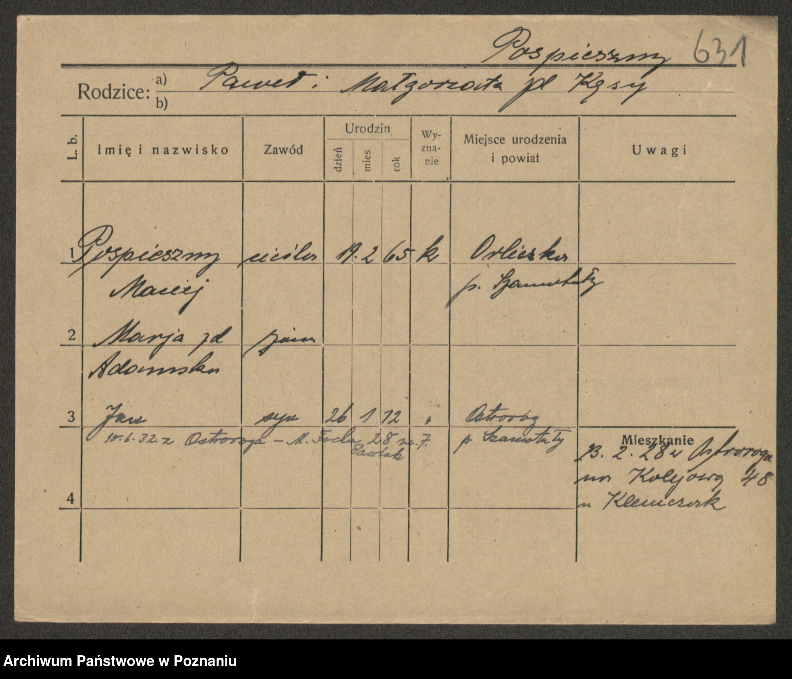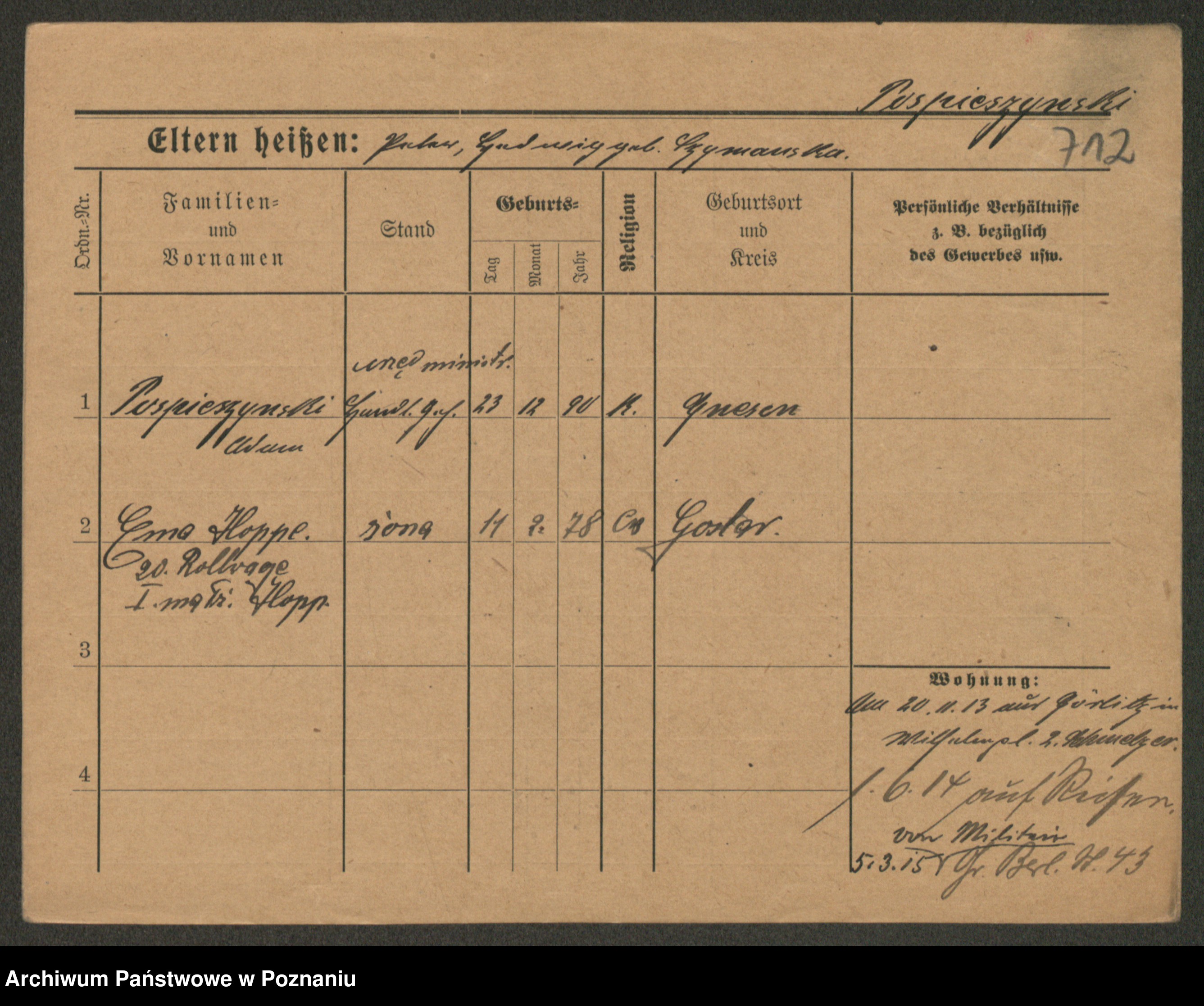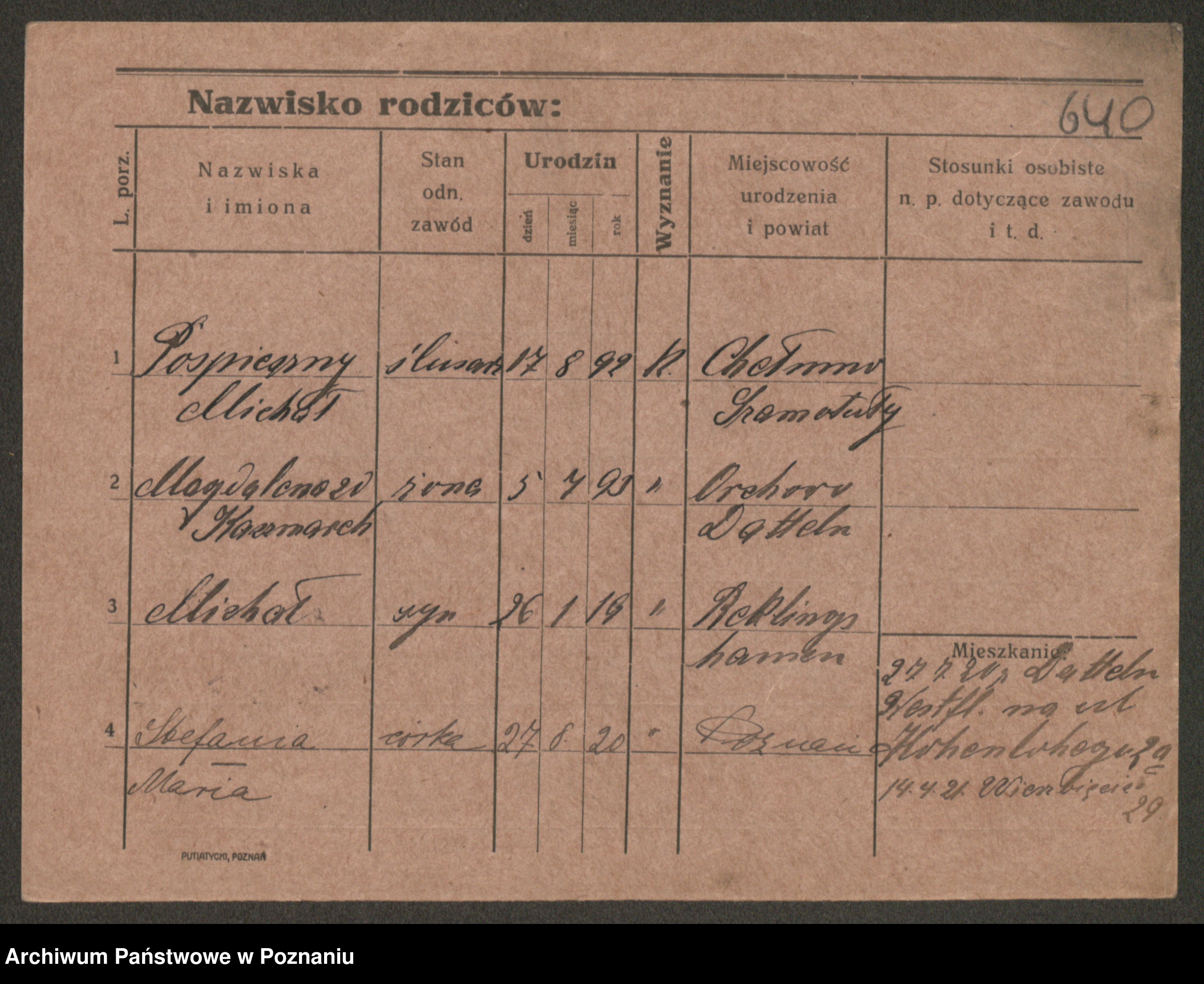 Podgląd karty osobowej dostępny jest po kliknięciu na nazwisko lub ikonkę karty. Można dokonywać powiększenia (ikony na górze) lub przechodzić między kolejnymi skanami (strzałki po bokach).
