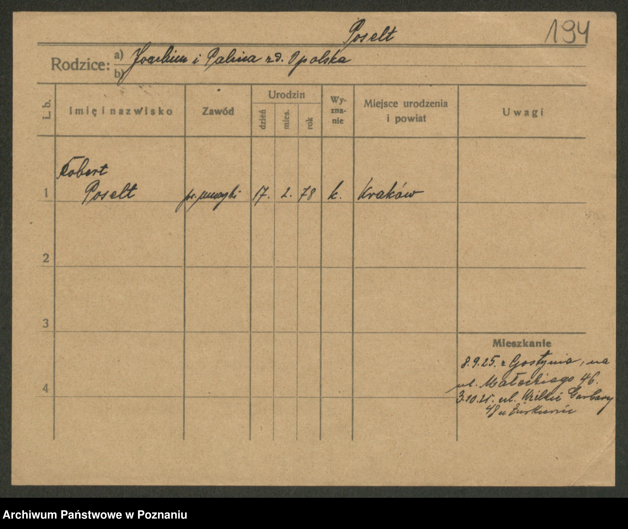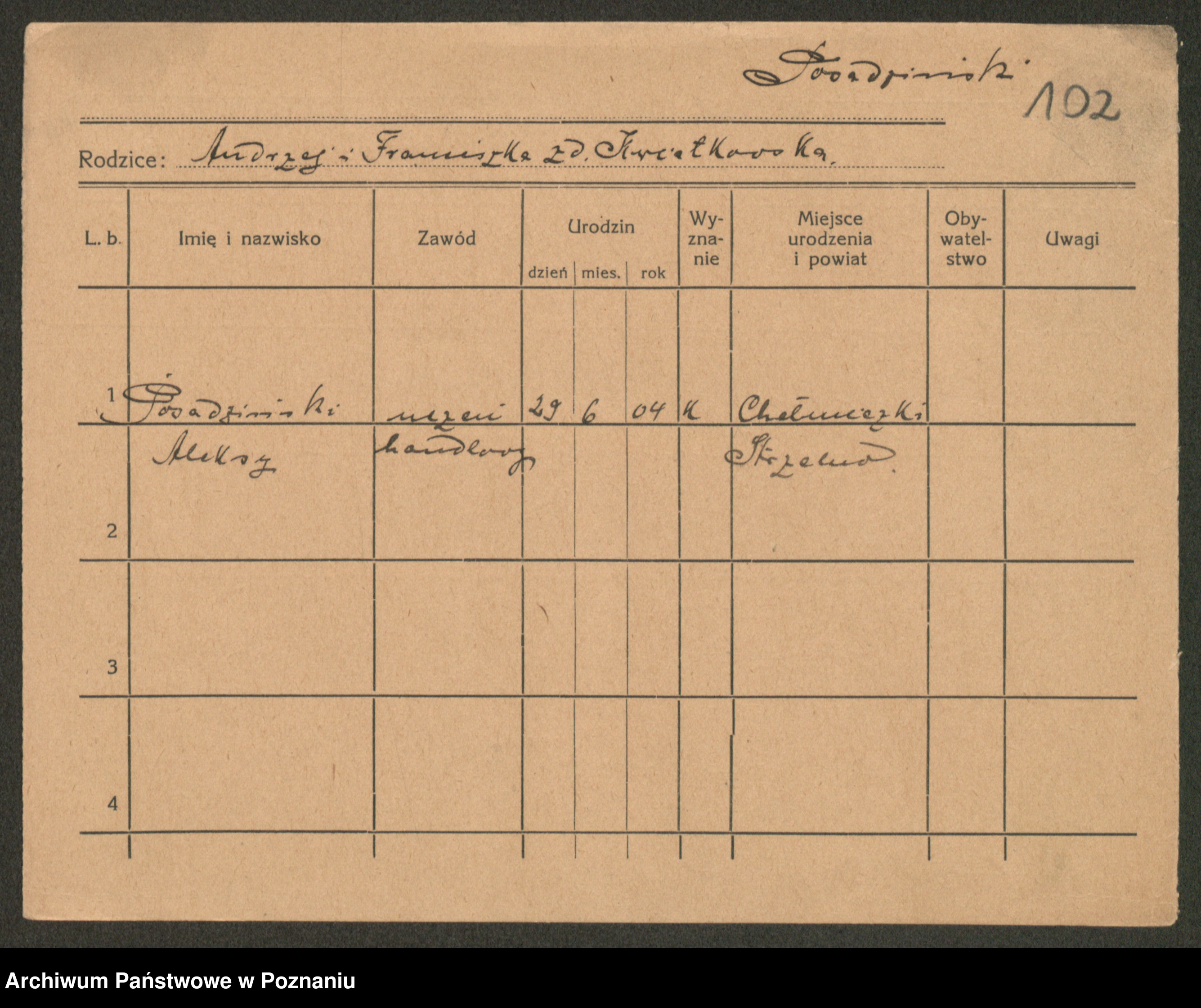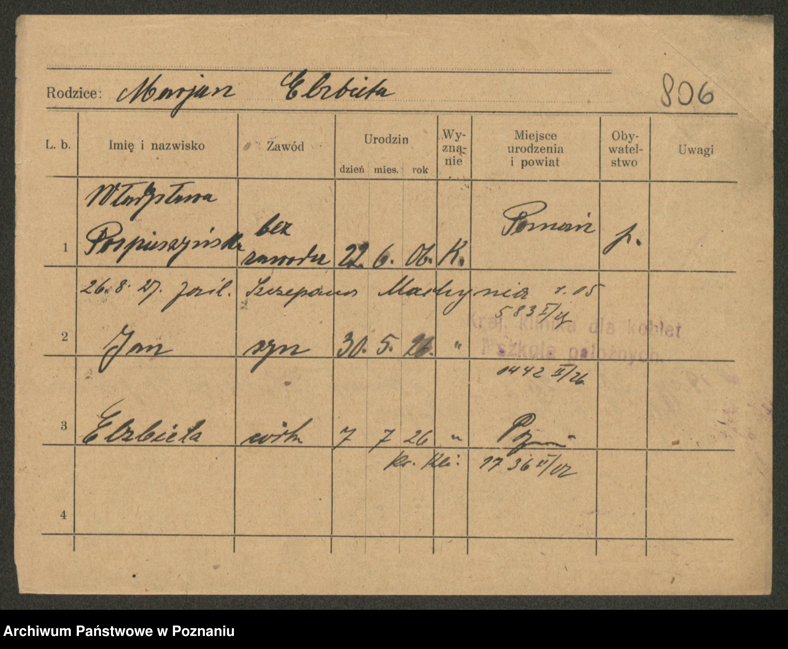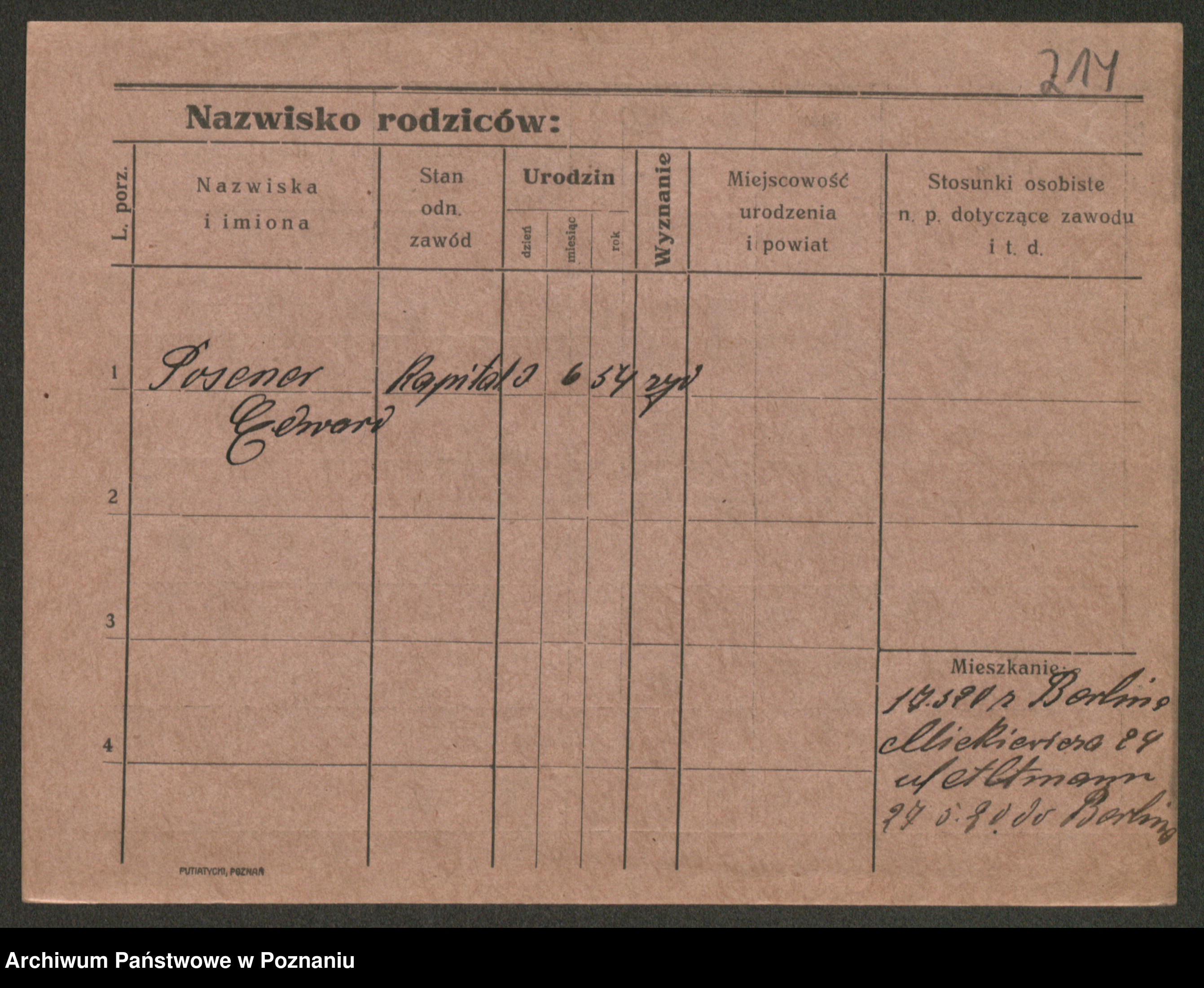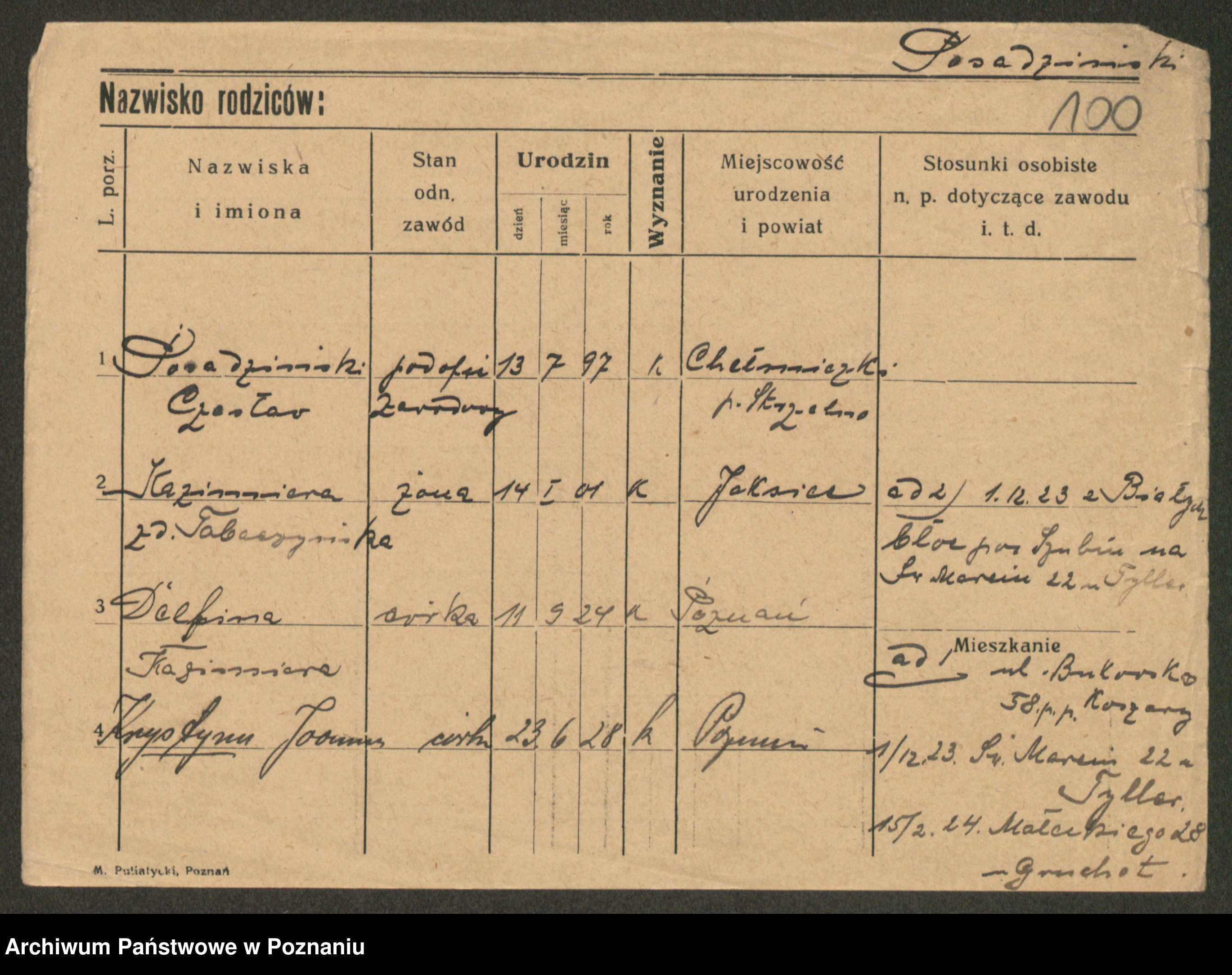 Podgląd karty osobowej dostępny jest po kliknięciu na nazwisko lub ikonkę karty. Można dokonywać powiększenia (ikony na górze) lub przechodzić między kolejnymi skanami (strzałki po bokach).
