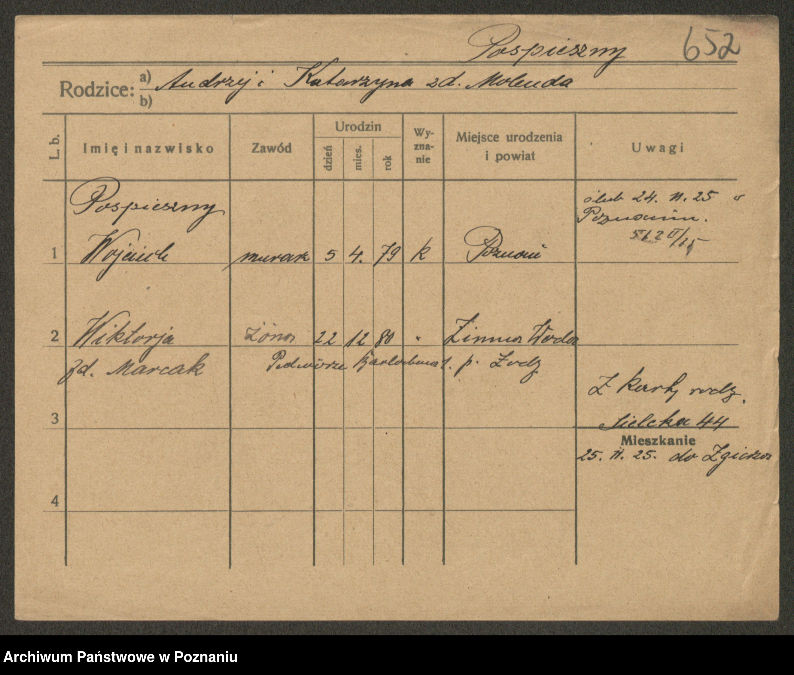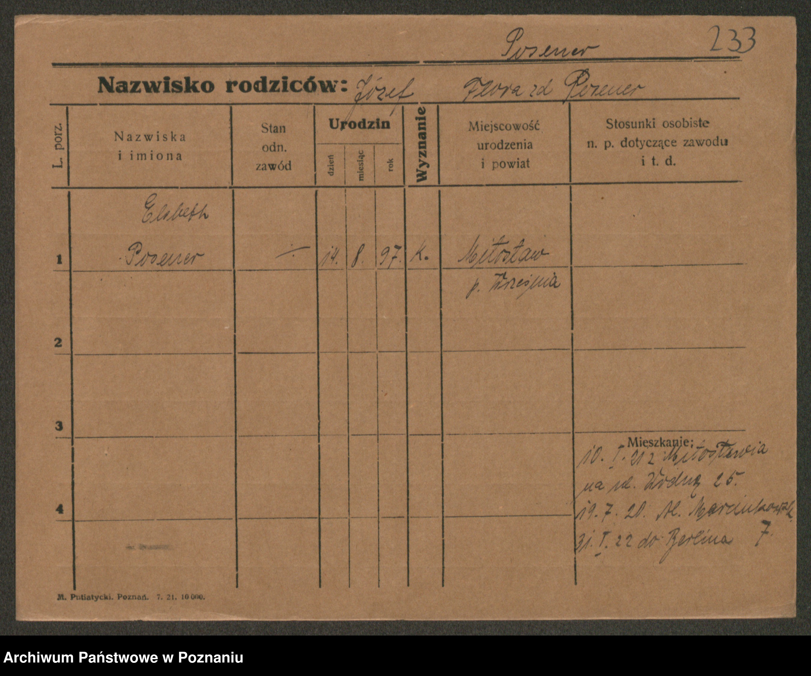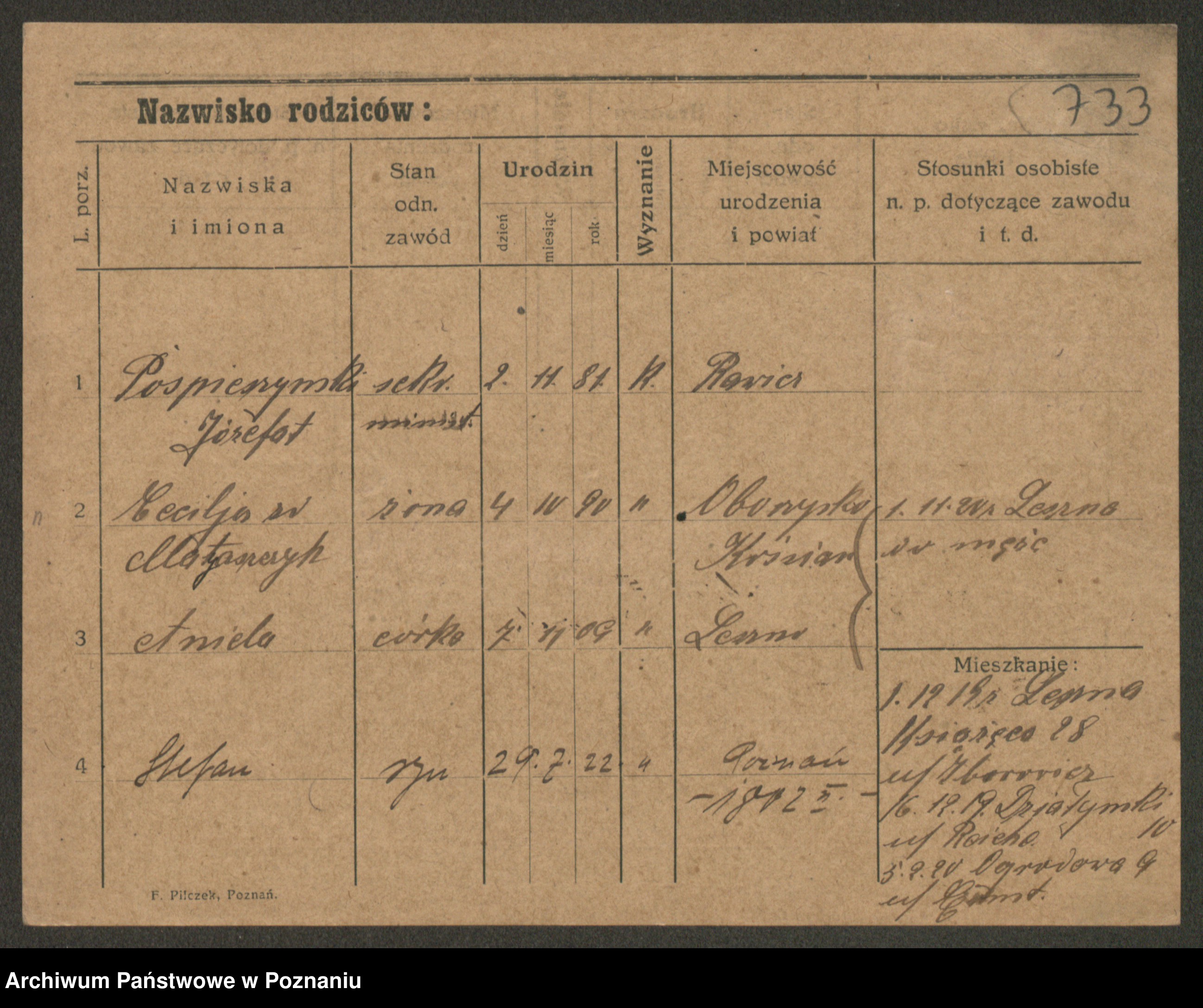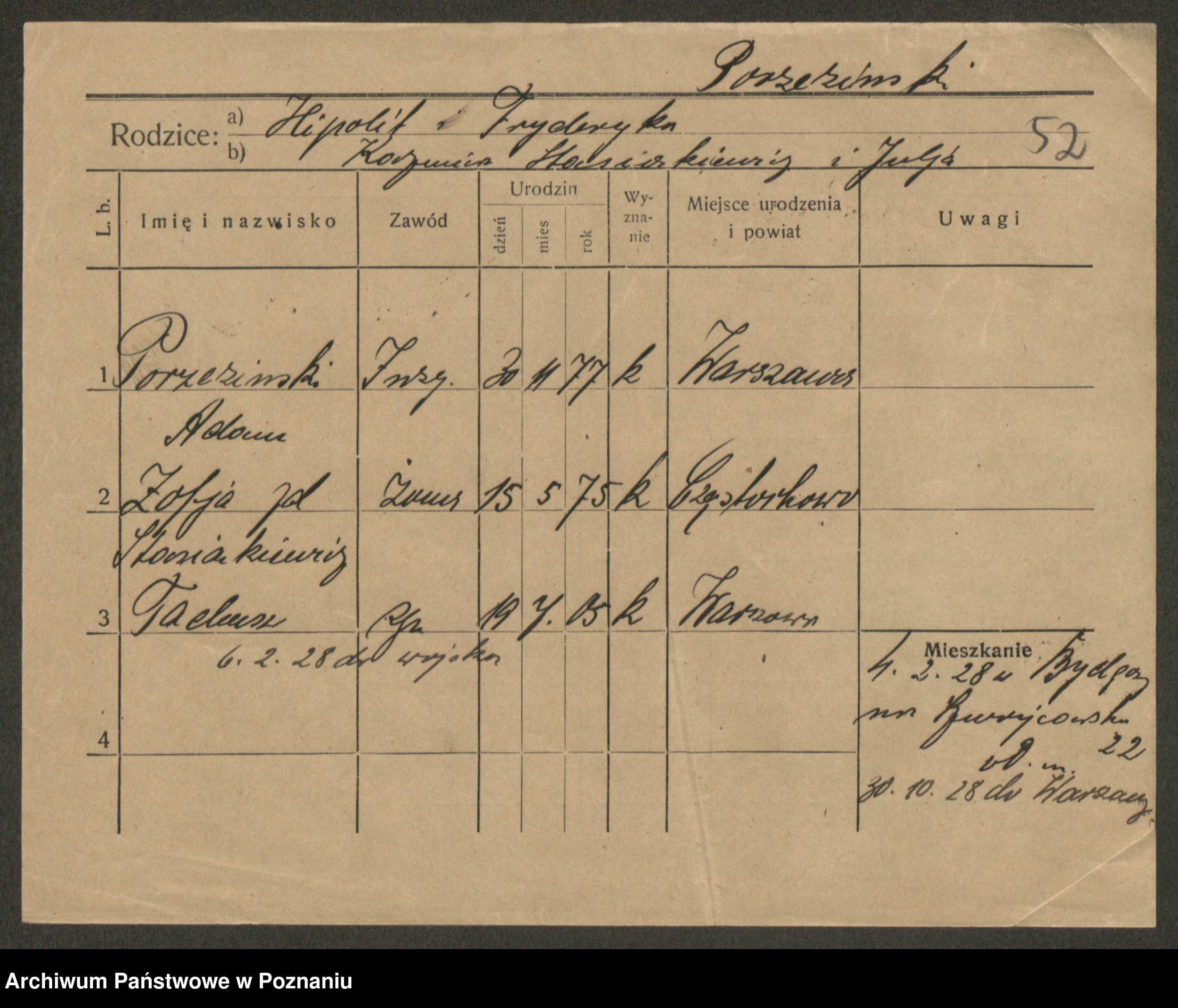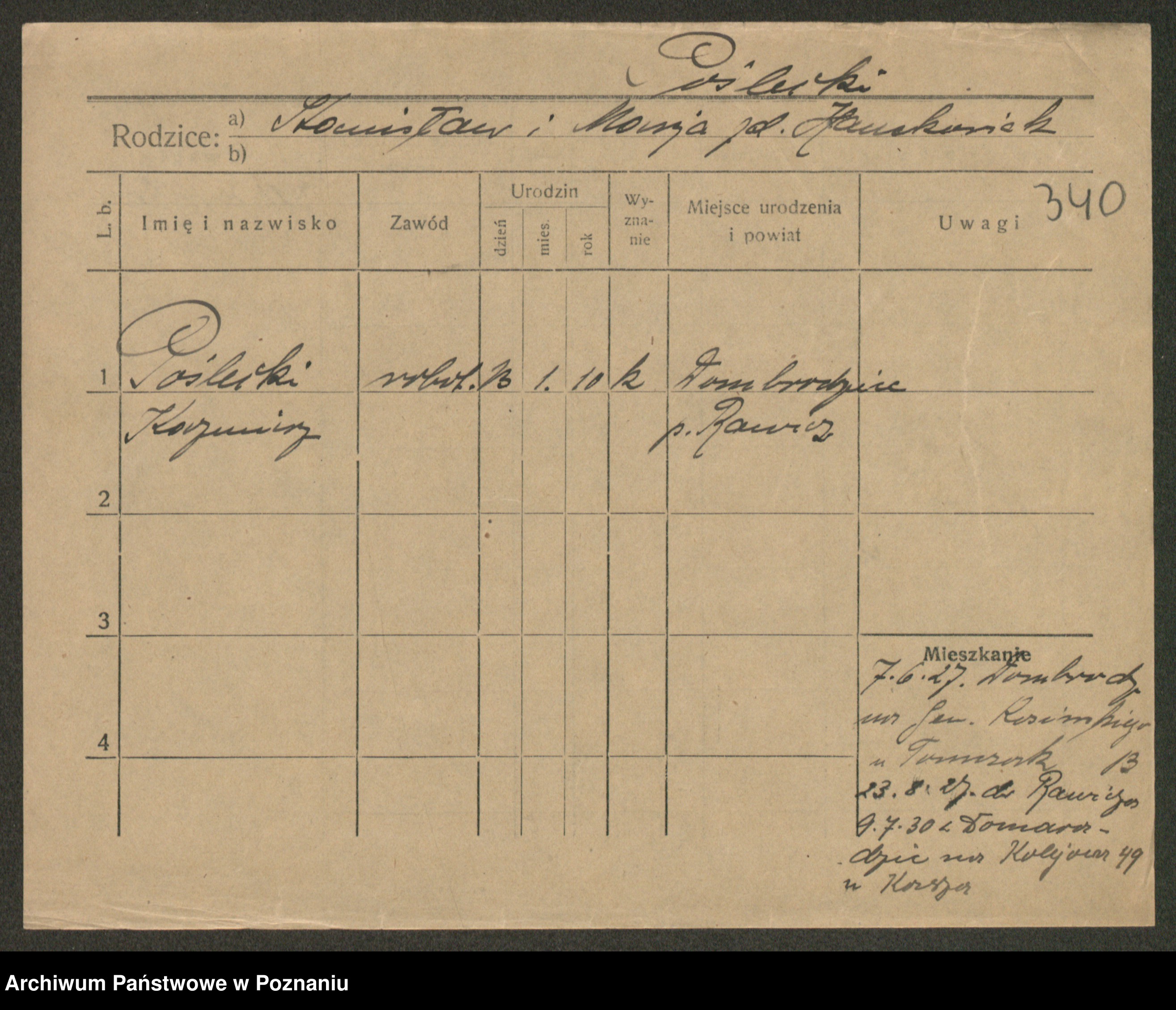 Podgląd karty osobowej dostępny jest po kliknięciu na nazwisko lub ikonkę karty. Można dokonywać powiększenia (ikony na górze) lub przechodzić między kolejnymi skanami (strzałki po bokach).