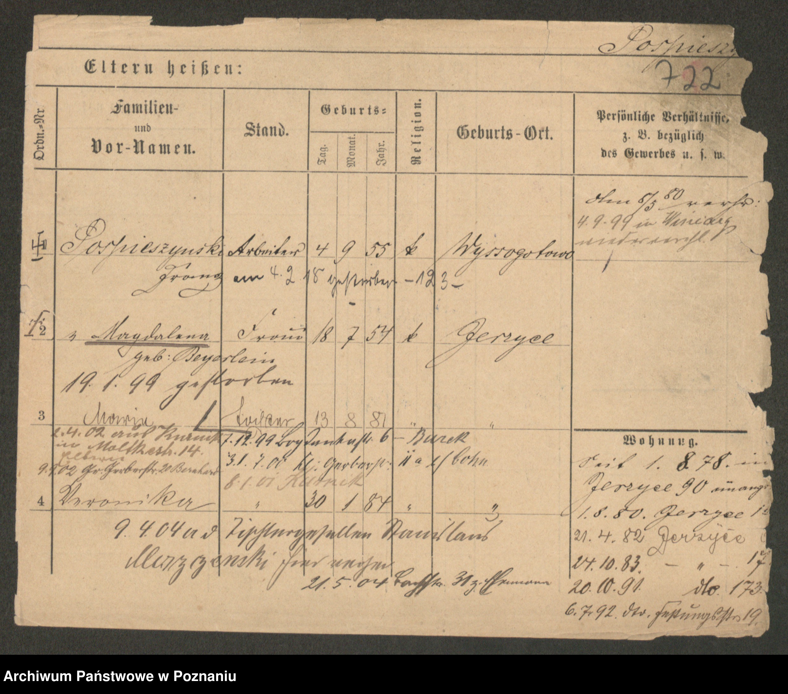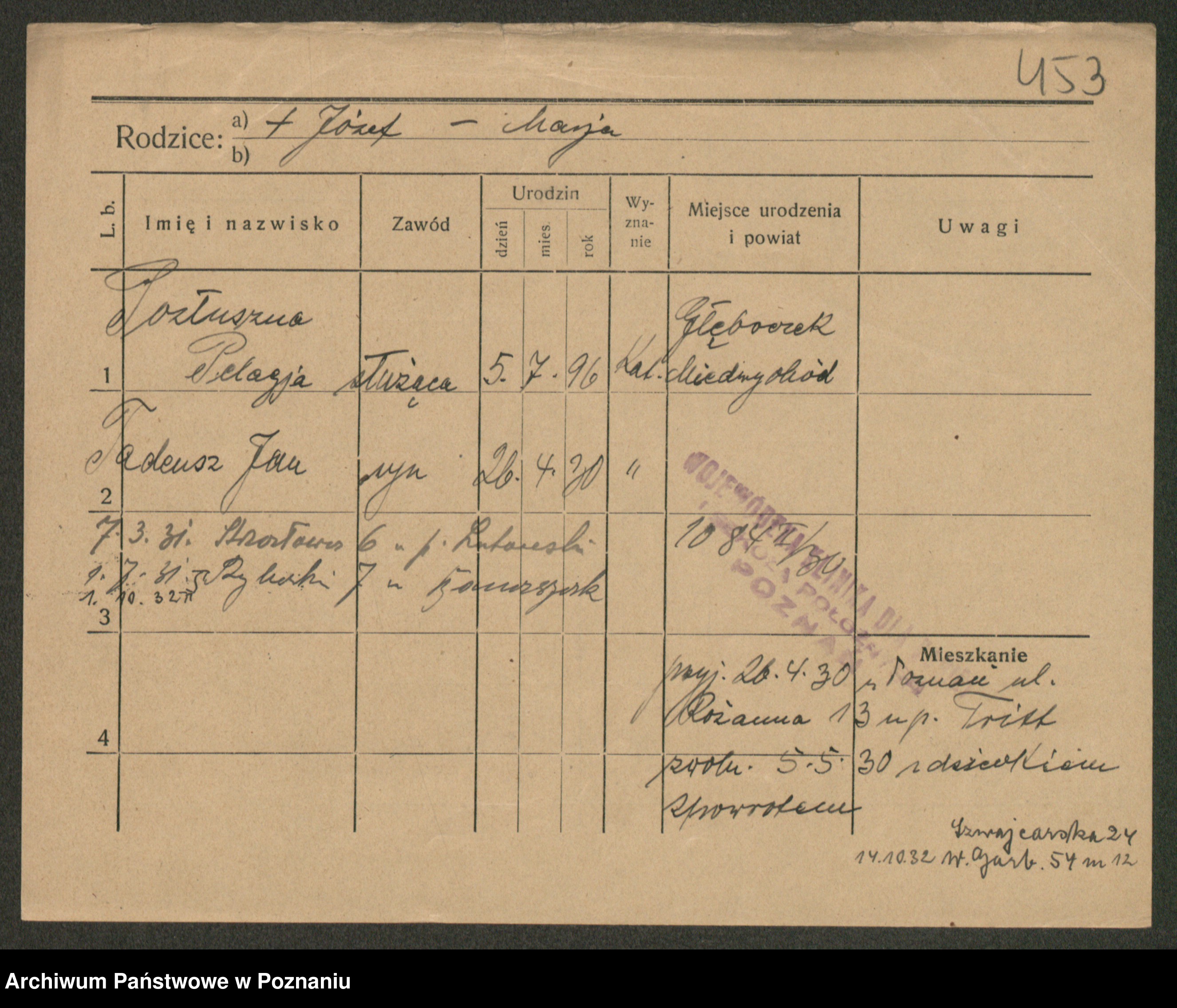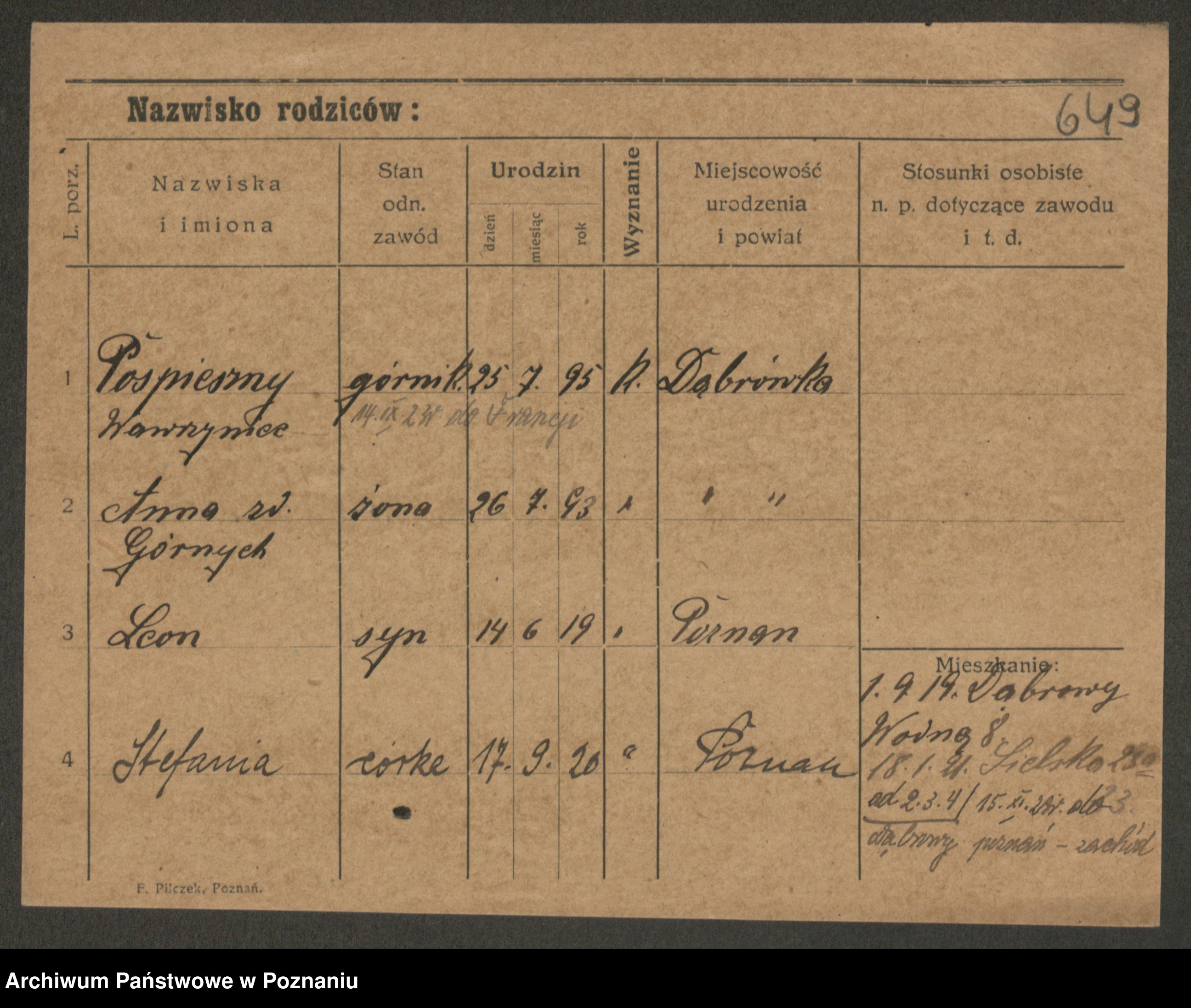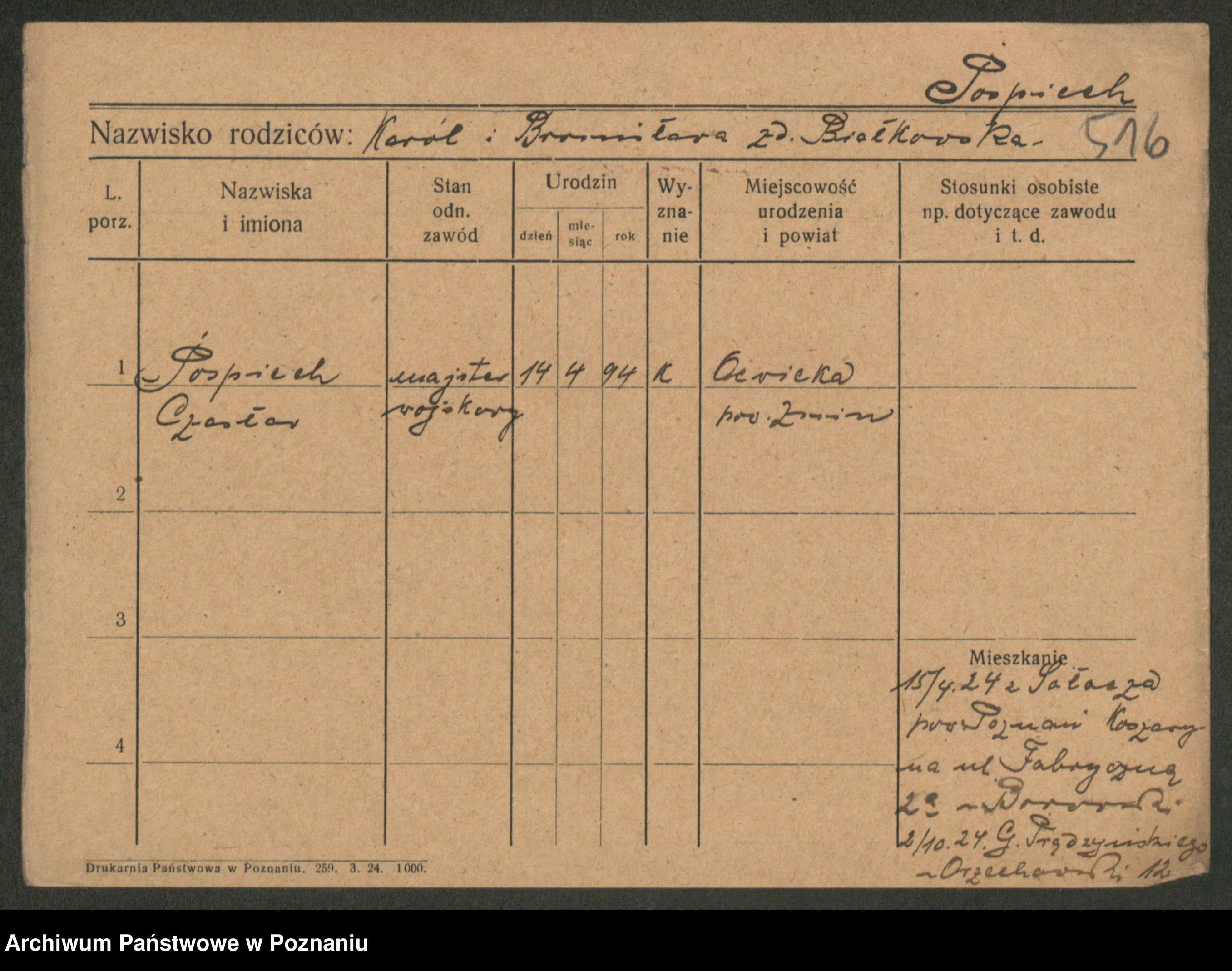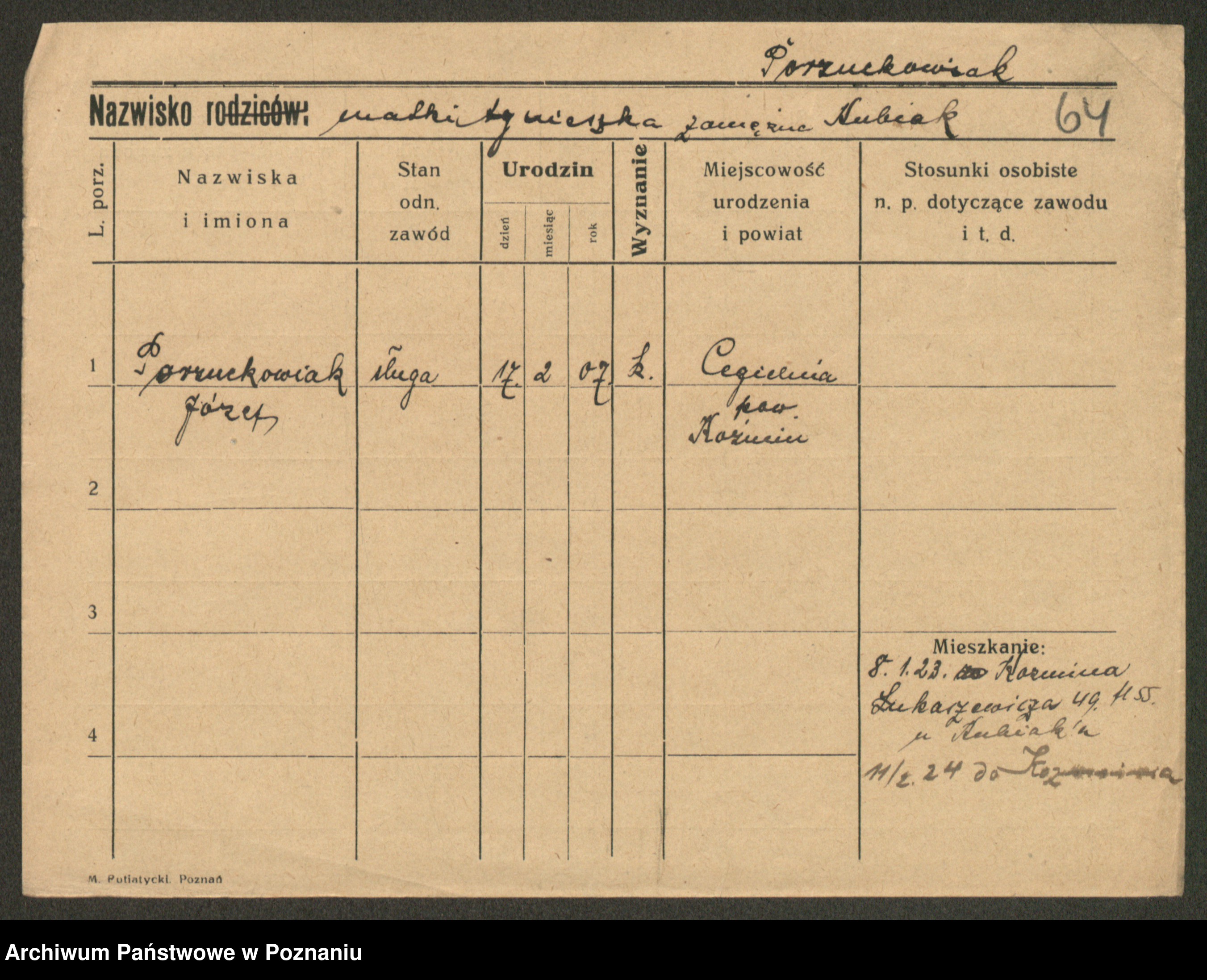 Podgląd karty osobowej dostępny jest po kliknięciu na nazwisko lub ikonkę karty. Można dokonywać powiększenia (ikony na górze) lub przechodzić między kolejnymi skanami (strzałki po bokach).