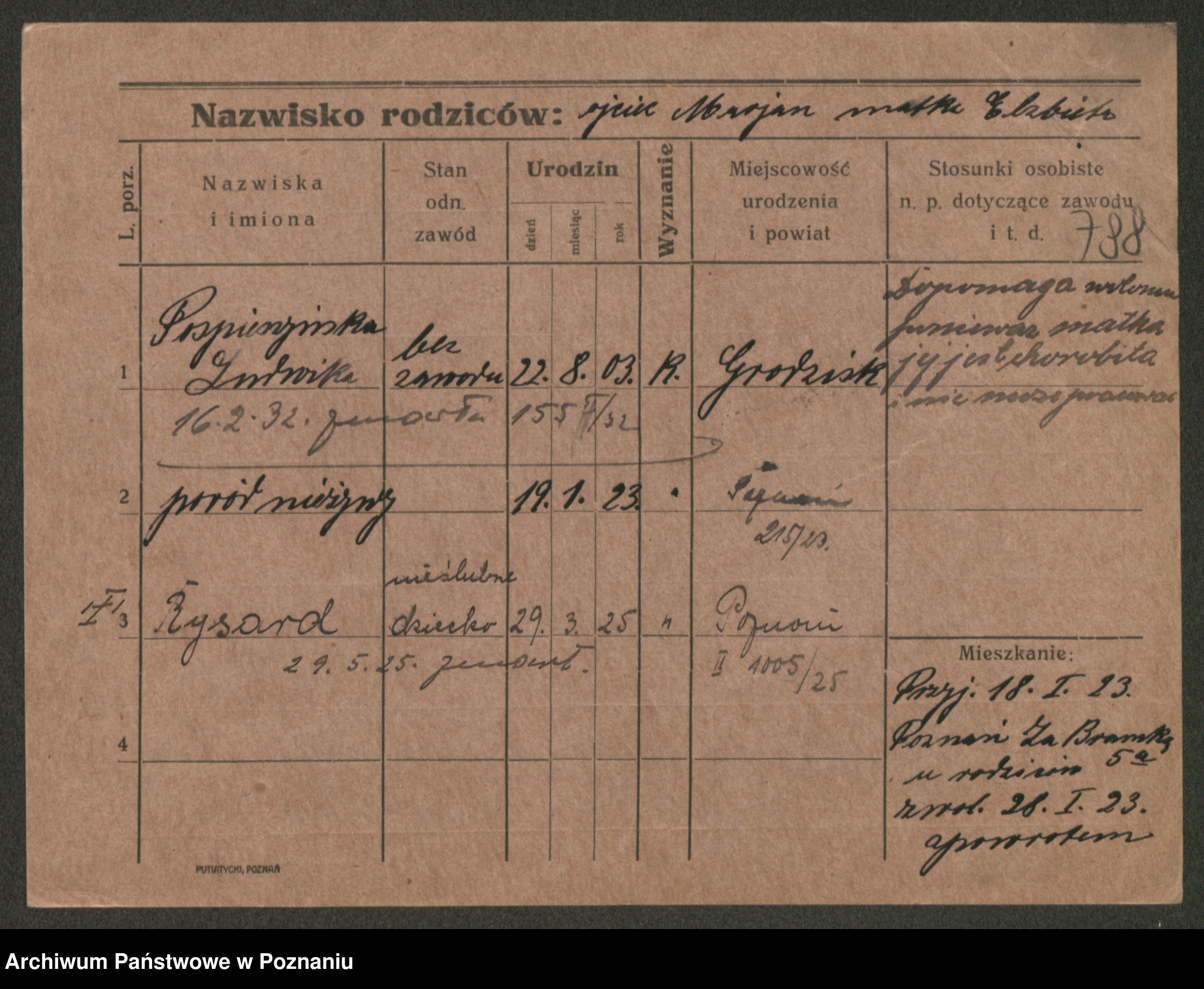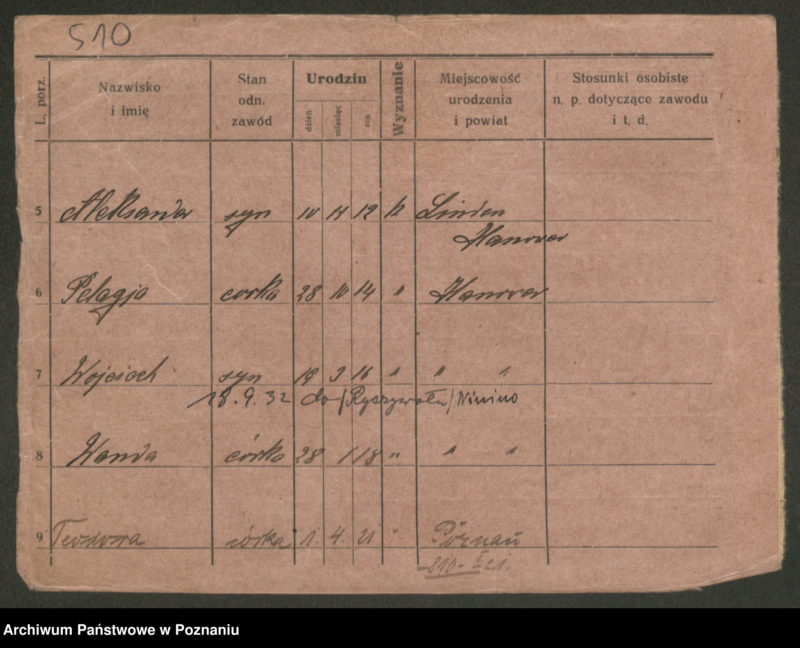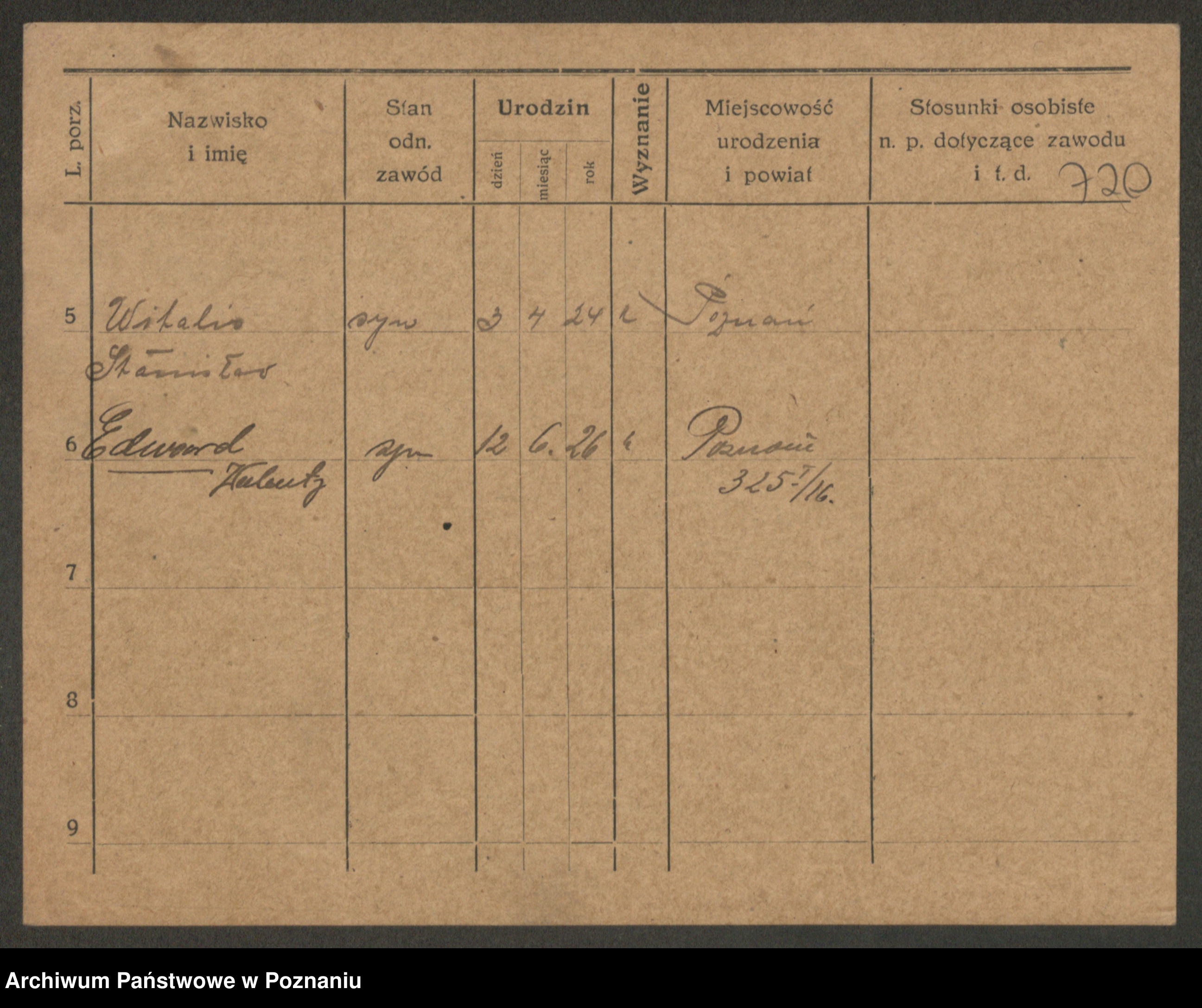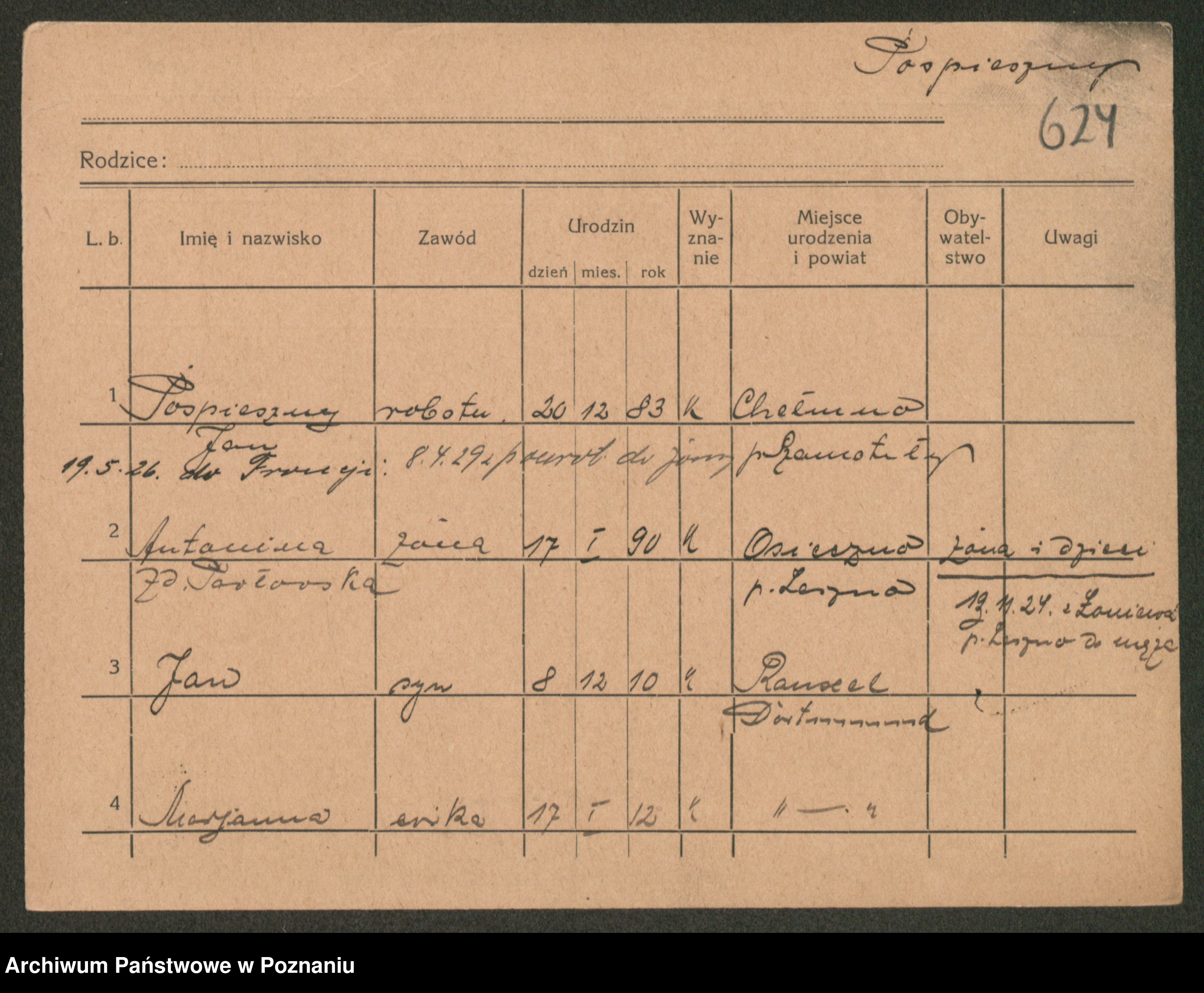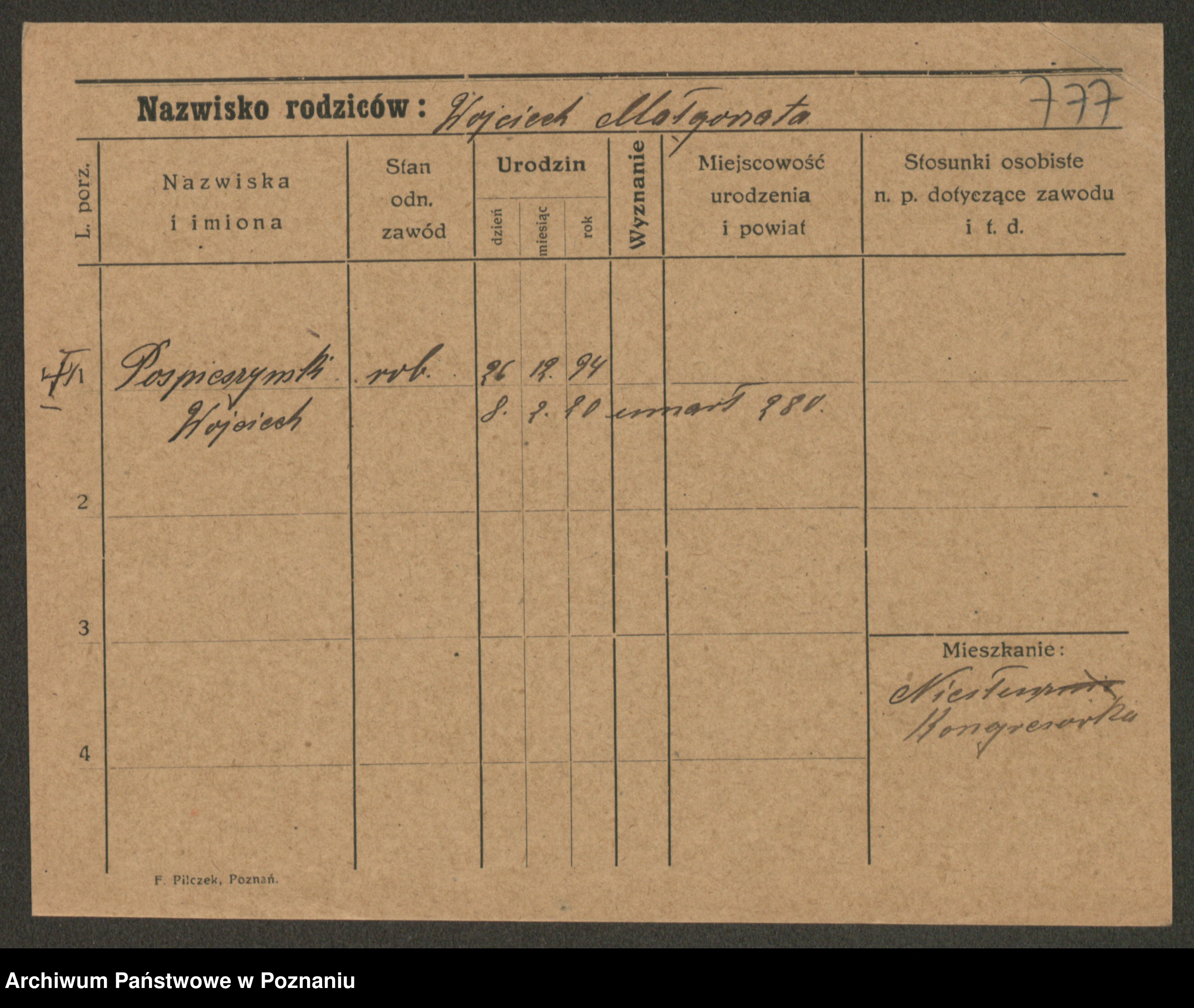 Podgląd karty osobowej dostępny jest po kliknięciu na nazwisko lub ikonkę karty. Można dokonywać powiększenia (ikony na górze) lub przechodzić między kolejnymi skanami (strzałki po bokach).