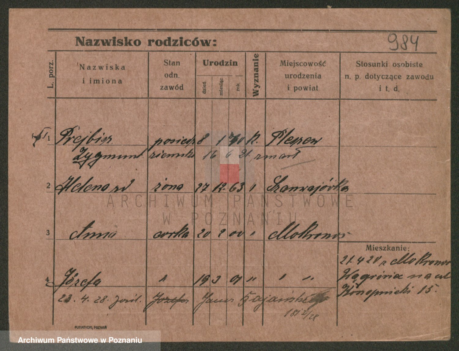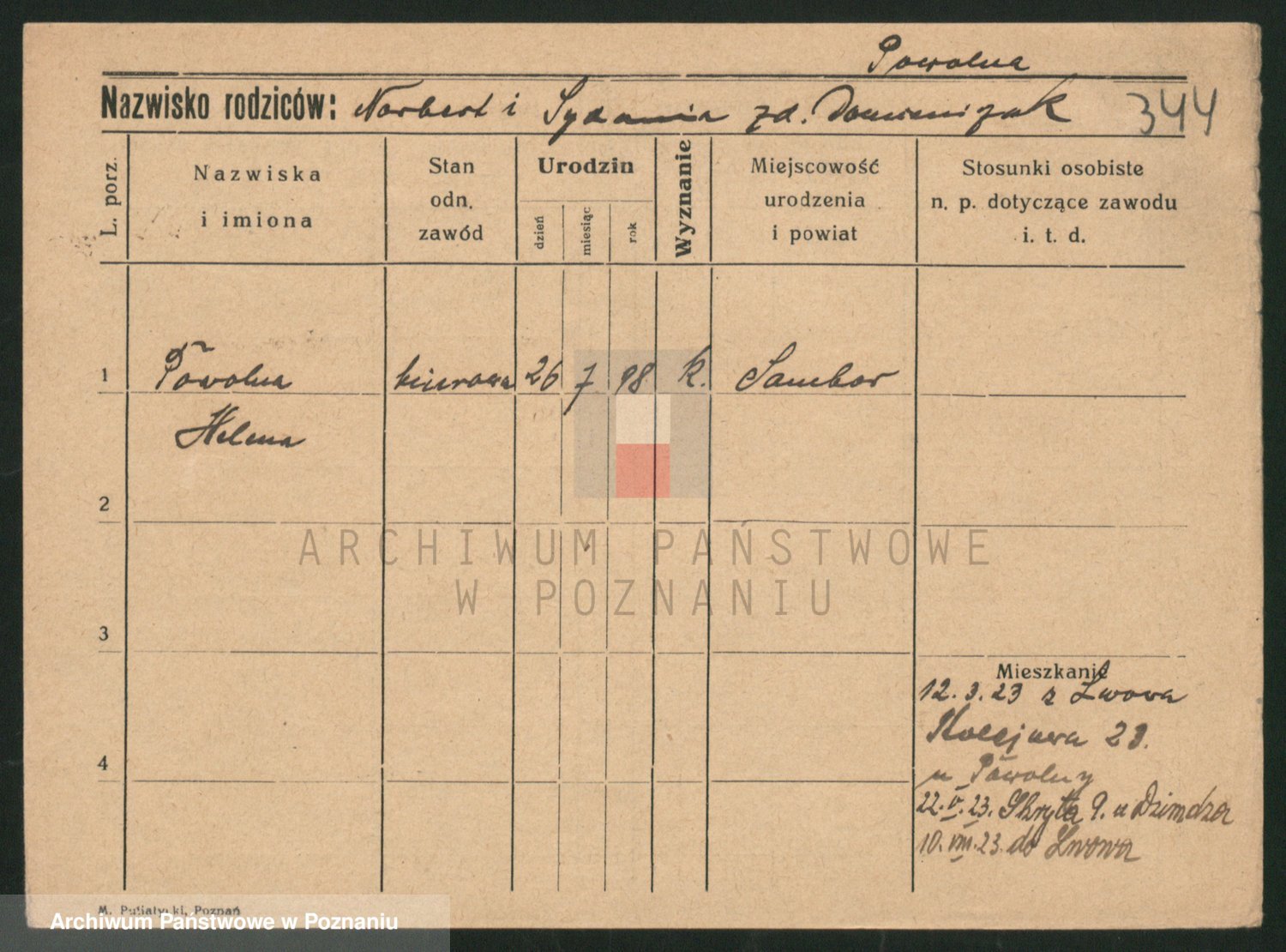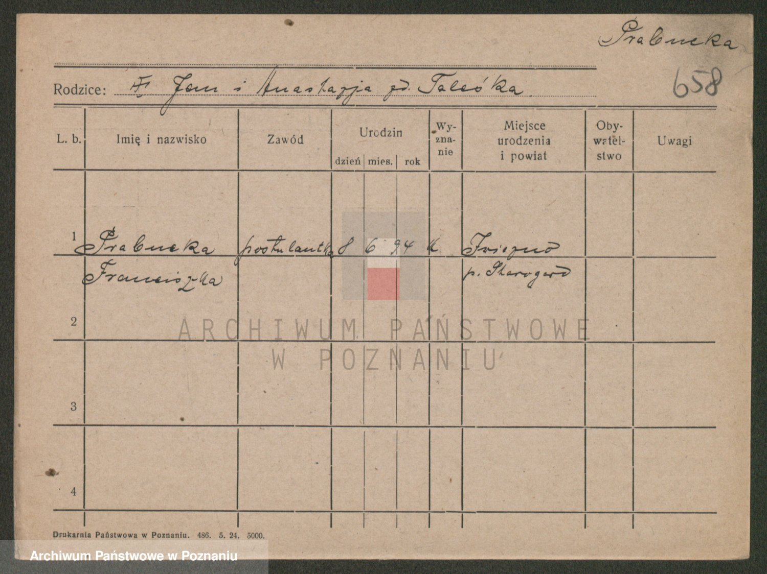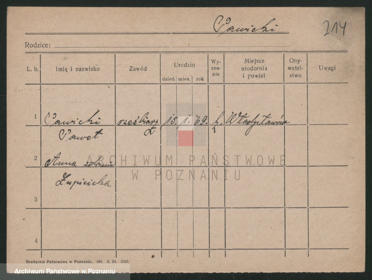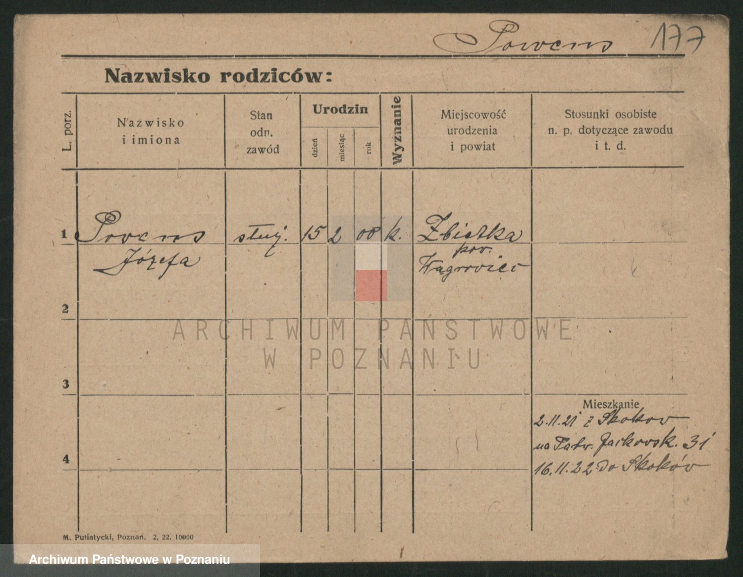 Podgląd karty osobowej dostępny jest po kliknięciu na nazwisko lub ikonkę karty. Można dokonywać powiększenia (ikony na górze) lub przechodzić między kolejnymi skanami (strzałki po bokach).