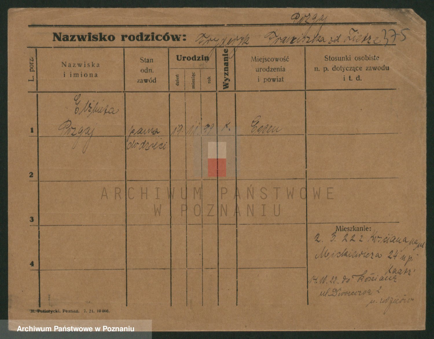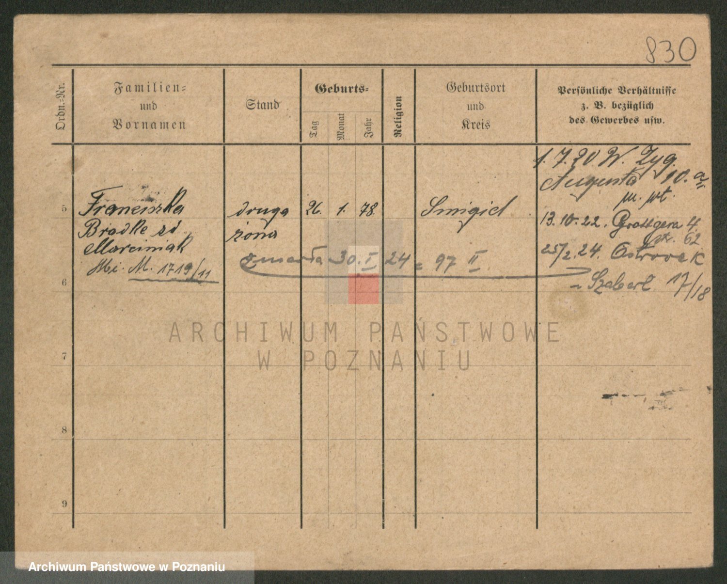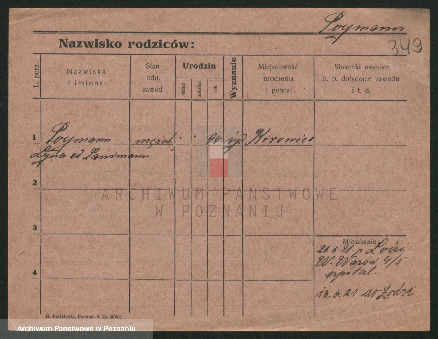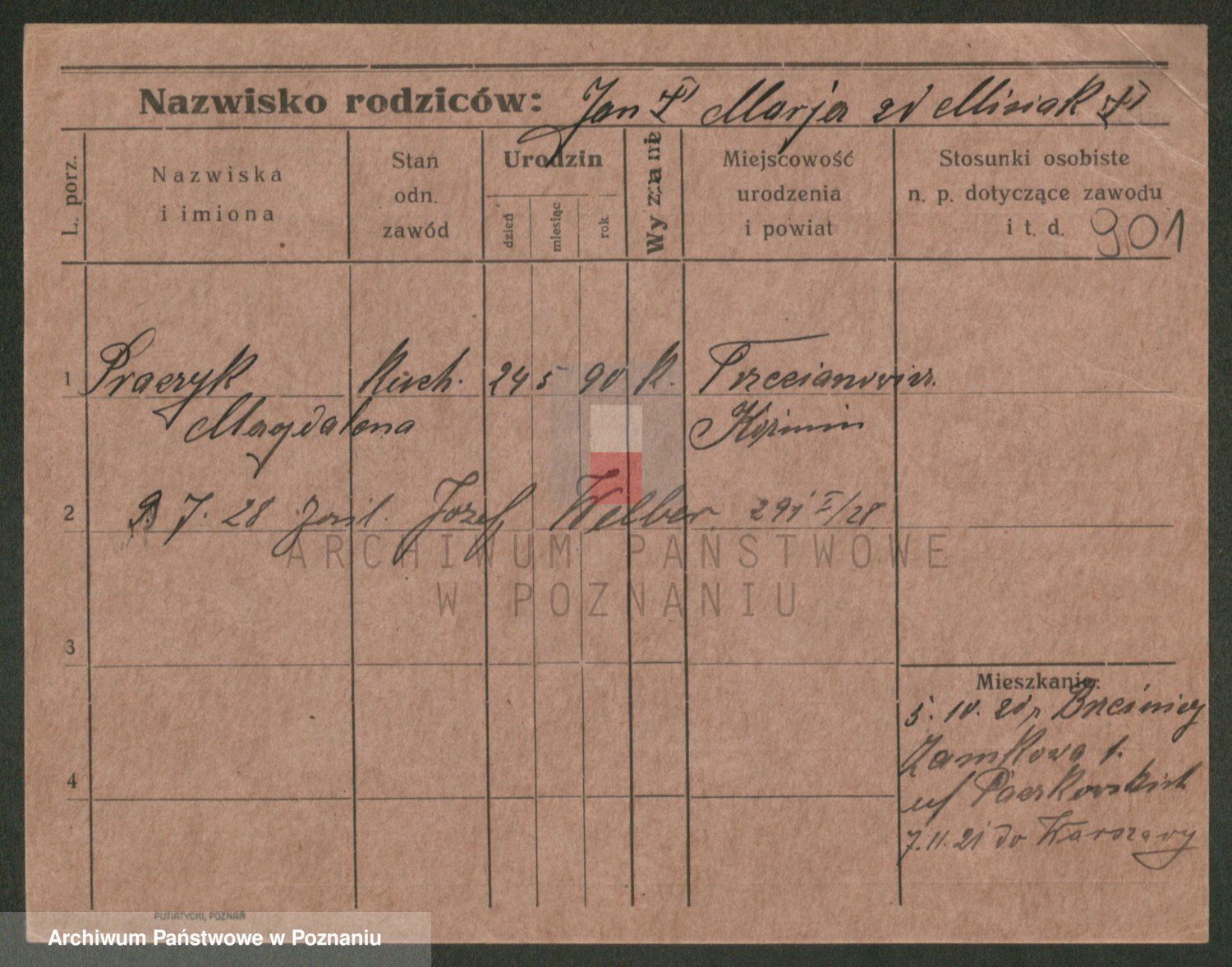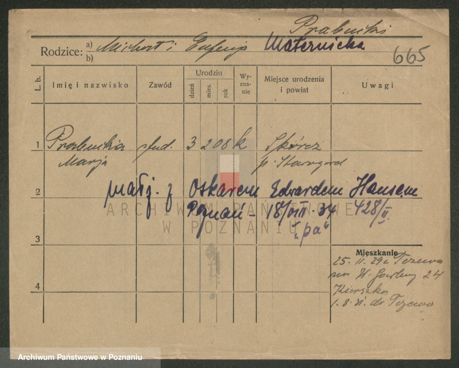 Podgląd karty osobowej dostępny jest po kliknięciu na nazwisko lub ikonkę karty. Można dokonywać powiększenia (ikony na górze) lub przechodzić między kolejnymi skanami (strzałki po bokach).