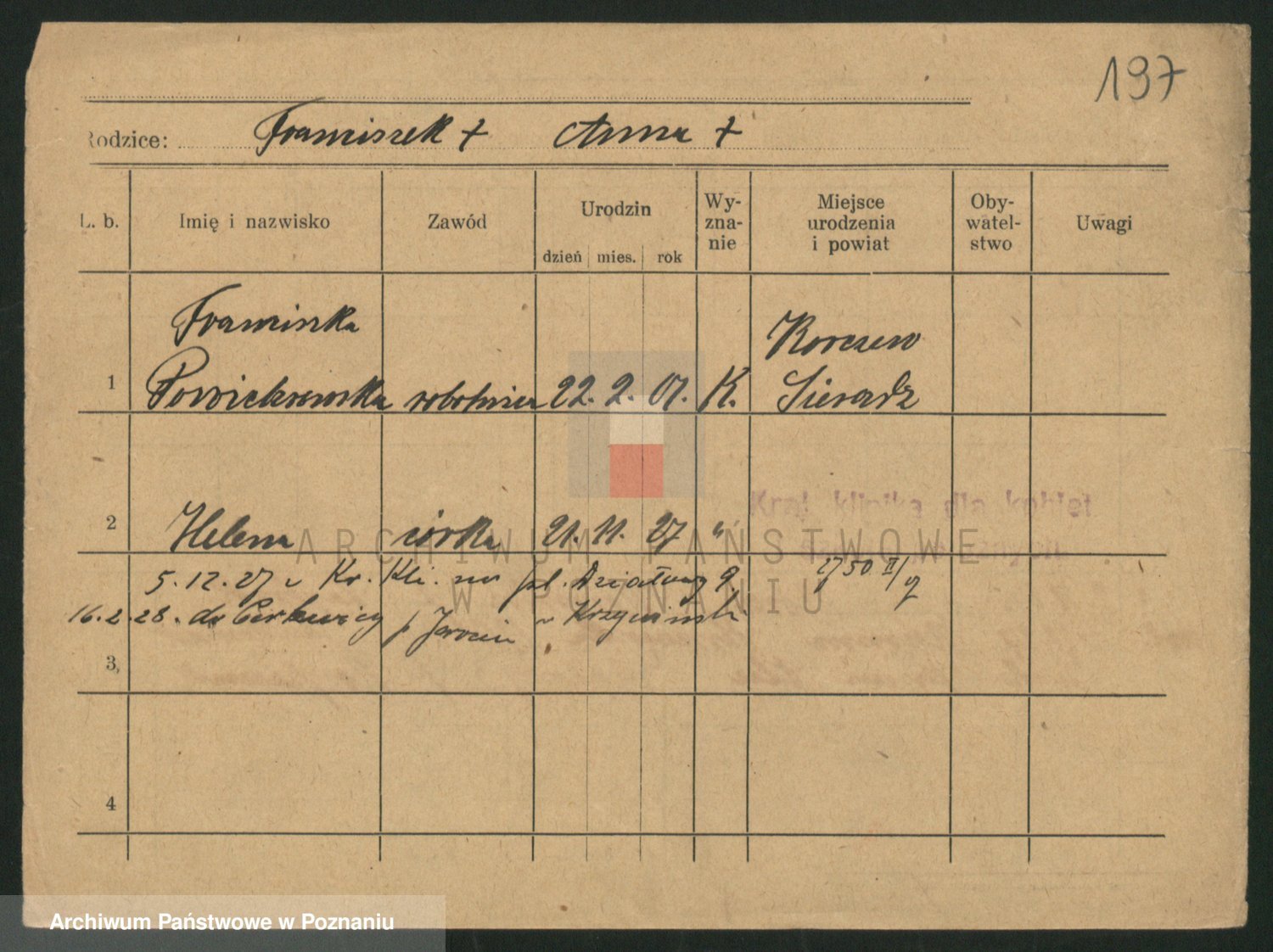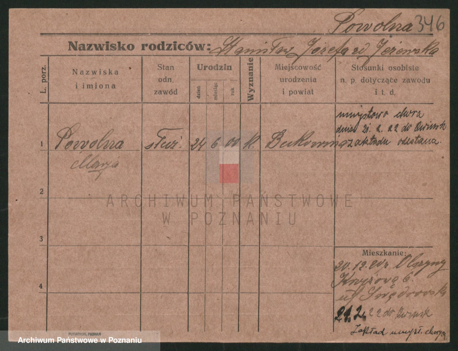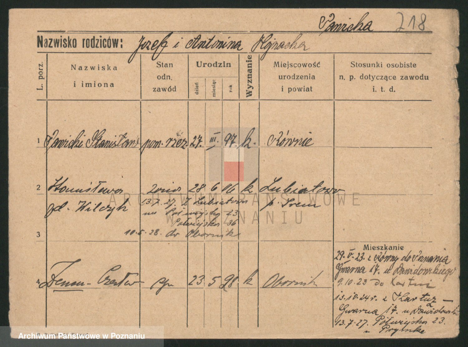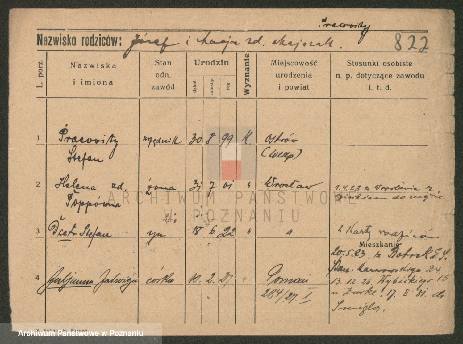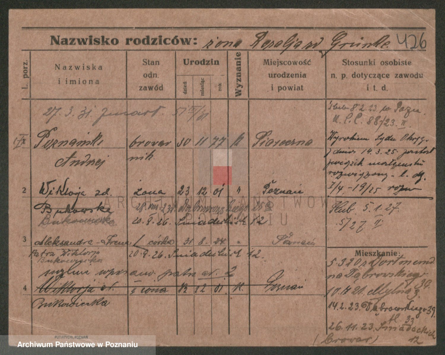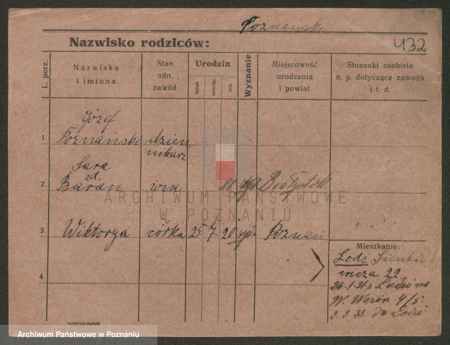 Podgląd karty osobowej dostępny jest po kliknięciu na nazwisko lub ikonkę karty. Można dokonywać powiększenia (ikony na górze) lub przechodzić między kolejnymi skanami (strzałki po bokach).