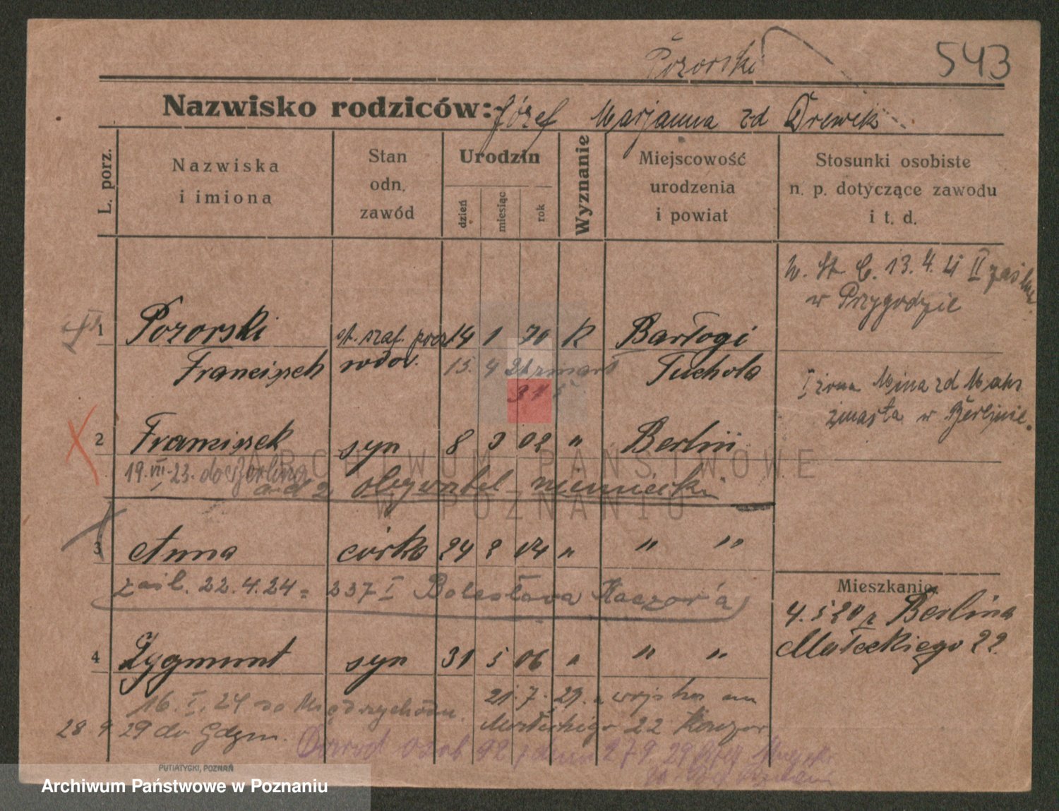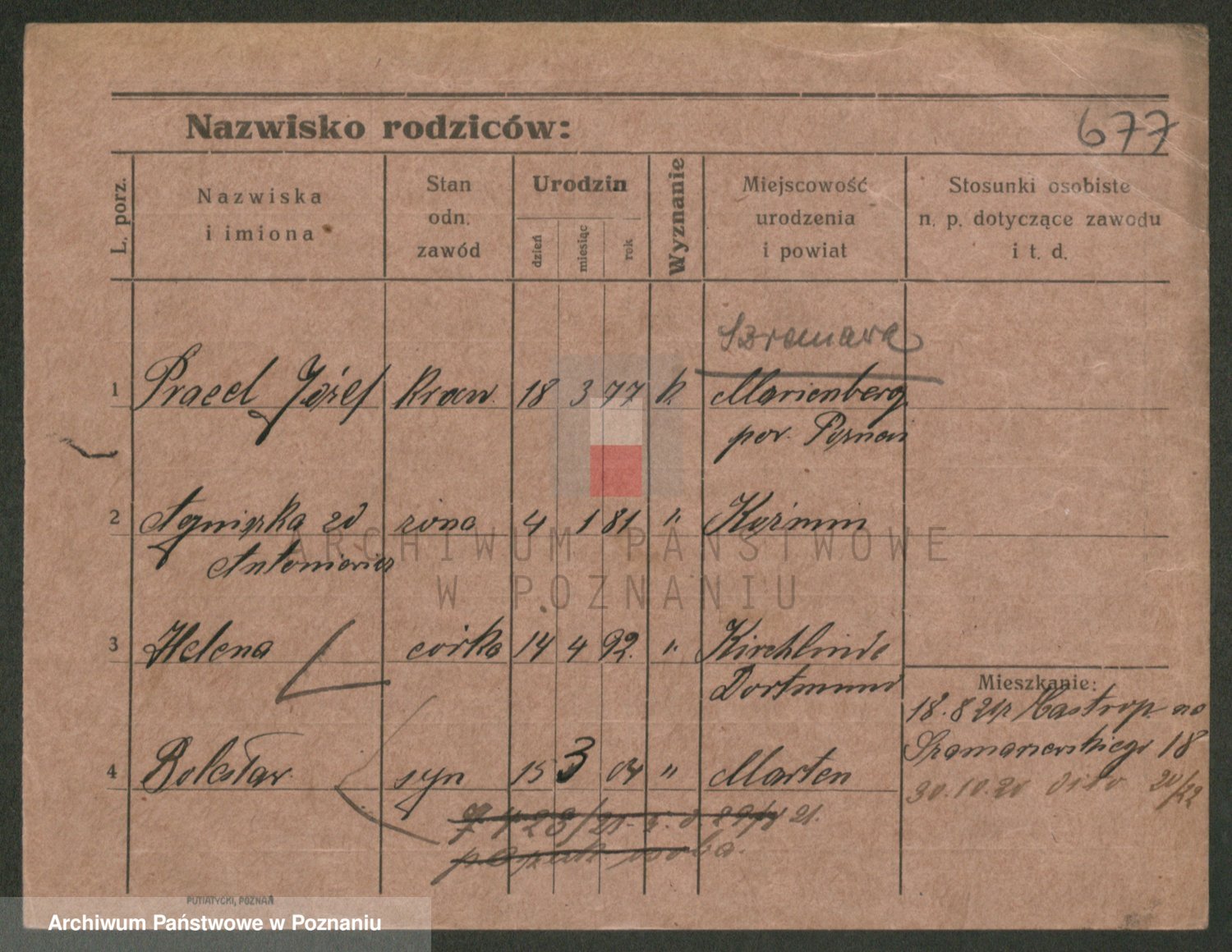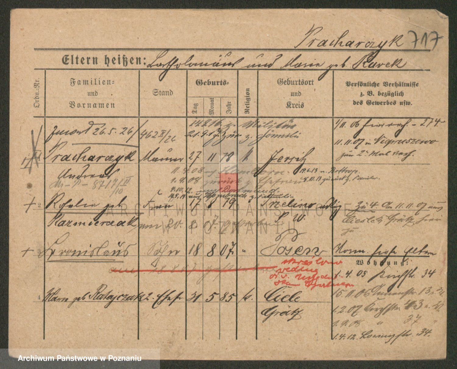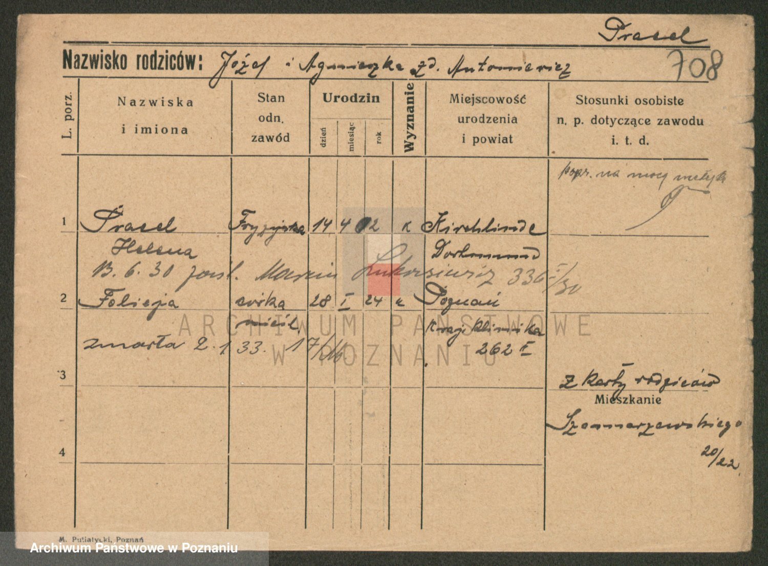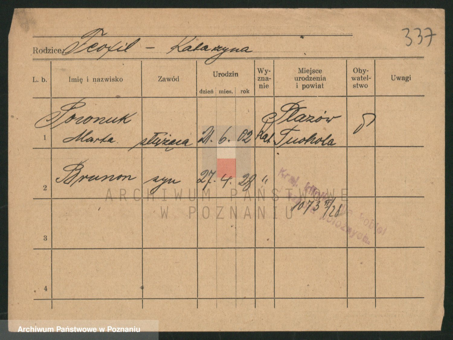 Podgląd karty osobowej dostępny jest po kliknięciu na nazwisko lub ikonkę karty. Można dokonywać powiększenia (ikony na górze) lub przechodzić między kolejnymi skanami (strzałki po bokach).