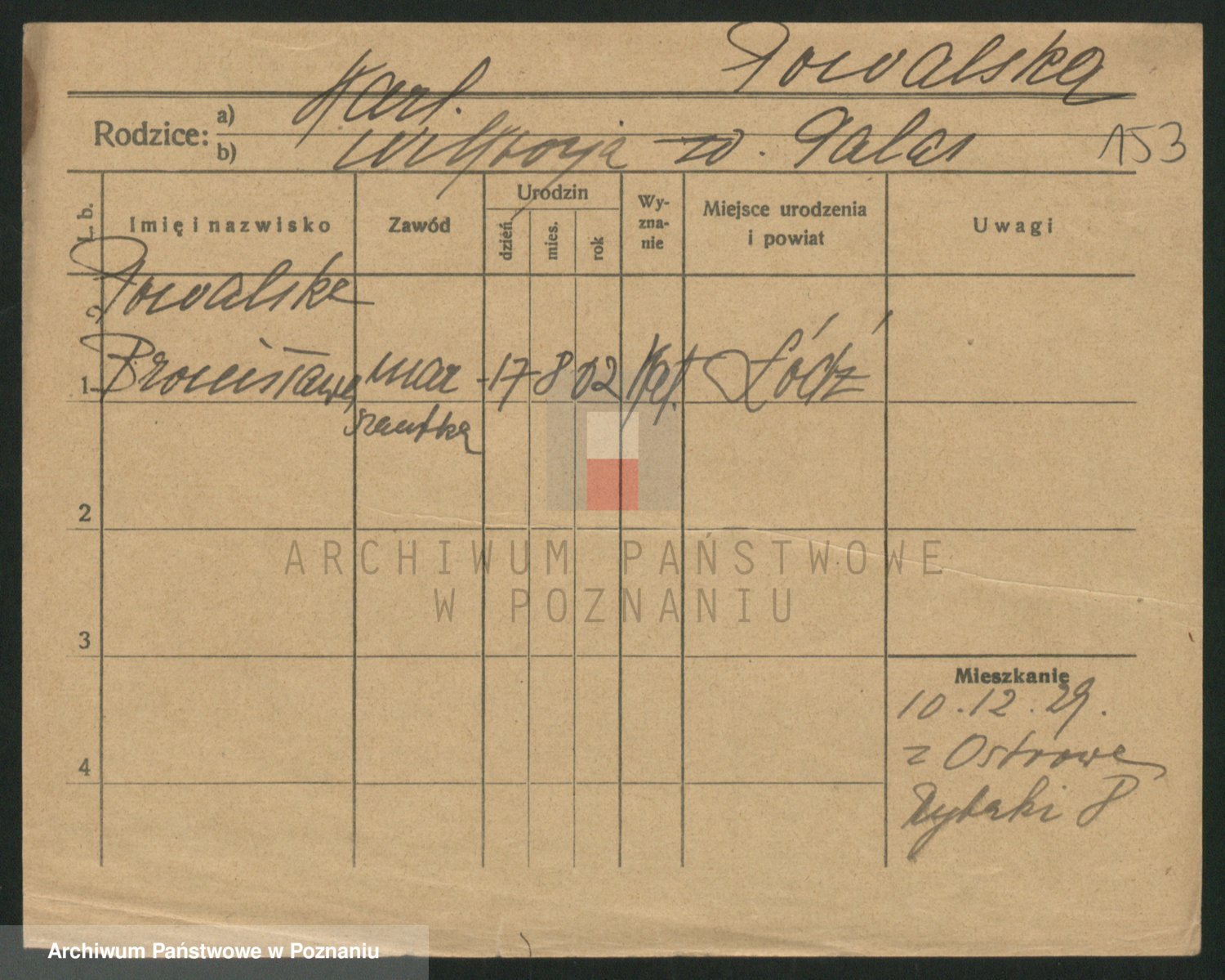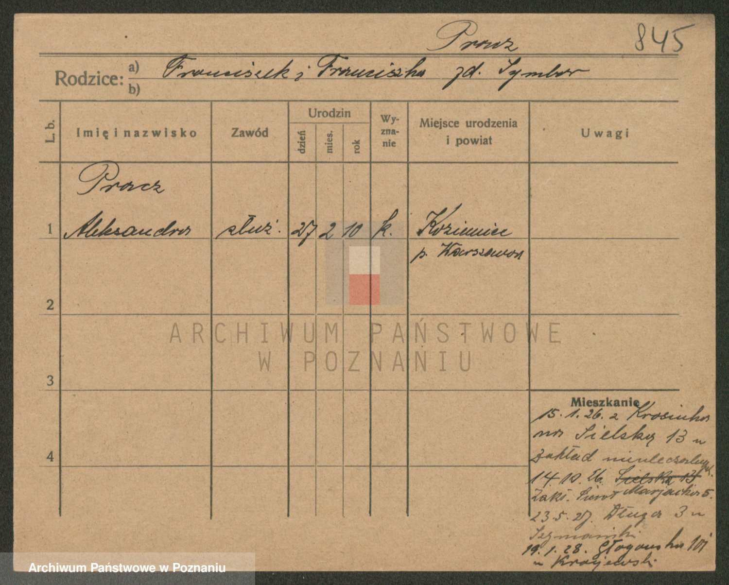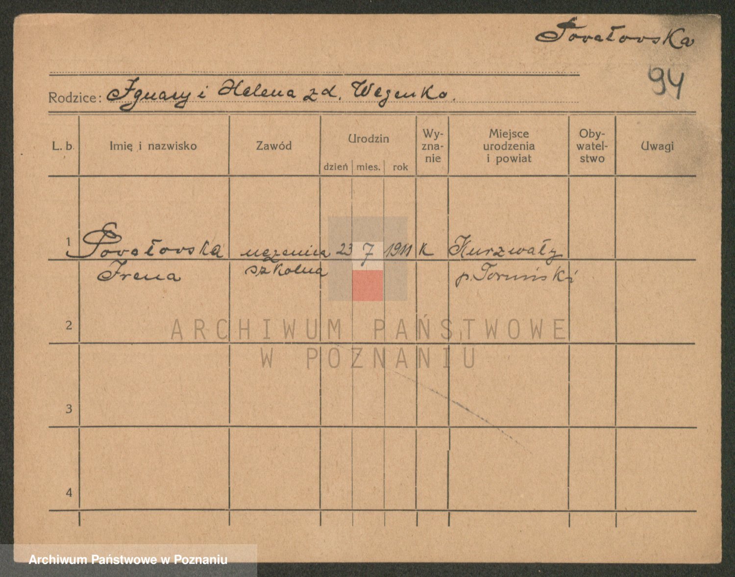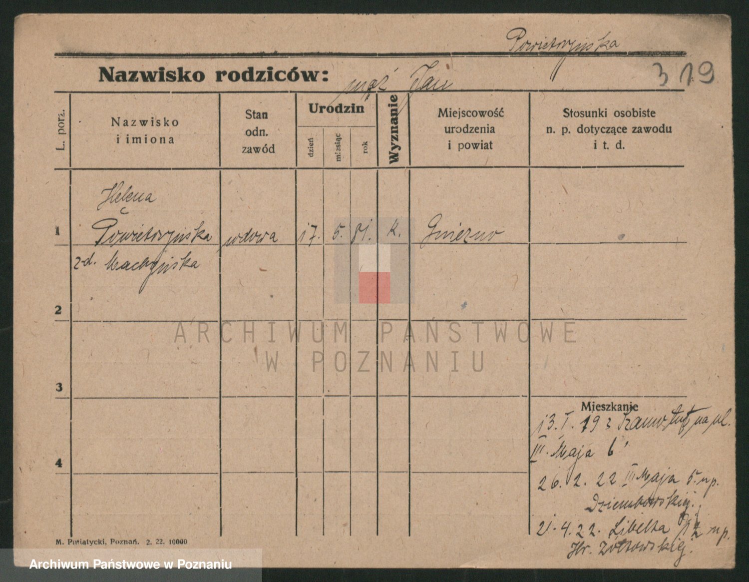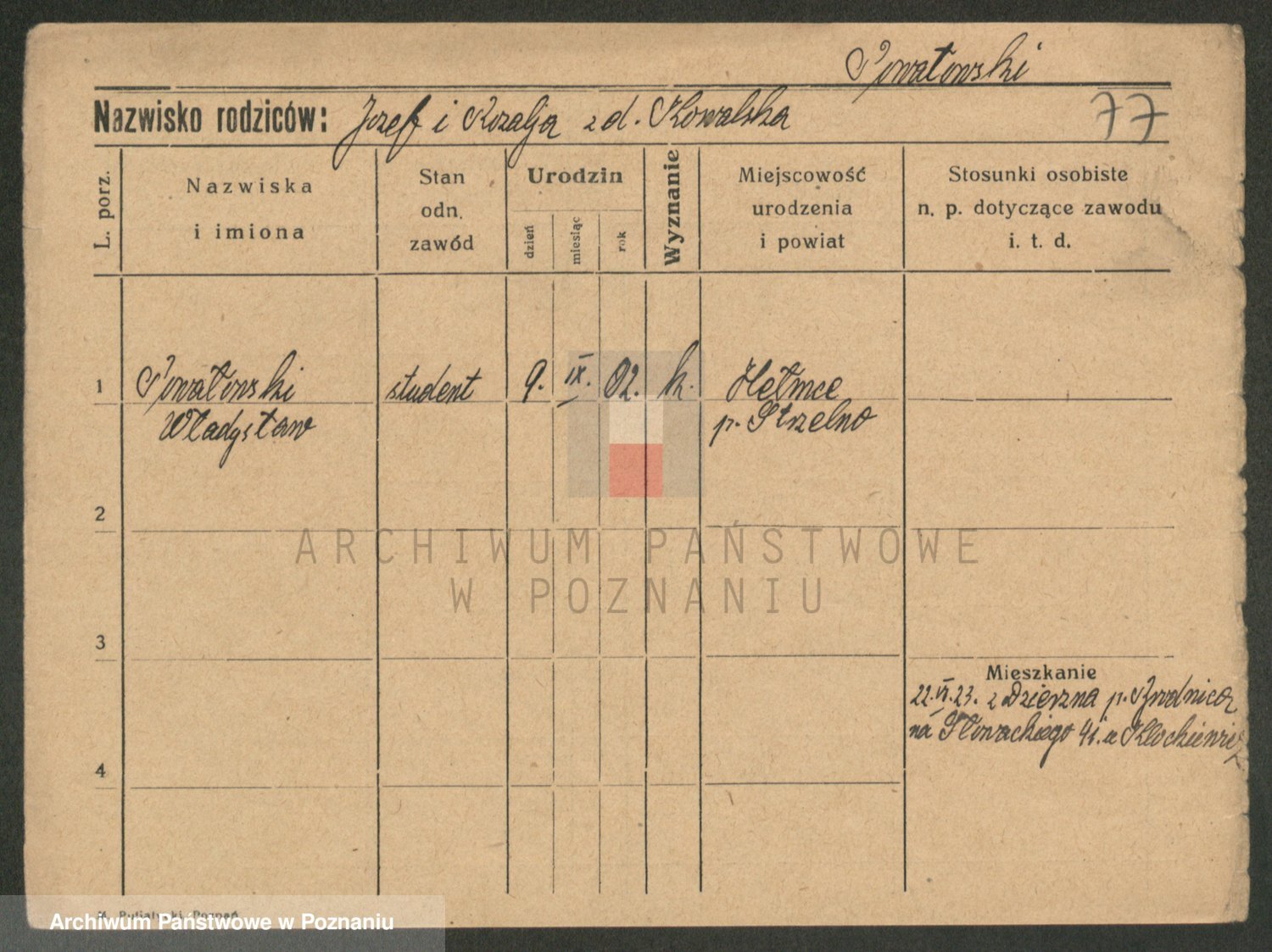 Podgląd karty osobowej dostępny jest po kliknięciu na nazwisko lub ikonkę karty. Można dokonywać powiększenia (ikony na górze) lub przechodzić między kolejnymi skanami (strzałki po bokach).
