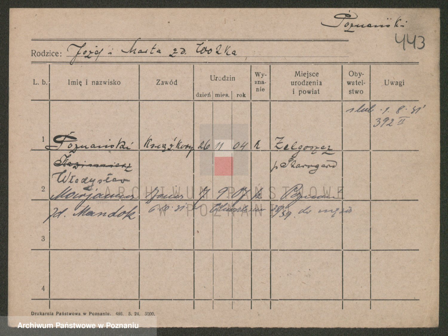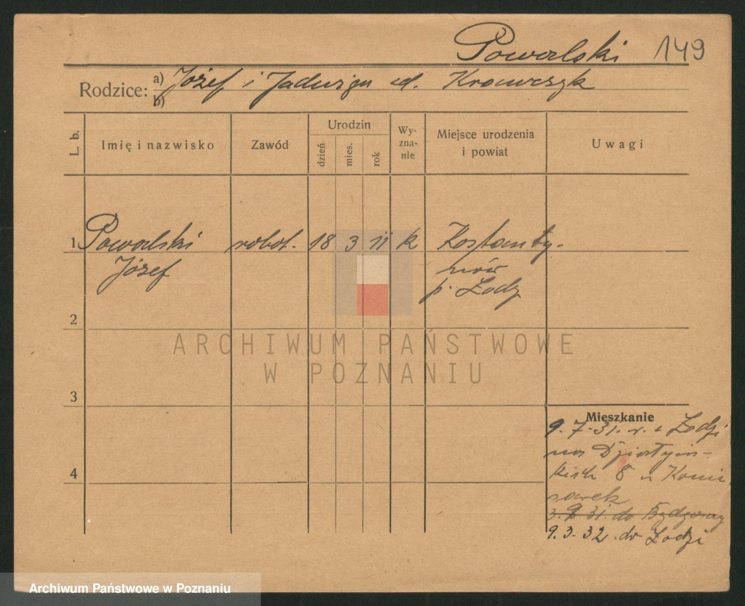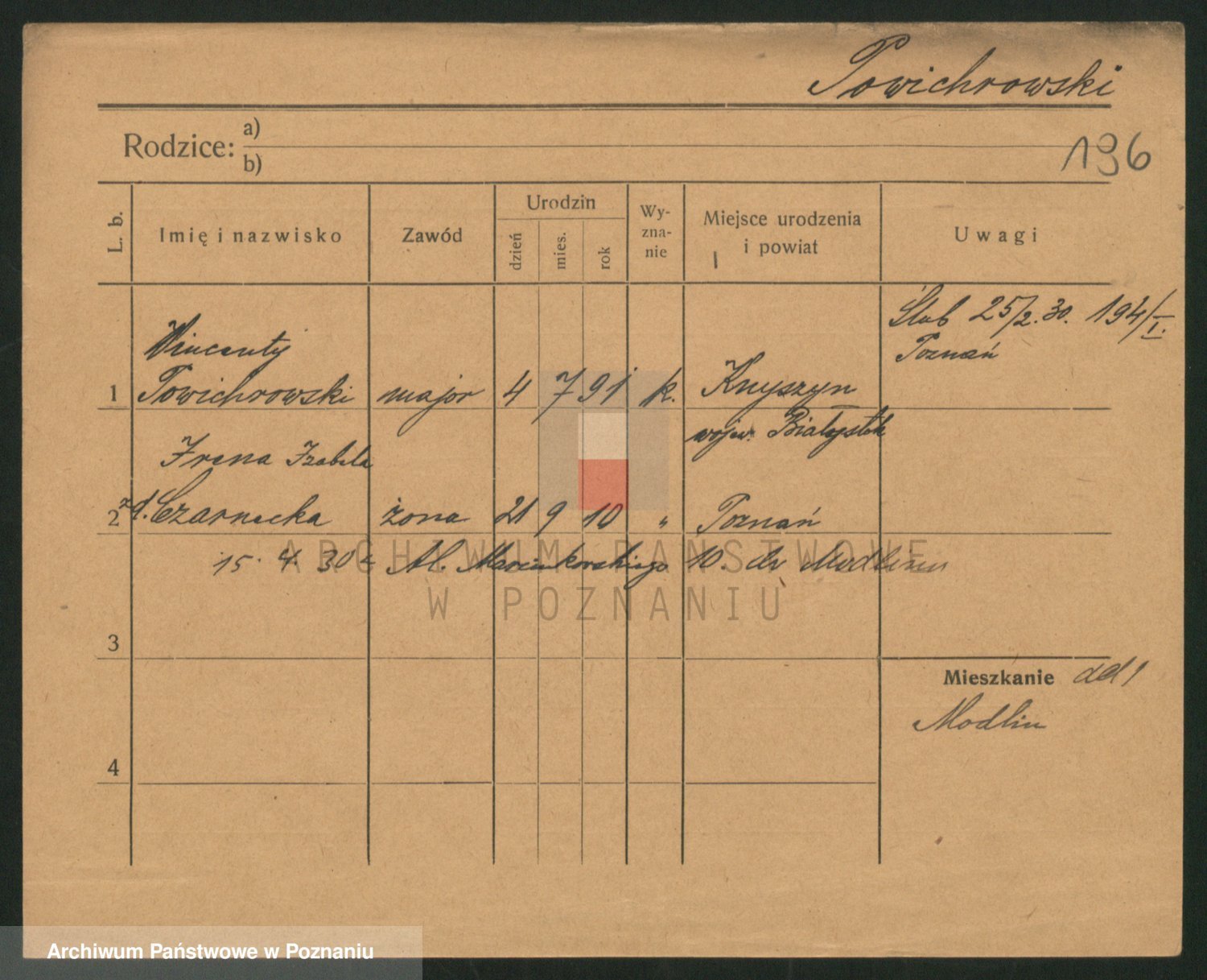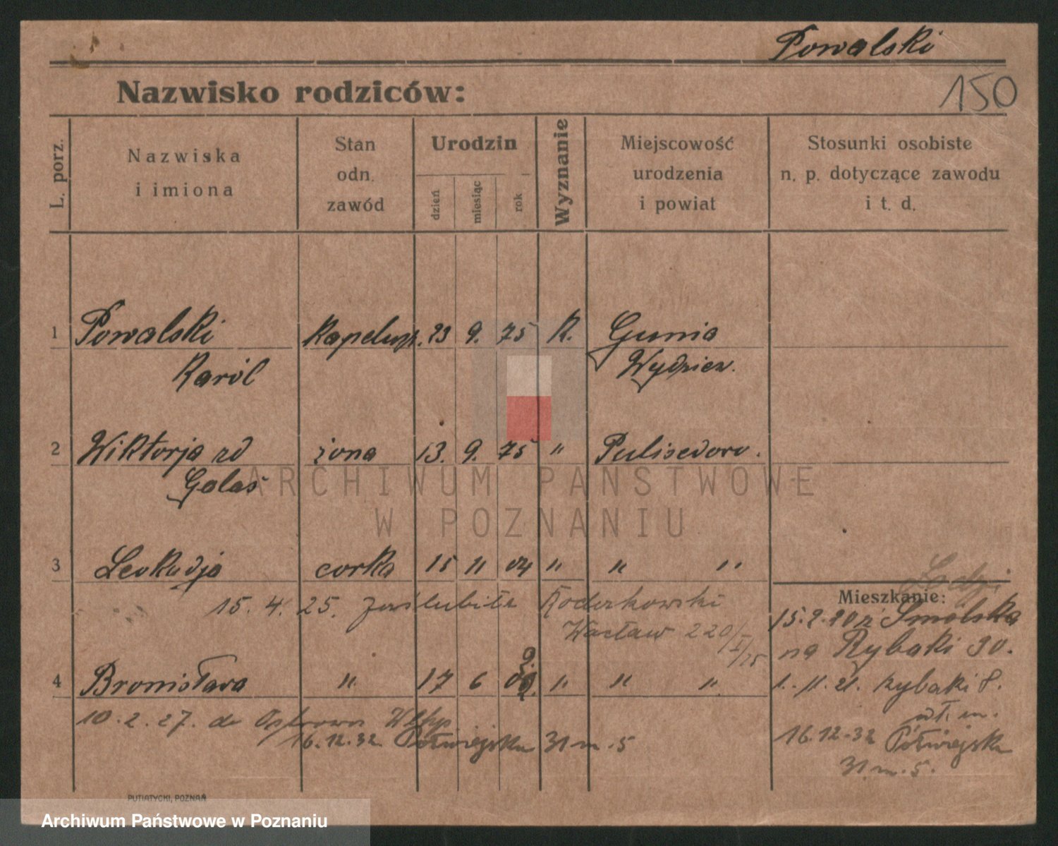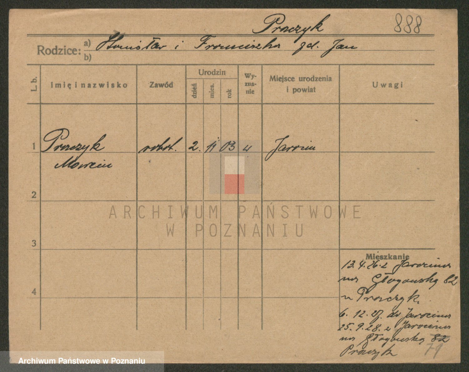 Podgląd karty osobowej dostępny jest po kliknięciu na nazwisko lub ikonkę karty. Można dokonywać powiększenia (ikony na górze) lub przechodzić między kolejnymi skanami (strzałki po bokach).