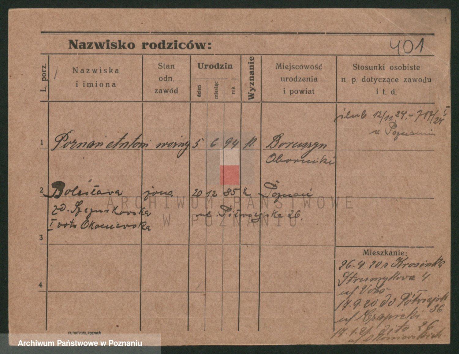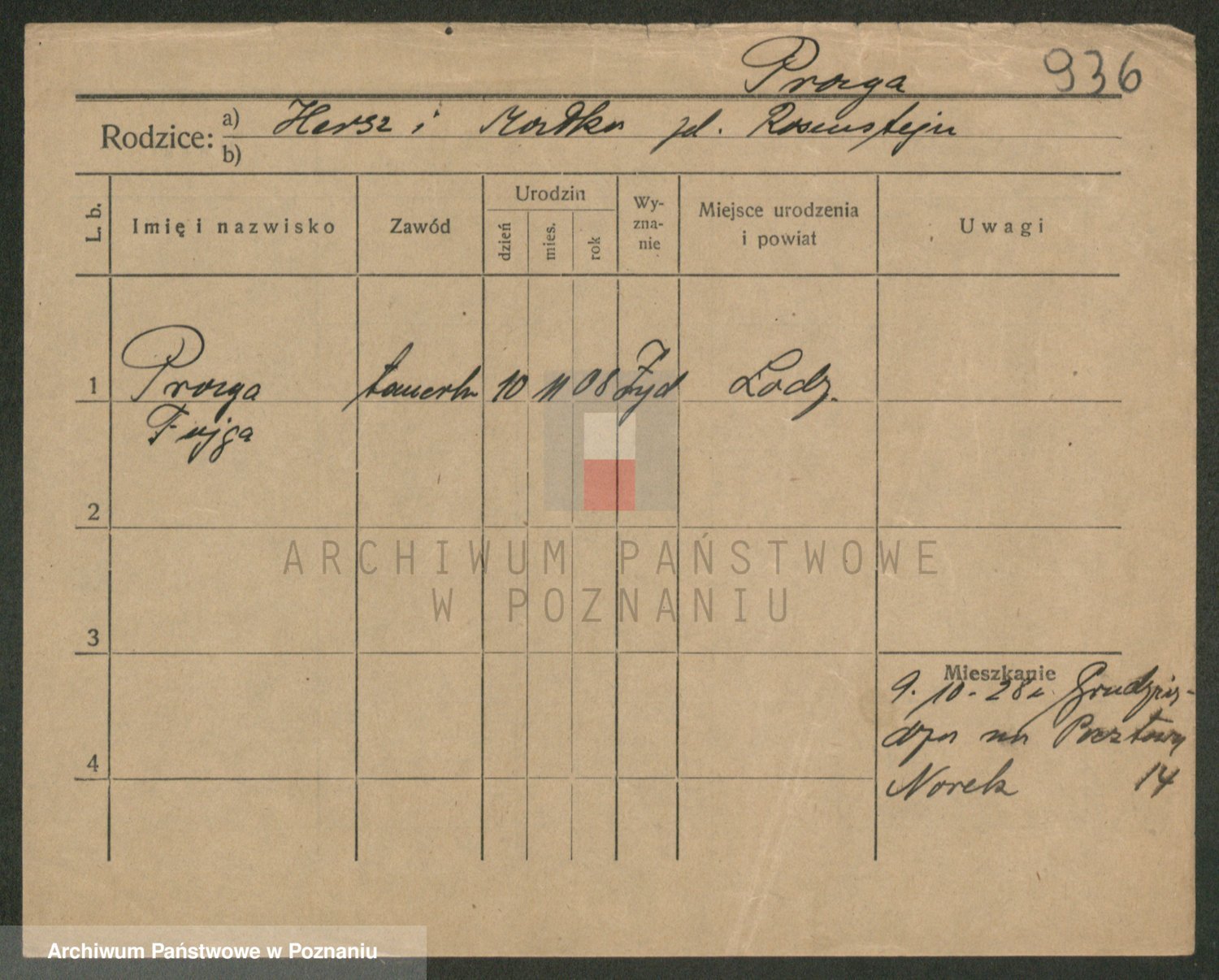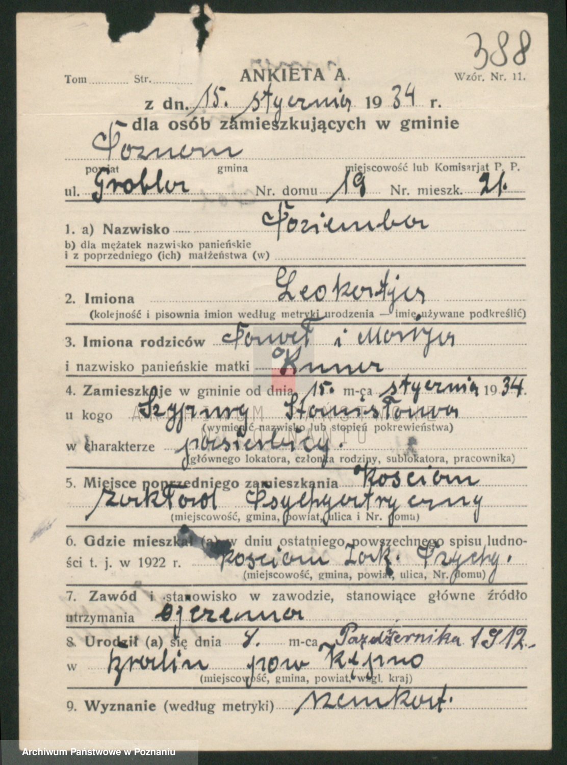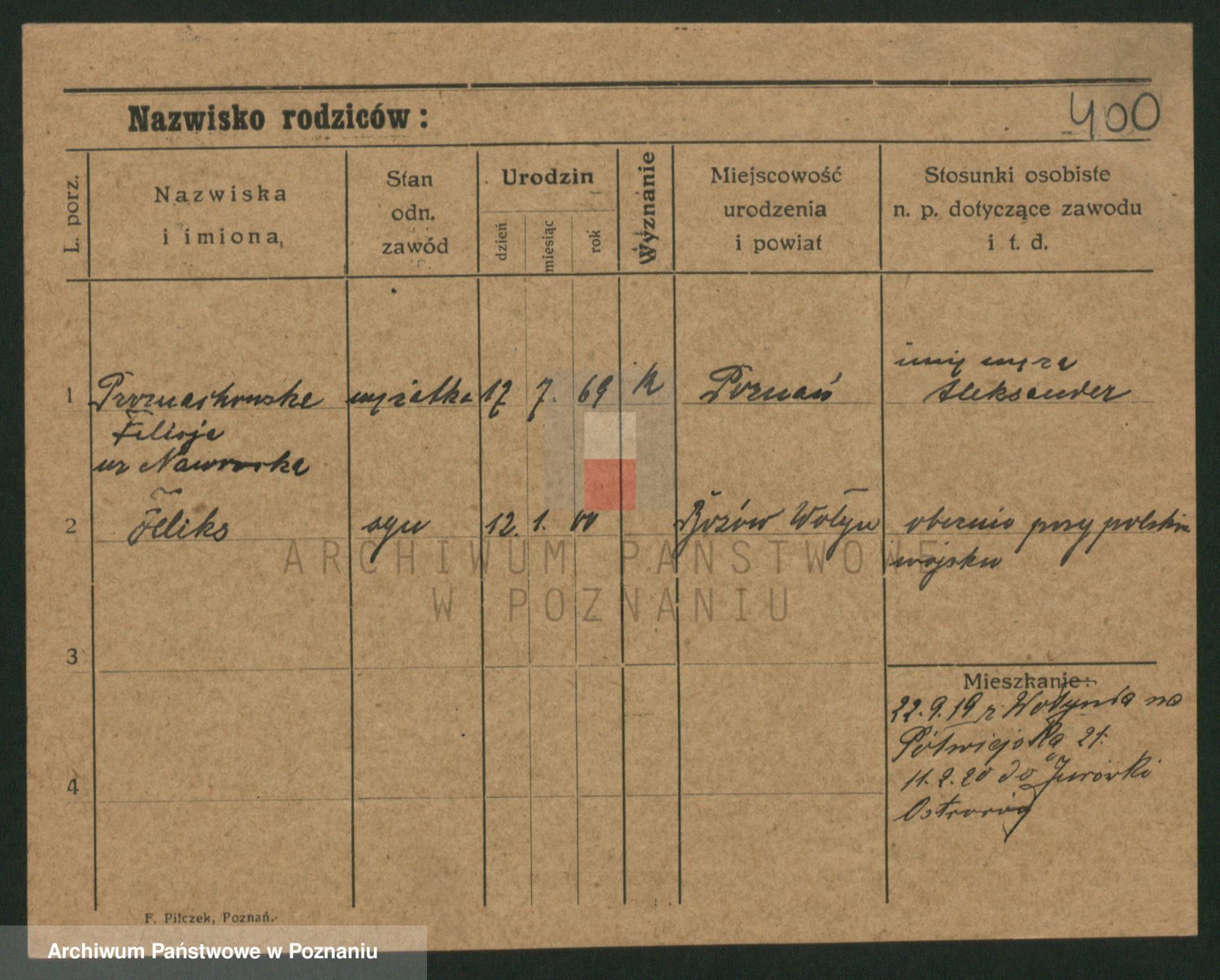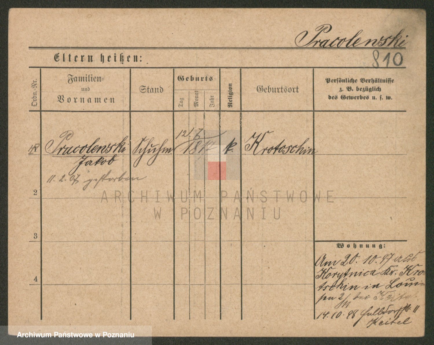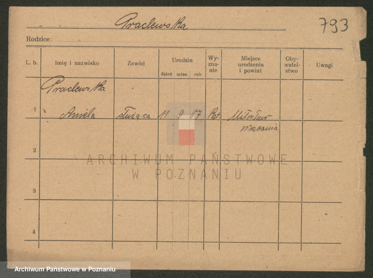 Podgląd karty osobowej dostępny jest po kliknięciu na nazwisko lub ikonkę karty. Można dokonywać powiększenia (ikony na górze) lub przechodzić między kolejnymi skanami (strzałki po bokach).
