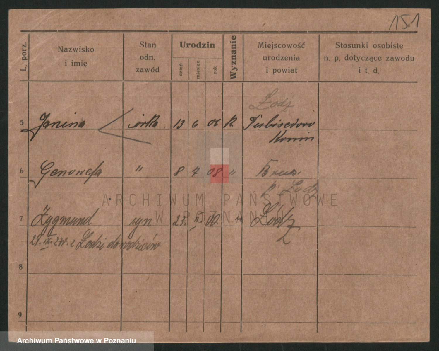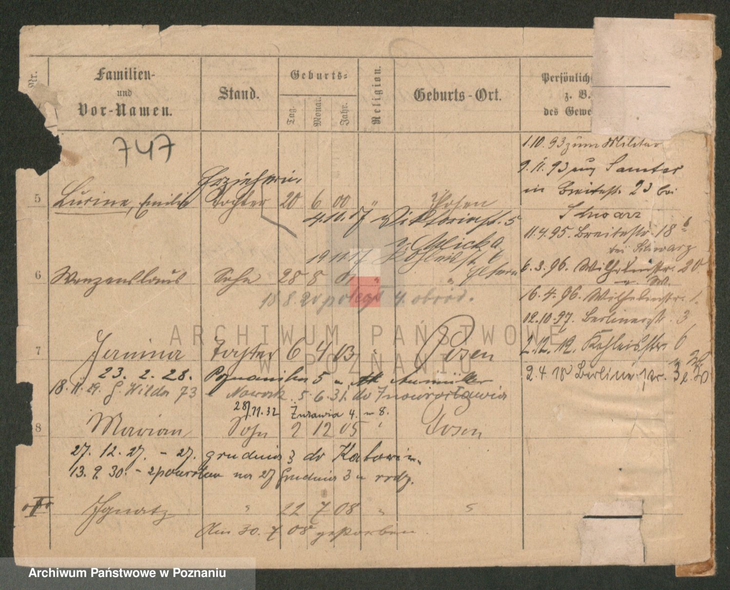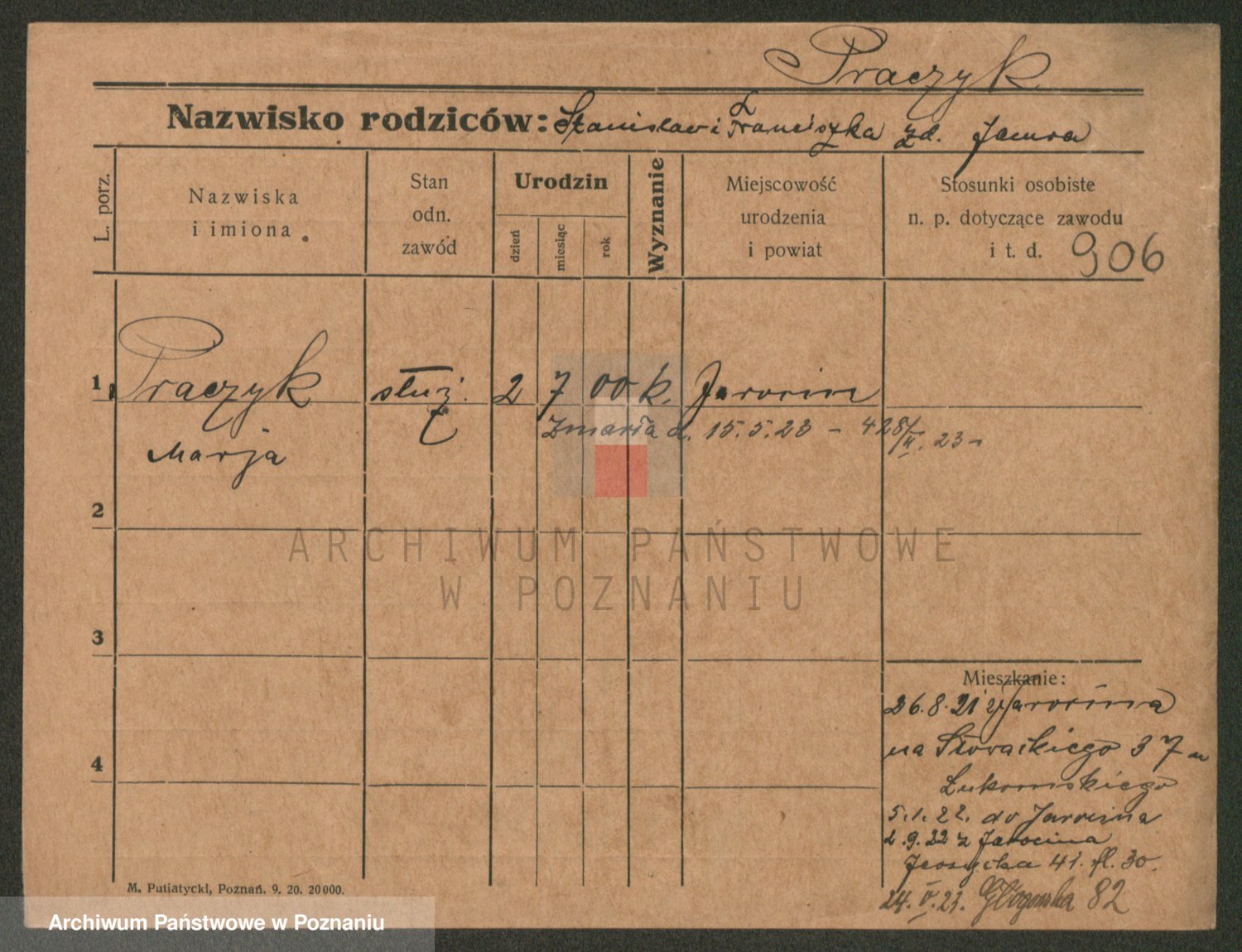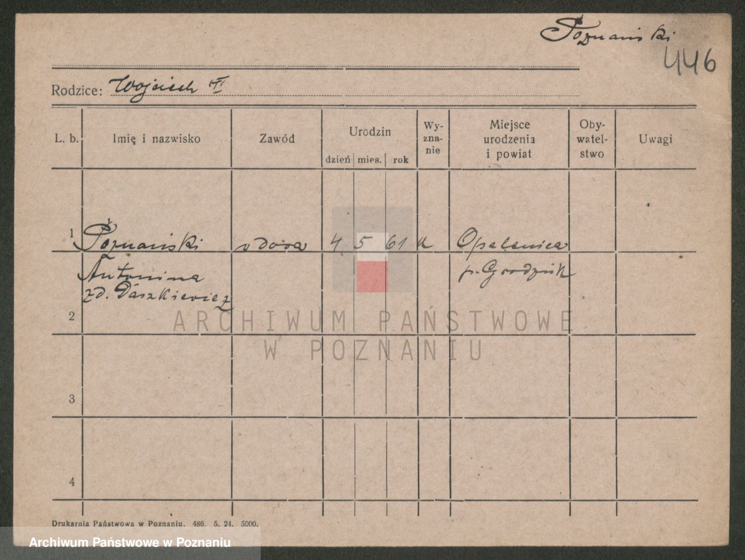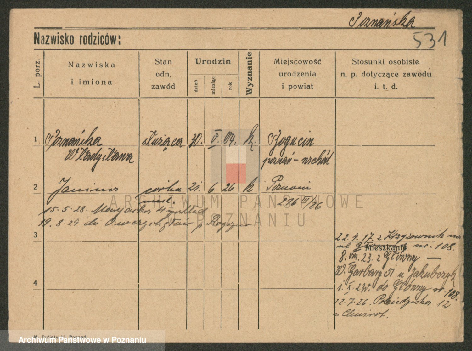 Podgląd karty osobowej dostępny jest po kliknięciu na nazwisko lub ikonkę karty. Można dokonywać powiększenia (ikony na górze) lub przechodzić między kolejnymi skanami (strzałki po bokach).