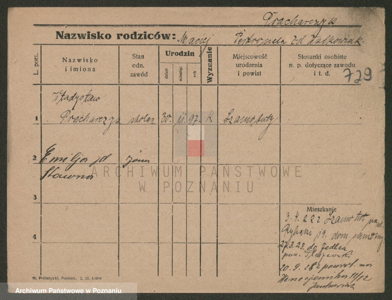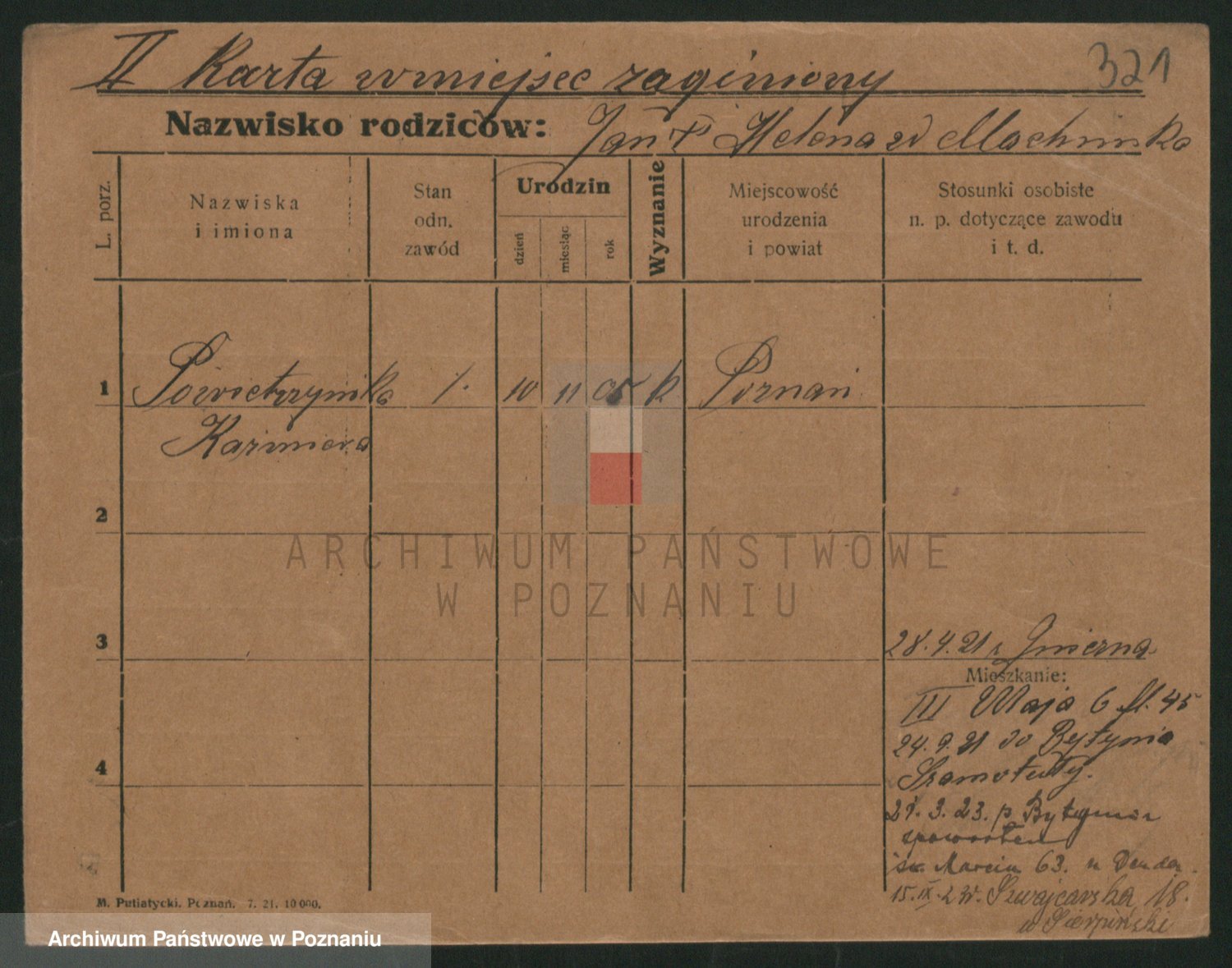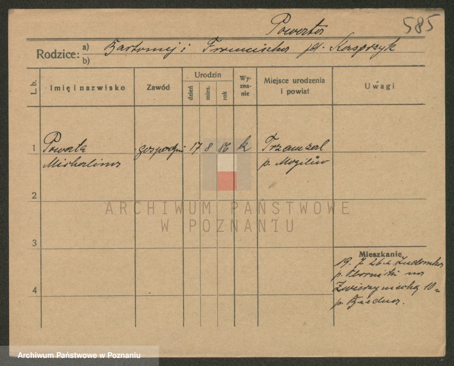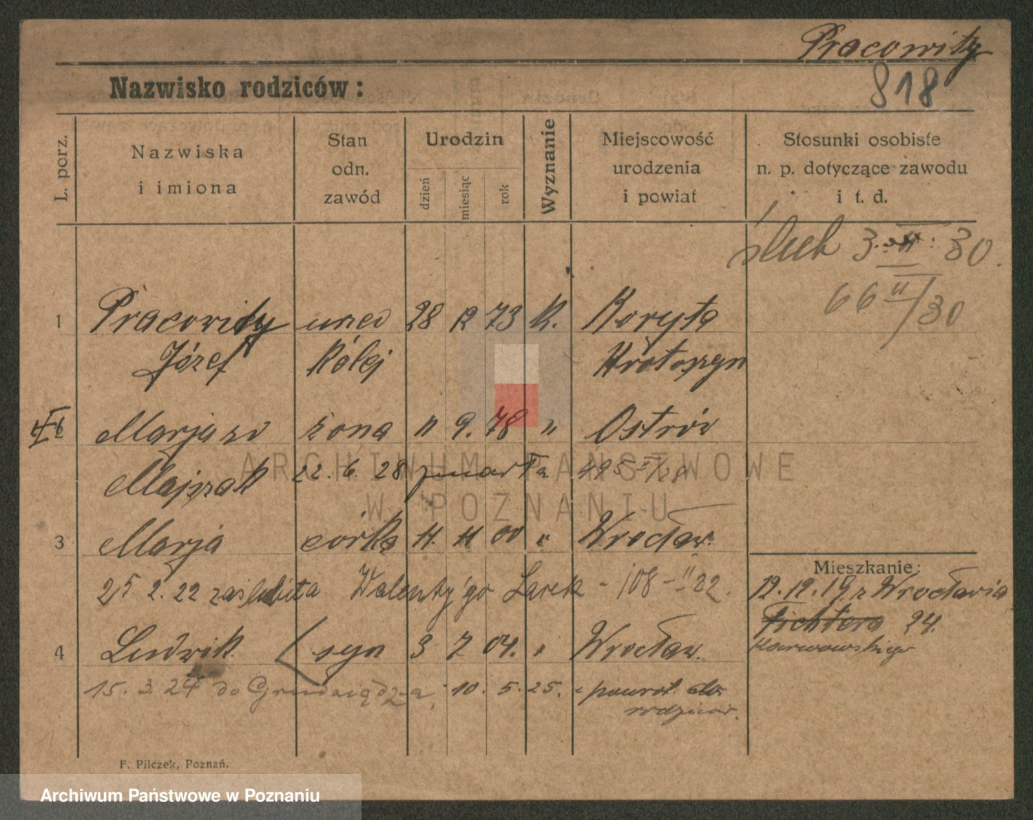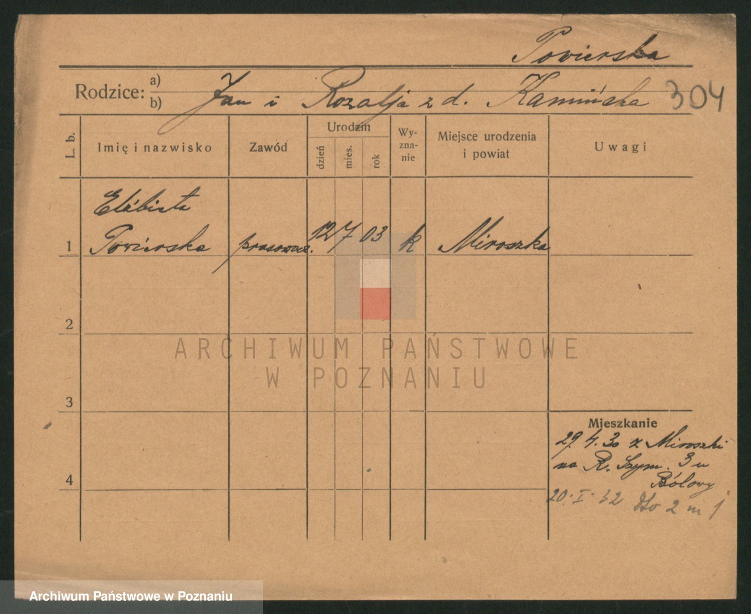 Podgląd karty osobowej dostępny jest po kliknięciu na nazwisko lub ikonkę karty. Można dokonywać powiększenia (ikony na górze) lub przechodzić między kolejnymi skanami (strzałki po bokach).