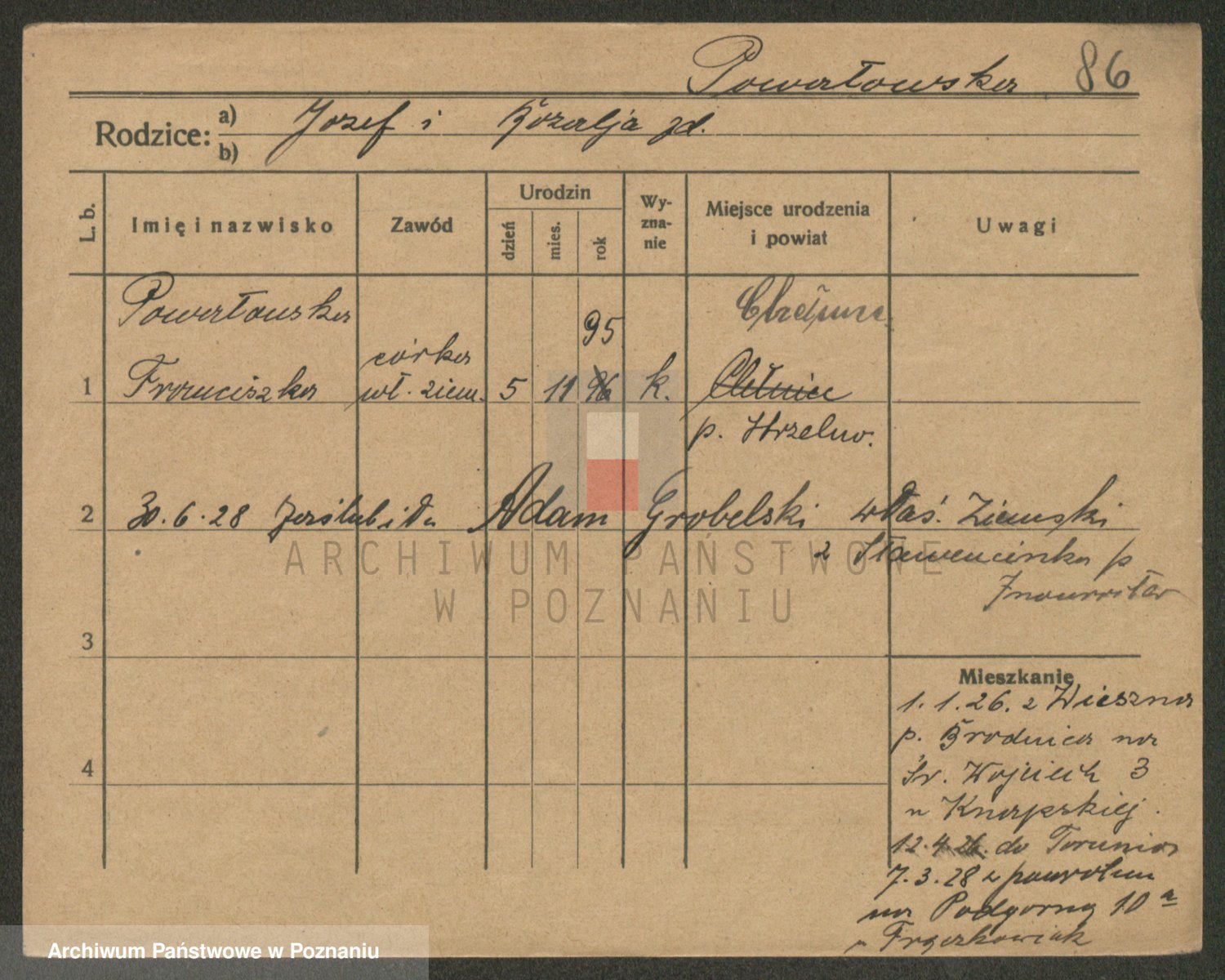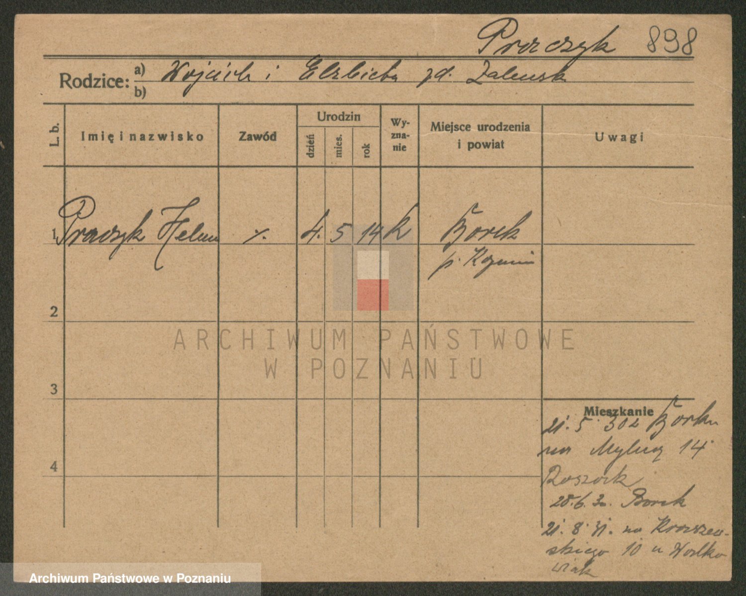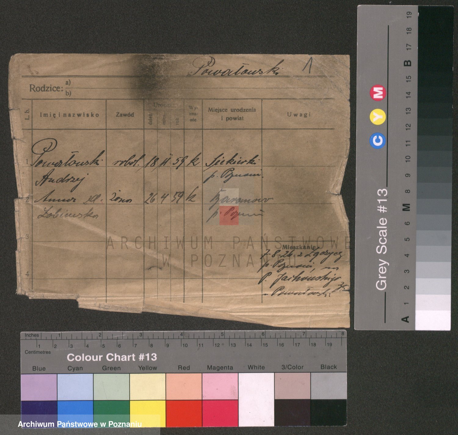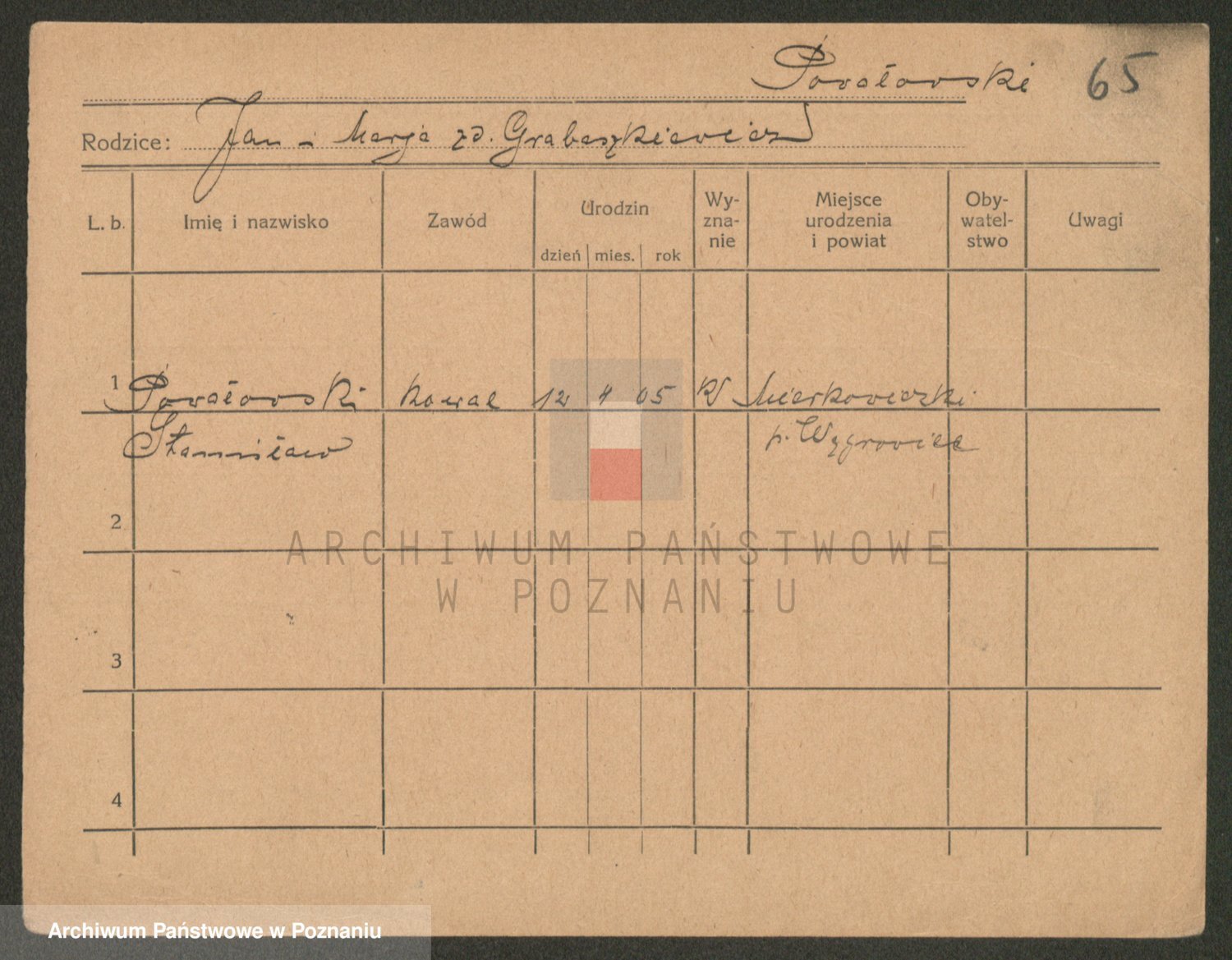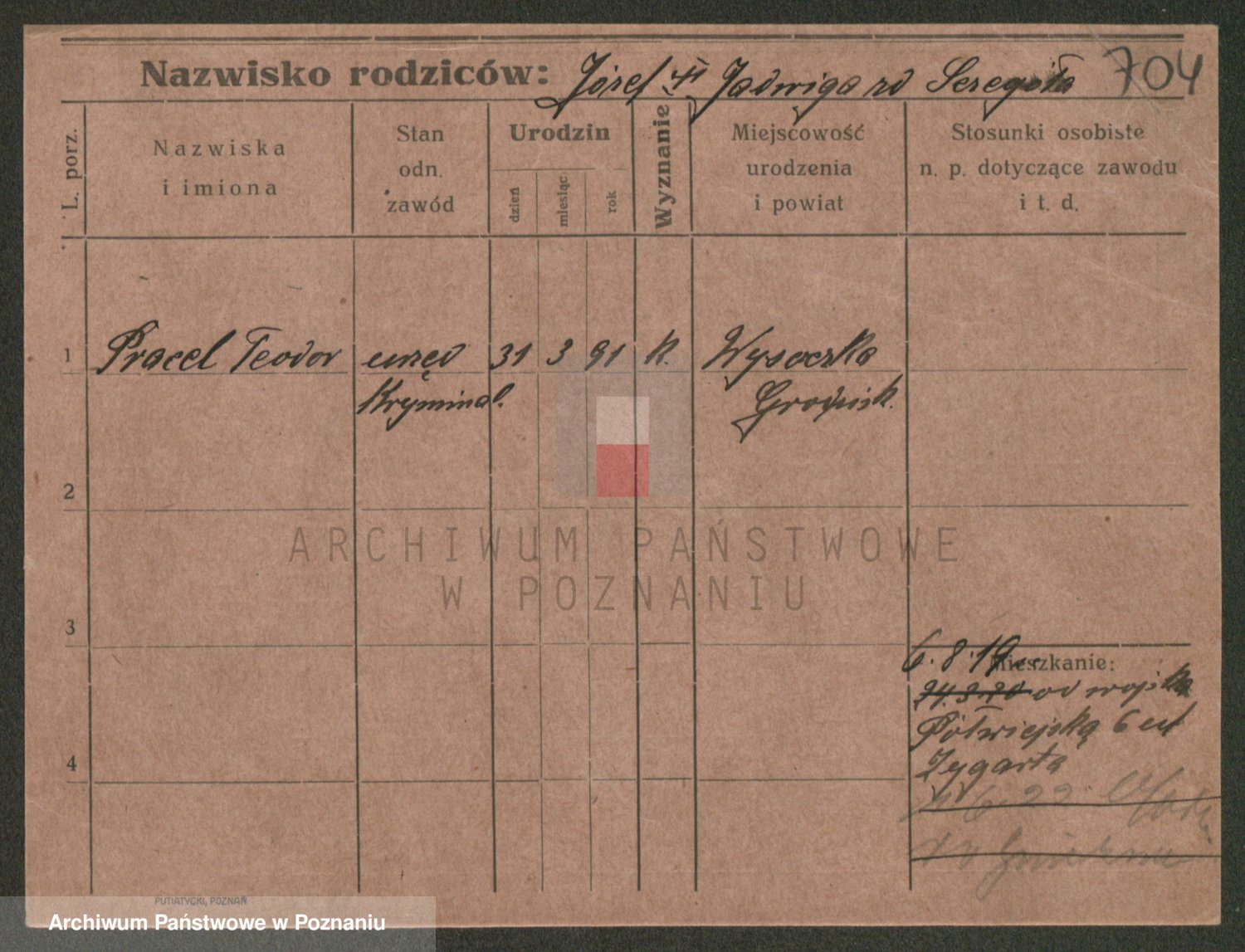 Podgląd karty osobowej dostępny jest po kliknięciu na nazwisko lub ikonkę karty. Można dokonywać powiększenia (ikony na górze) lub przechodzić między kolejnymi skanami (strzałki po bokach).