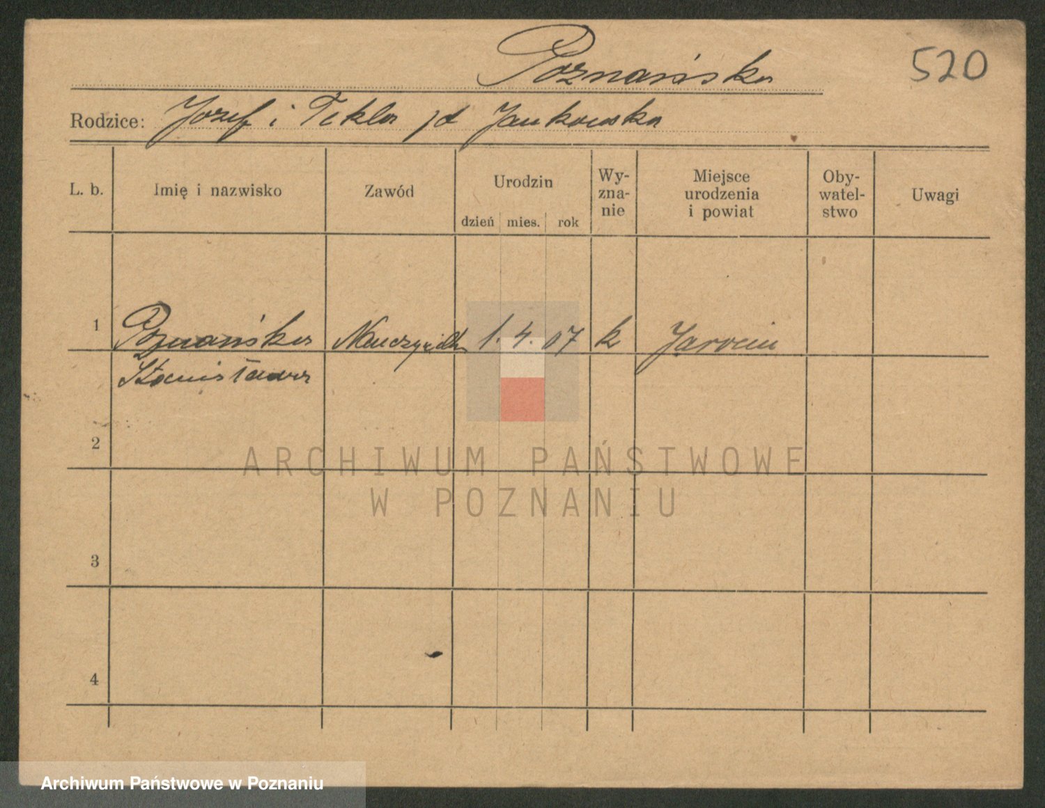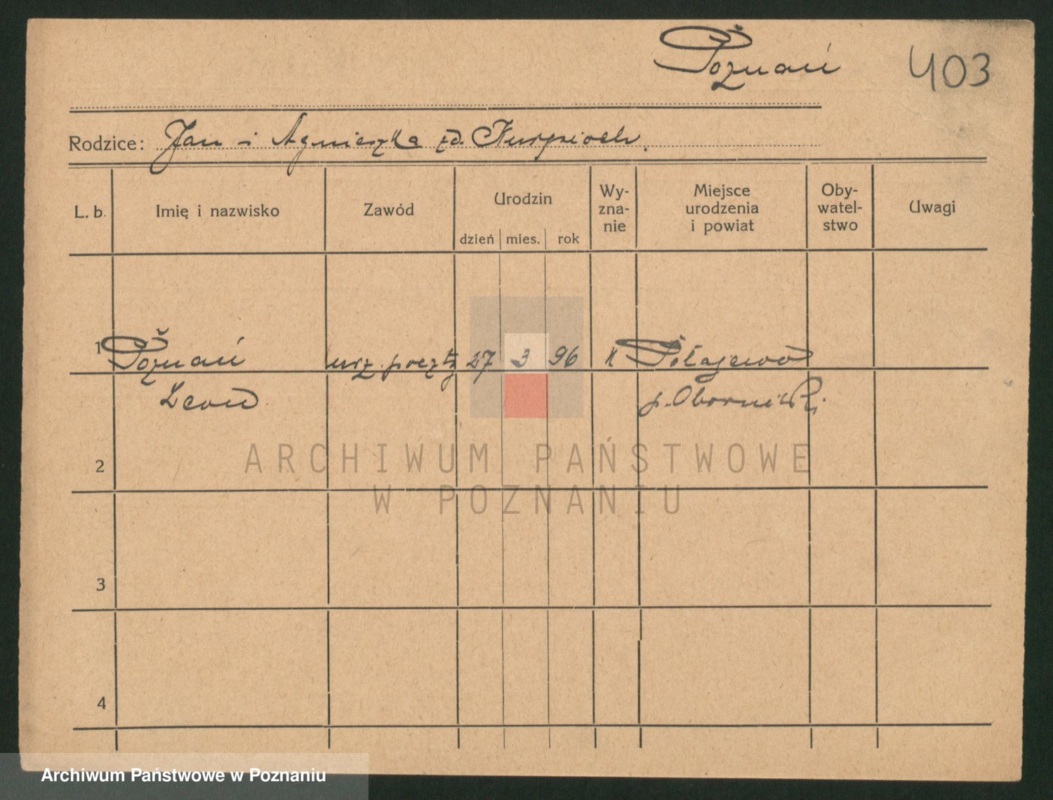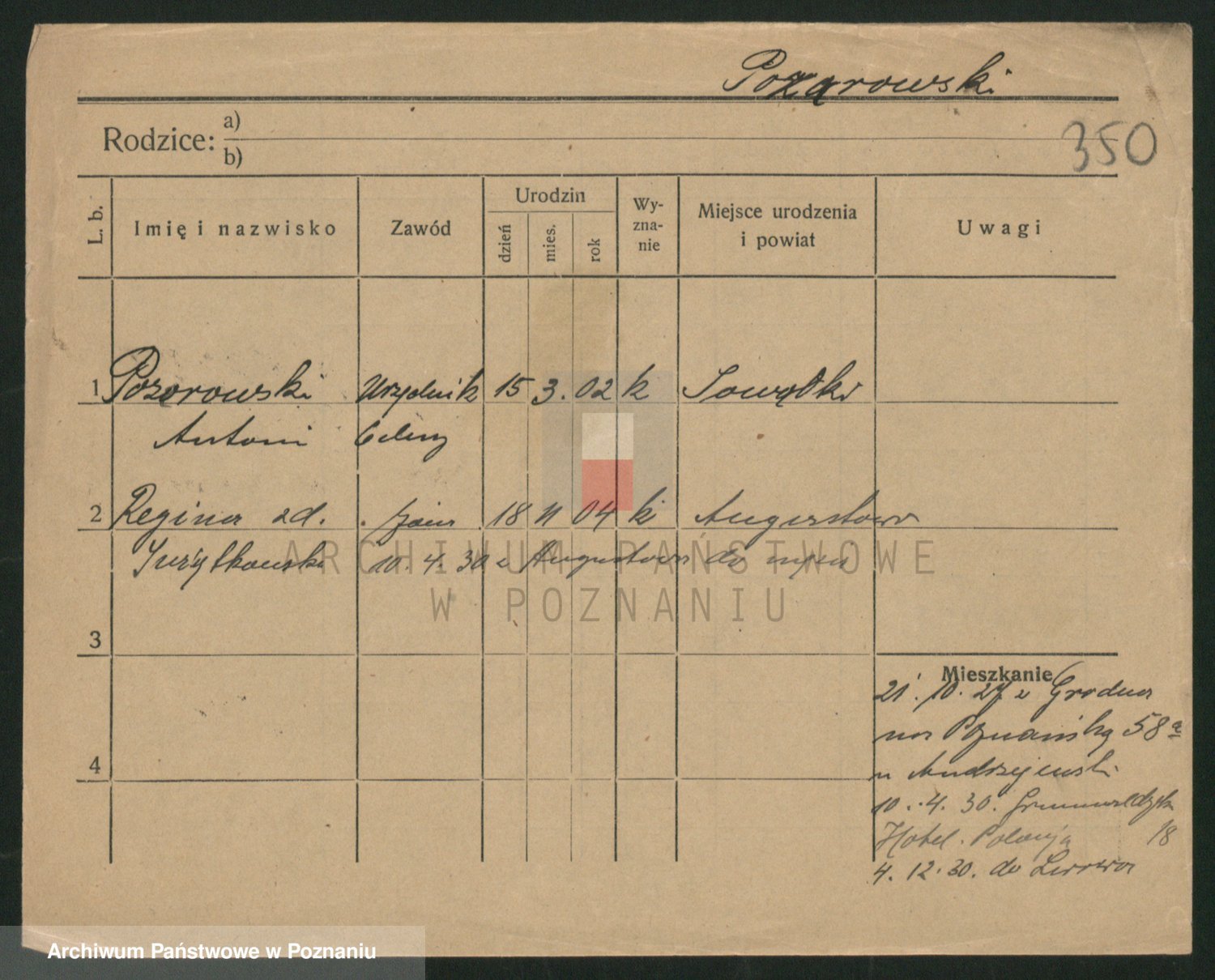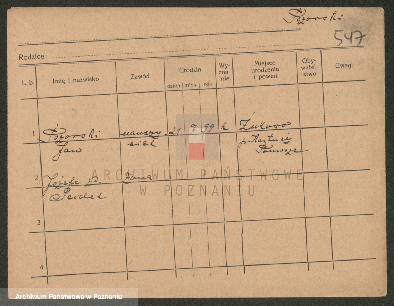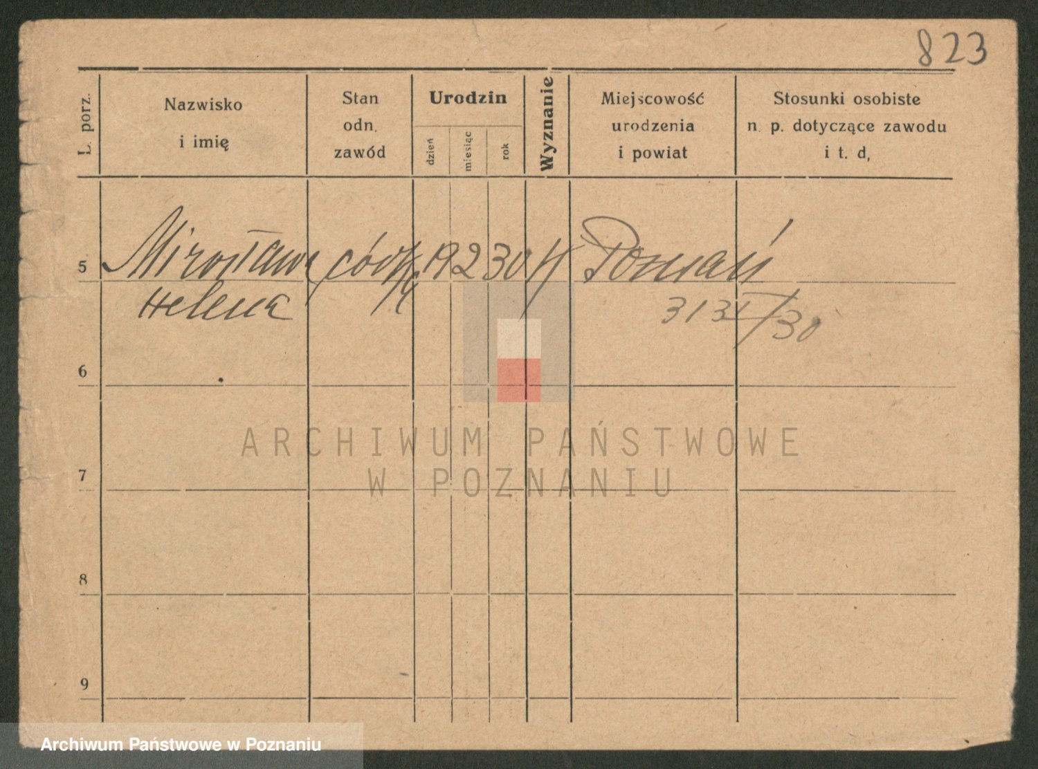 Podgląd karty osobowej dostępny jest po kliknięciu na nazwisko lub ikonkę karty. Można dokonywać powiększenia (ikony na górze) lub przechodzić między kolejnymi skanami (strzałki po bokach).