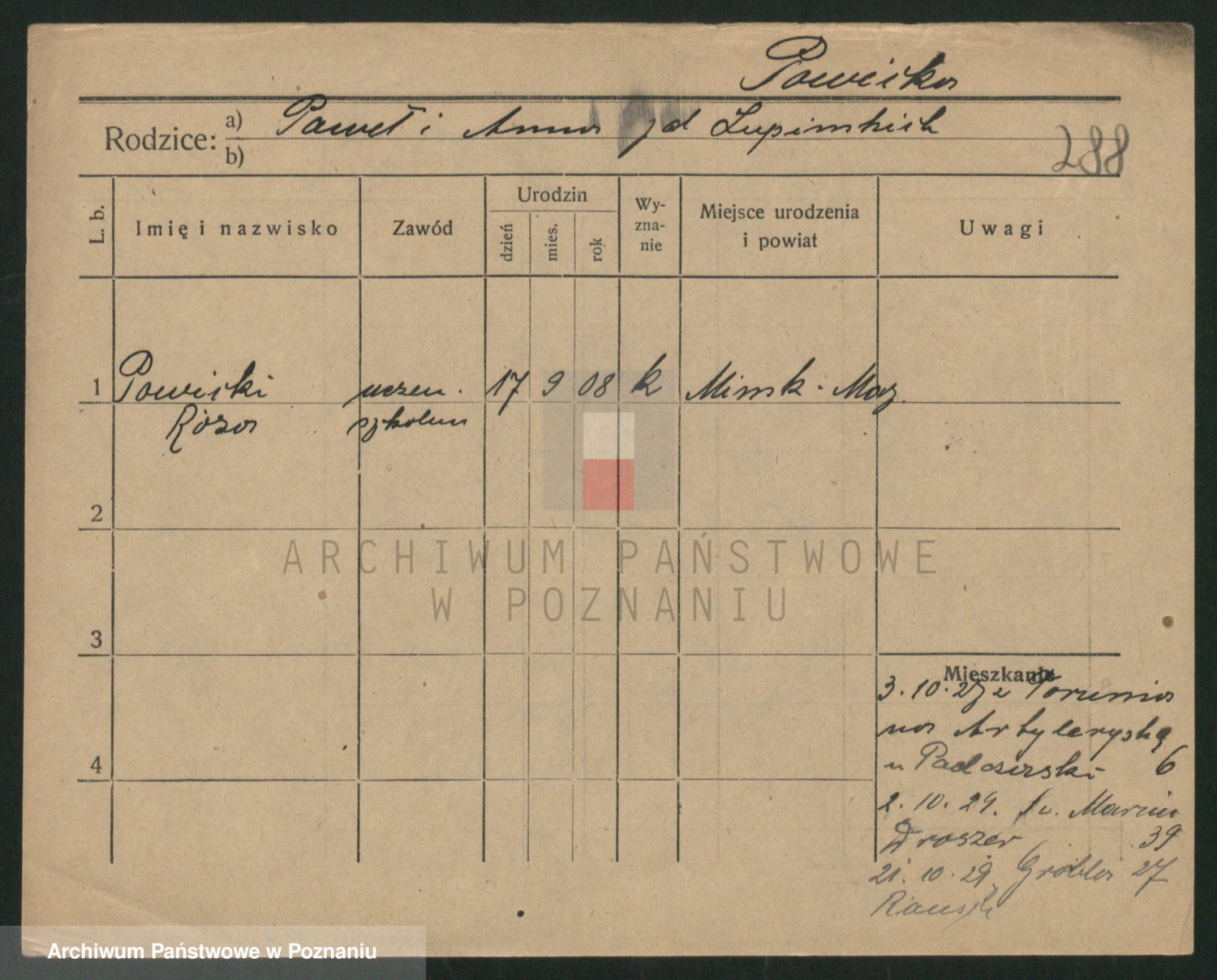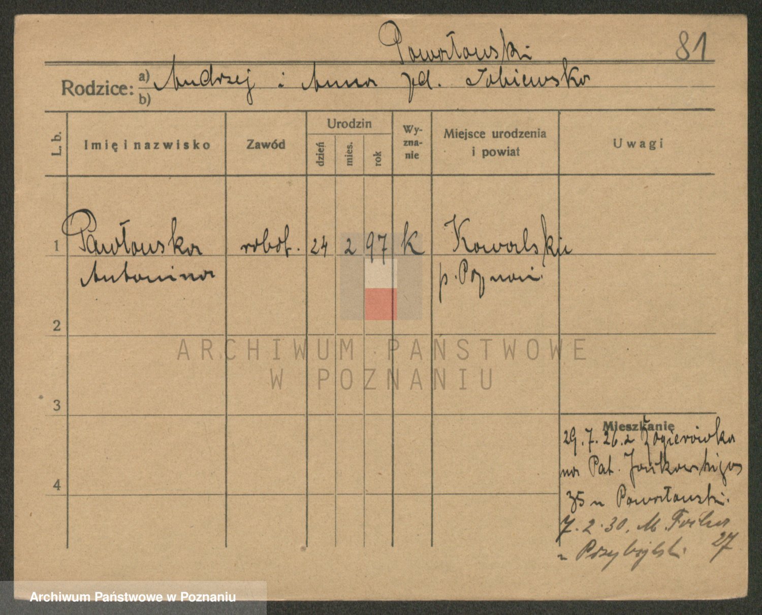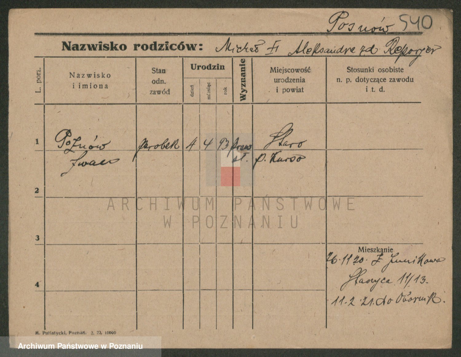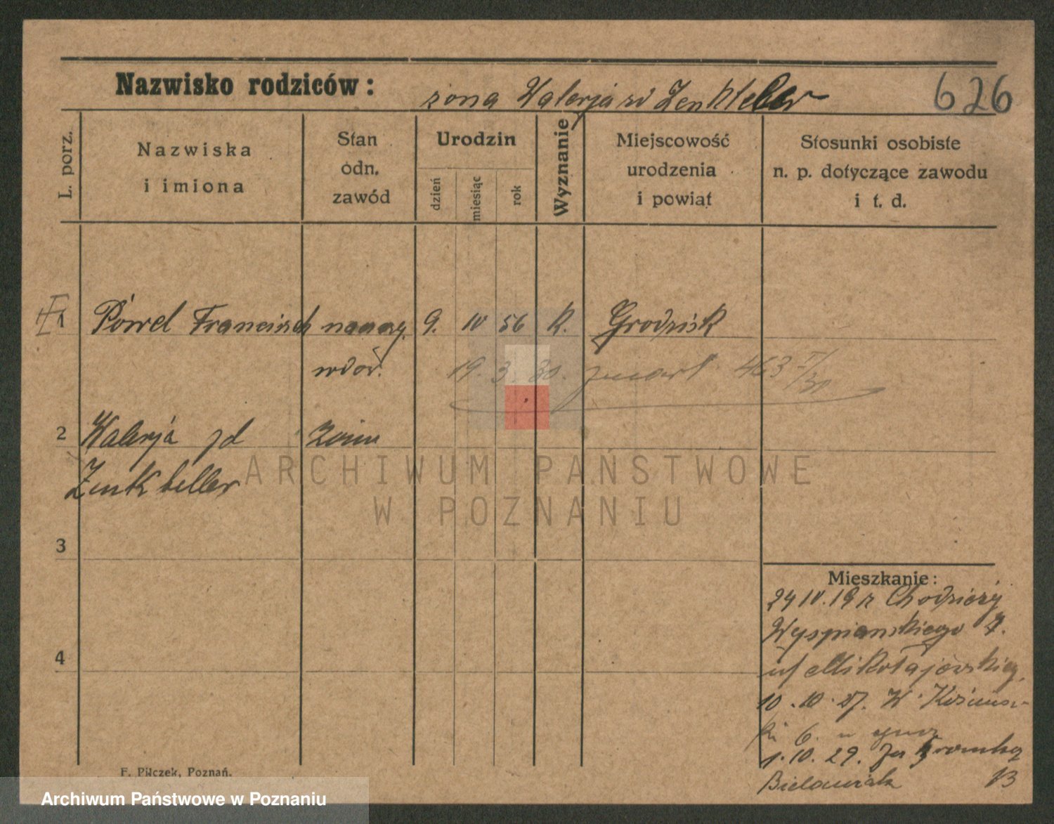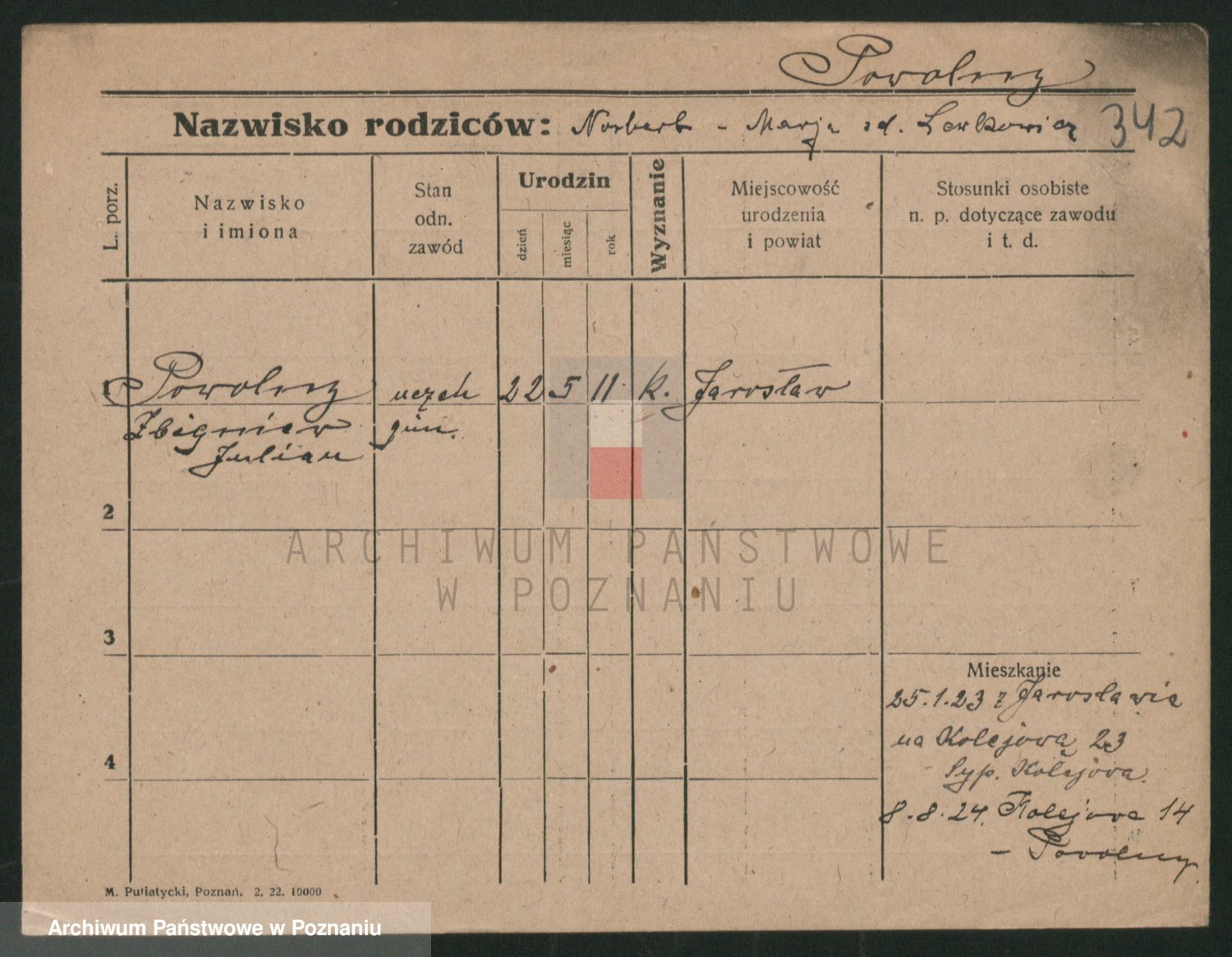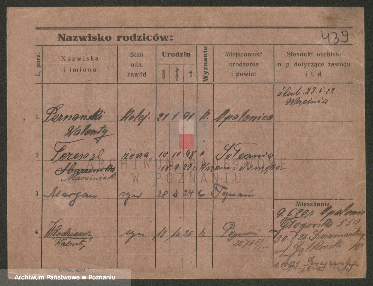 Podgląd karty osobowej dostępny jest po kliknięciu na nazwisko lub ikonkę karty. Można dokonywać powiększenia (ikony na górze) lub przechodzić między kolejnymi skanami (strzałki po bokach).
