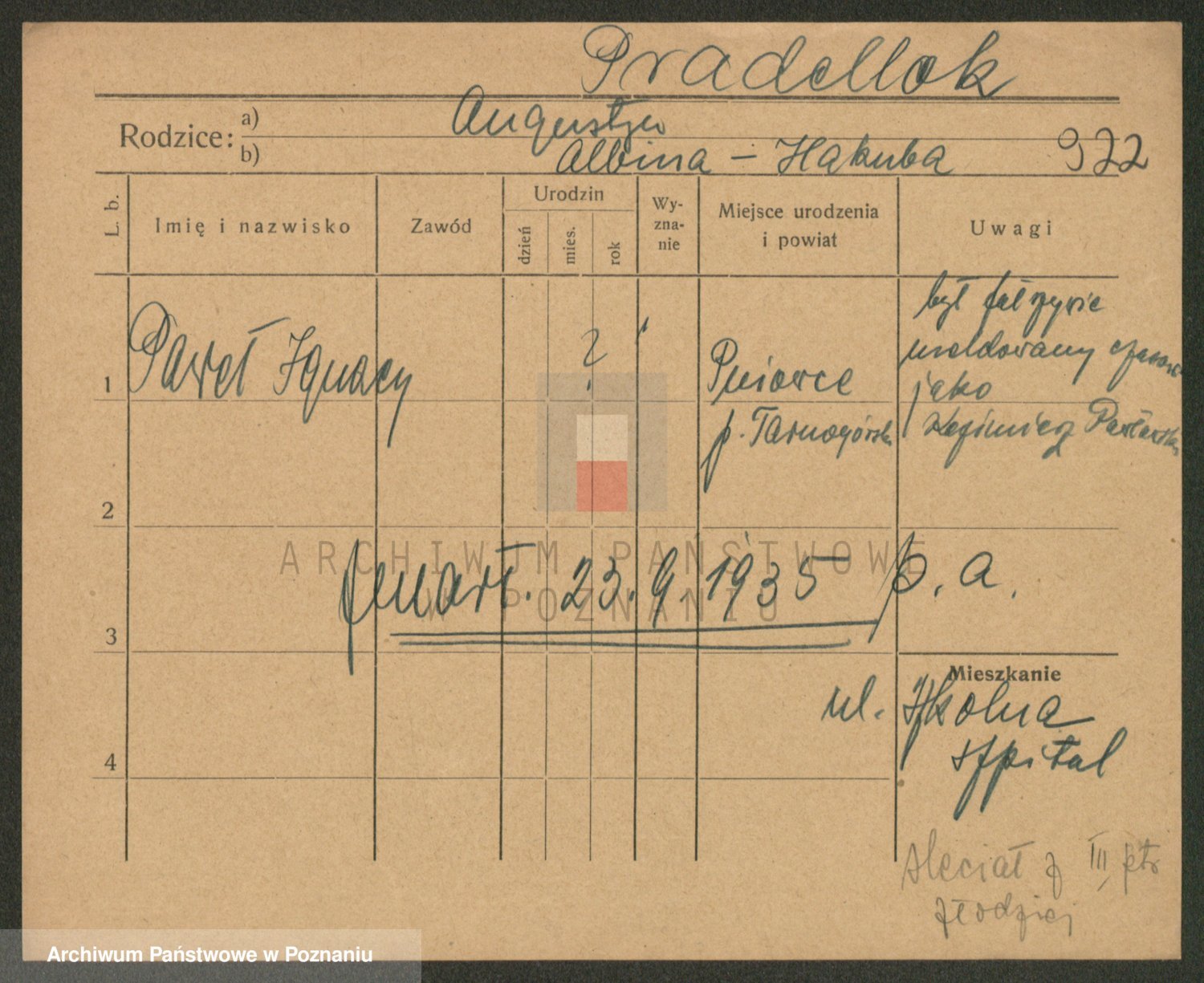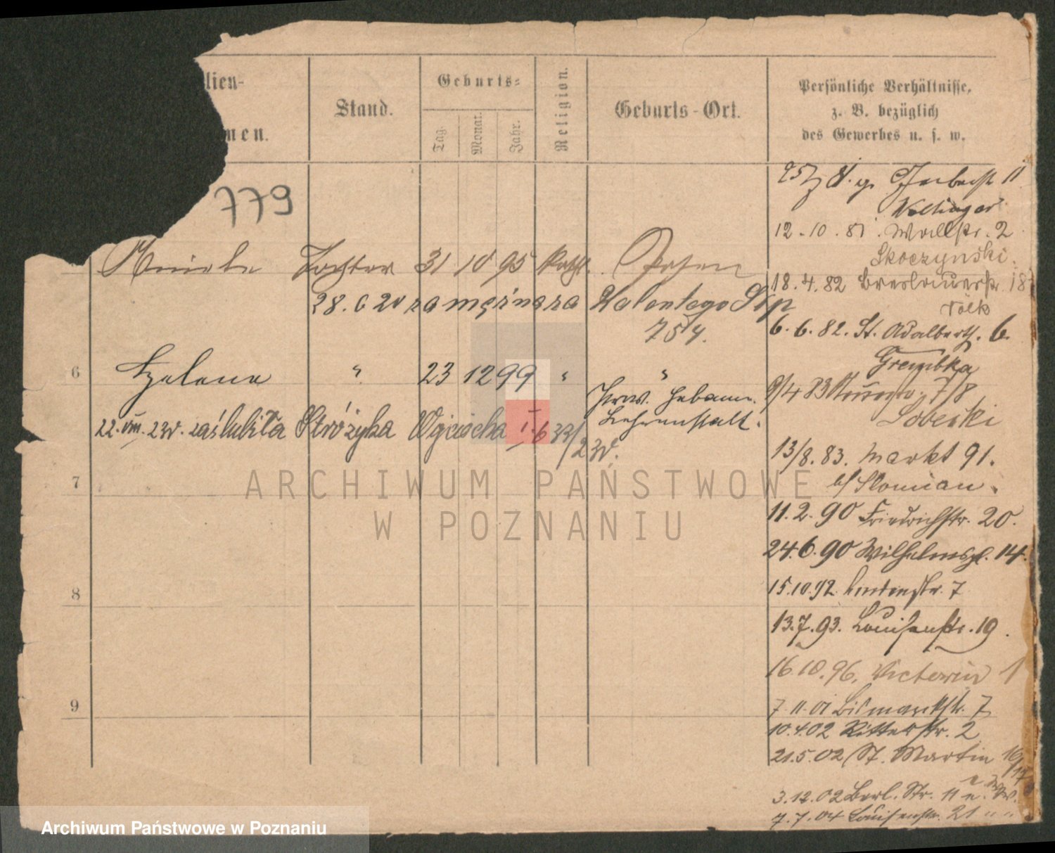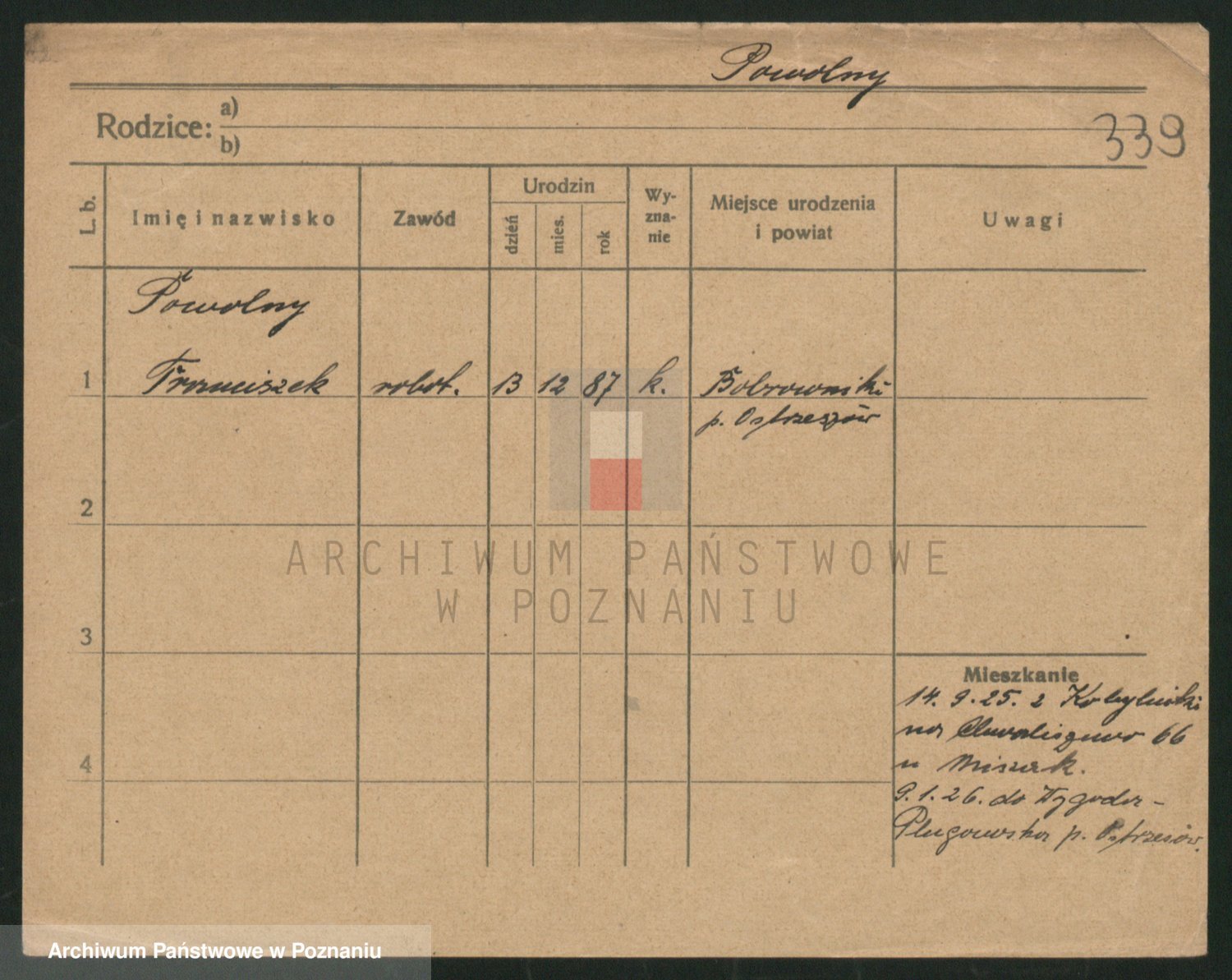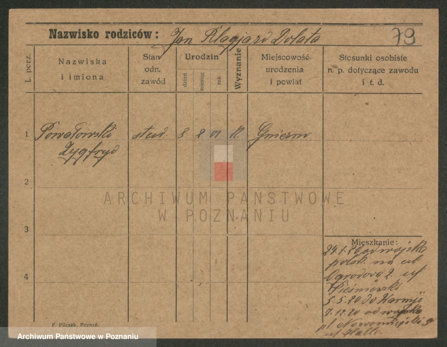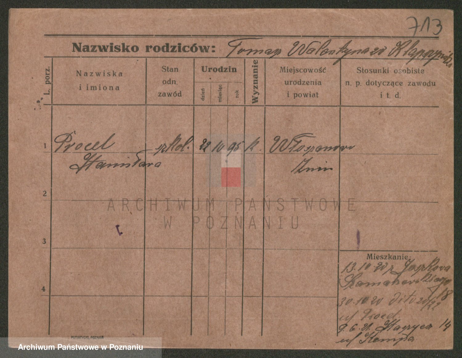 Podgląd karty osobowej dostępny jest po kliknięciu na nazwisko lub ikonkę karty. Można dokonywać powiększenia (ikony na górze) lub przechodzić między kolejnymi skanami (strzałki po bokach).