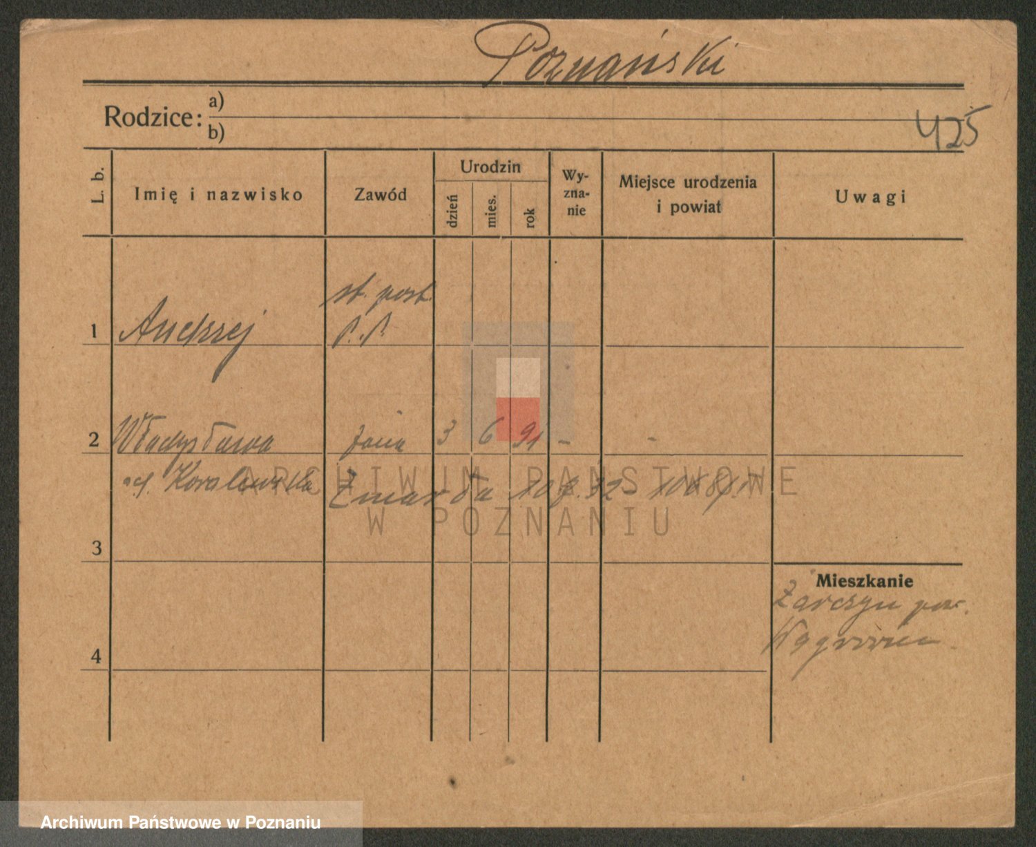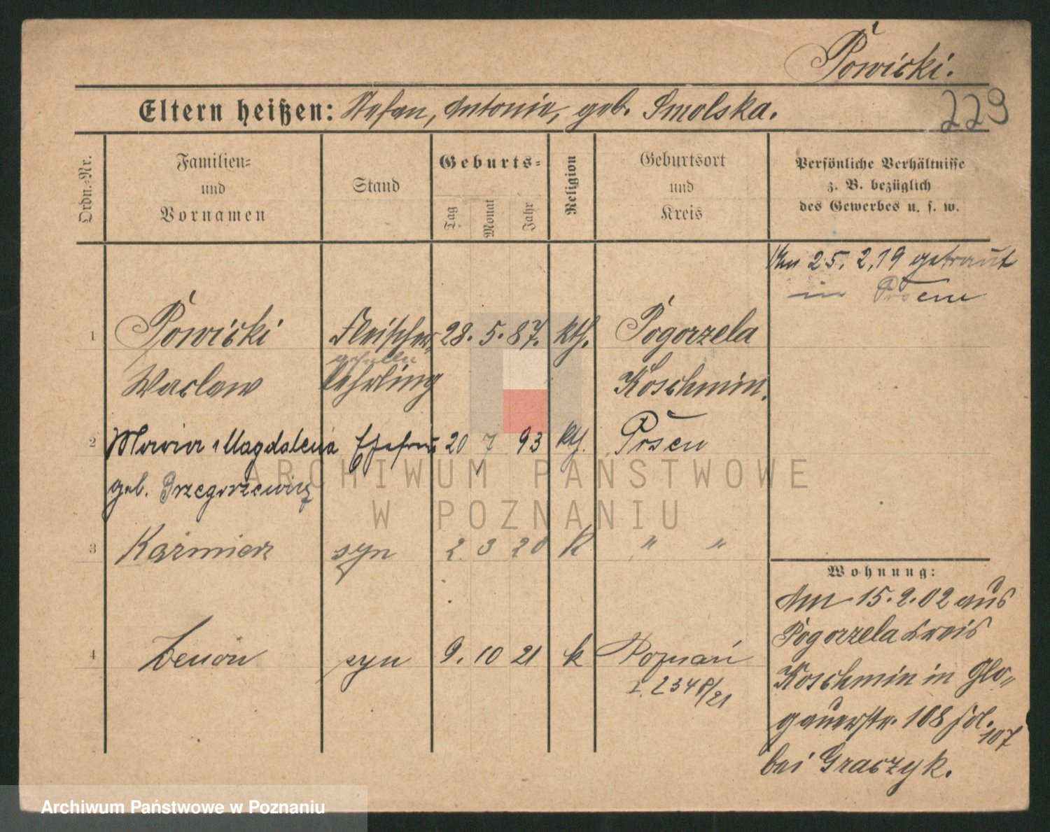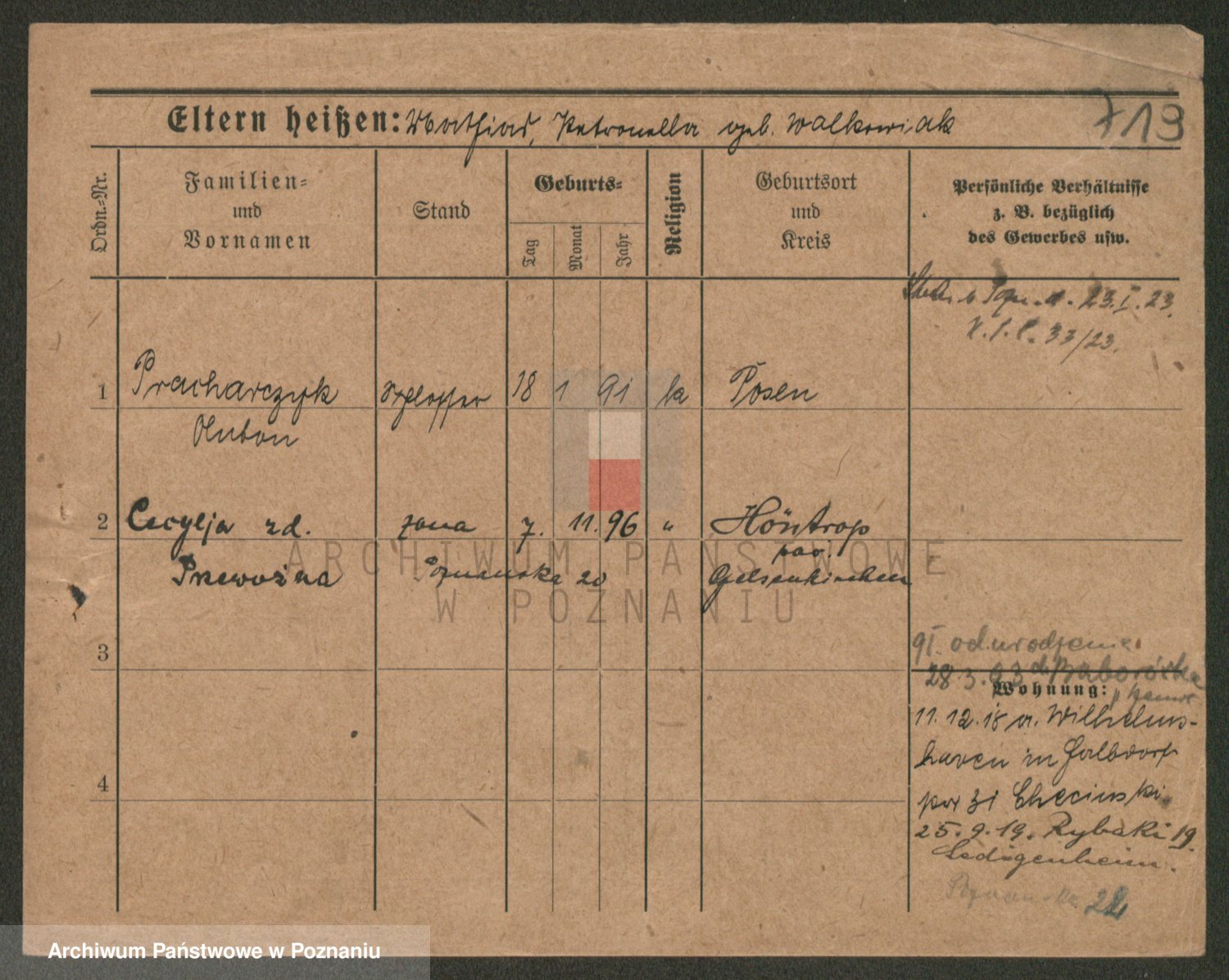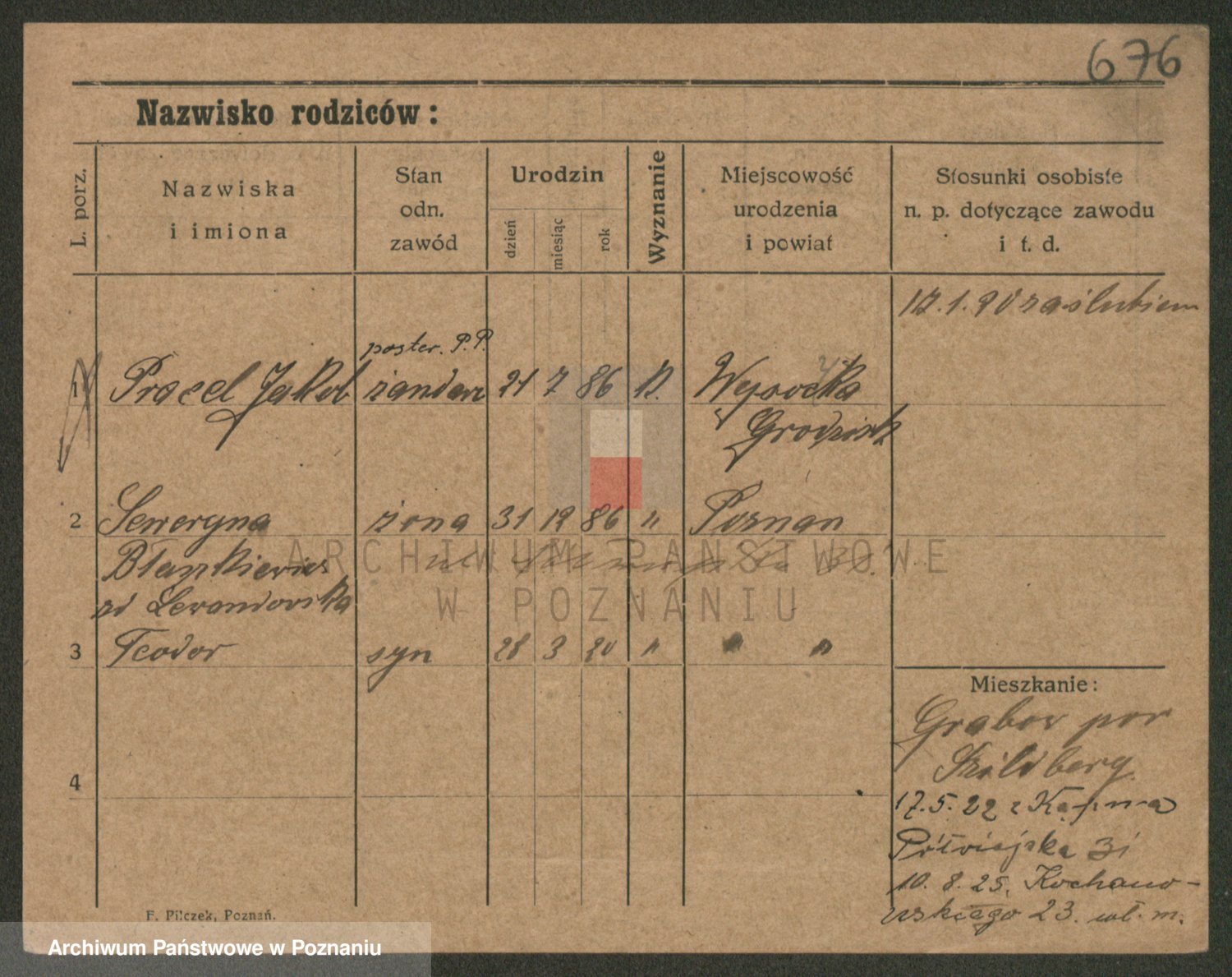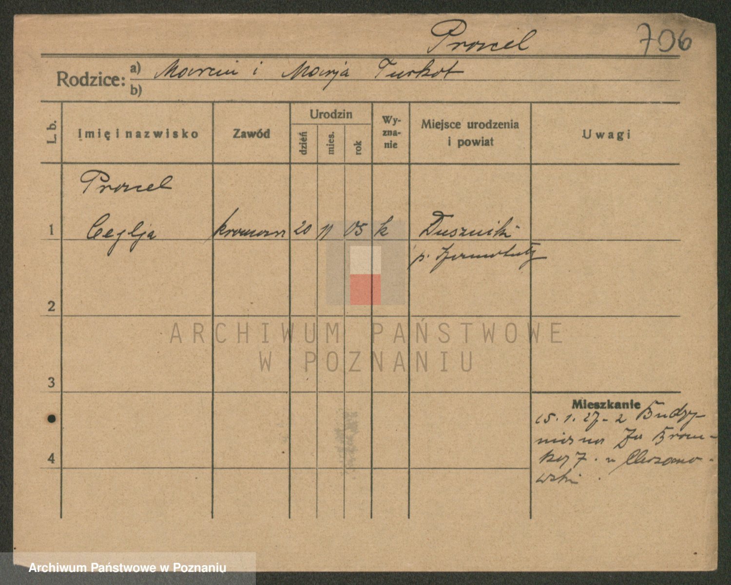 Podgląd karty osobowej dostępny jest po kliknięciu na nazwisko lub ikonkę karty. Można dokonywać powiększenia (ikony na górze) lub przechodzić między kolejnymi skanami (strzałki po bokach).