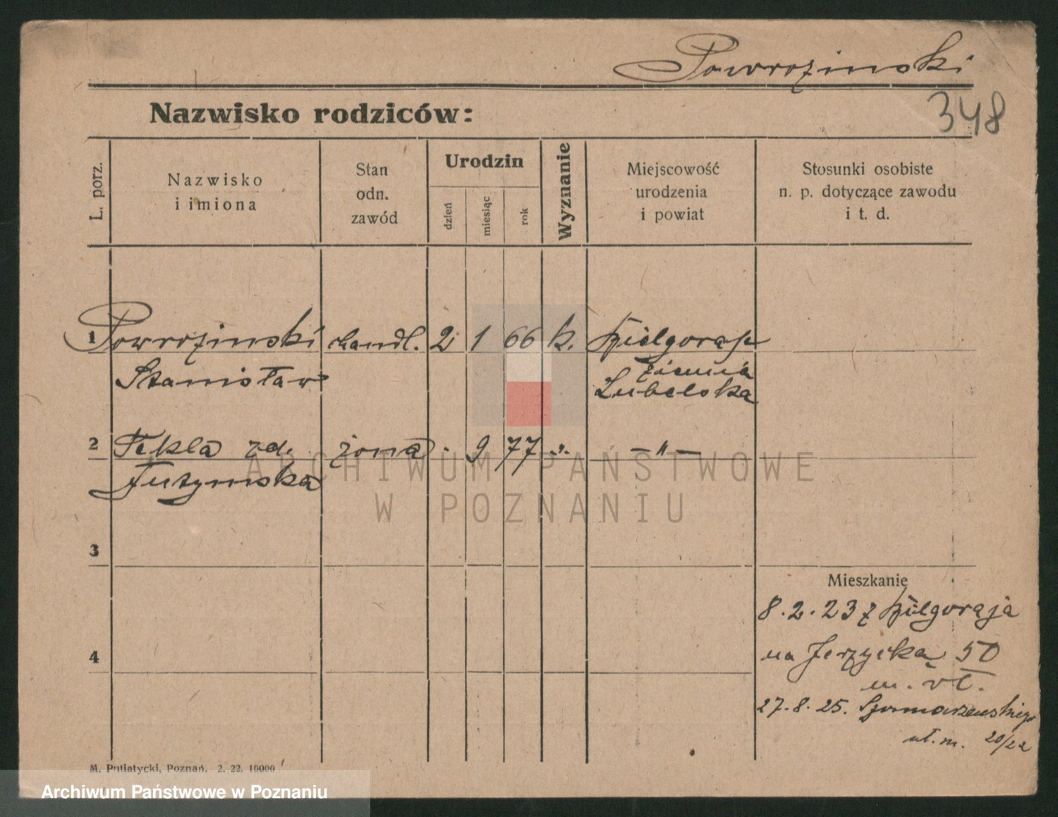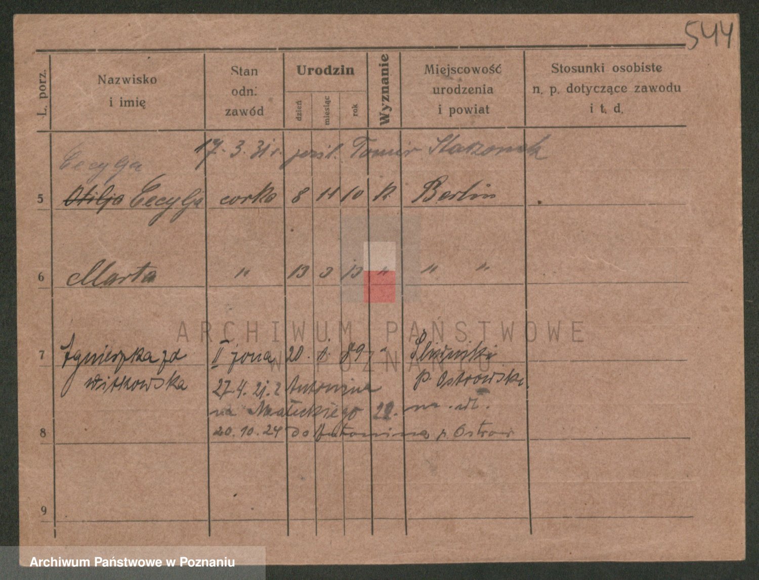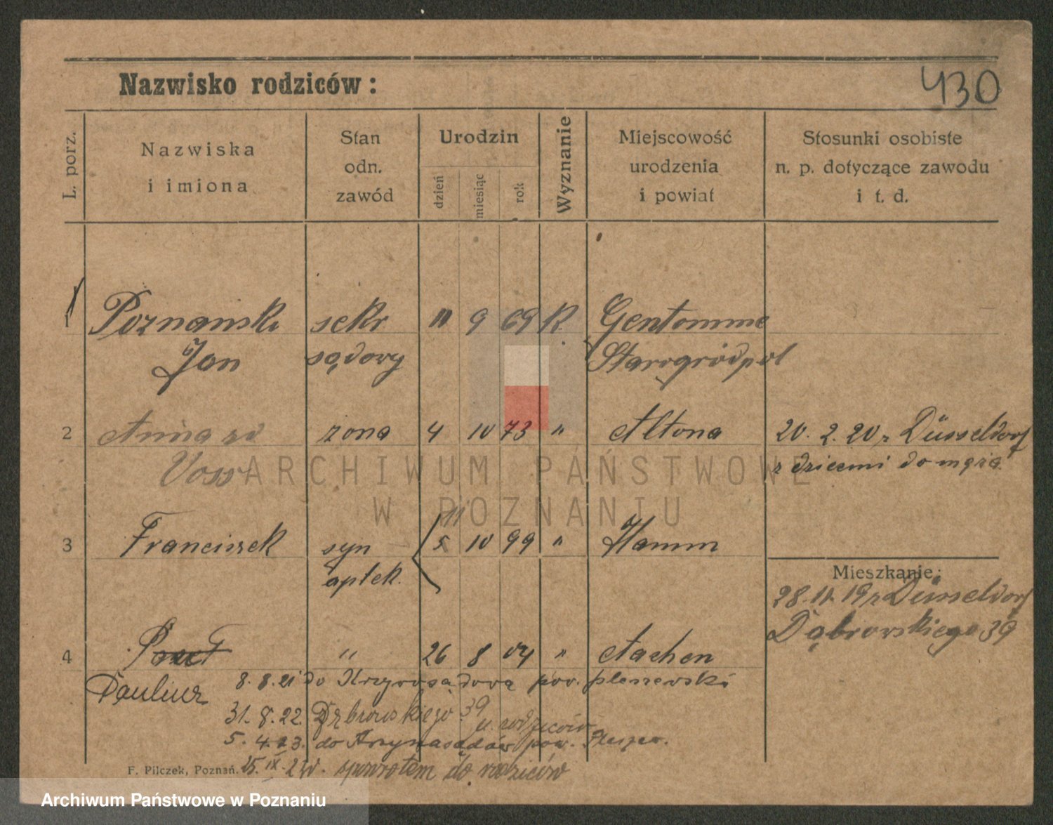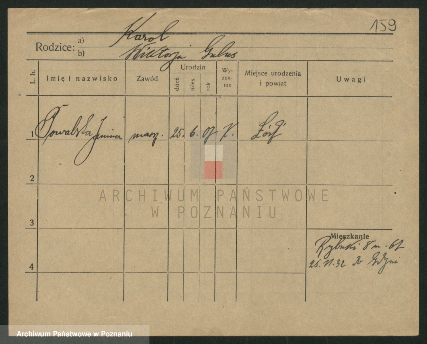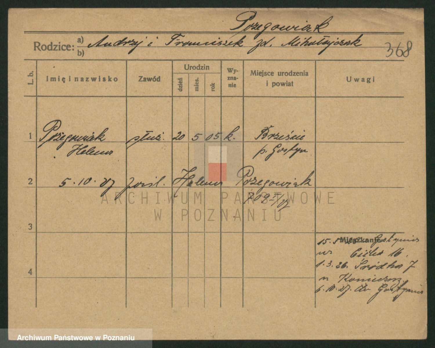 Podgląd karty osobowej dostępny jest po kliknięciu na nazwisko lub ikonkę karty. Można dokonywać powiększenia (ikony na górze) lub przechodzić między kolejnymi skanami (strzałki po bokach).