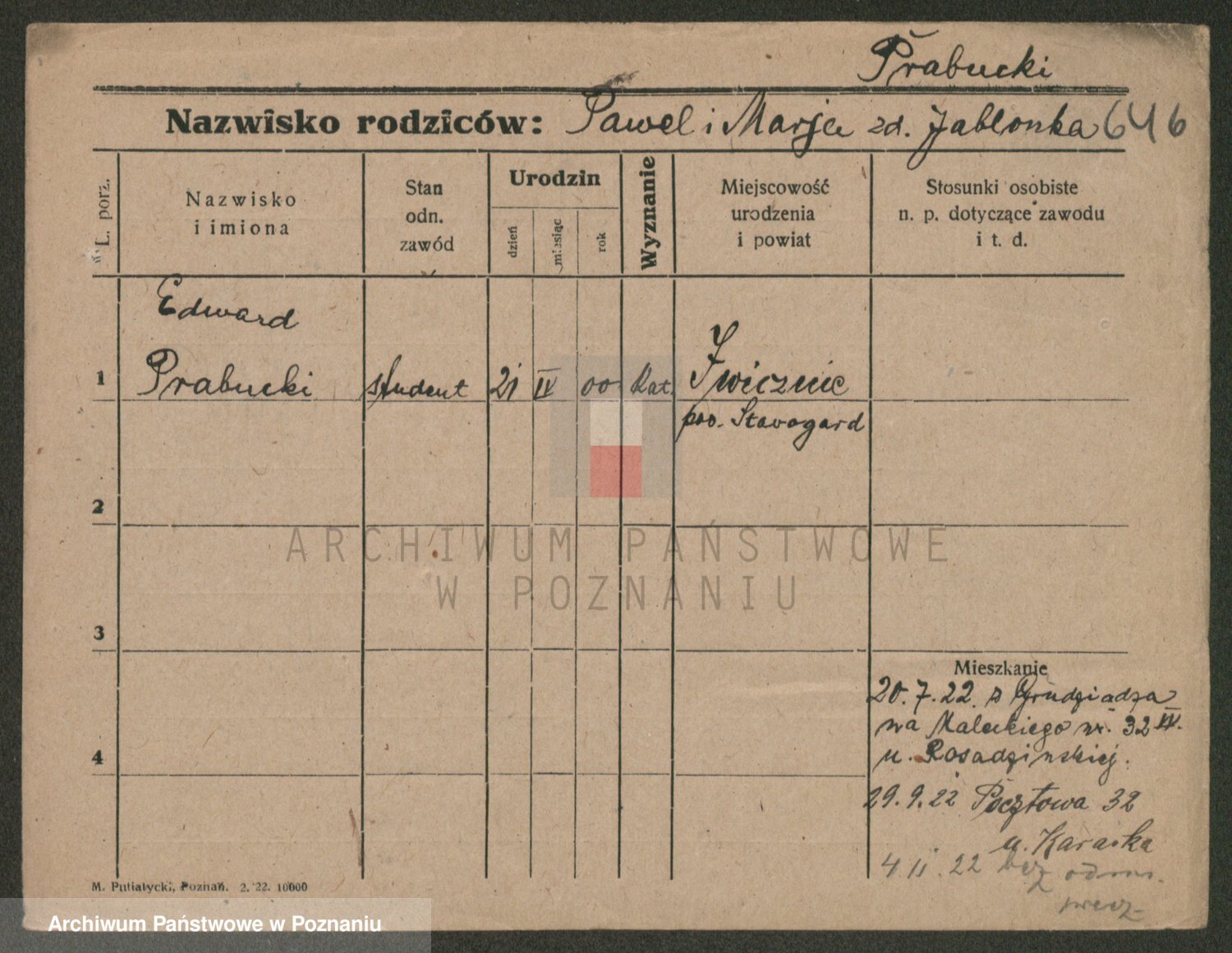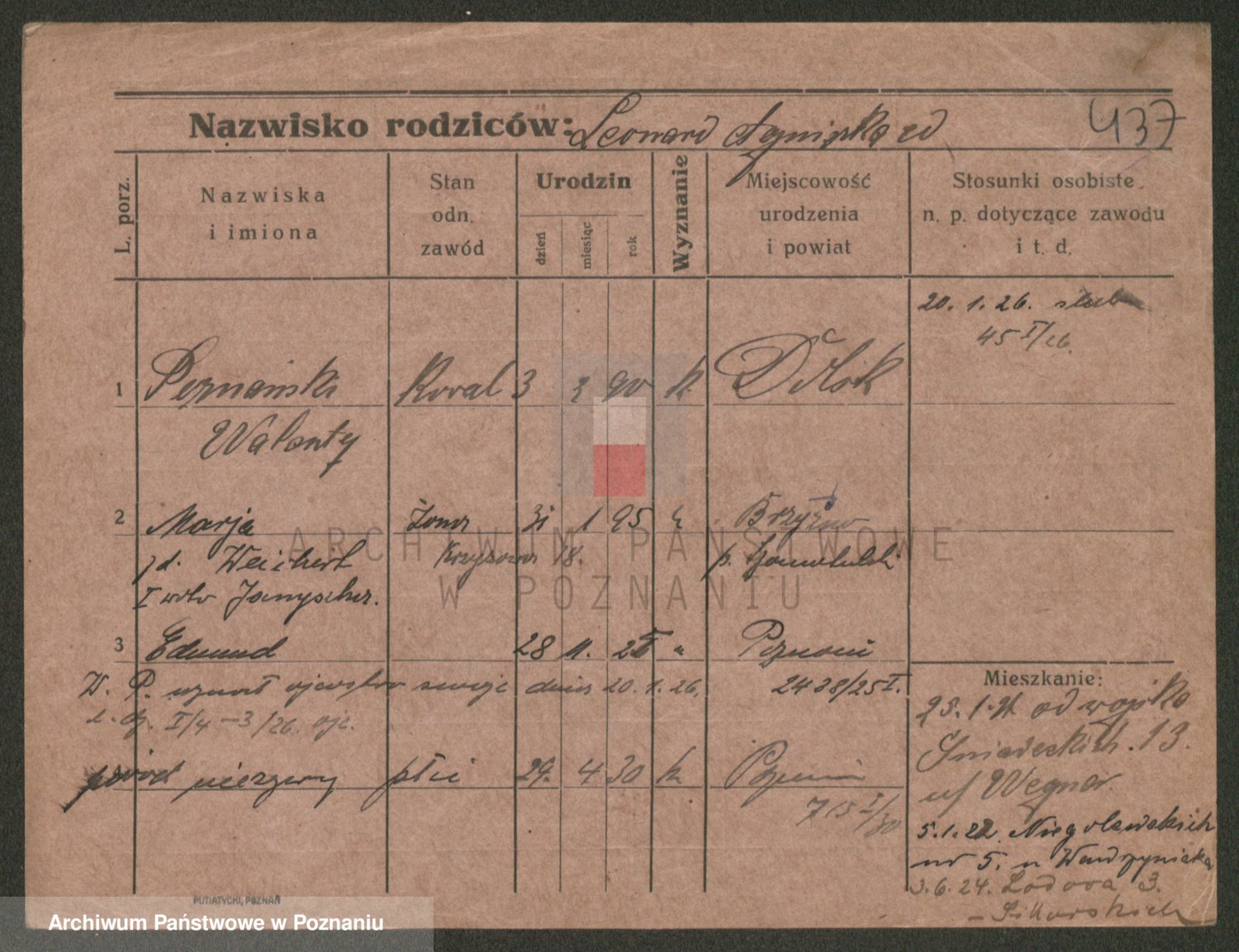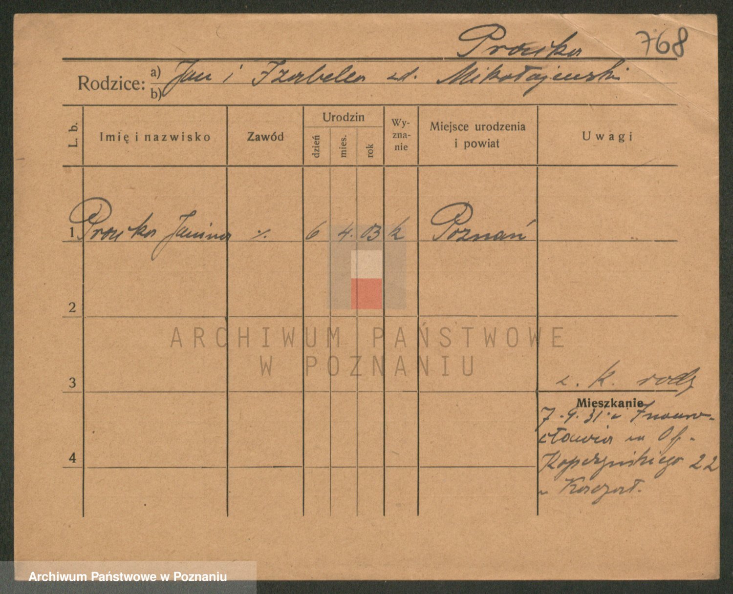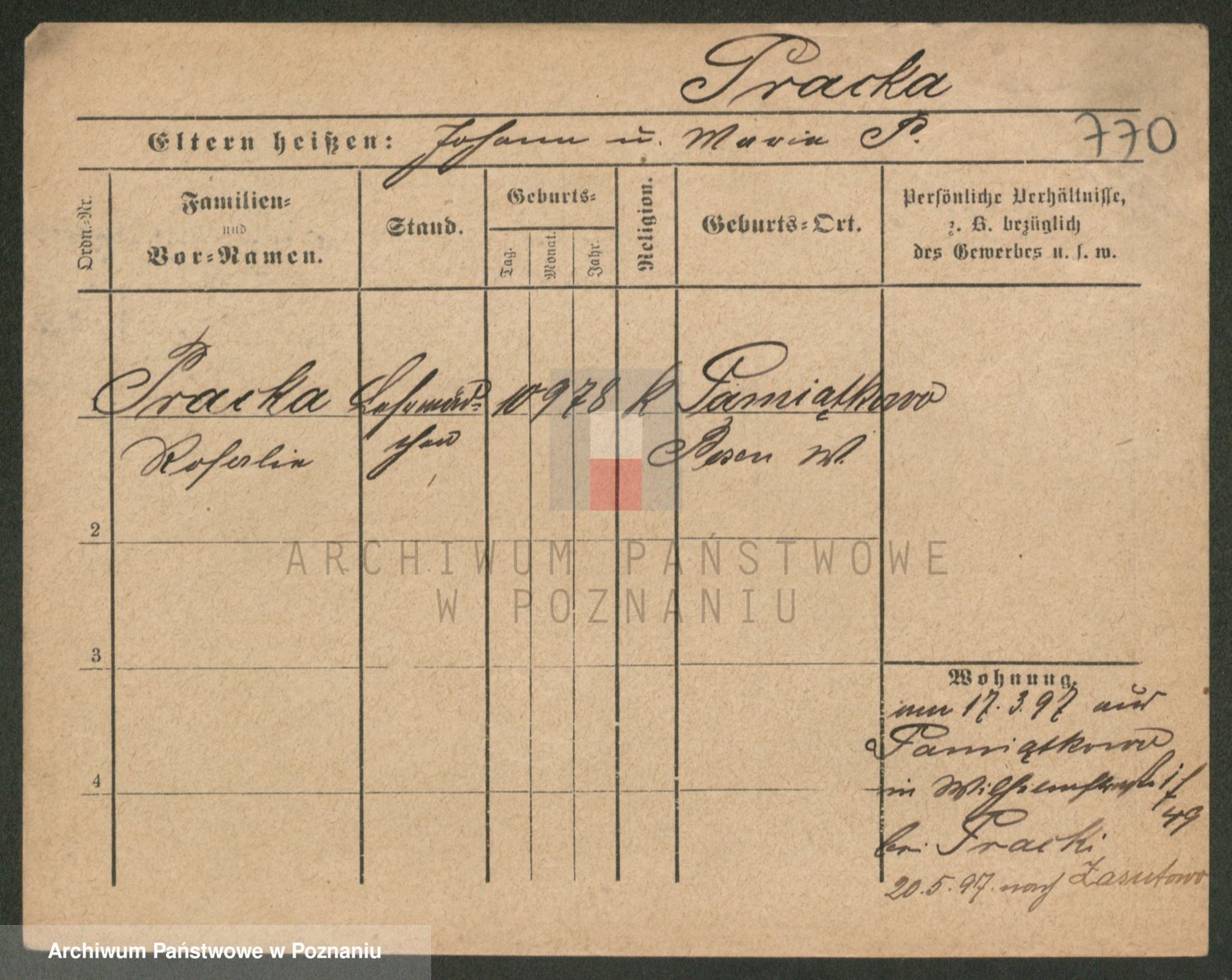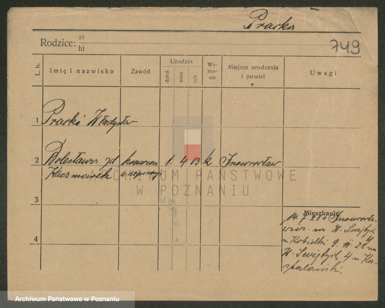 Podgląd karty osobowej dostępny jest po kliknięciu na nazwisko lub ikonkę karty. Można dokonywać powiększenia (ikony na górze) lub przechodzić między kolejnymi skanami (strzałki po bokach).