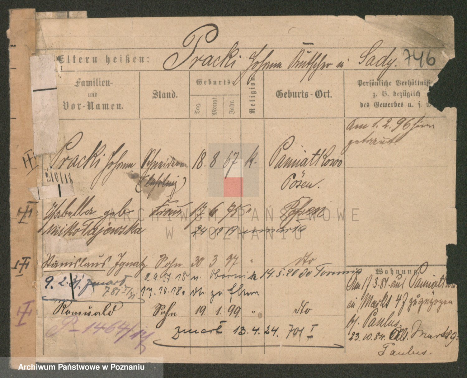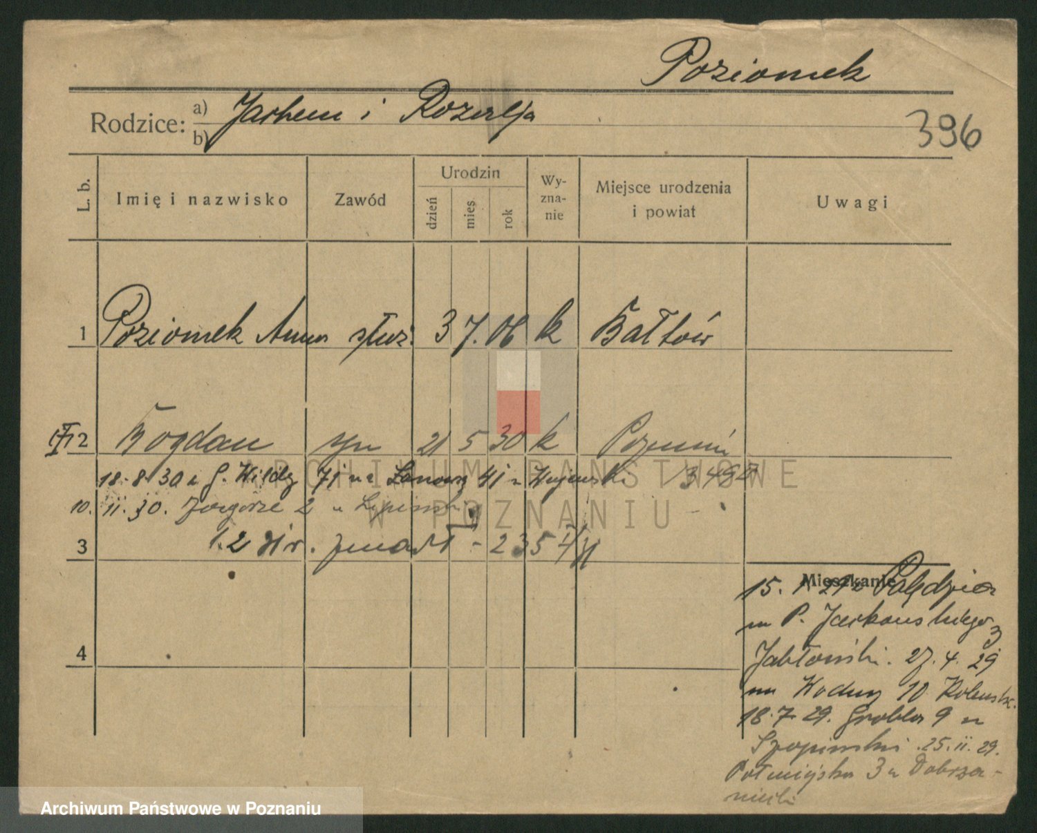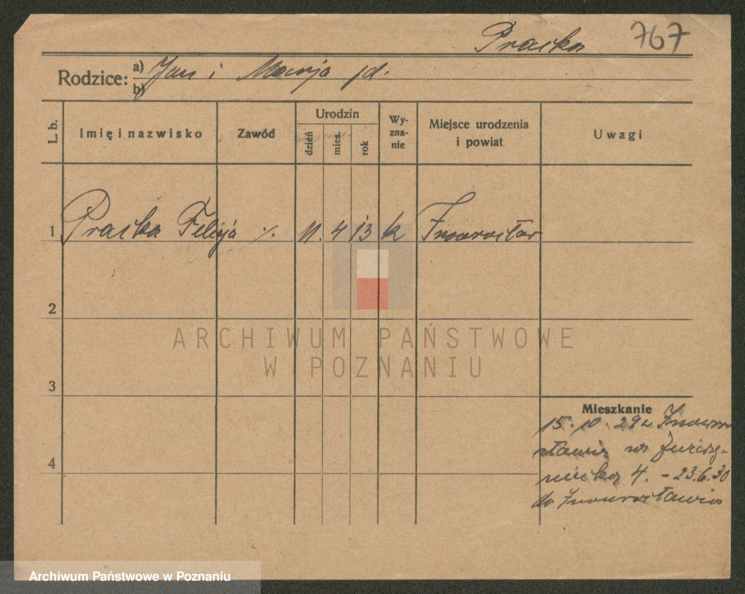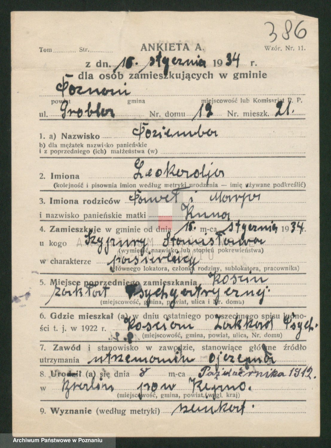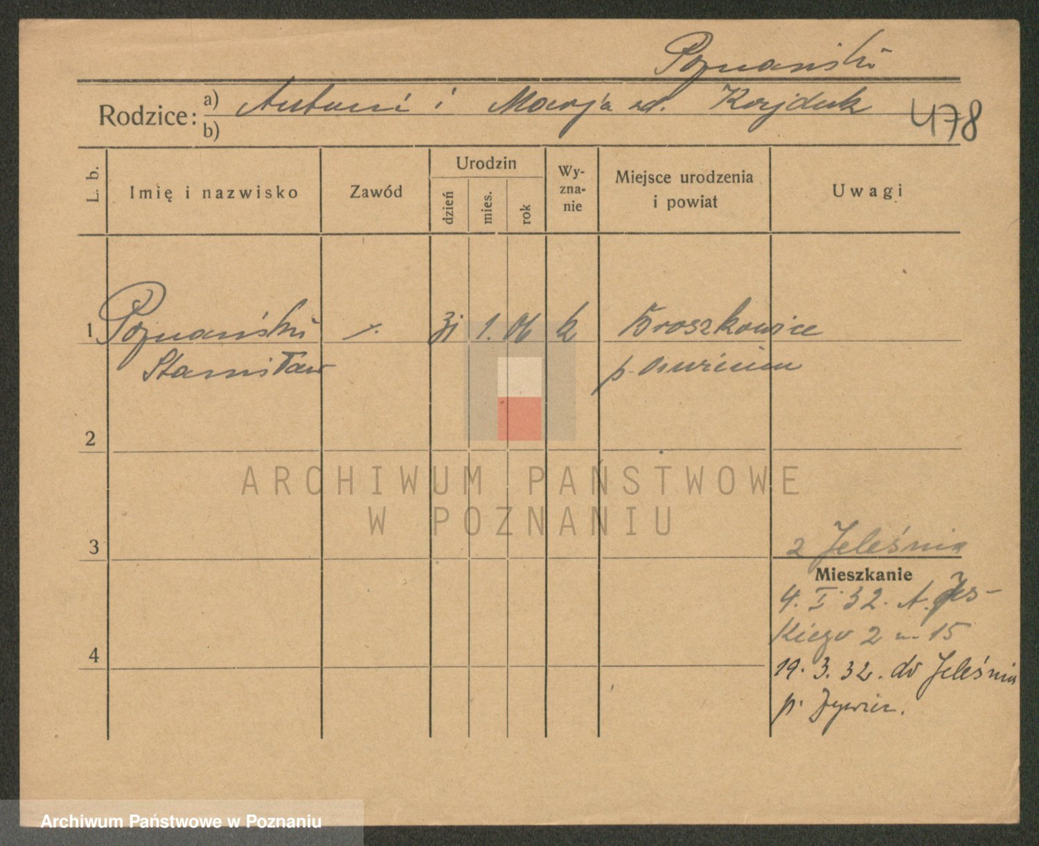 Podgląd karty osobowej dostępny jest po kliknięciu na nazwisko lub ikonkę karty. Można dokonywać powiększenia (ikony na górze) lub przechodzić między kolejnymi skanami (strzałki po bokach).
