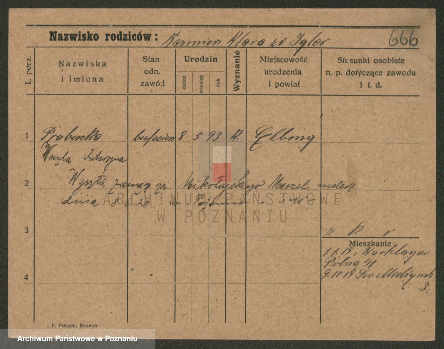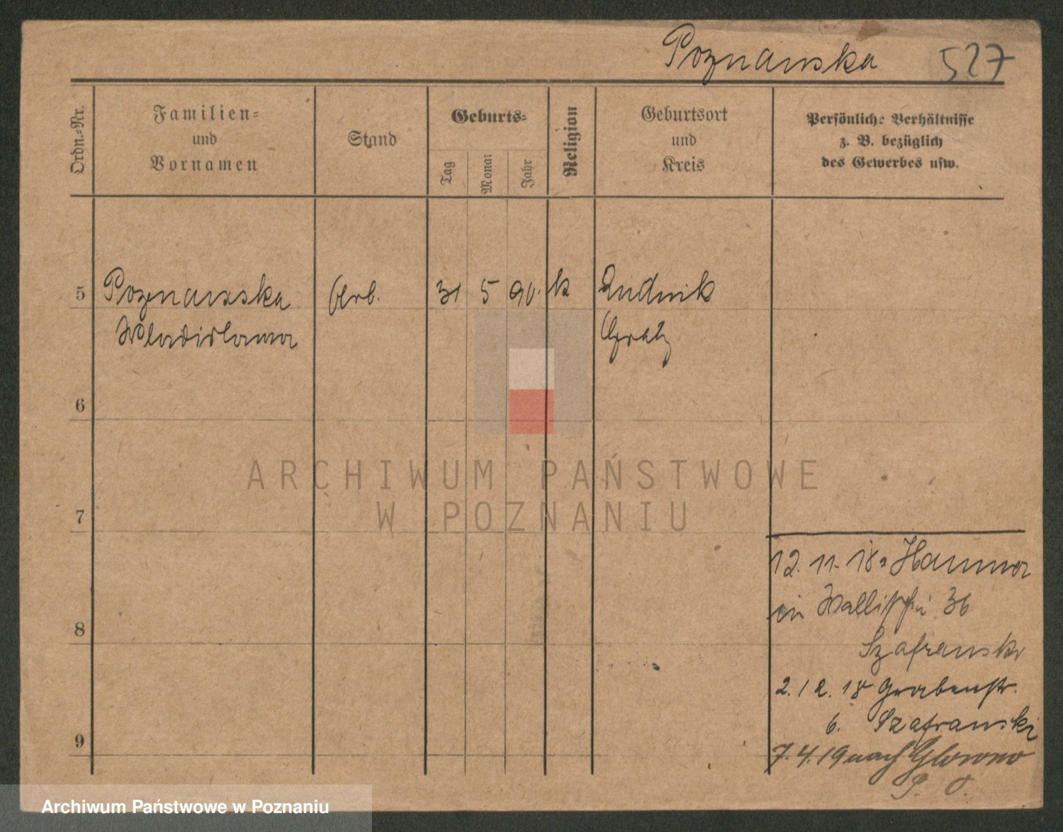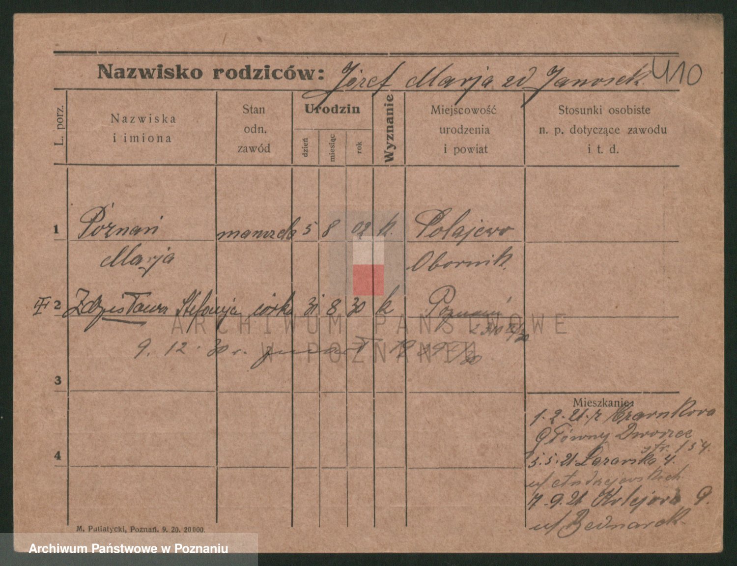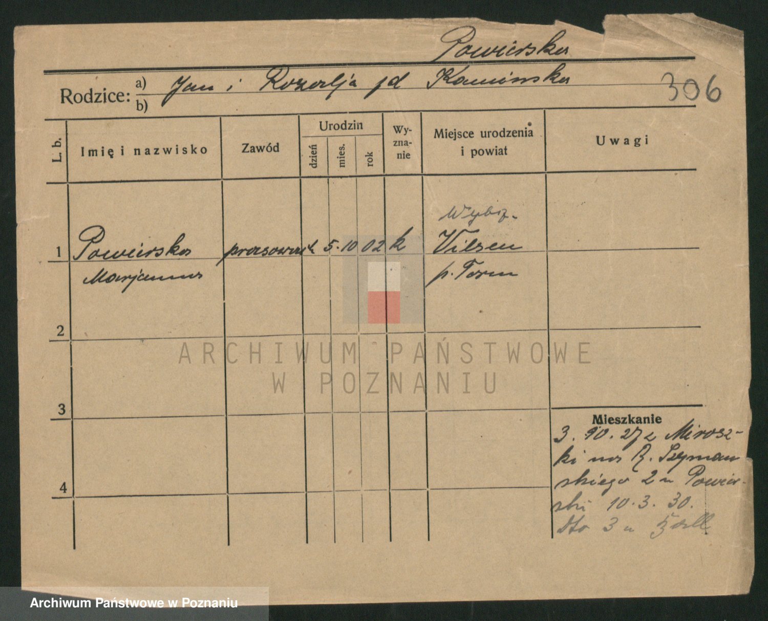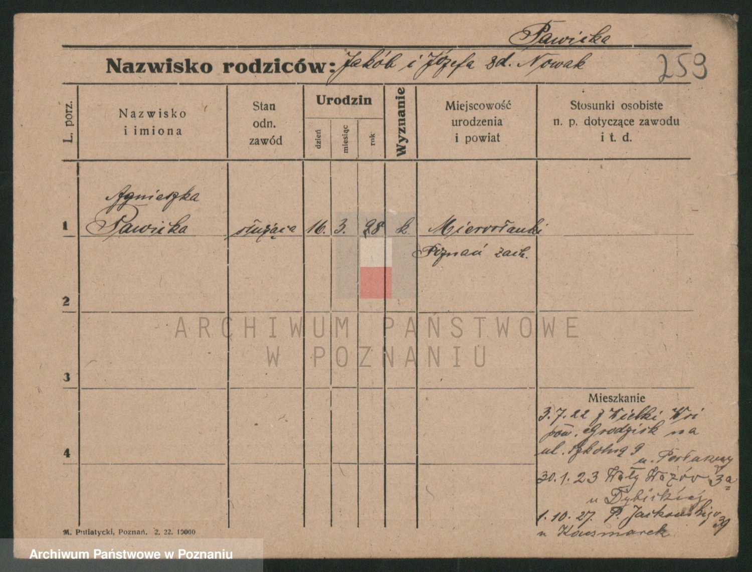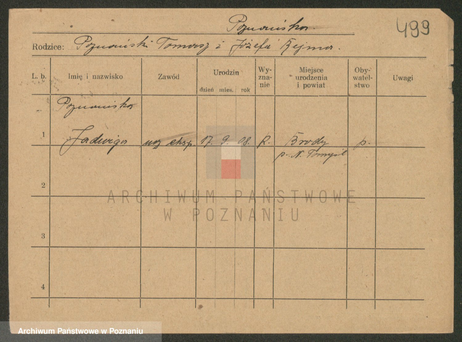Podgląd karty osobowej dostępny jest po kliknięciu na nazwisko lub ikonkę karty. Można dokonywać powiększenia (ikony na górze) lub przechodzić między kolejnymi skanami (strzałki po bokach).
