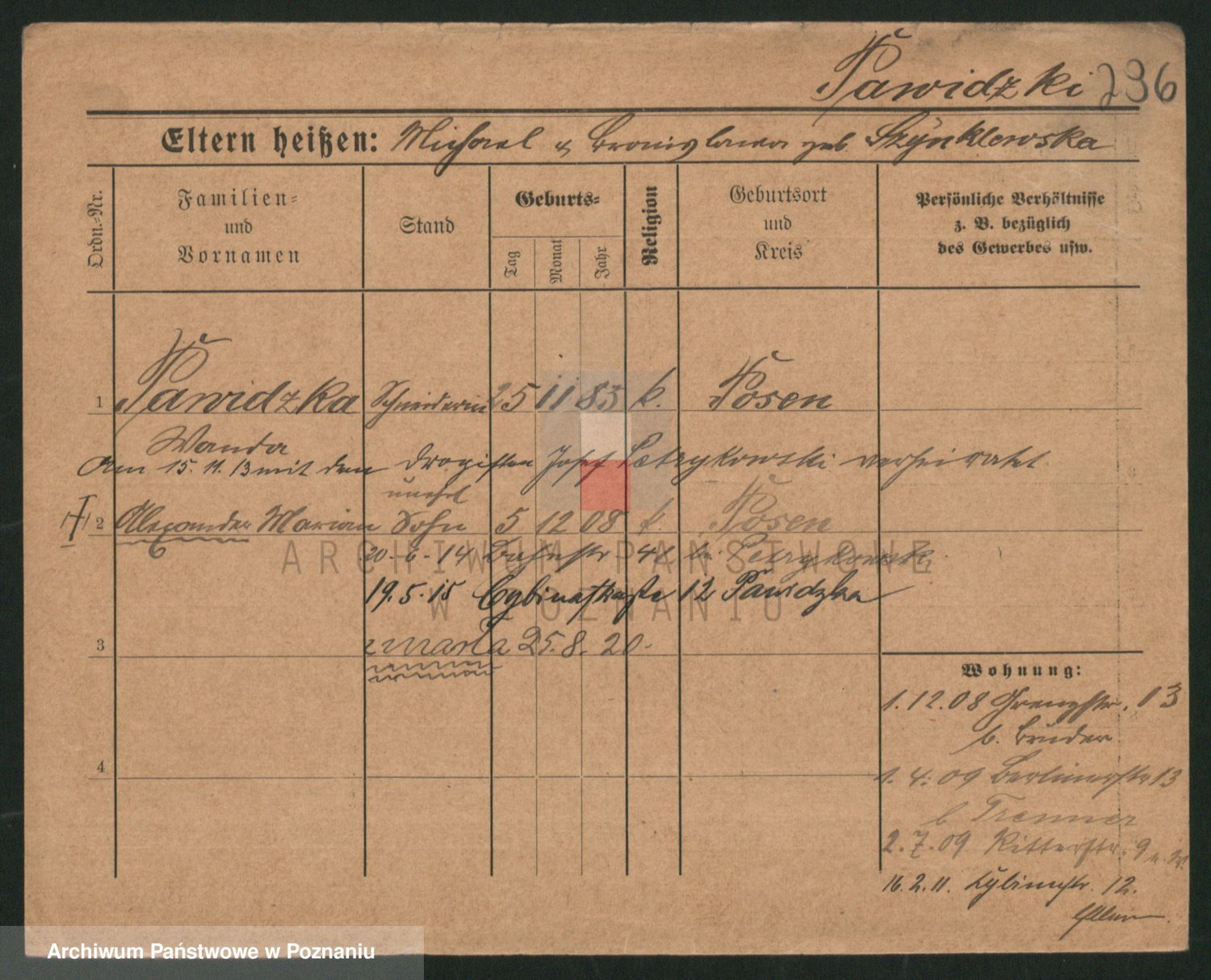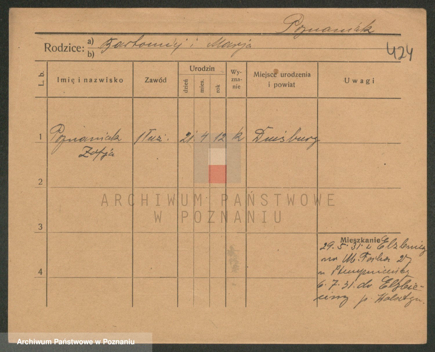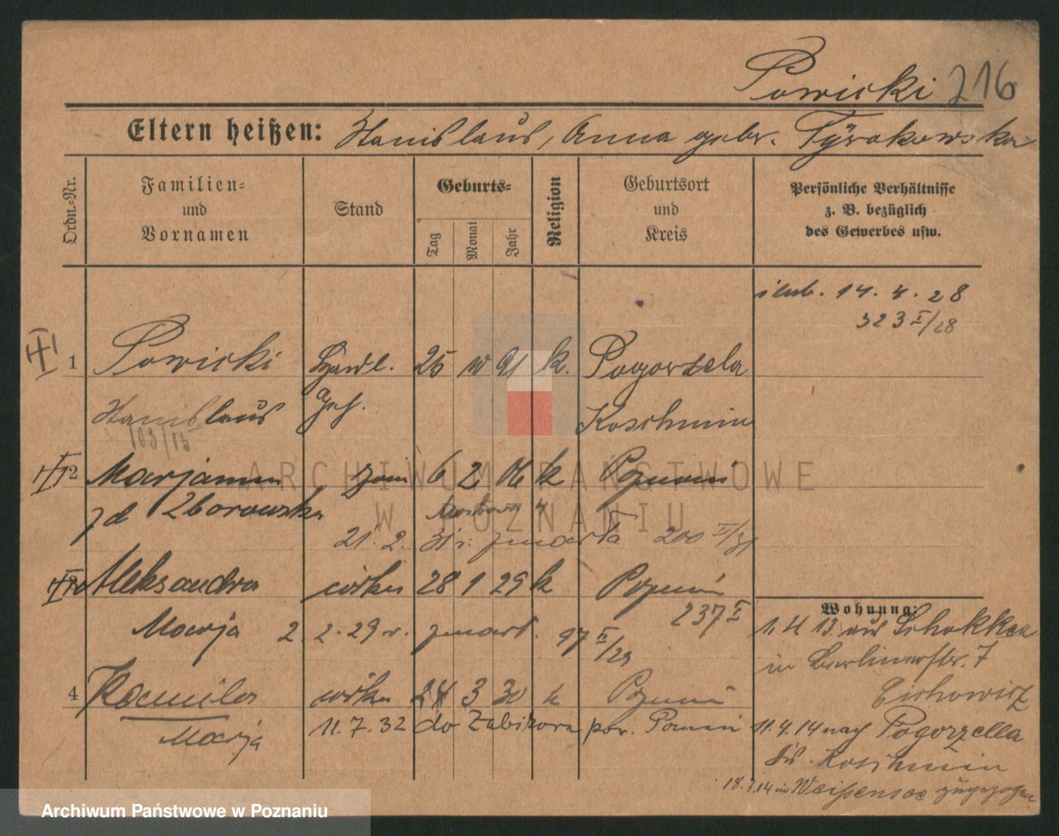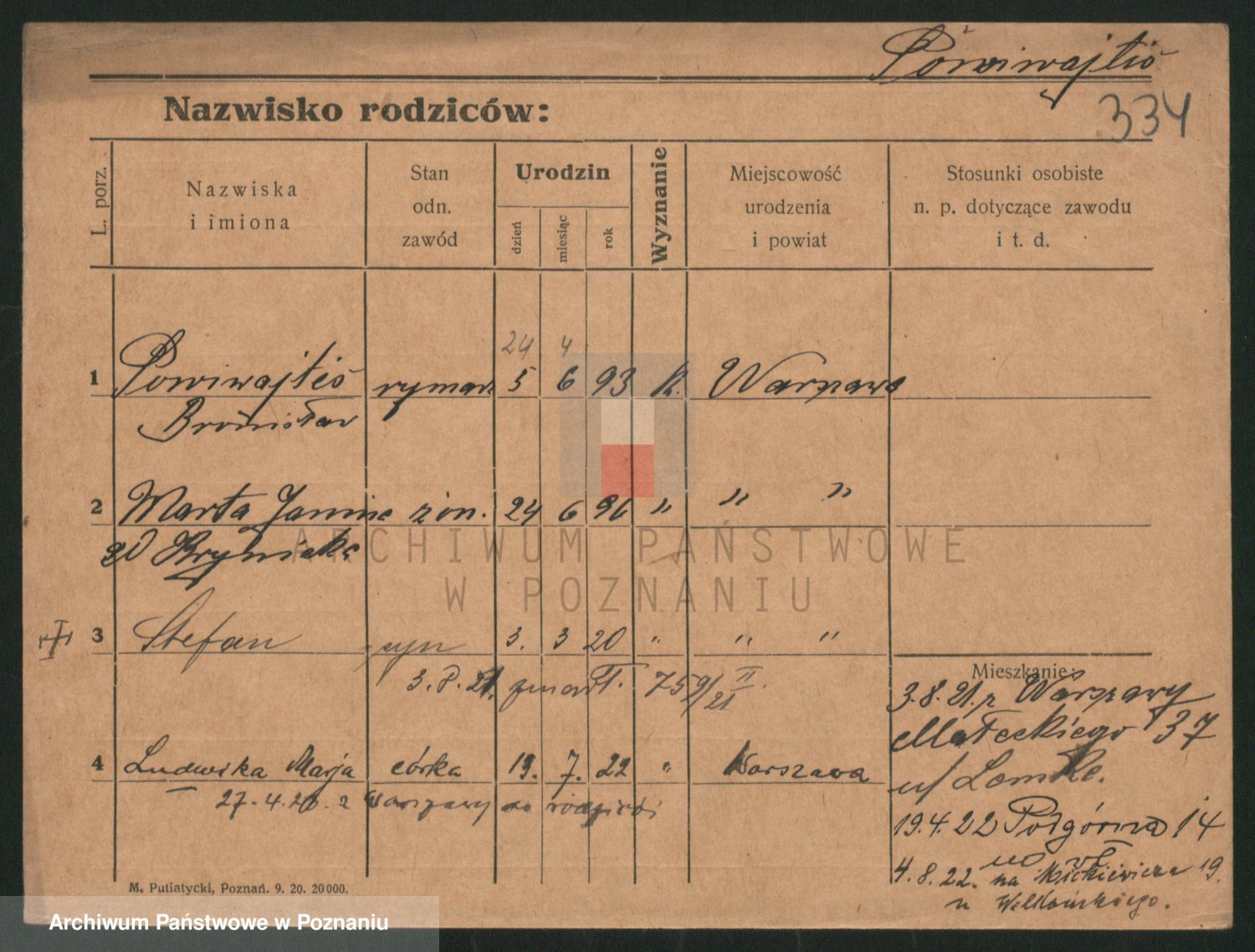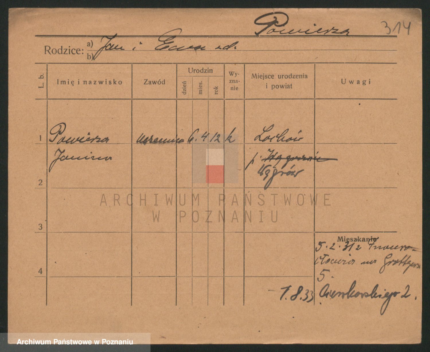 Podgląd karty osobowej dostępny jest po kliknięciu na nazwisko lub ikonkę karty. Można dokonywać powiększenia (ikony na górze) lub przechodzić między kolejnymi skanami (strzałki po bokach).
