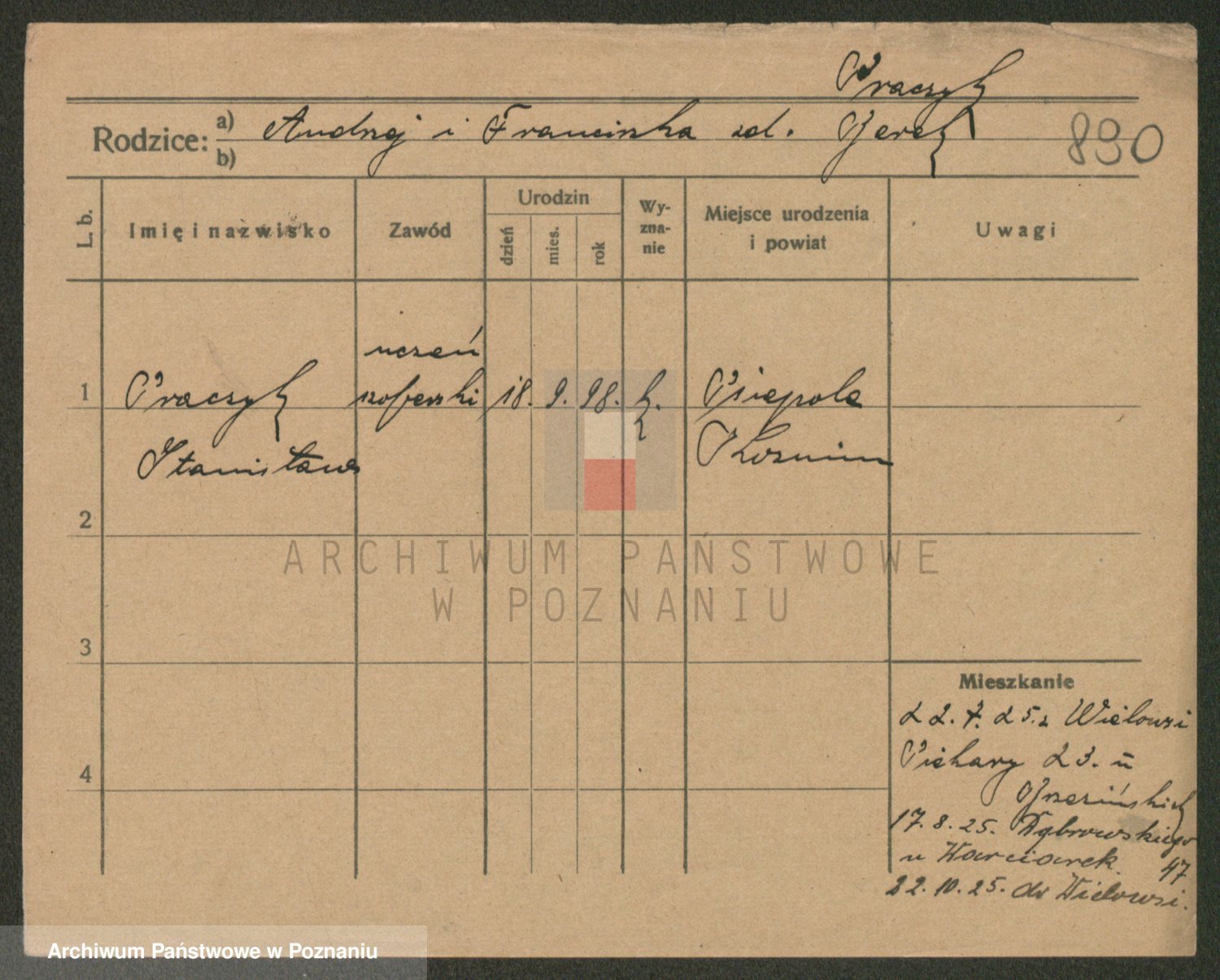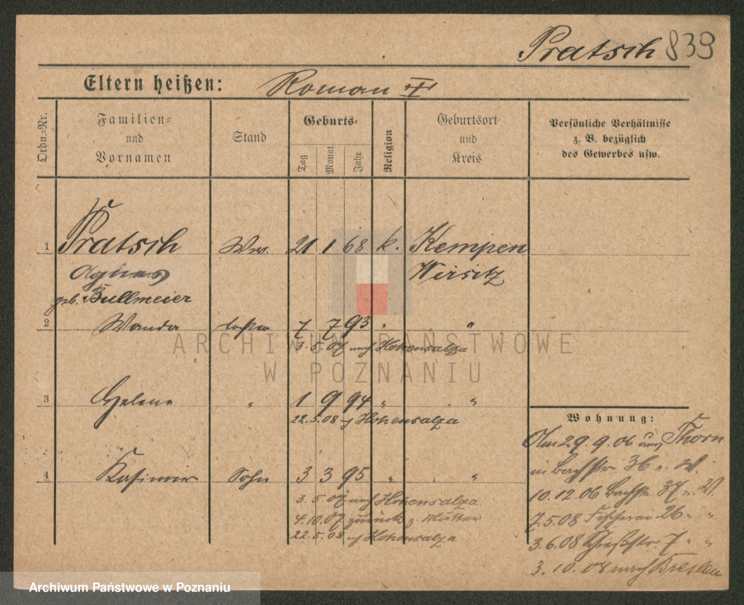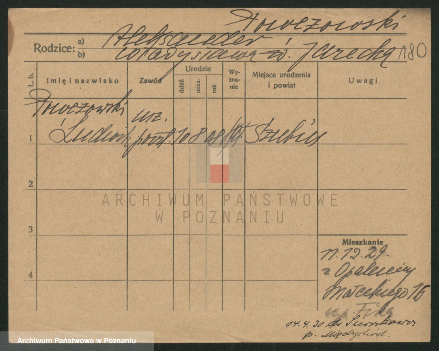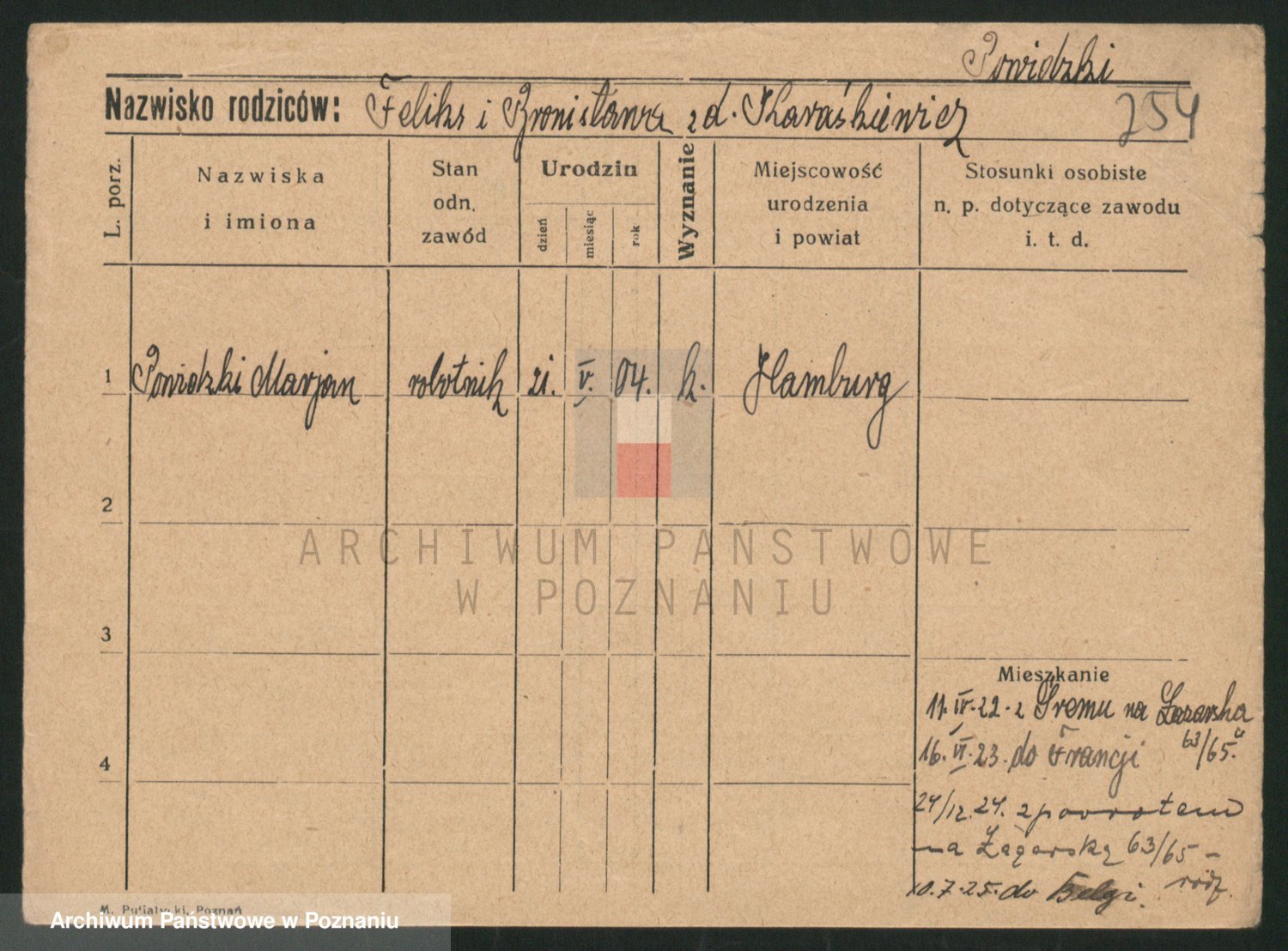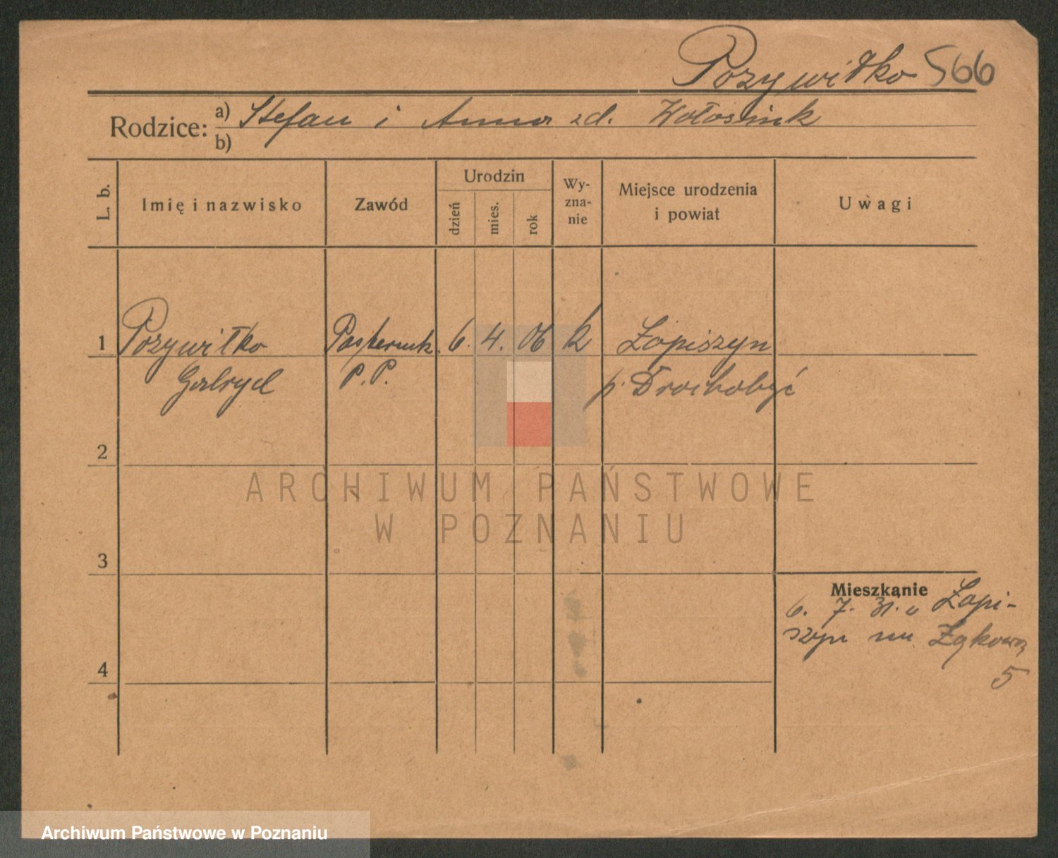 Podgląd karty osobowej dostępny jest po kliknięciu na nazwisko lub ikonkę karty. Można dokonywać powiększenia (ikony na górze) lub przechodzić między kolejnymi skanami (strzałki po bokach).