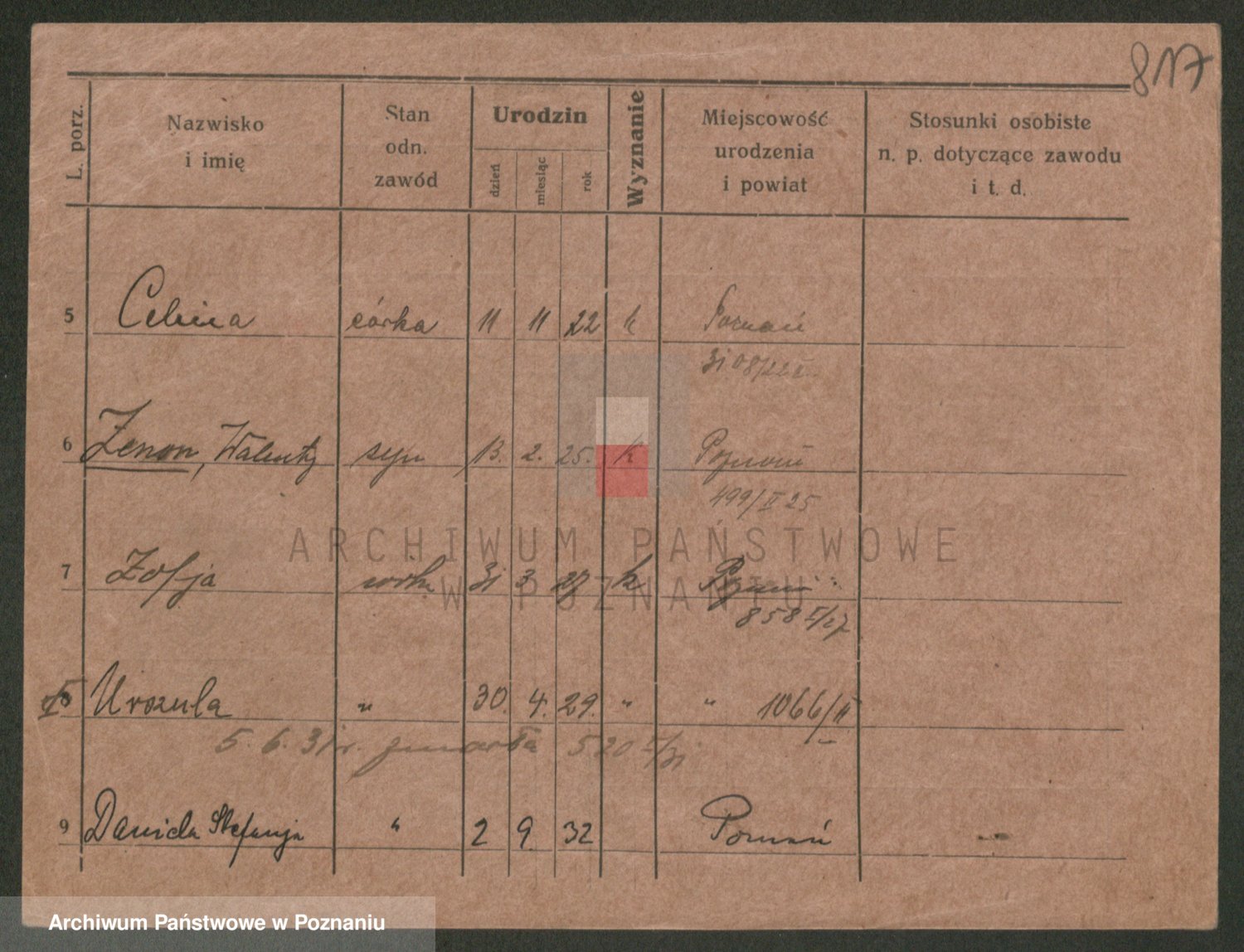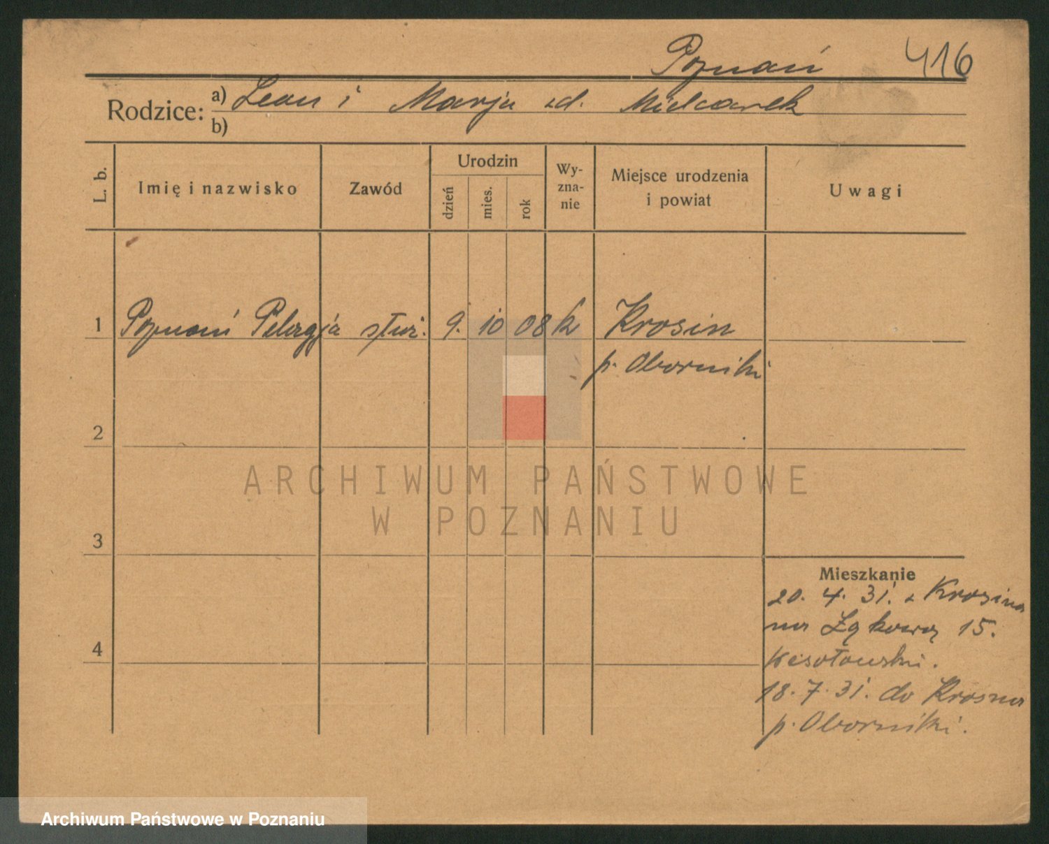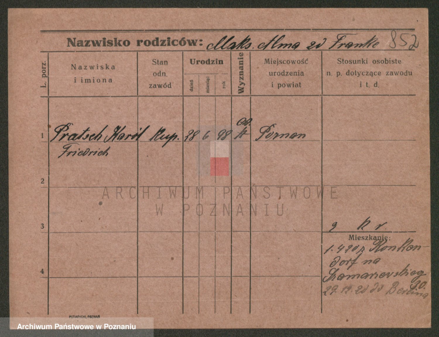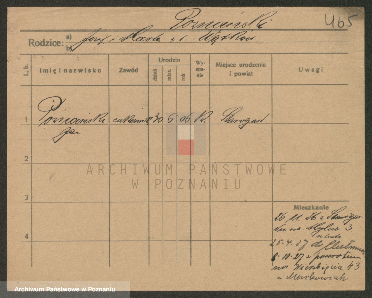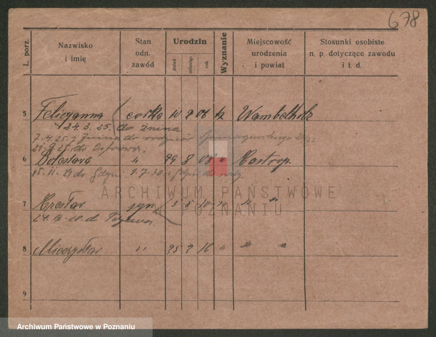 Podgląd karty osobowej dostępny jest po kliknięciu na nazwisko lub ikonkę karty. Można dokonywać powiększenia (ikony na górze) lub przechodzić między kolejnymi skanami (strzałki po bokach).