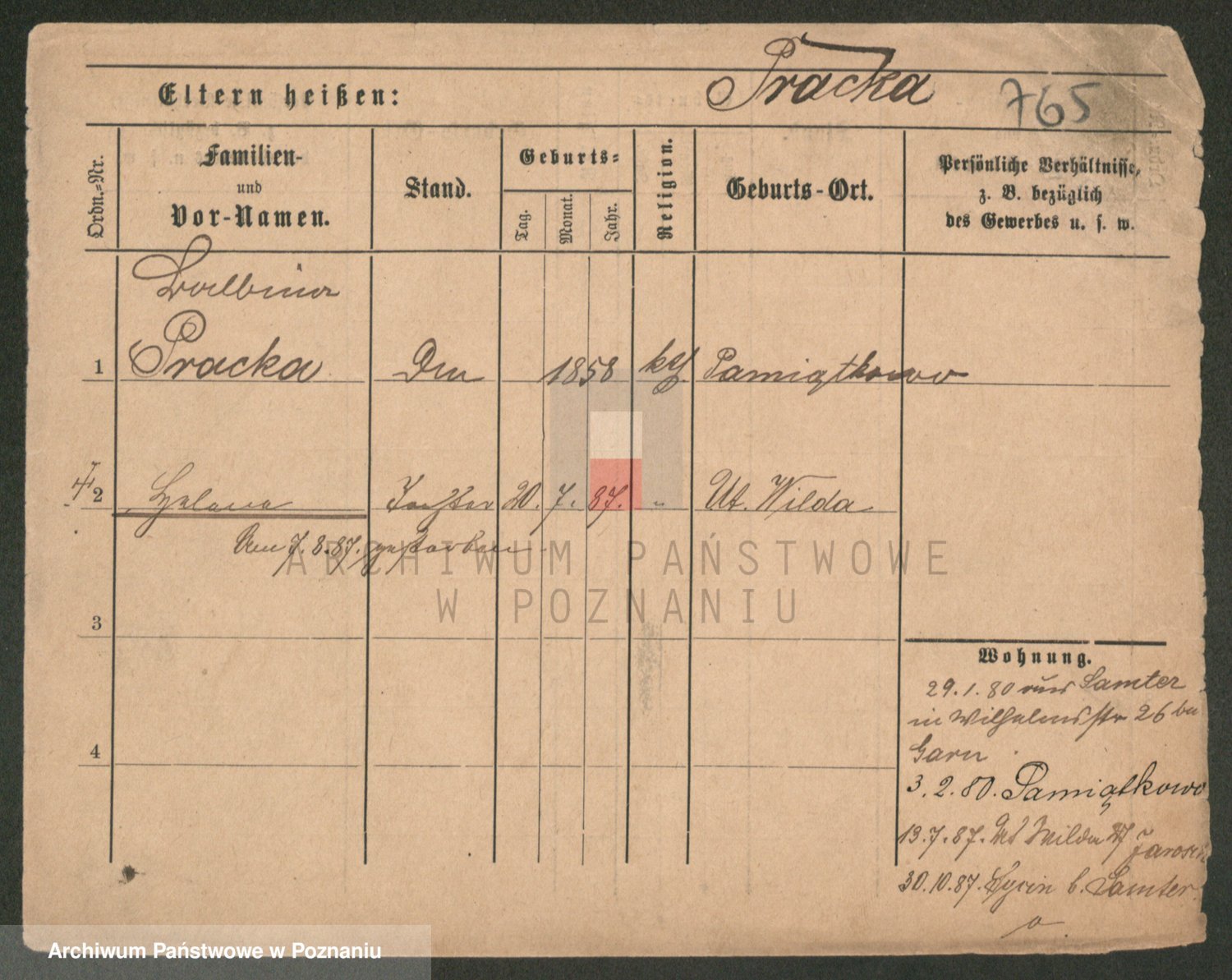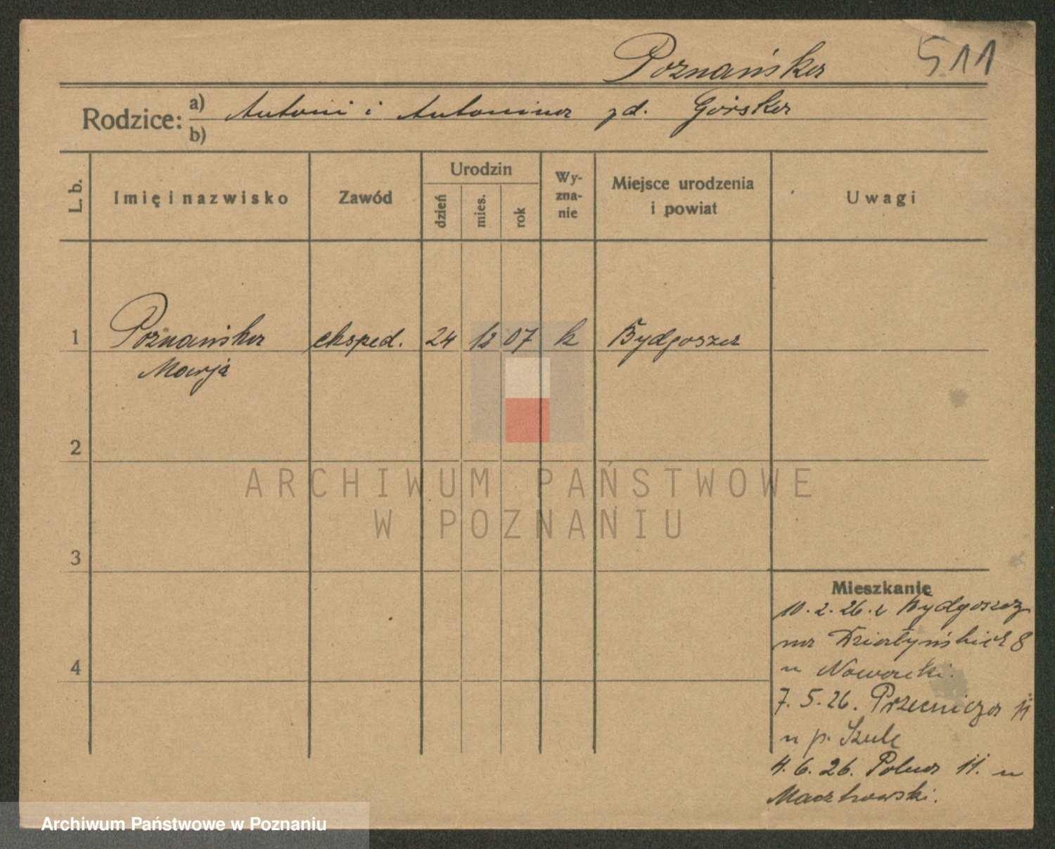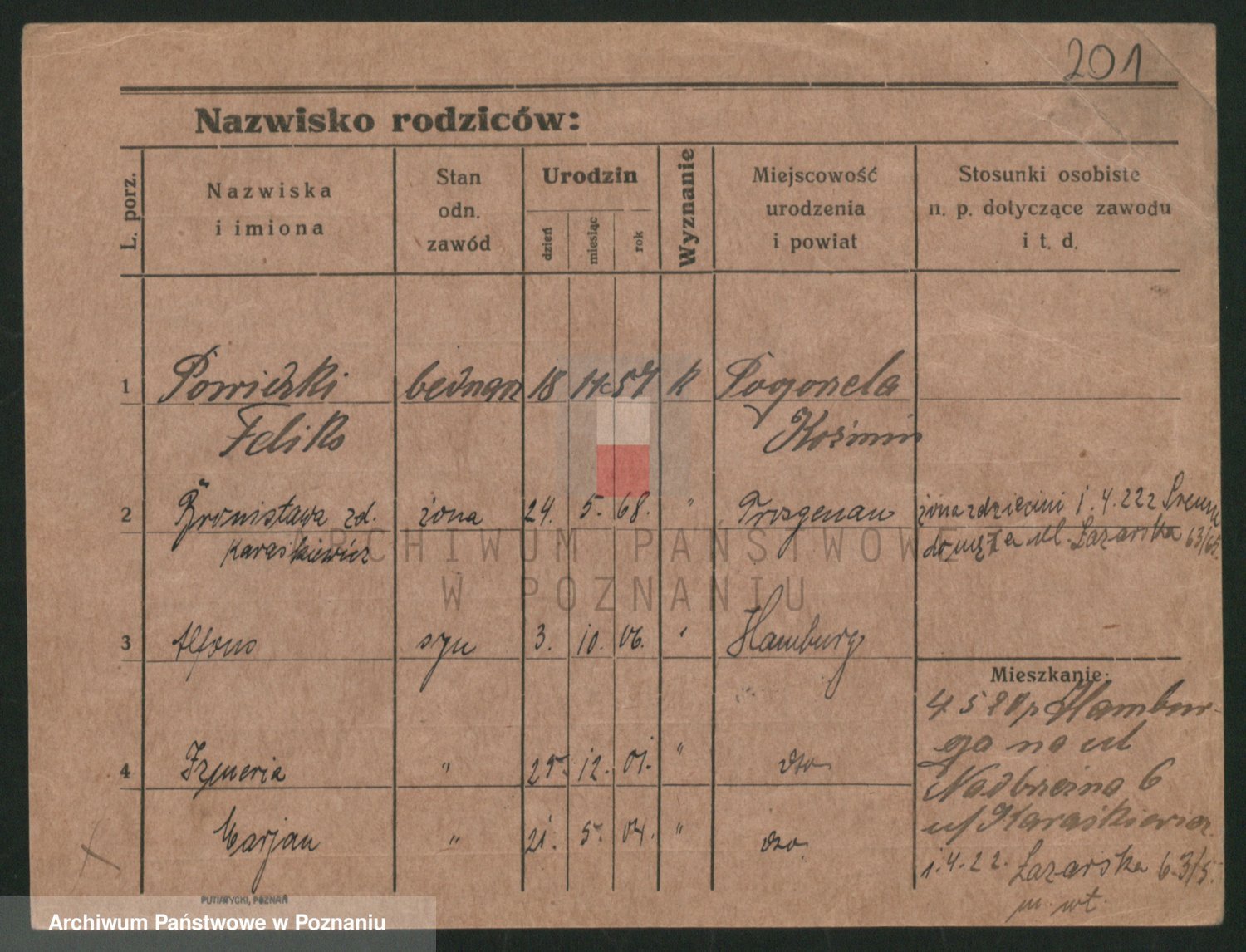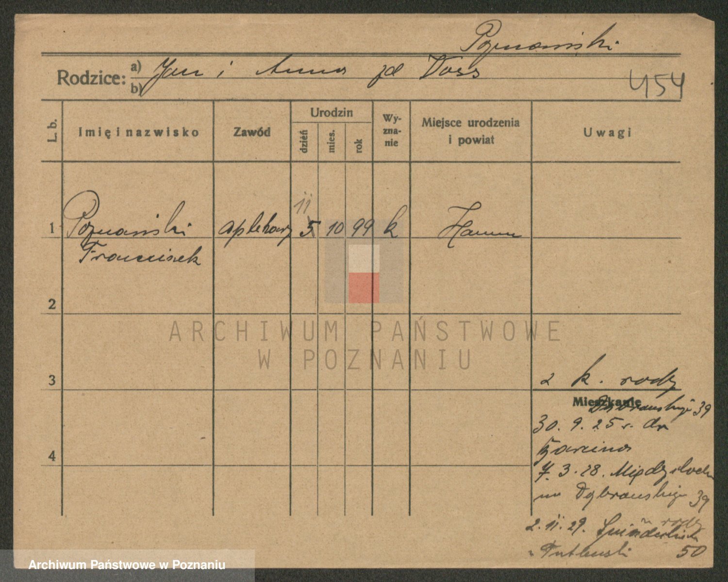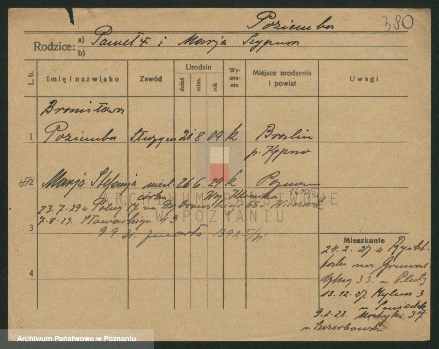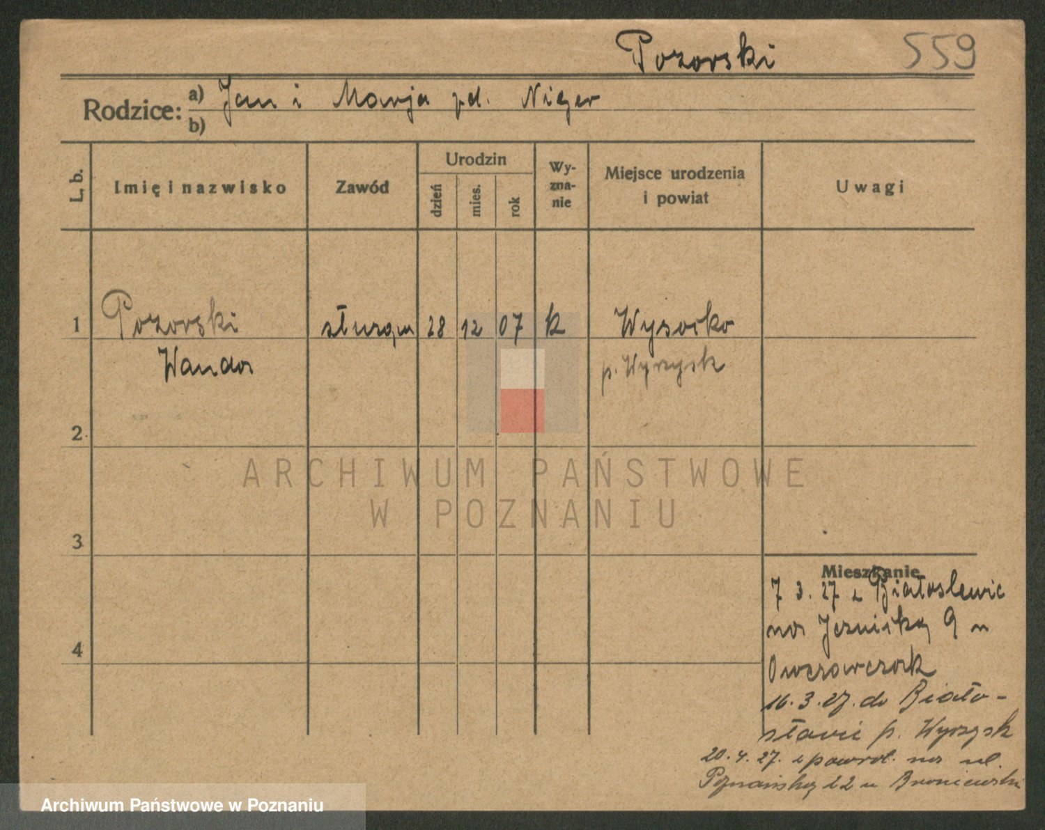 Podgląd karty osobowej dostępny jest po kliknięciu na nazwisko lub ikonkę karty. Można dokonywać powiększenia (ikony na górze) lub przechodzić między kolejnymi skanami (strzałki po bokach).