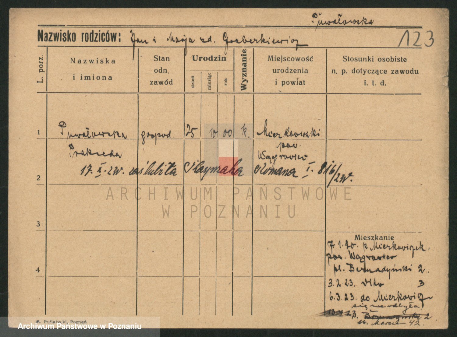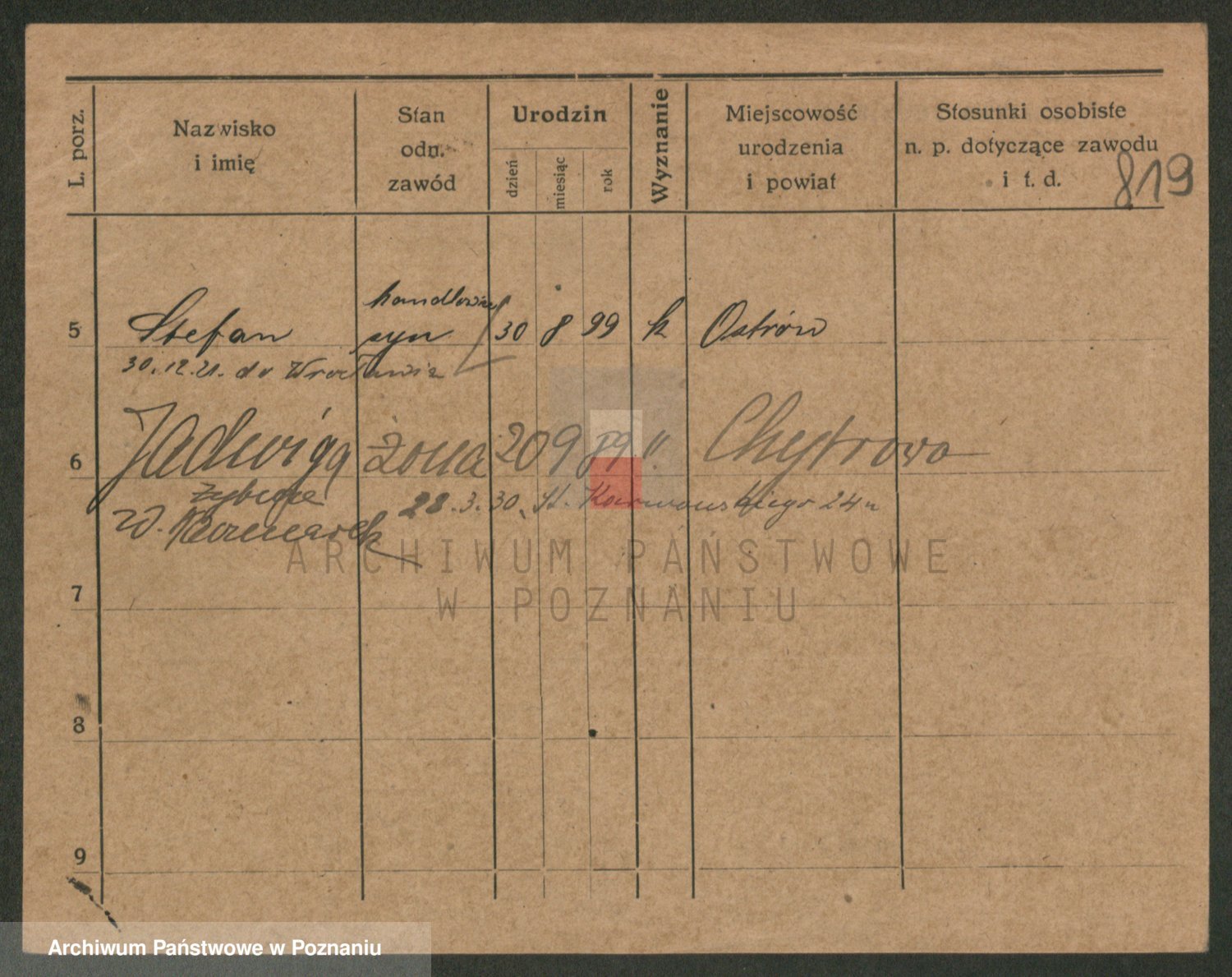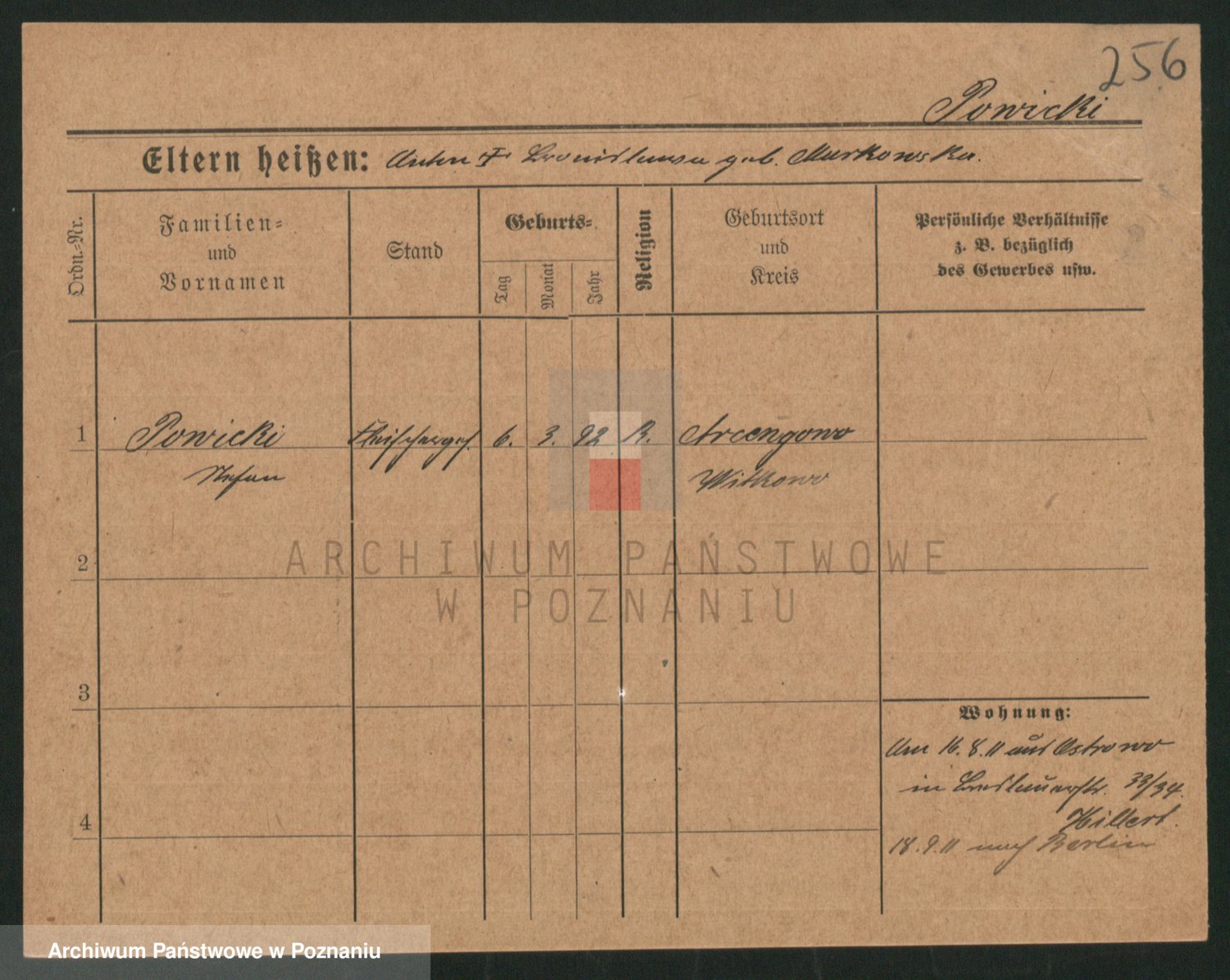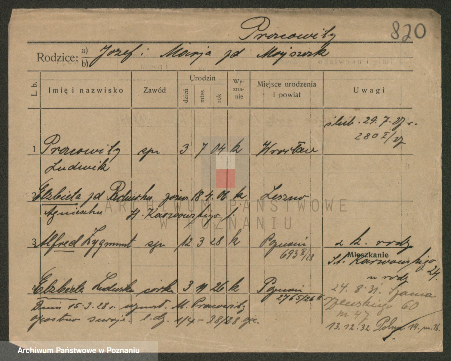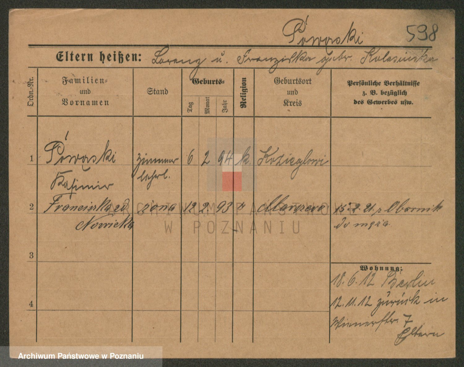 Podgląd karty osobowej dostępny jest po kliknięciu na nazwisko lub ikonkę karty. Można dokonywać powiększenia (ikony na górze) lub przechodzić między kolejnymi skanami (strzałki po bokach).