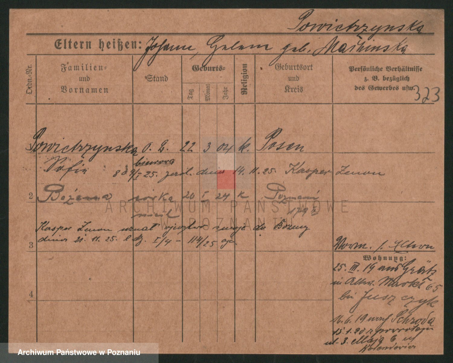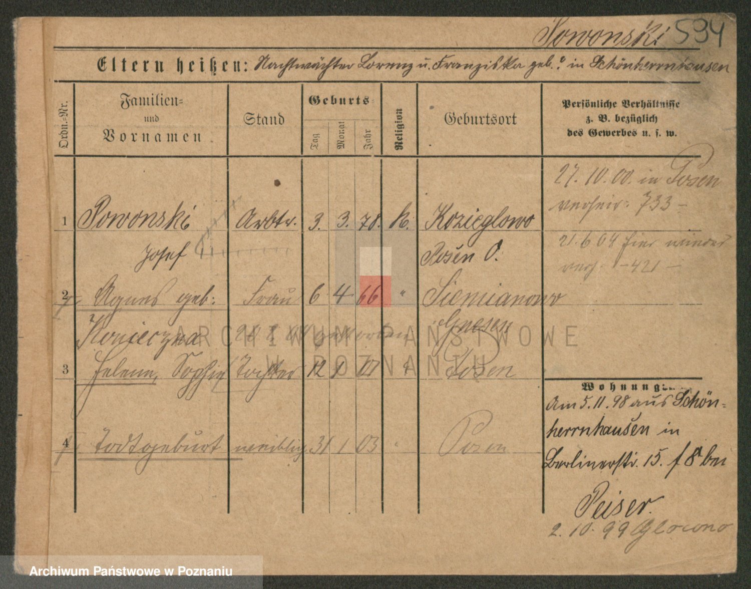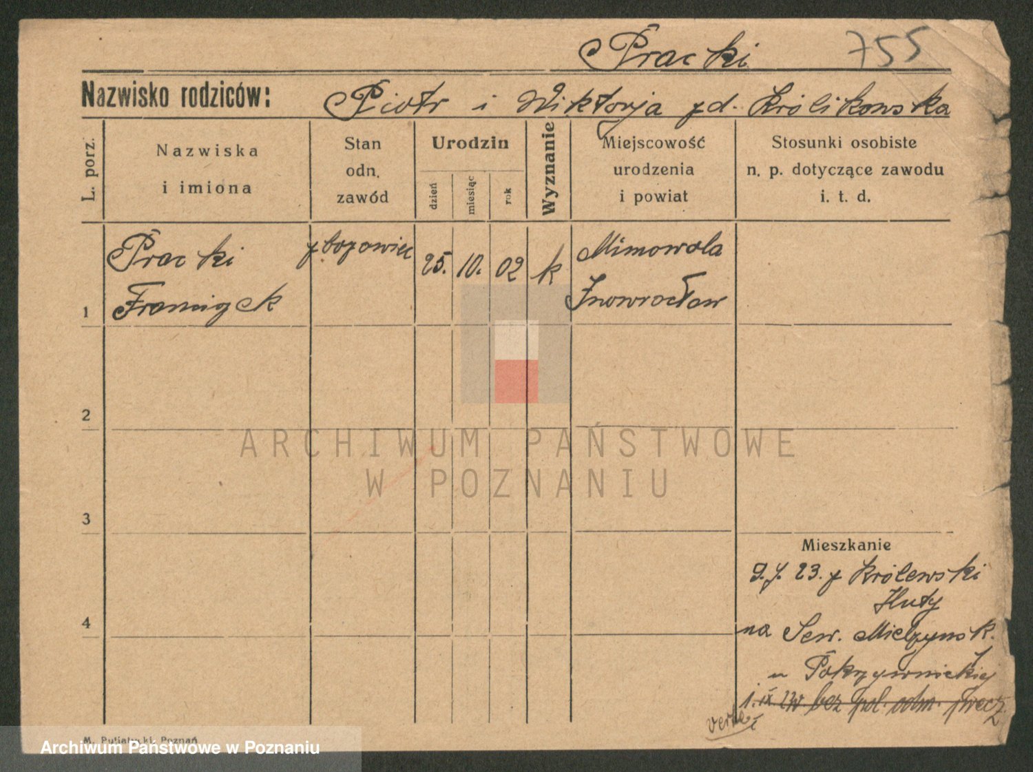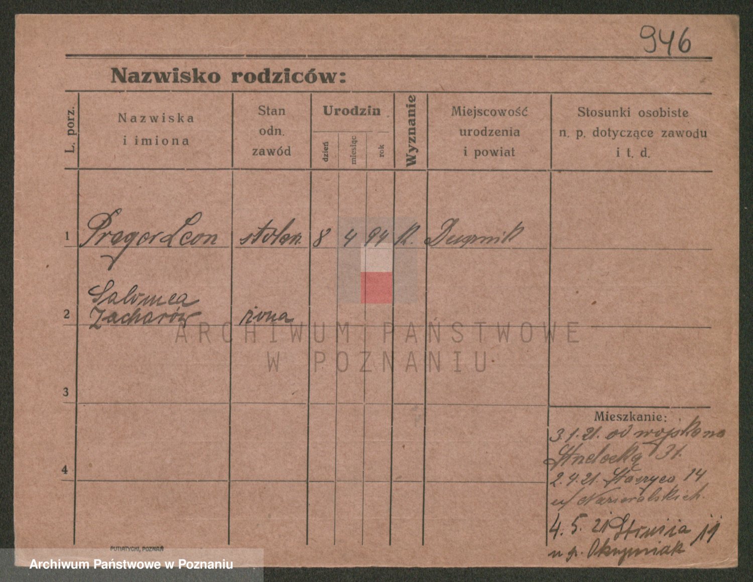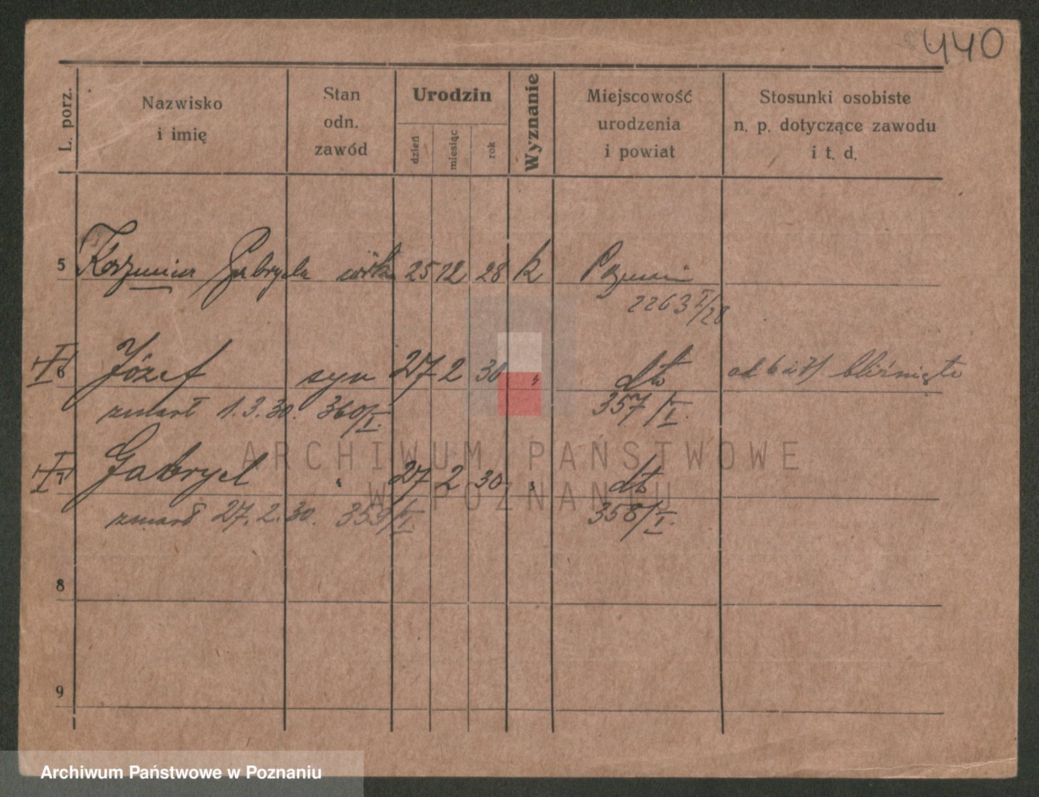 Podgląd karty osobowej dostępny jest po kliknięciu na nazwisko lub ikonkę karty. Można dokonywać powiększenia (ikony na górze) lub przechodzić między kolejnymi skanami (strzałki po bokach).