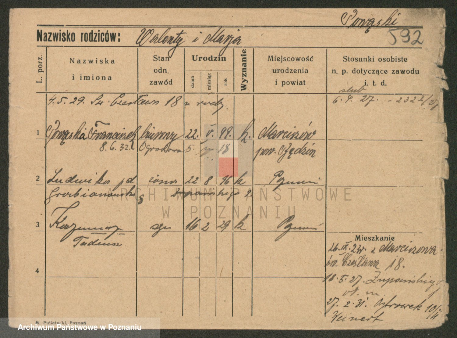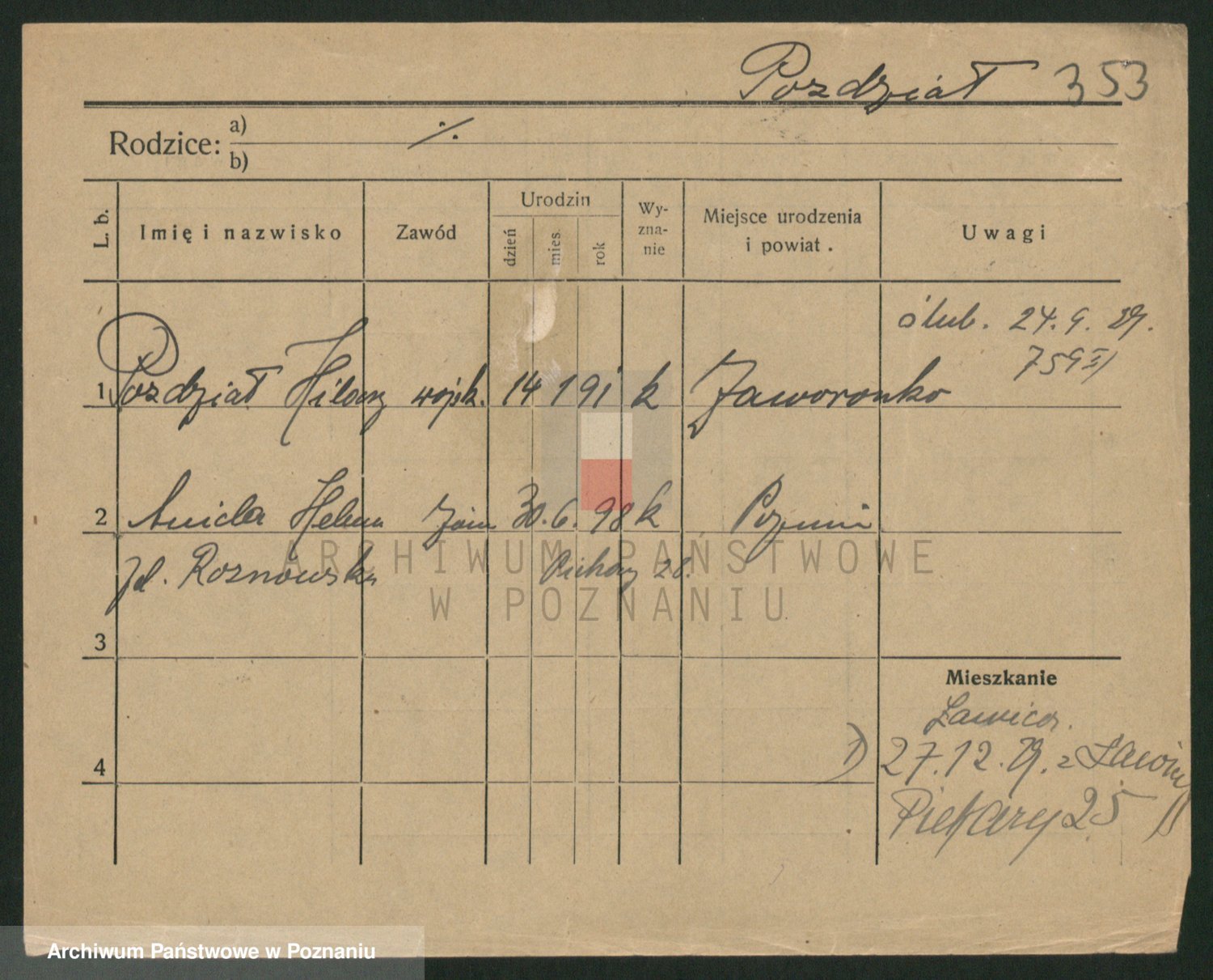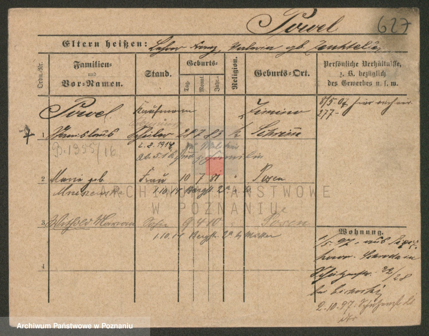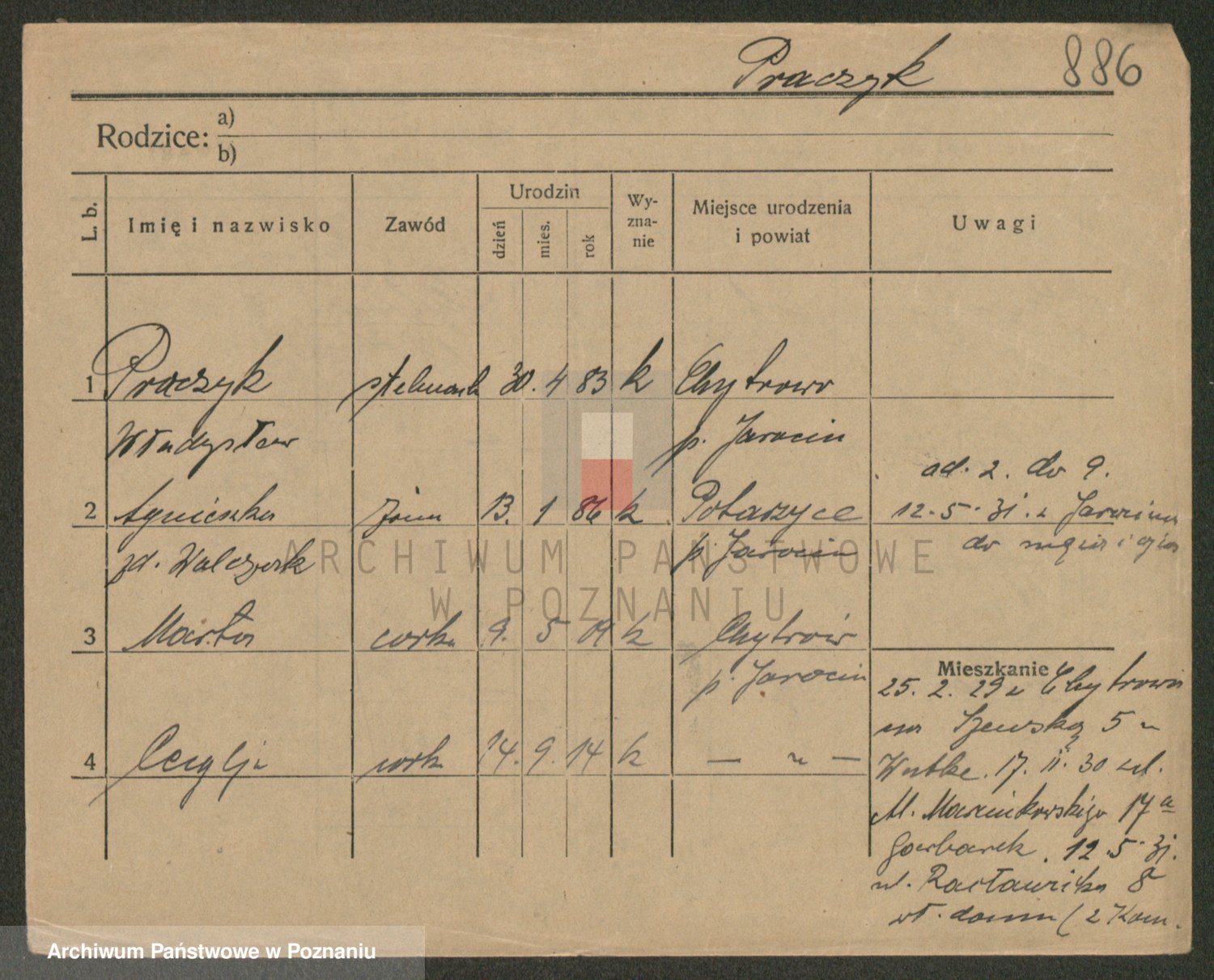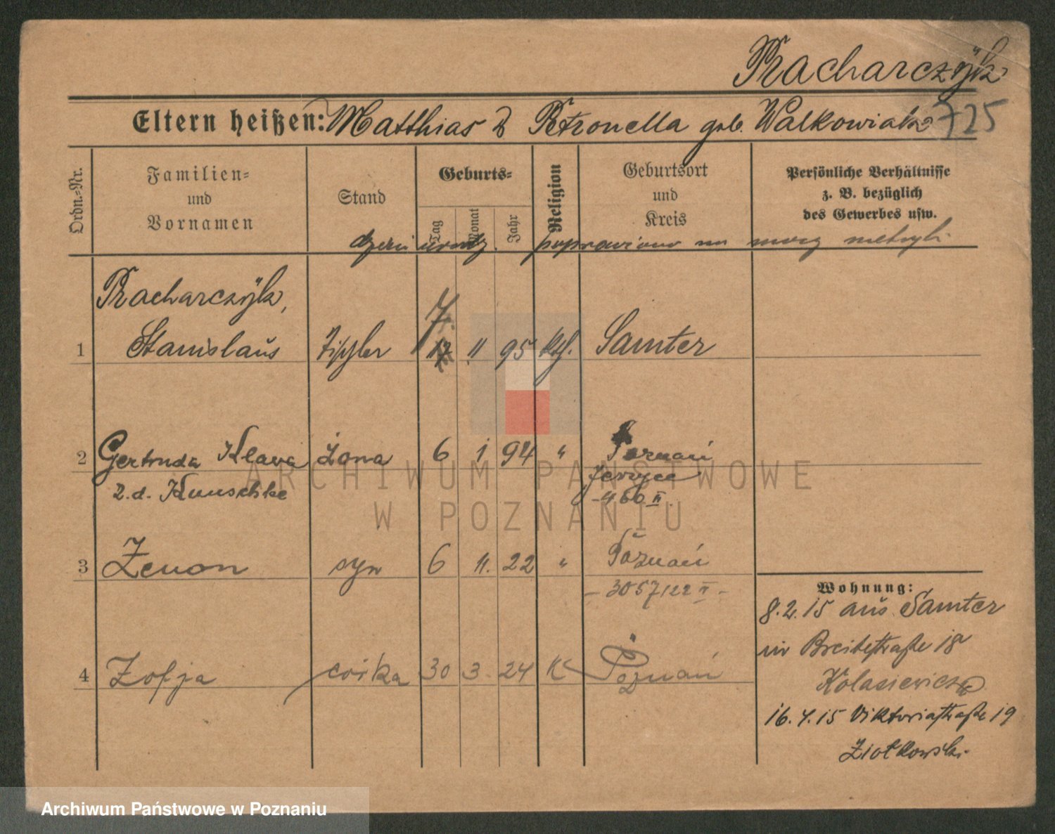 Podgląd karty osobowej dostępny jest po kliknięciu na nazwisko lub ikonkę karty. Można dokonywać powiększenia (ikony na górze) lub przechodzić między kolejnymi skanami (strzałki po bokach).