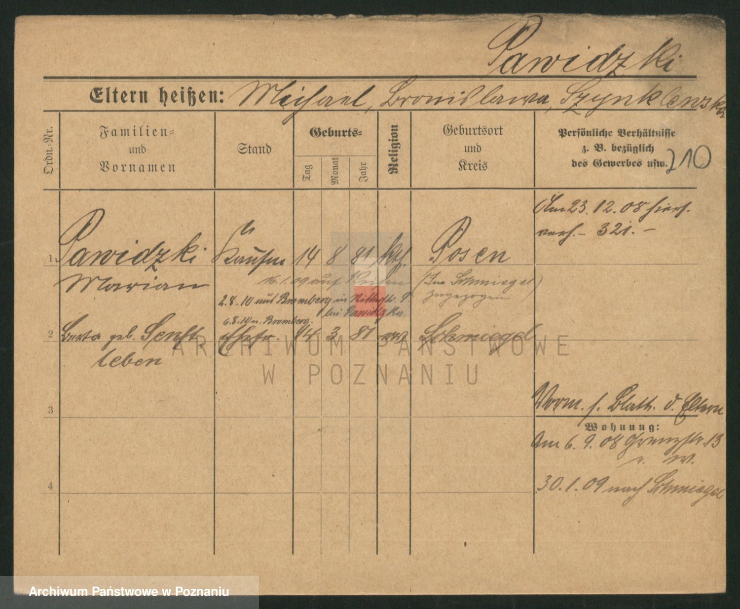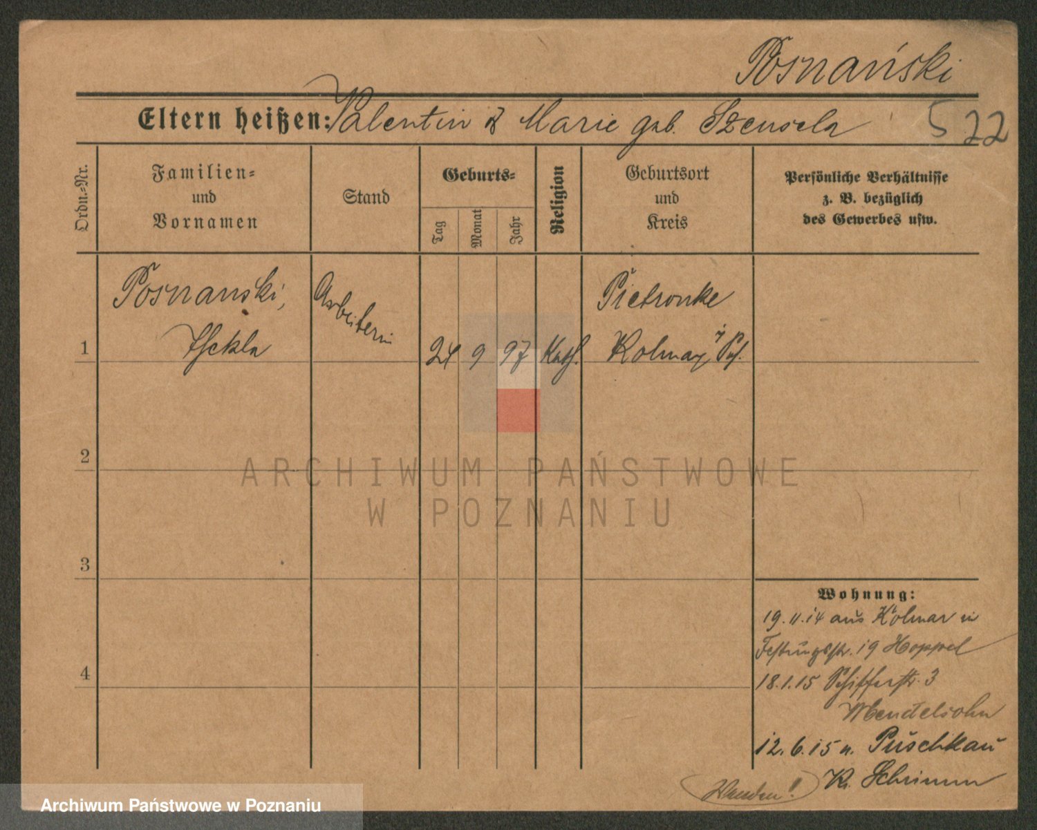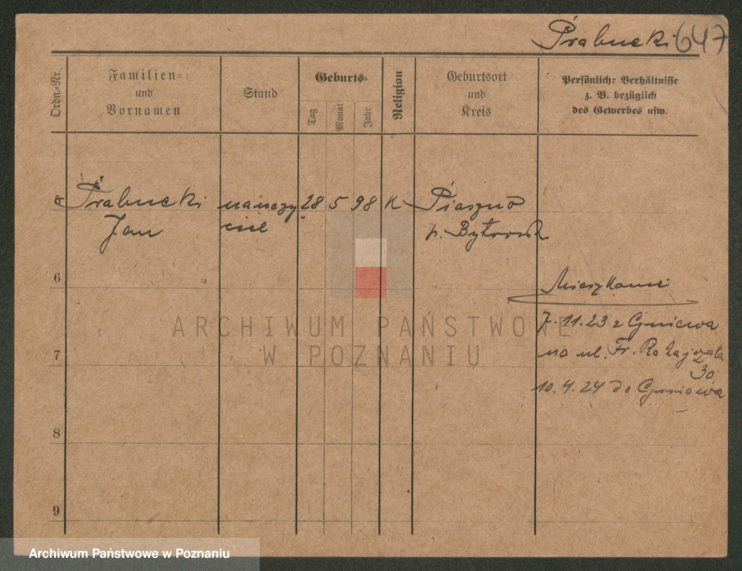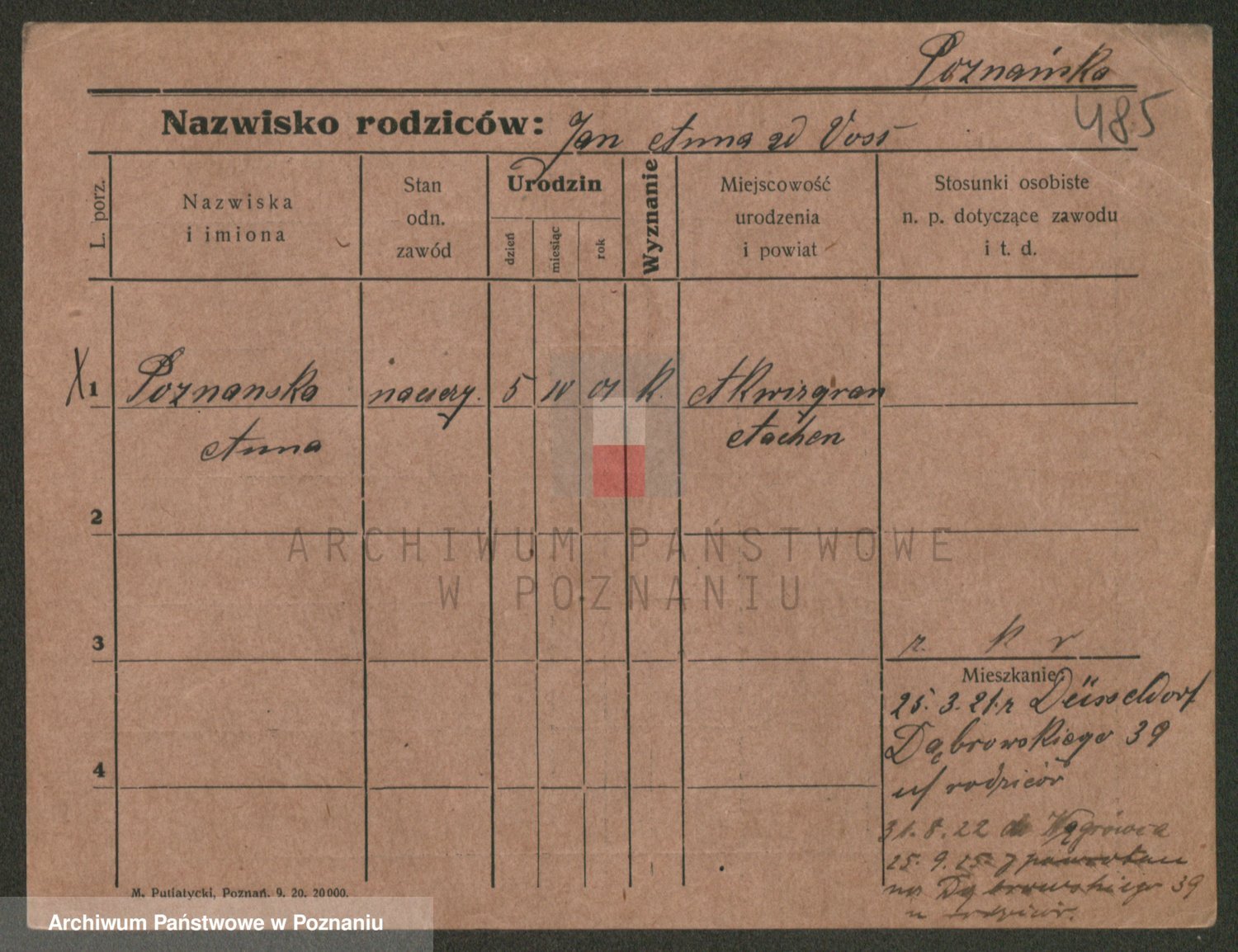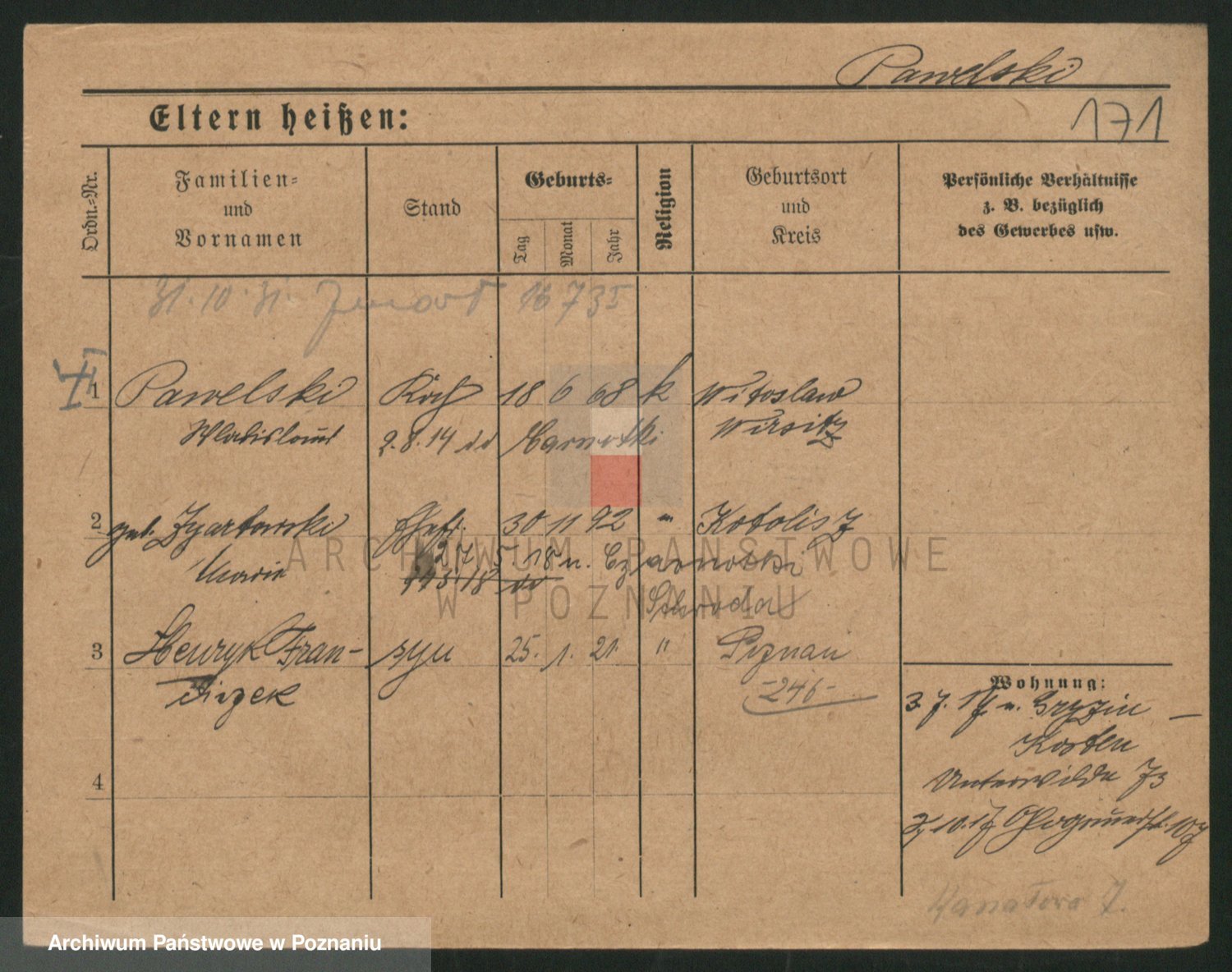 Podgląd karty osobowej dostępny jest po kliknięciu na nazwisko lub ikonkę karty. Można dokonywać powiększenia (ikony na górze) lub przechodzić między kolejnymi skanami (strzałki po bokach).