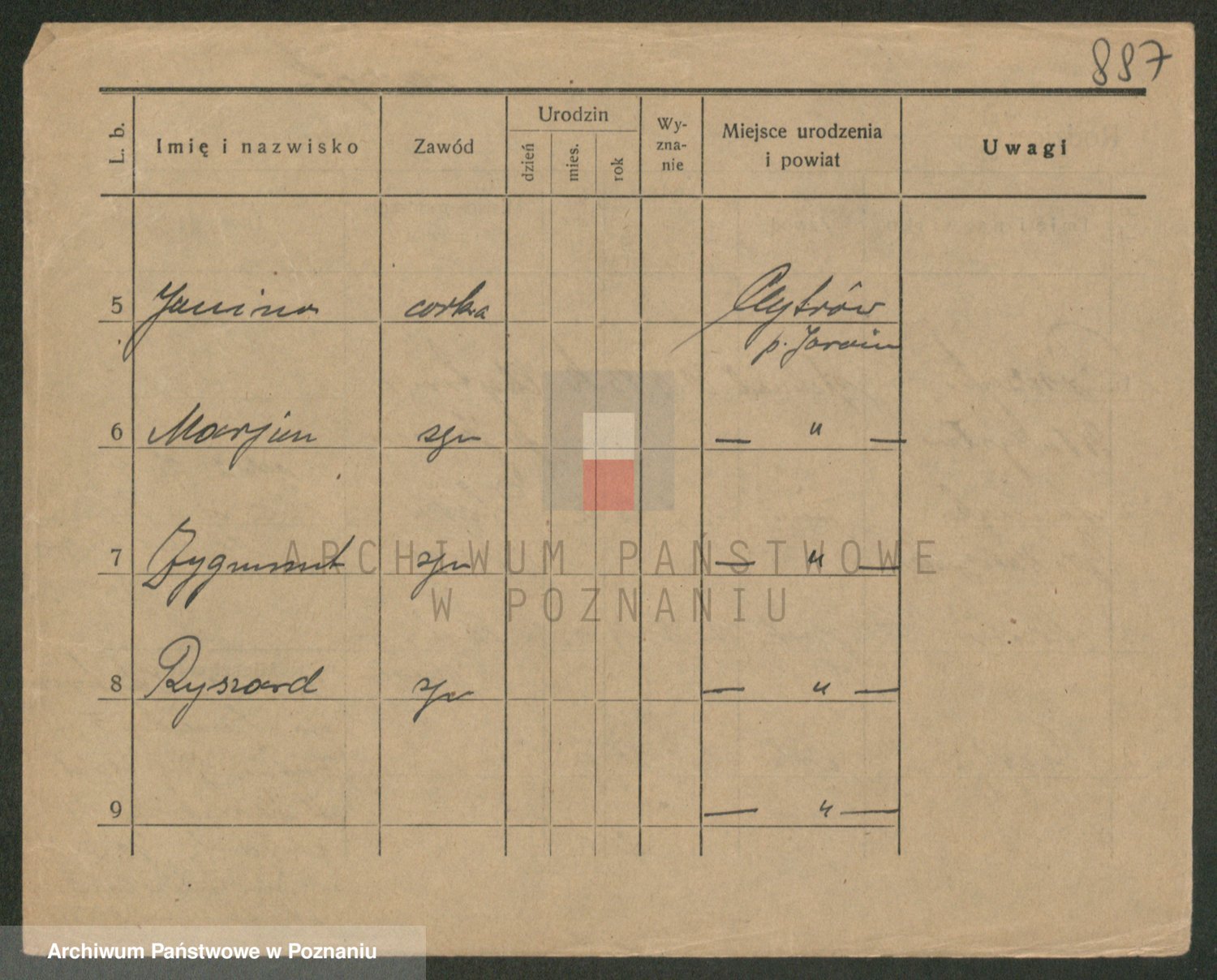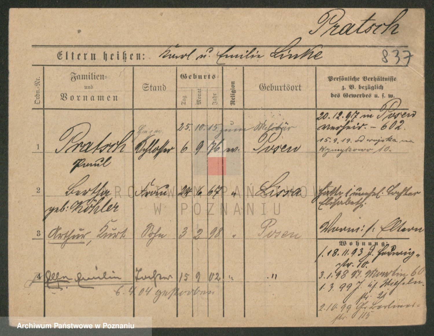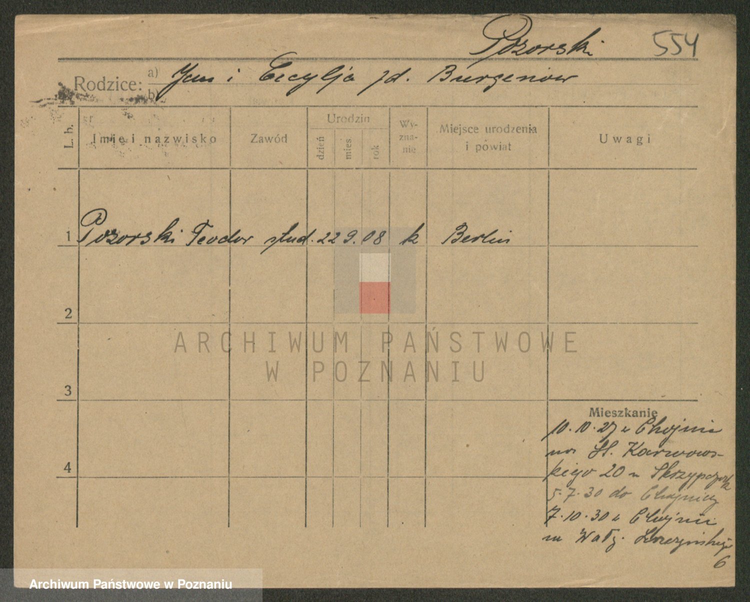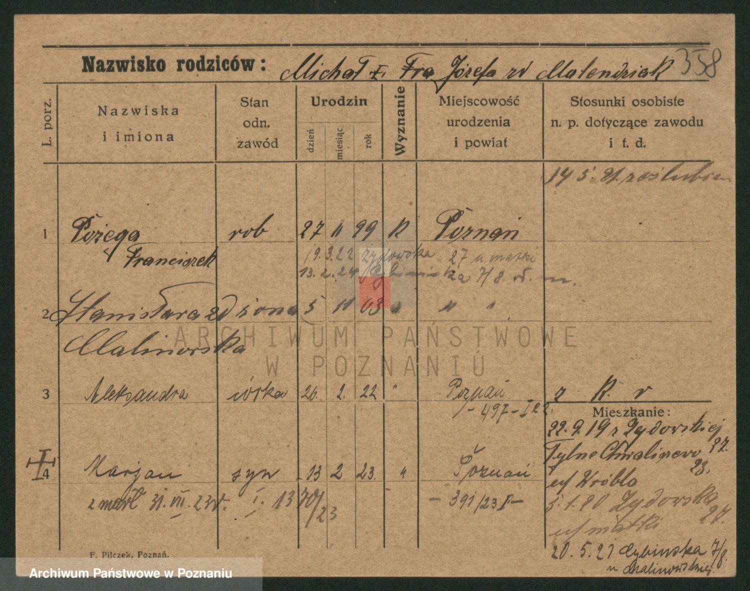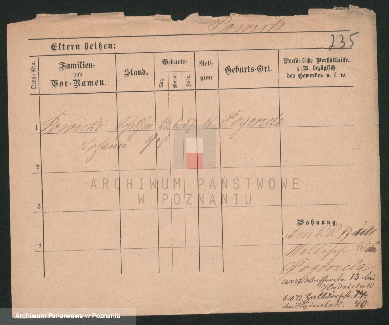 Podgląd karty osobowej dostępny jest po kliknięciu na nazwisko lub ikonkę karty. Można dokonywać powiększenia (ikony na górze) lub przechodzić między kolejnymi skanami (strzałki po bokach).