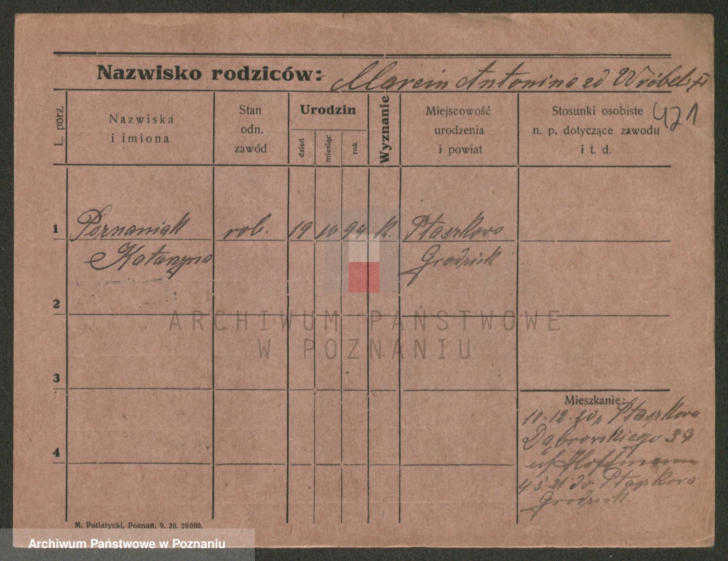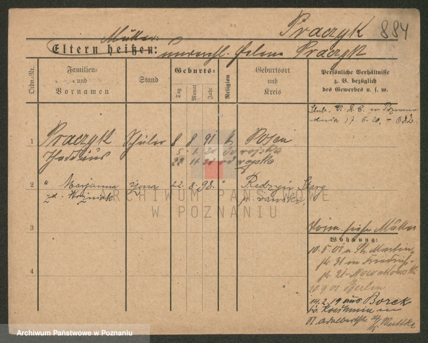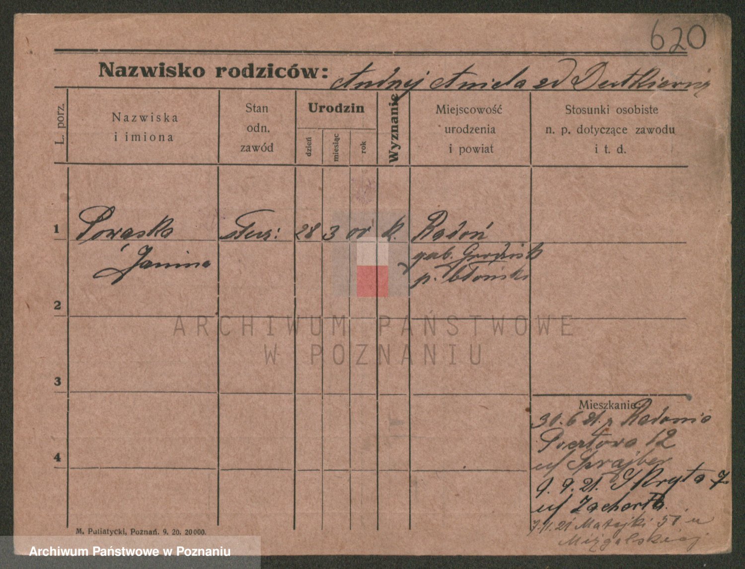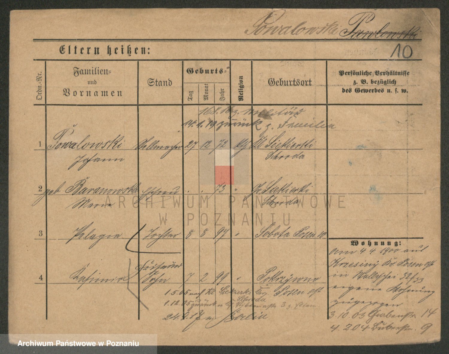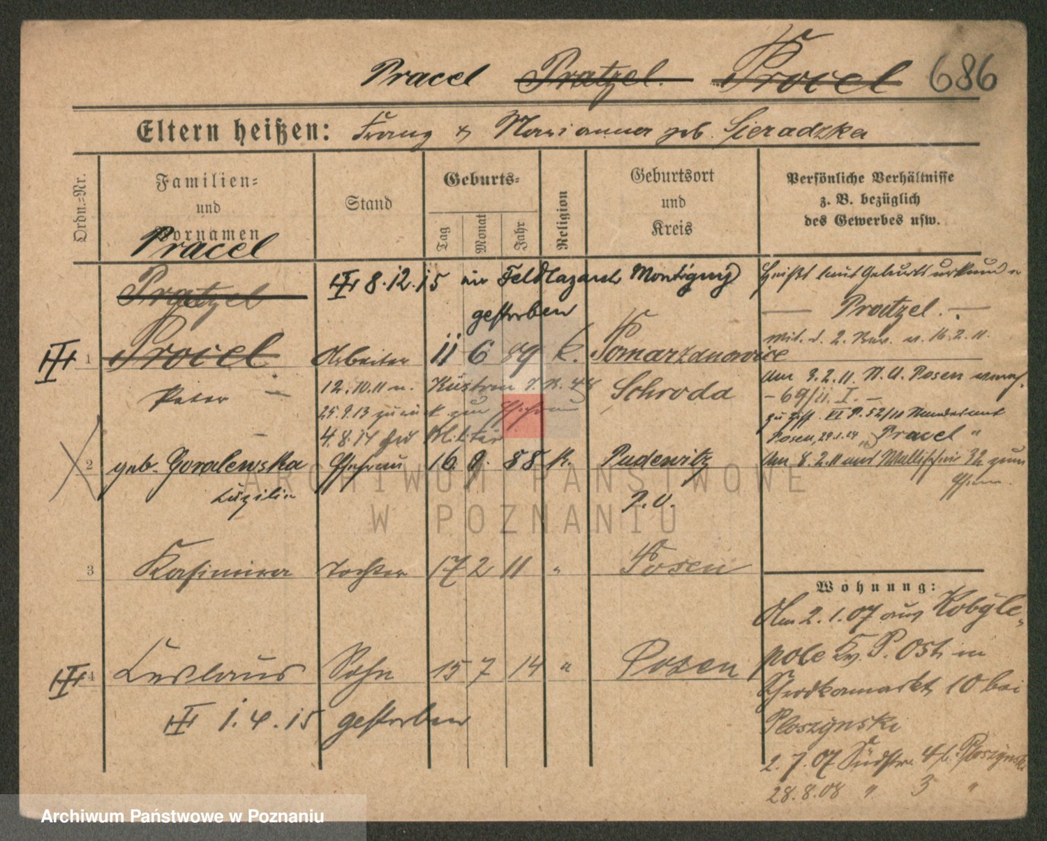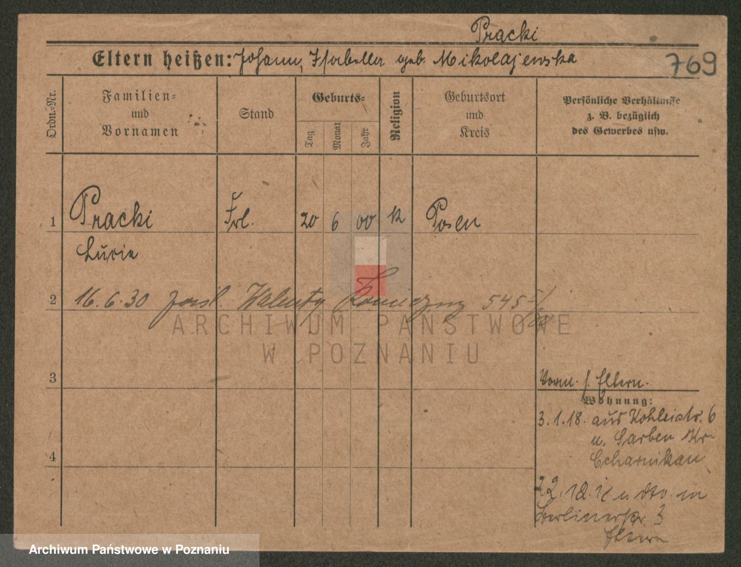 Podgląd karty osobowej dostępny jest po kliknięciu na nazwisko lub ikonkę karty. Można dokonywać powiększenia (ikony na górze) lub przechodzić między kolejnymi skanami (strzałki po bokach).