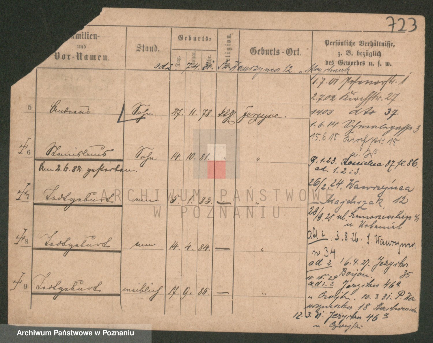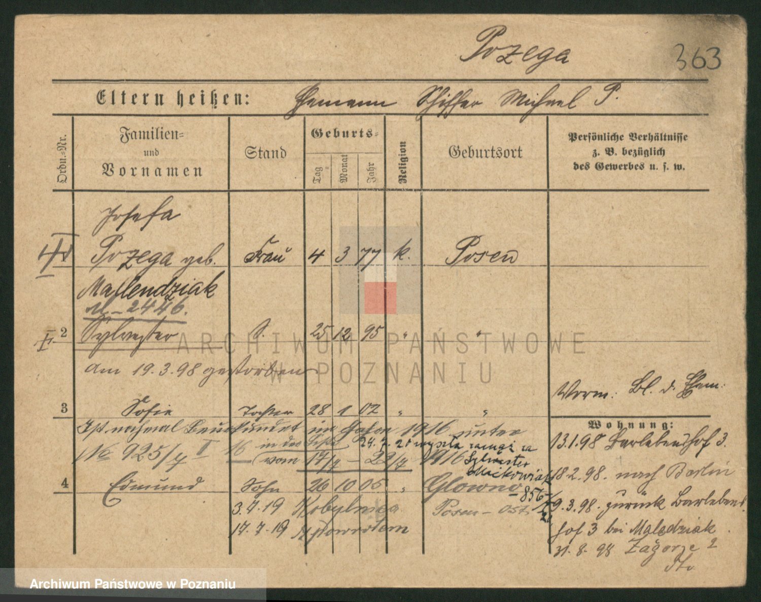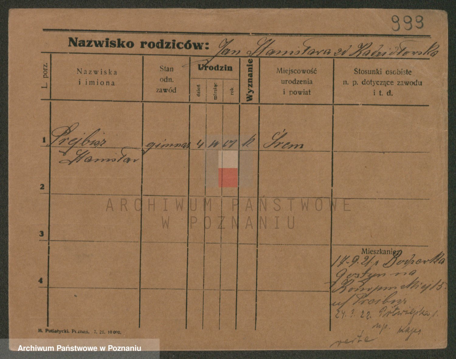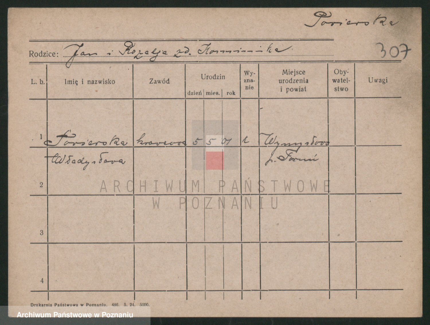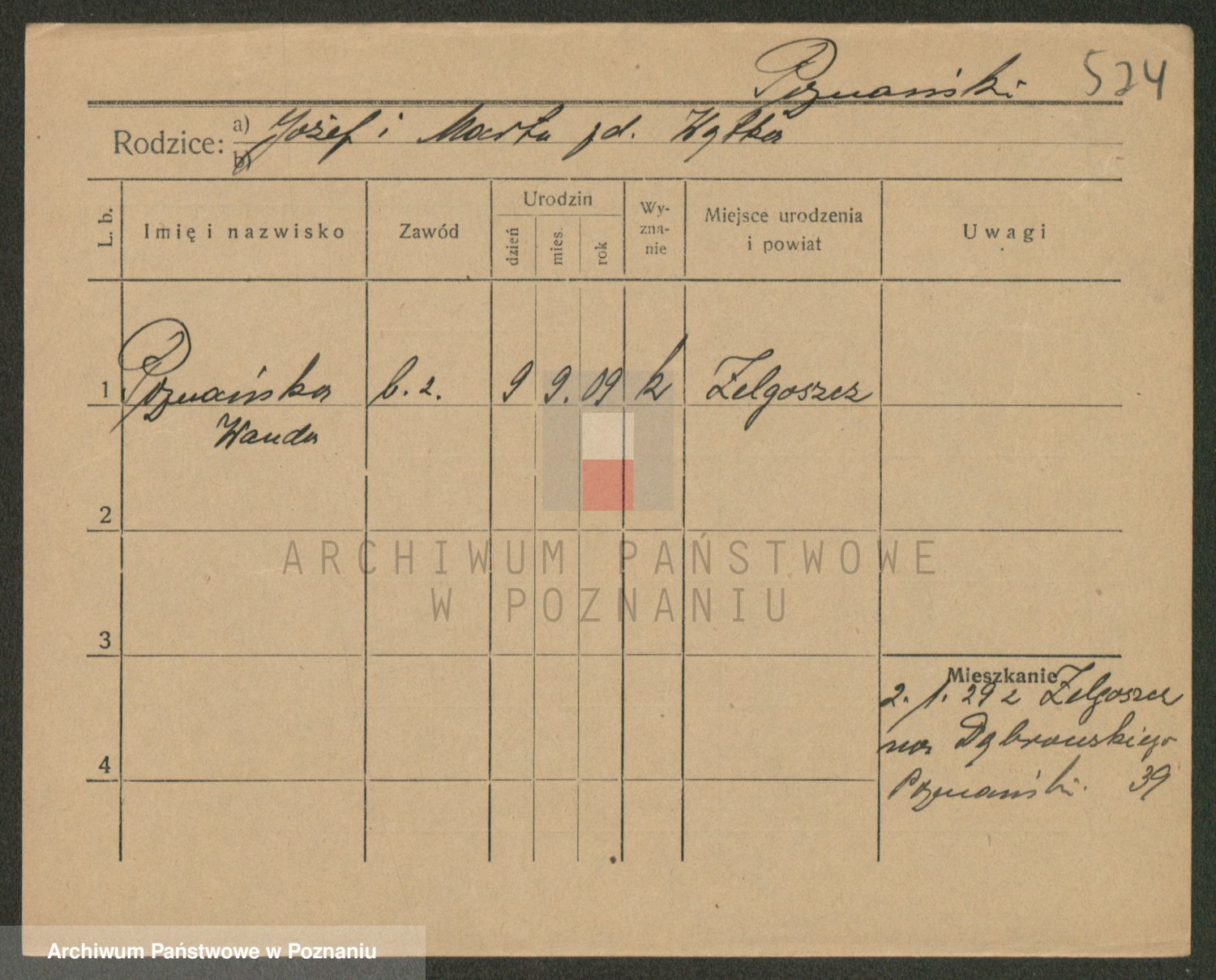 Podgląd karty osobowej dostępny jest po kliknięciu na nazwisko lub ikonkę karty. Można dokonywać powiększenia (ikony na górze) lub przechodzić między kolejnymi skanami (strzałki po bokach).