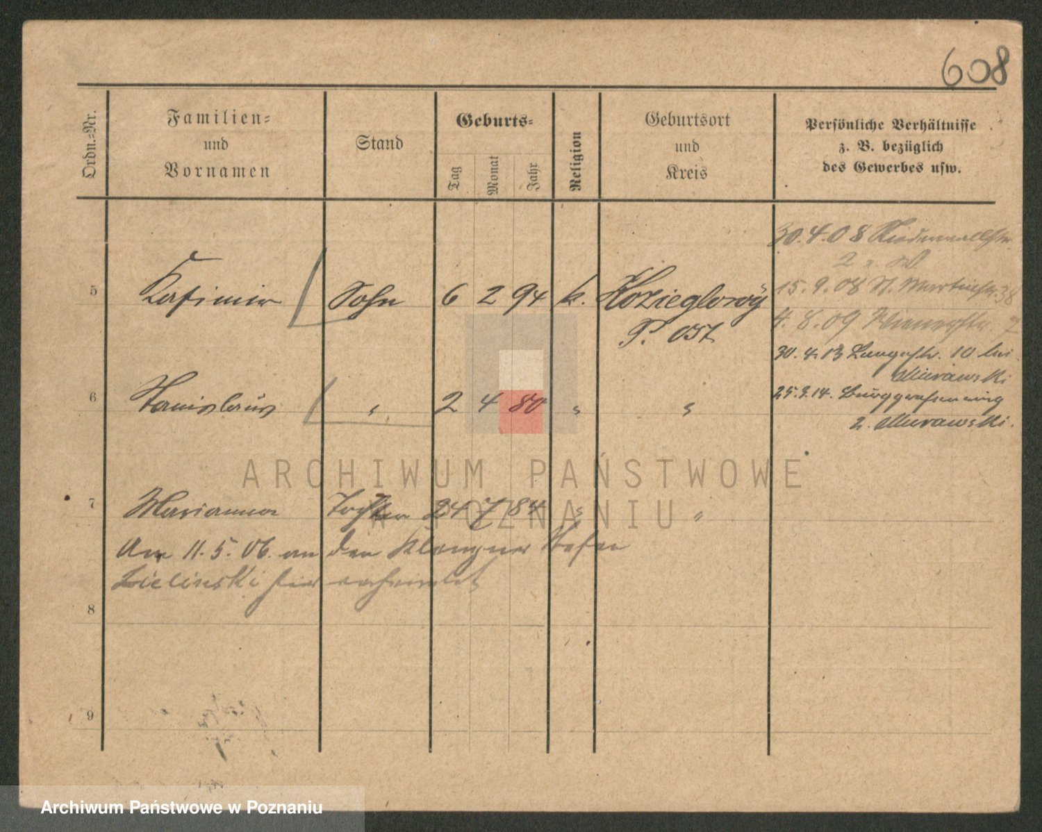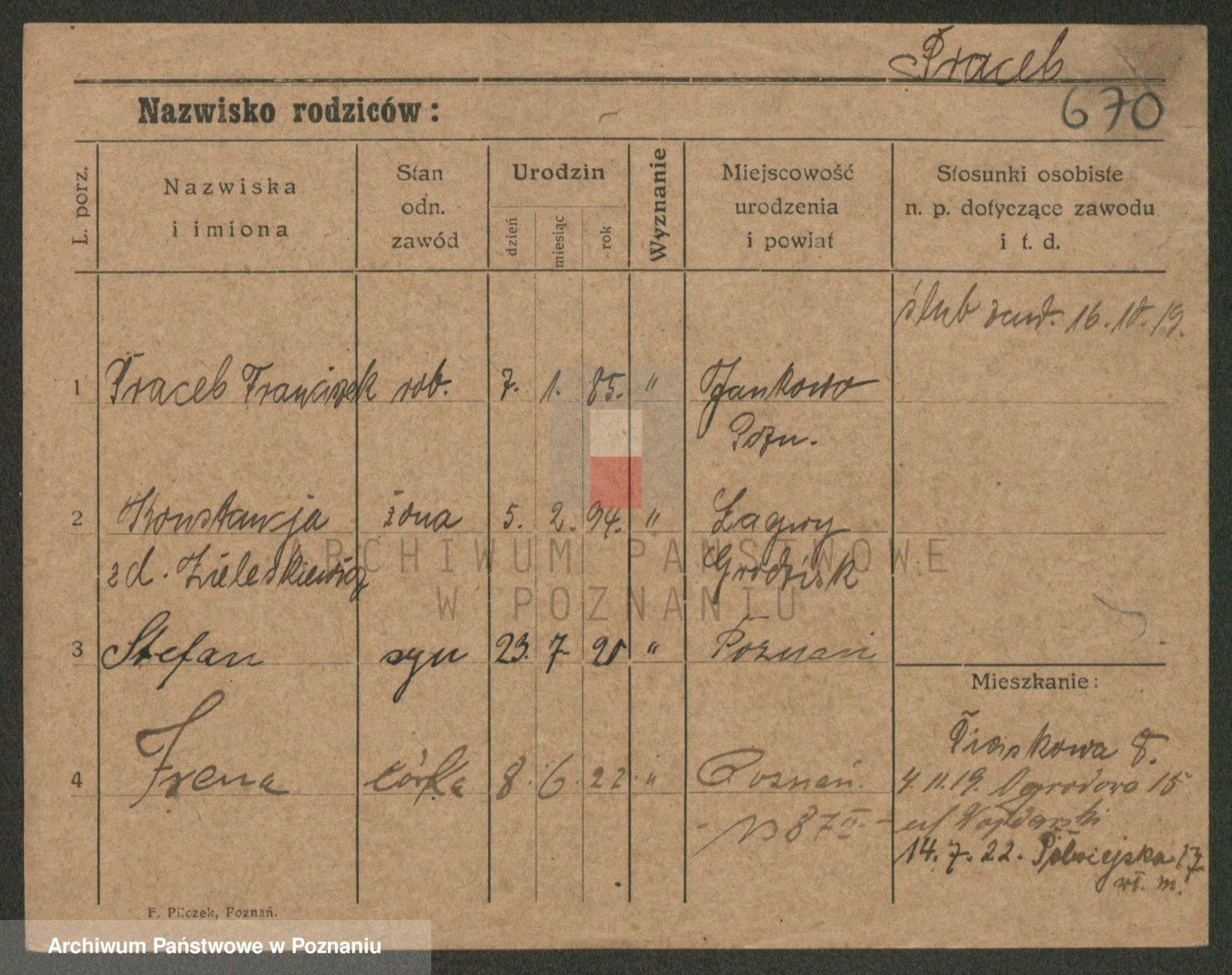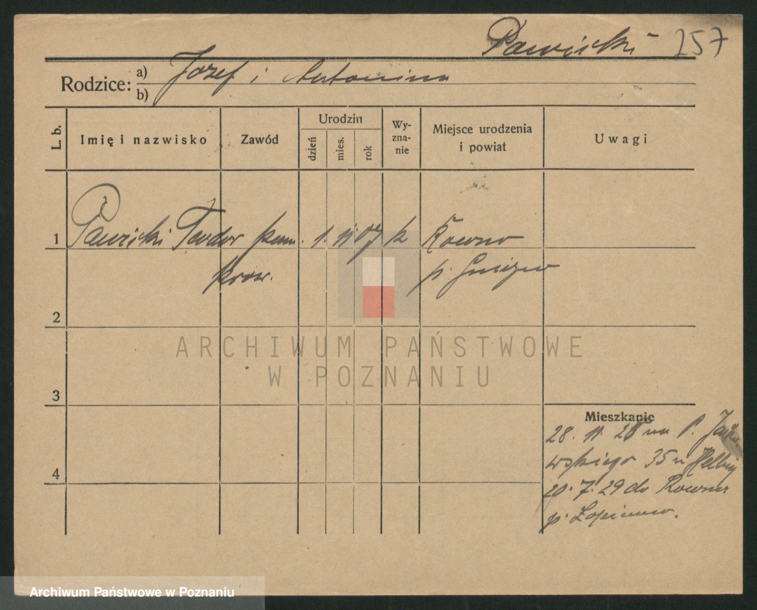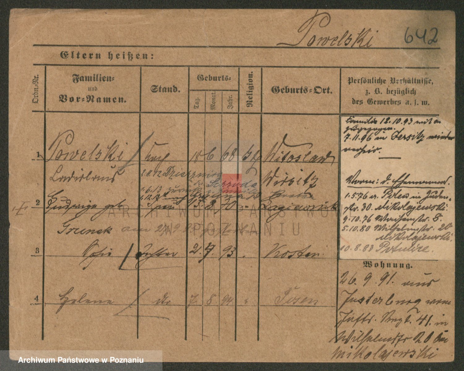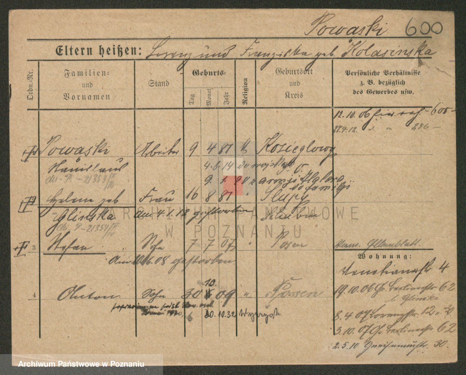 Podgląd karty osobowej dostępny jest po kliknięciu na nazwisko lub ikonkę karty. Można dokonywać powiększenia (ikony na górze) lub przechodzić między kolejnymi skanami (strzałki po bokach).