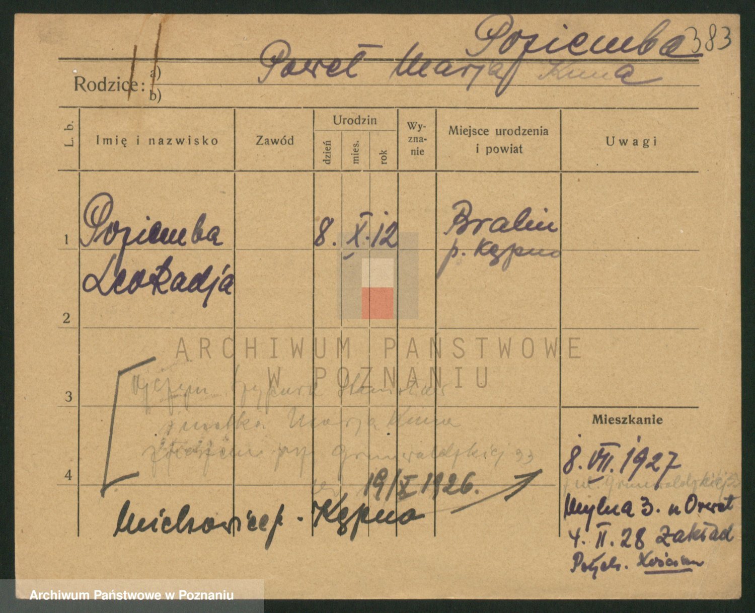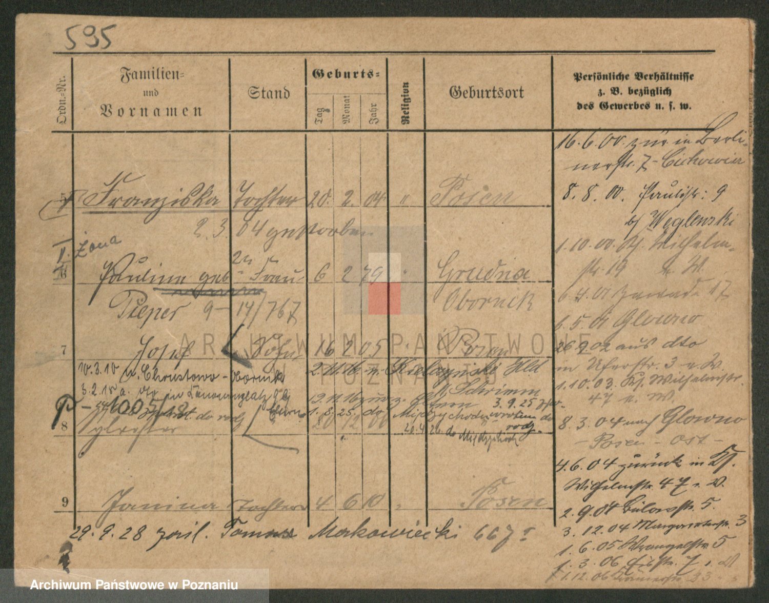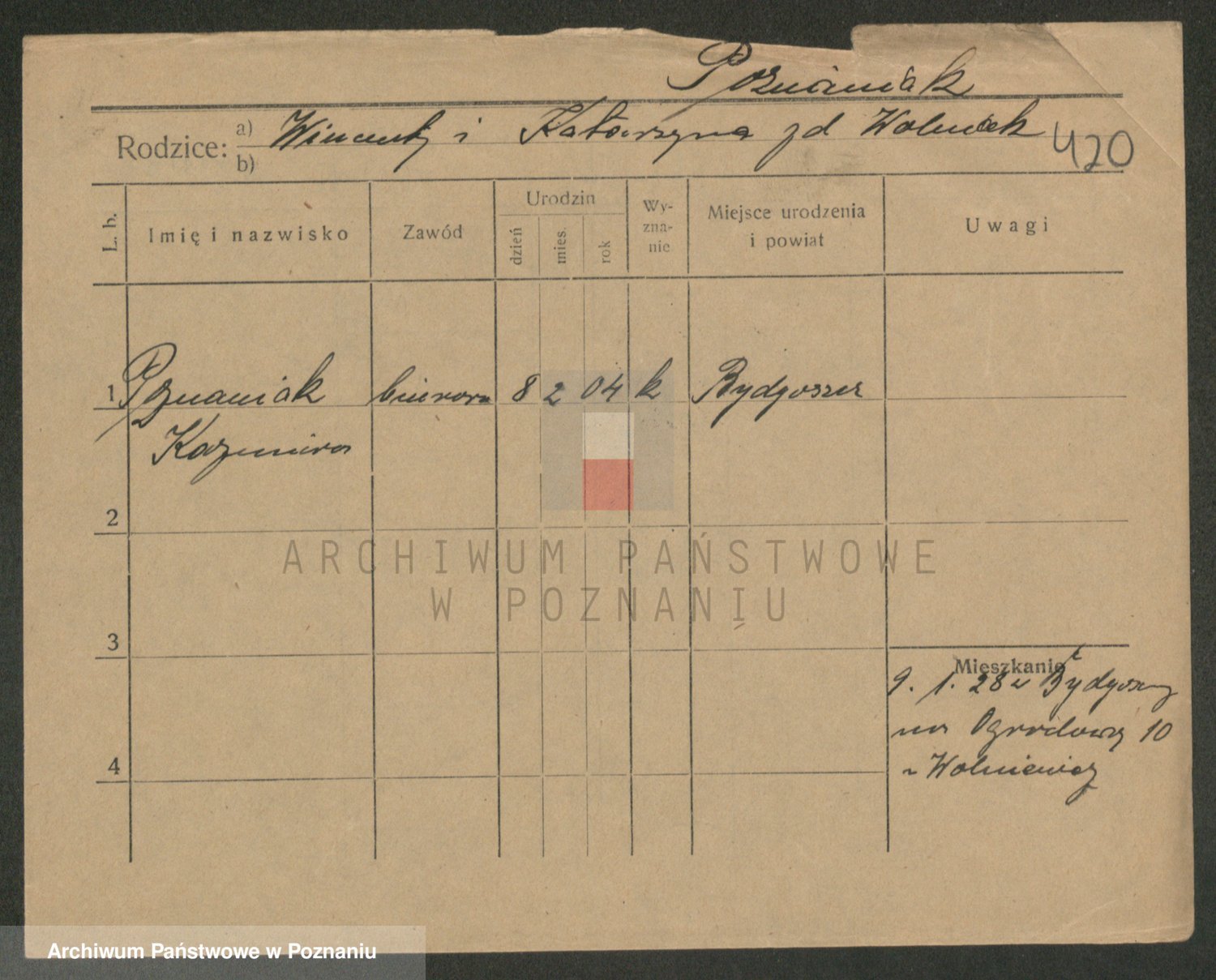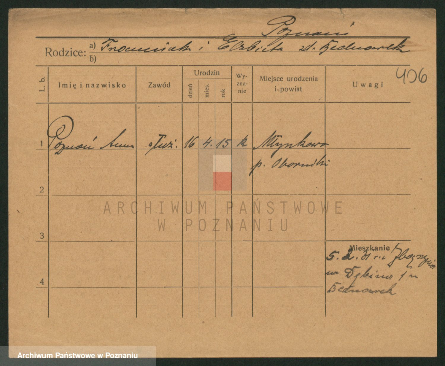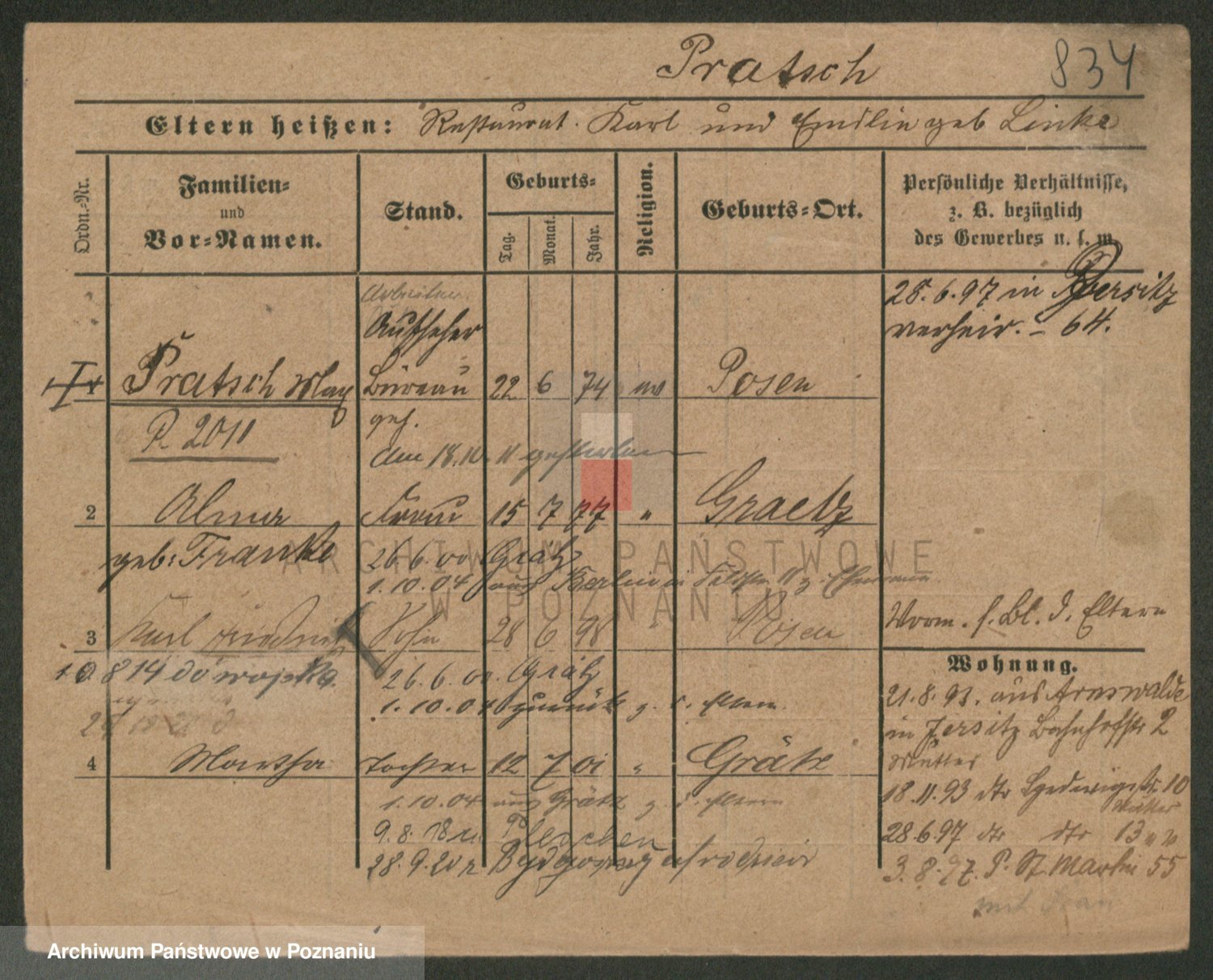 Podgląd karty osobowej dostępny jest po kliknięciu na nazwisko lub ikonkę karty. Można dokonywać powiększenia (ikony na górze) lub przechodzić między kolejnymi skanami (strzałki po bokach).