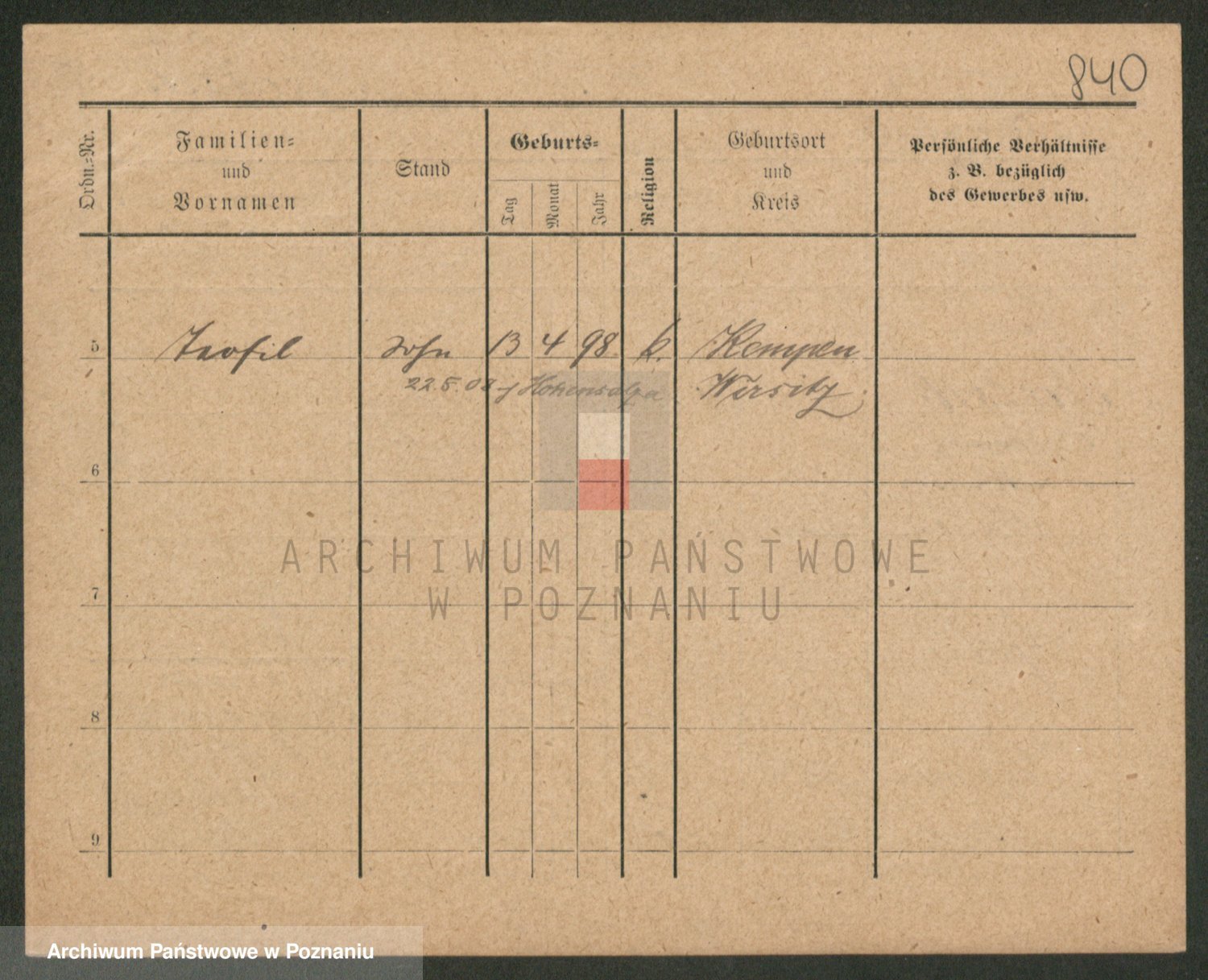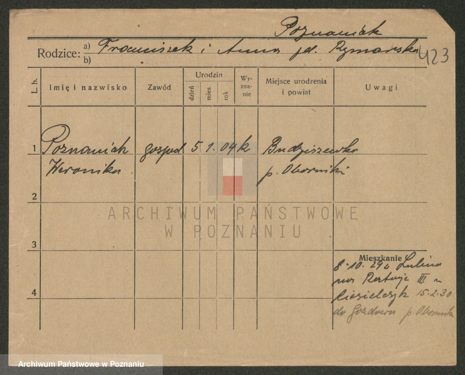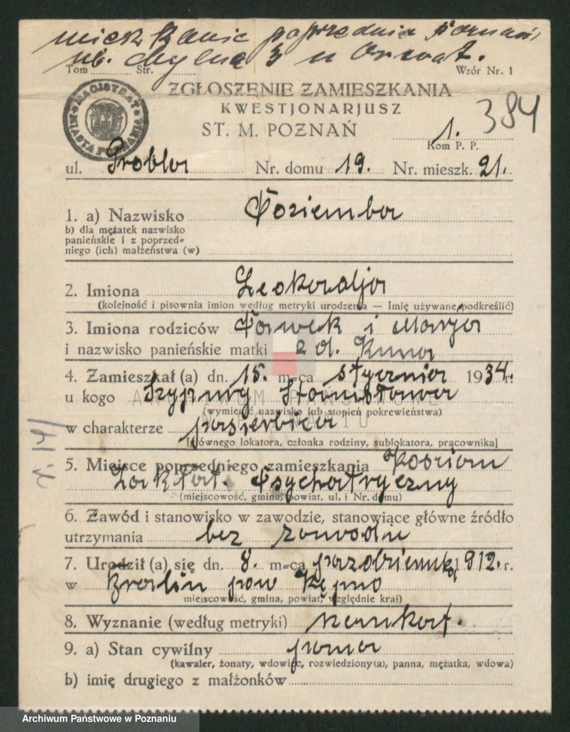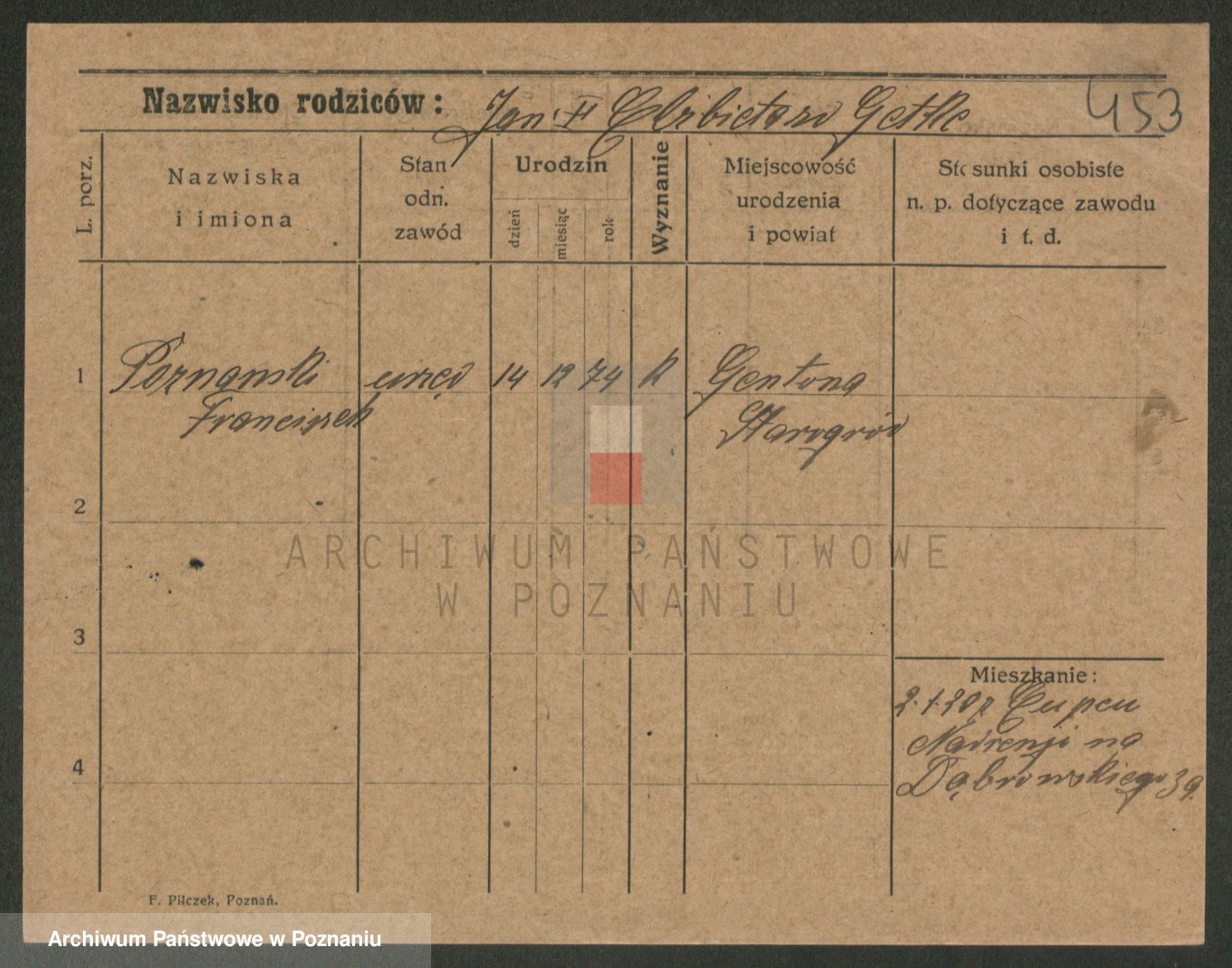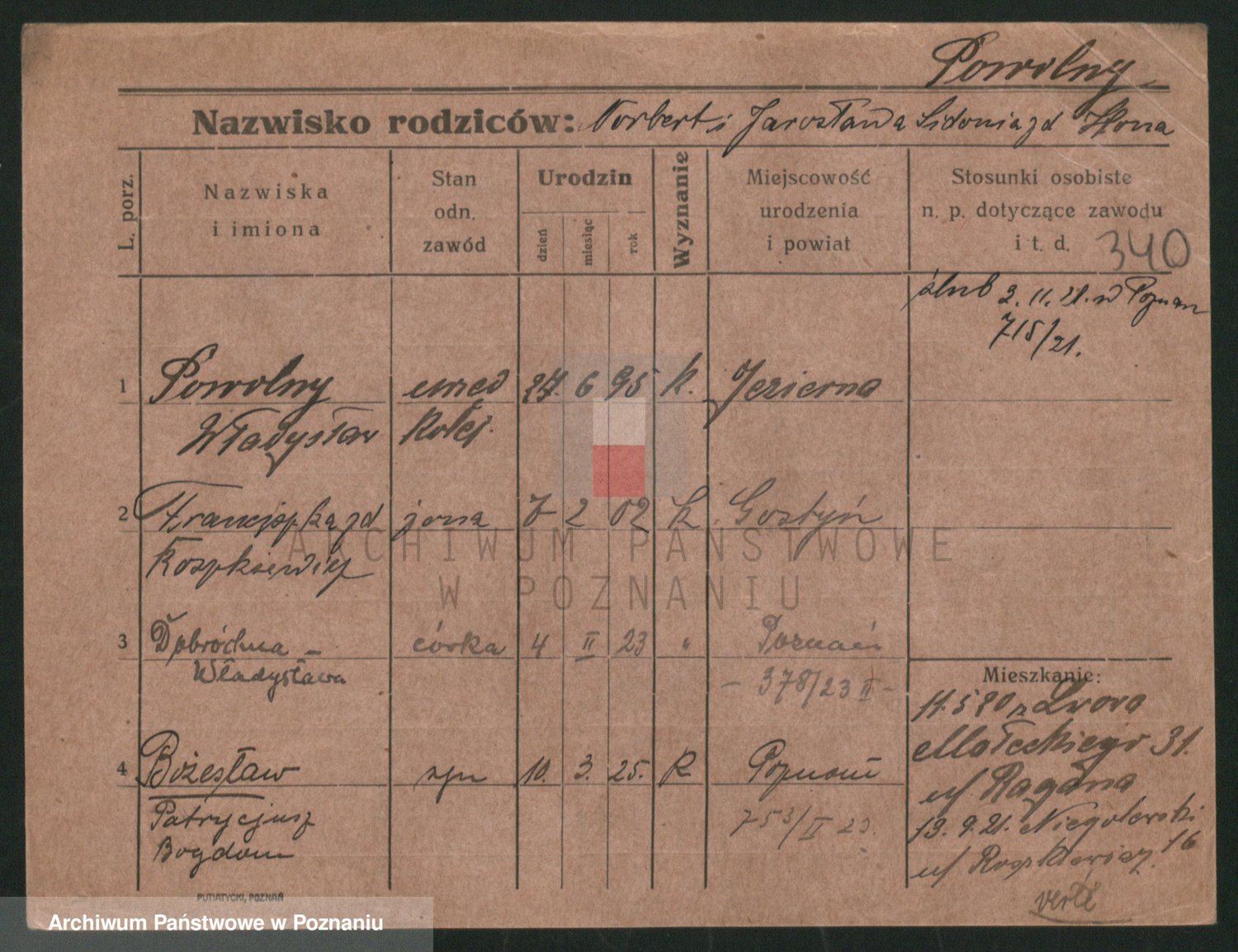 Podgląd karty osobowej dostępny jest po kliknięciu na nazwisko lub ikonkę karty. Można dokonywać powiększenia (ikony na górze) lub przechodzić między kolejnymi skanami (strzałki po bokach).