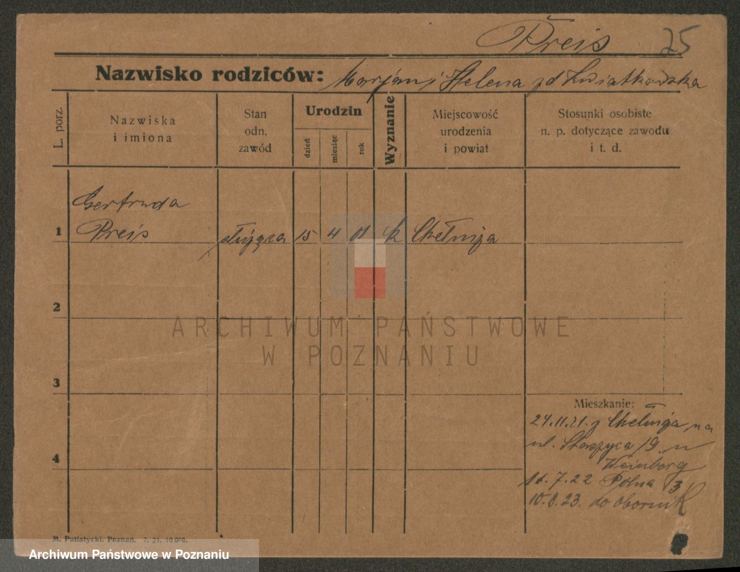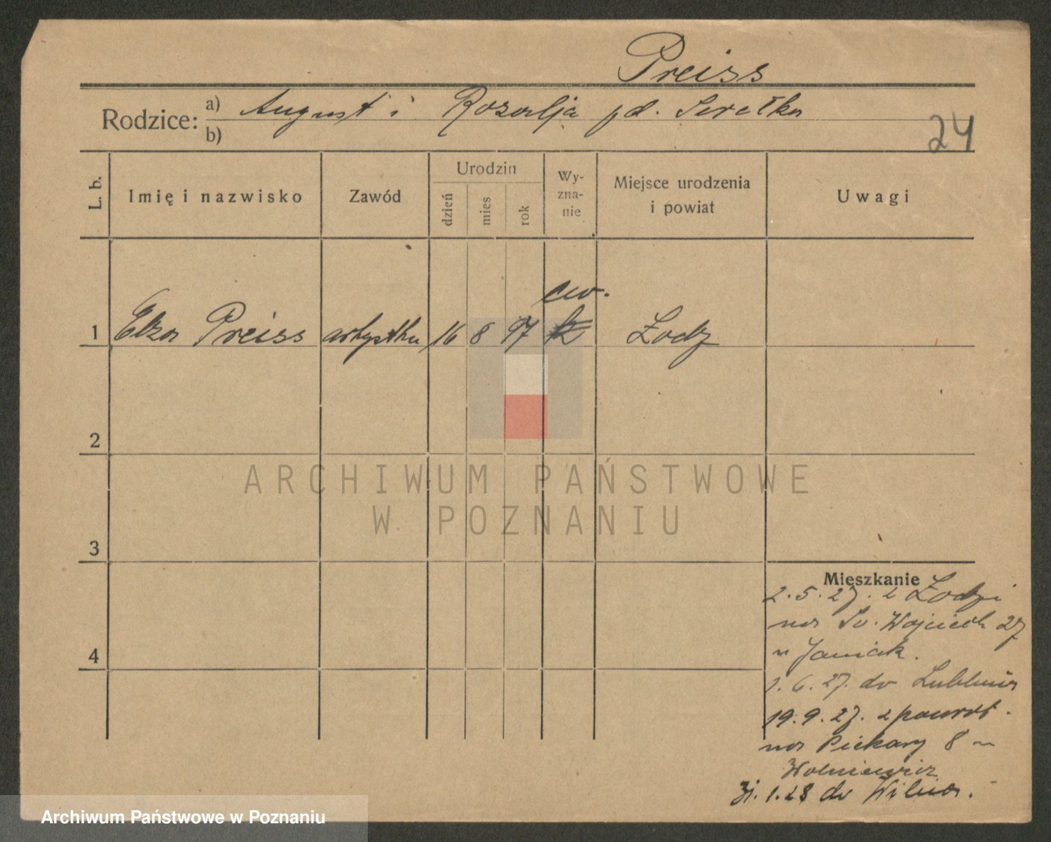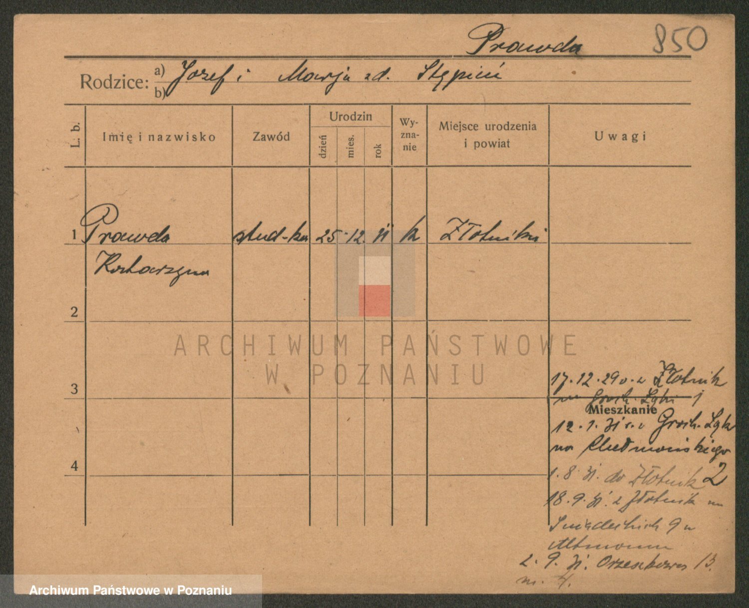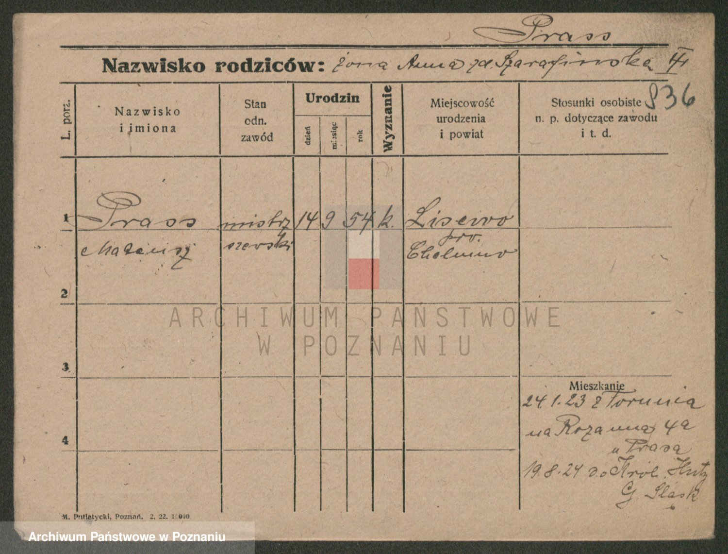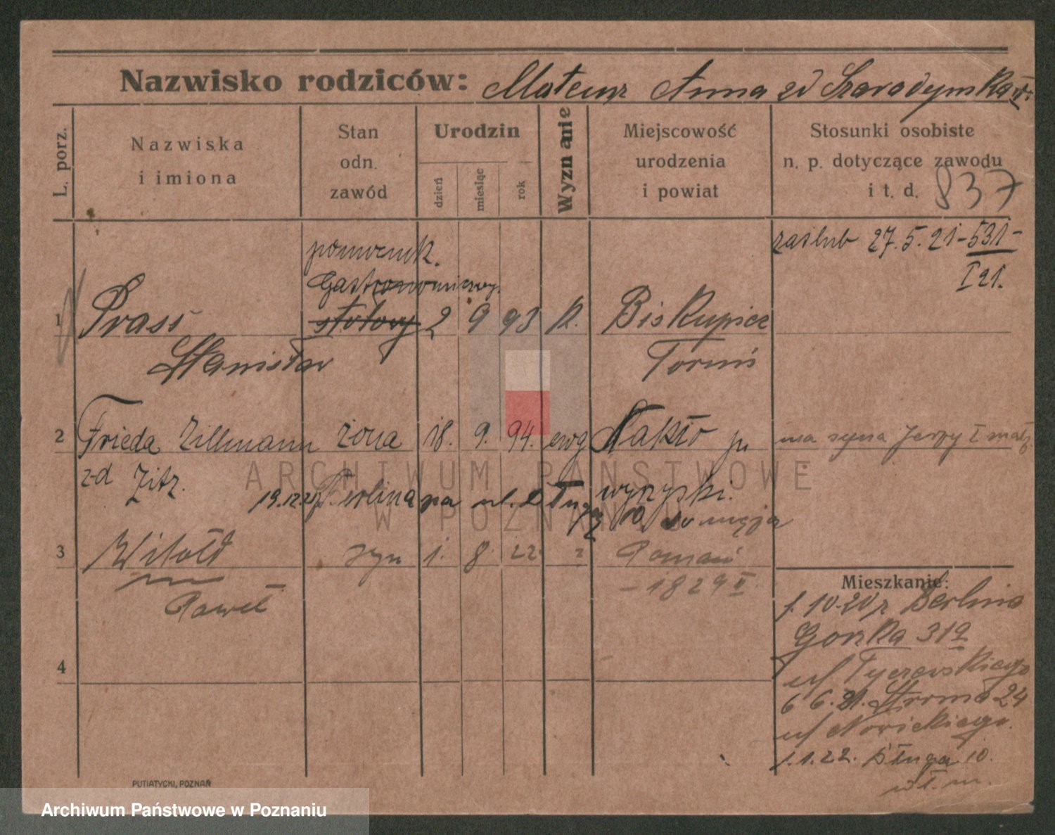 Podgląd karty osobowej dostępny jest po kliknięciu na nazwisko lub ikonkę karty. Można dokonywać powiększenia (ikony na górze) lub przechodzić między kolejnymi skanami (strzałki po bokach).