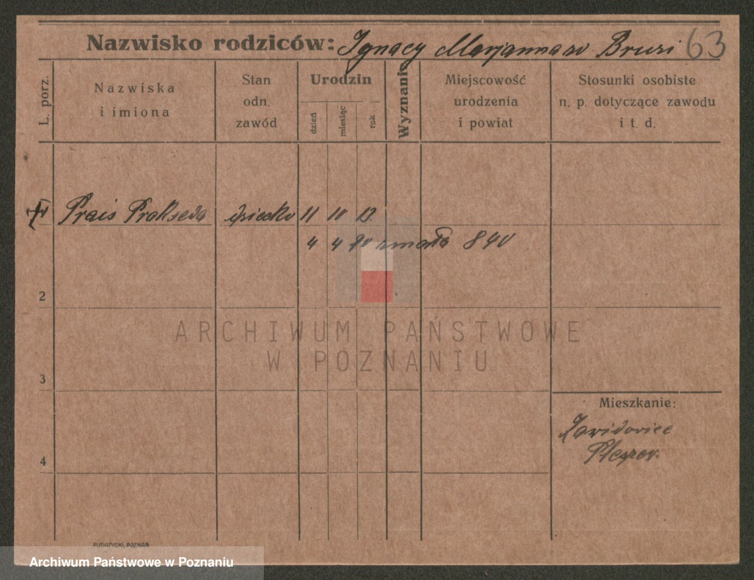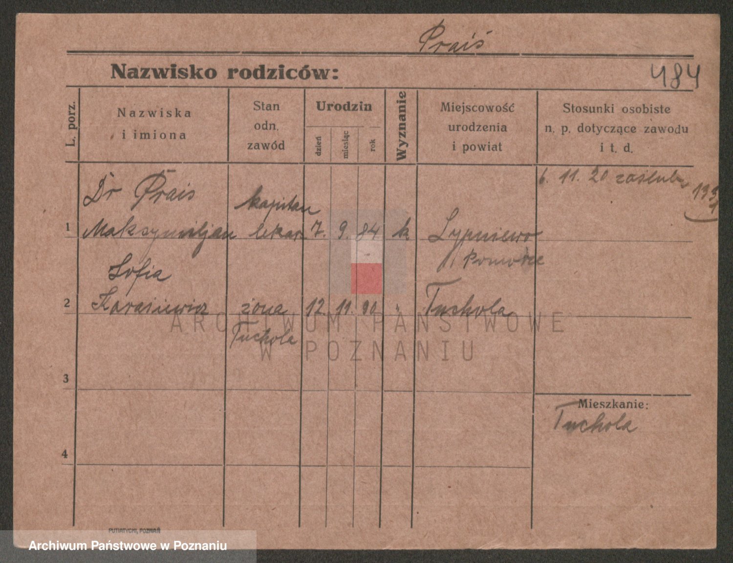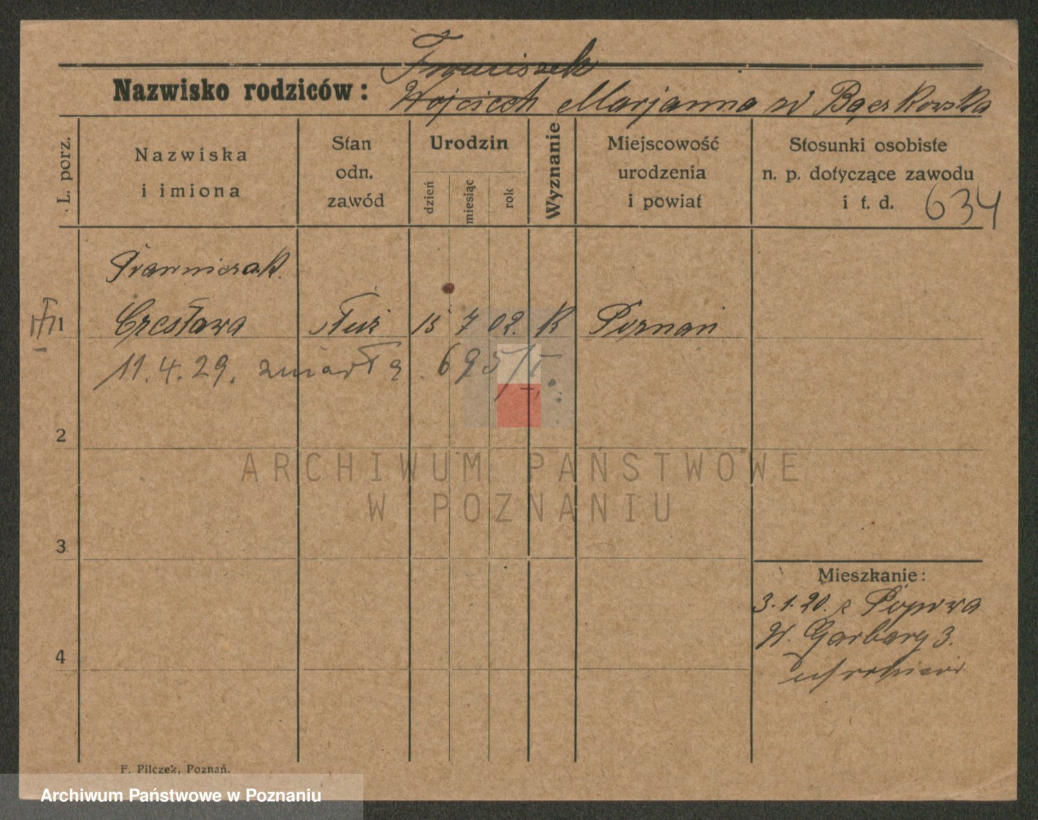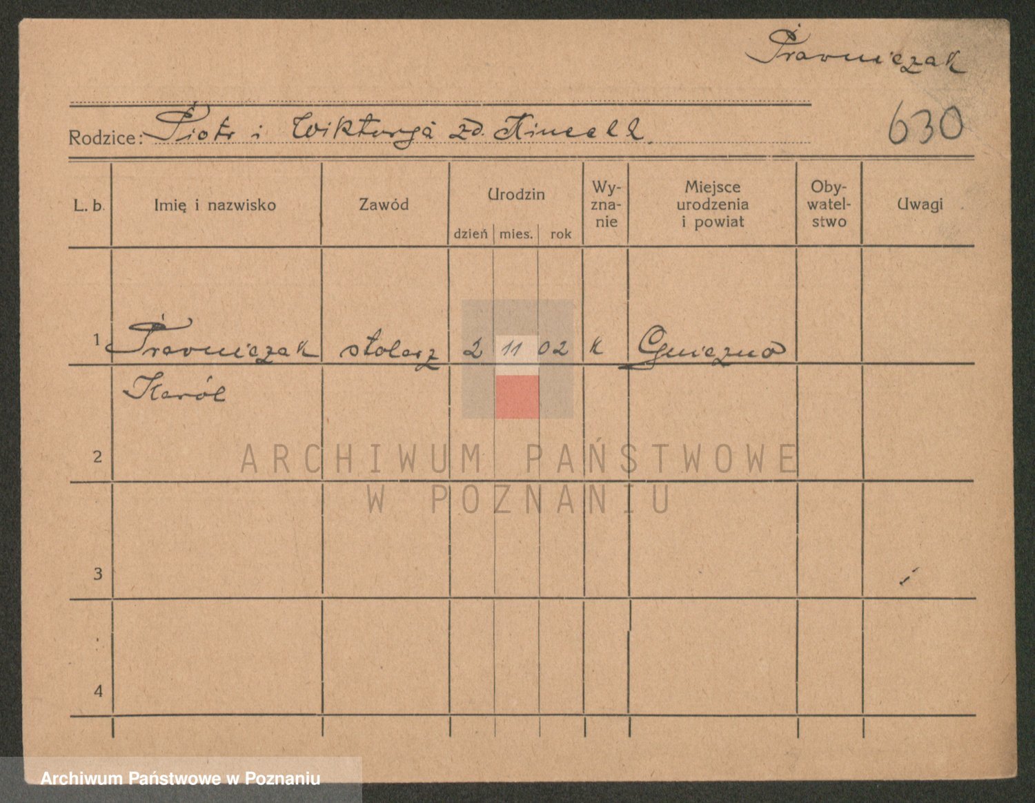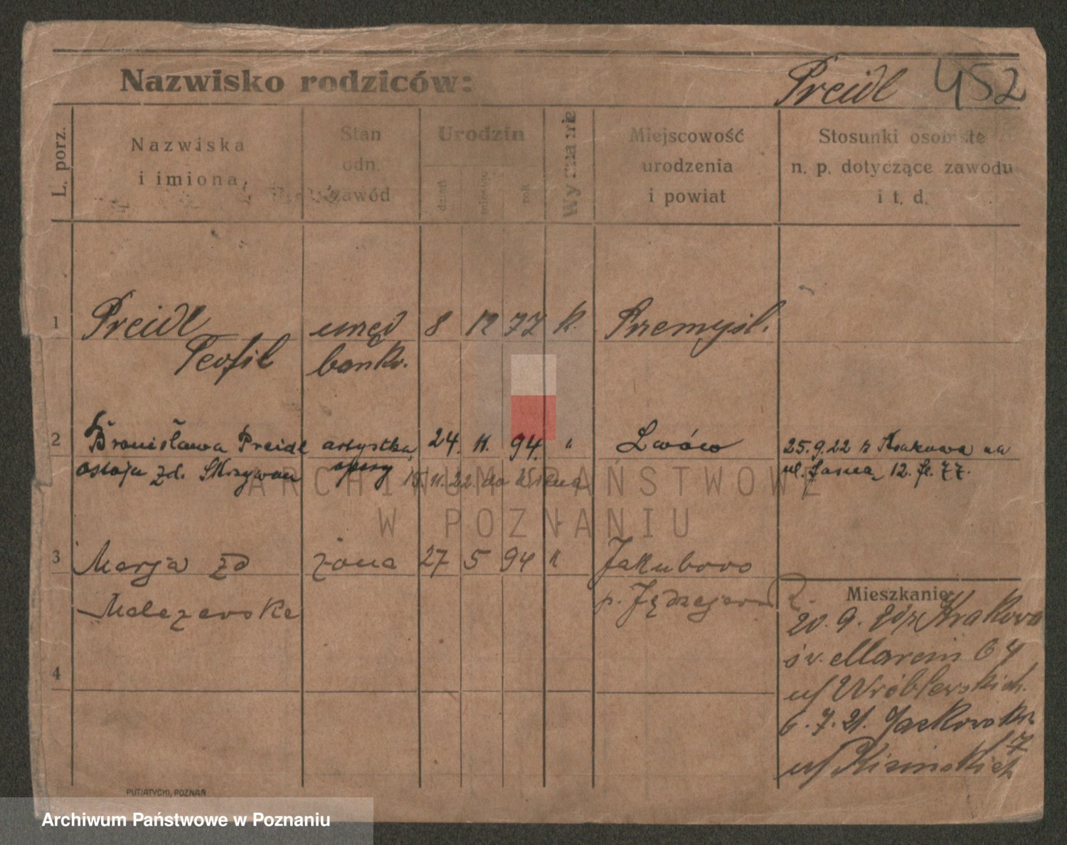 Podgląd karty osobowej dostępny jest po kliknięciu na nazwisko lub ikonkę karty. Można dokonywać powiększenia (ikony na górze) lub przechodzić między kolejnymi skanami (strzałki po bokach).