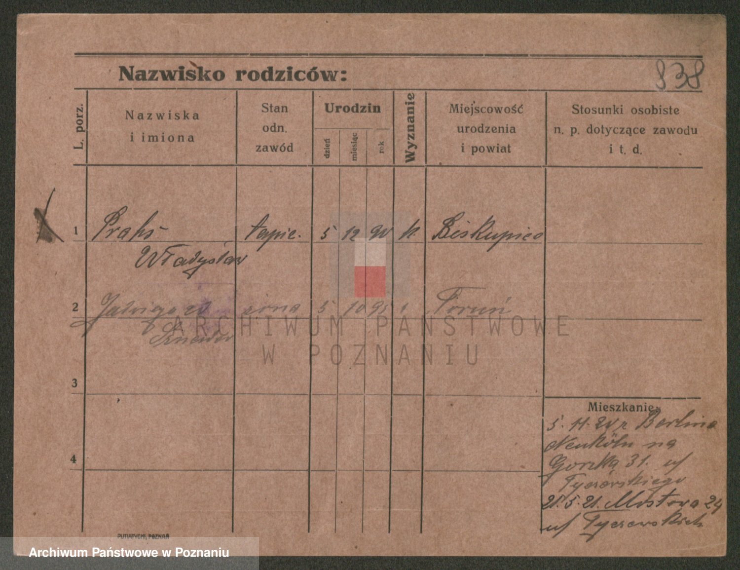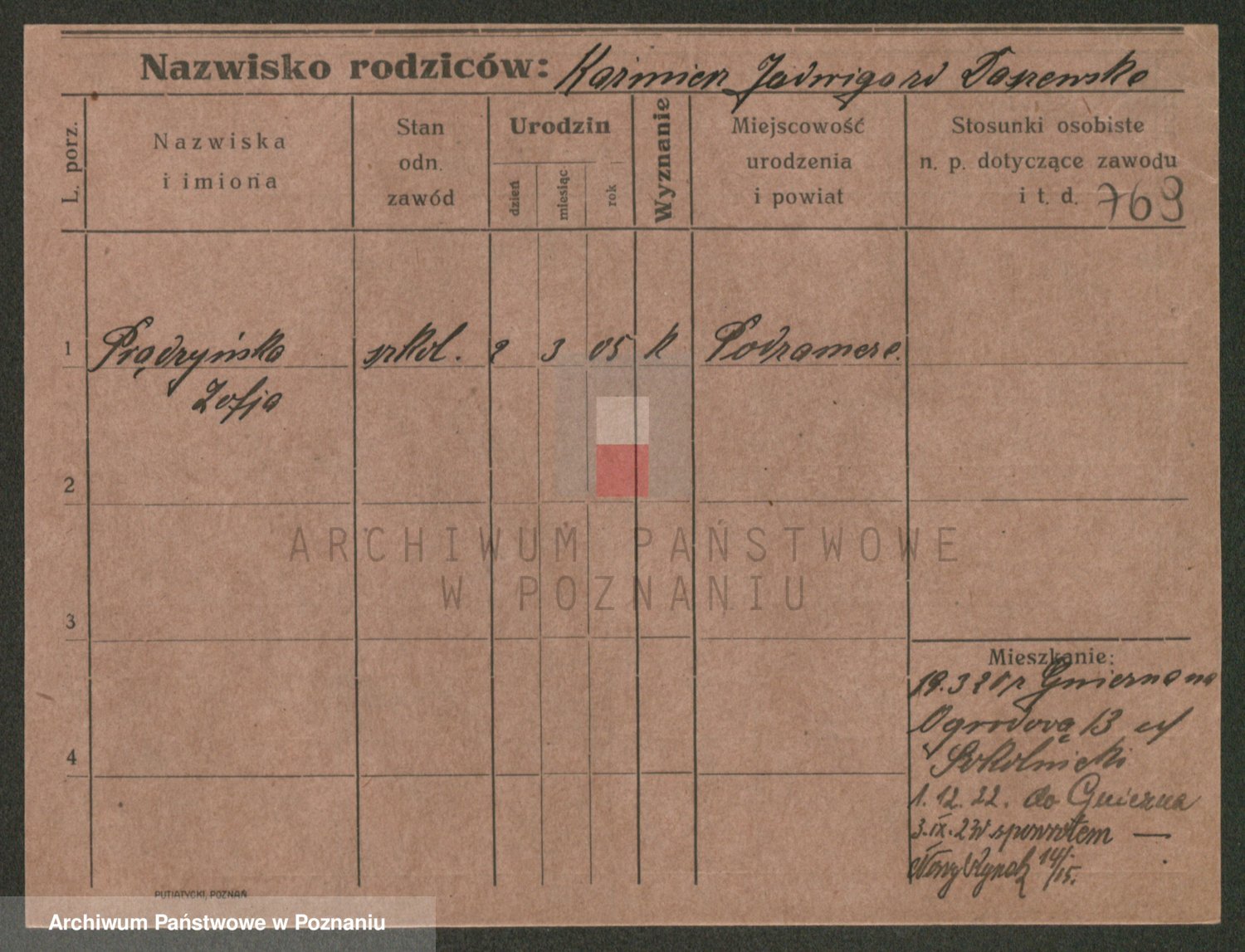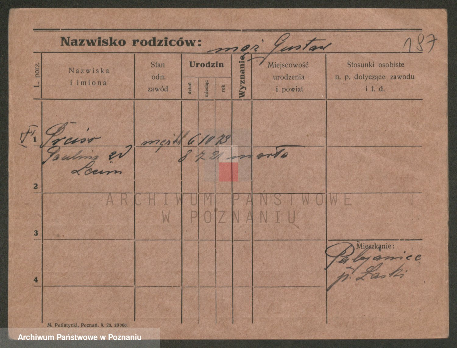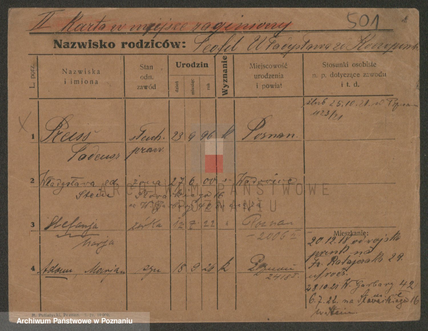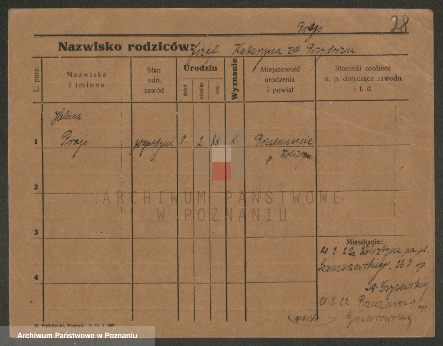 Podgląd karty osobowej dostępny jest po kliknięciu na nazwisko lub ikonkę karty. Można dokonywać powiększenia (ikony na górze) lub przechodzić między kolejnymi skanami (strzałki po bokach).