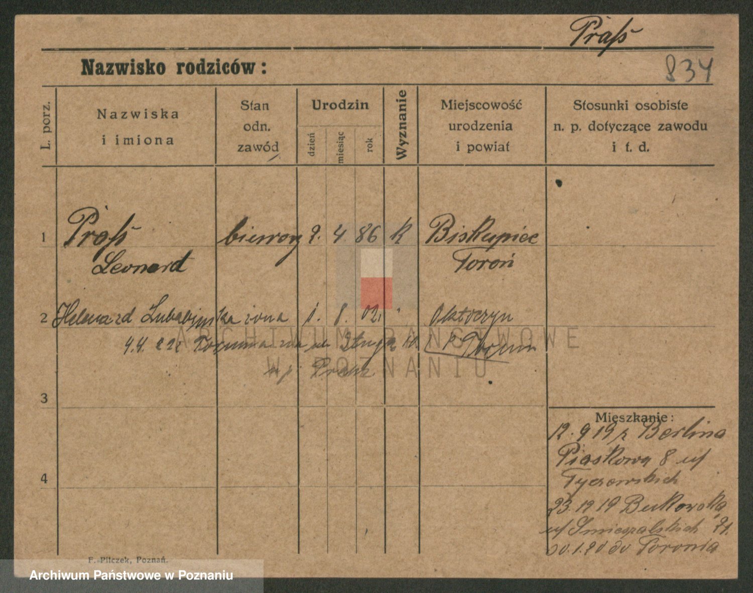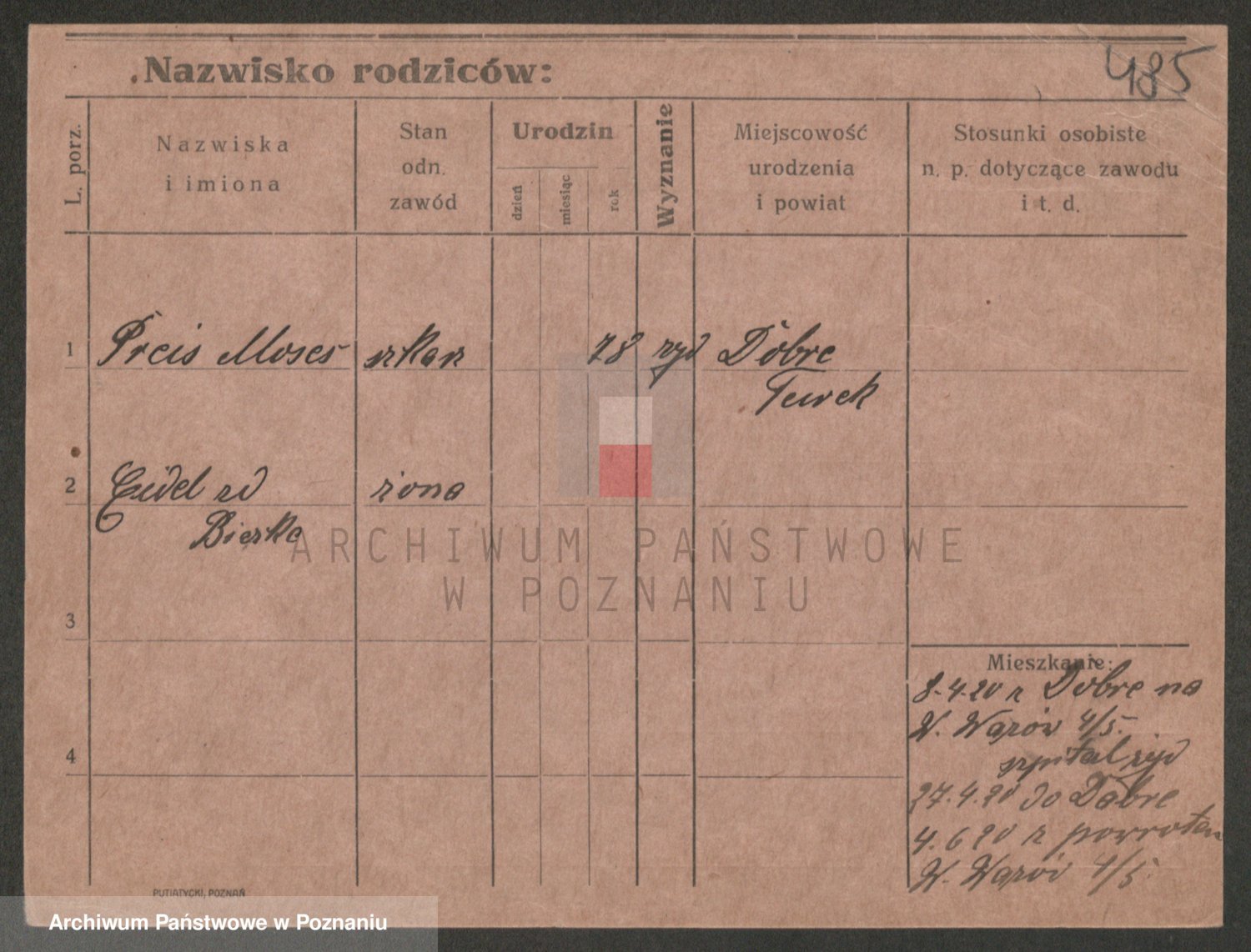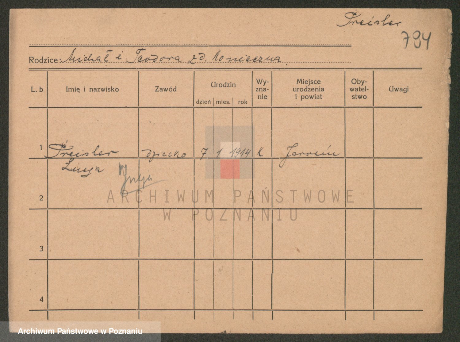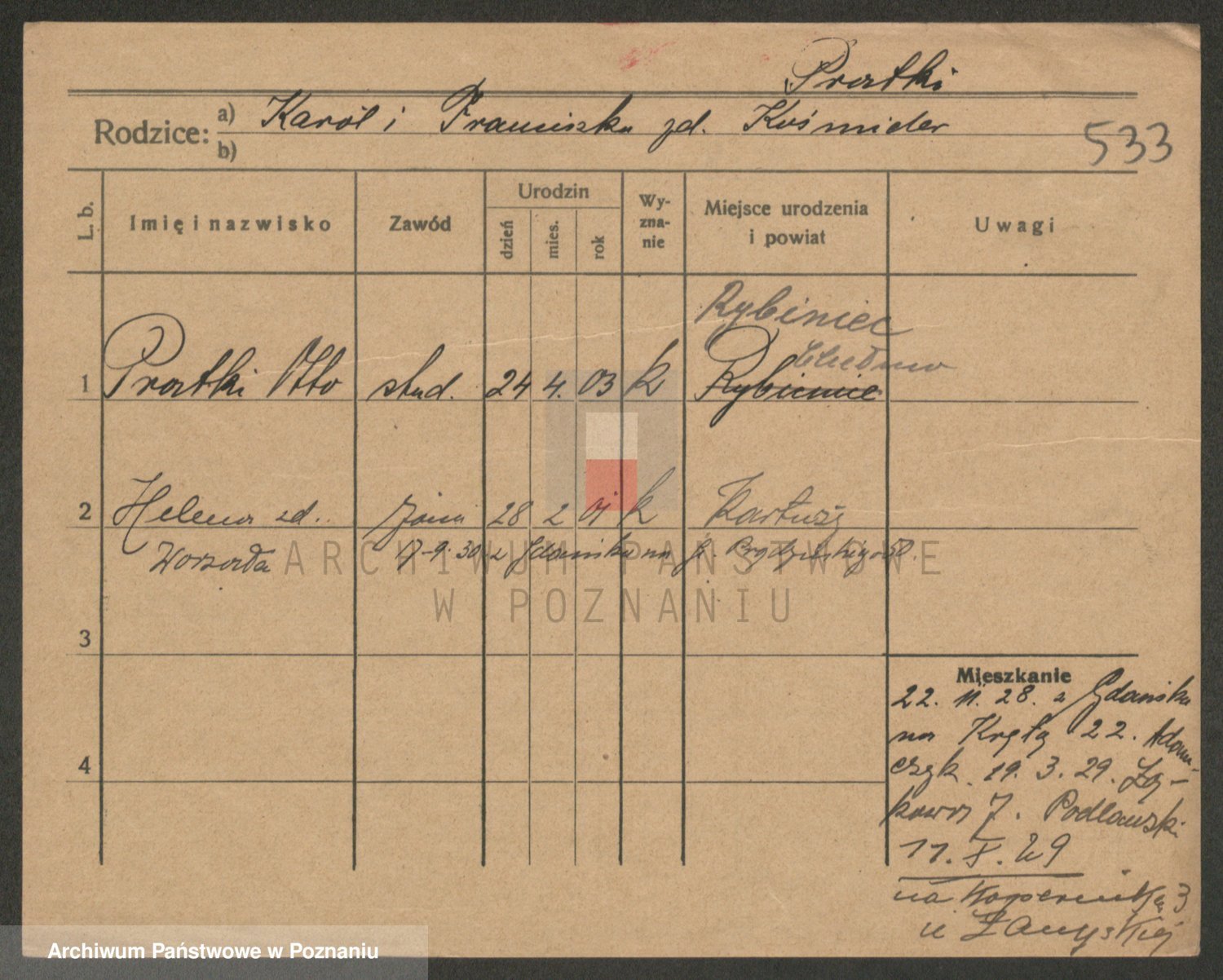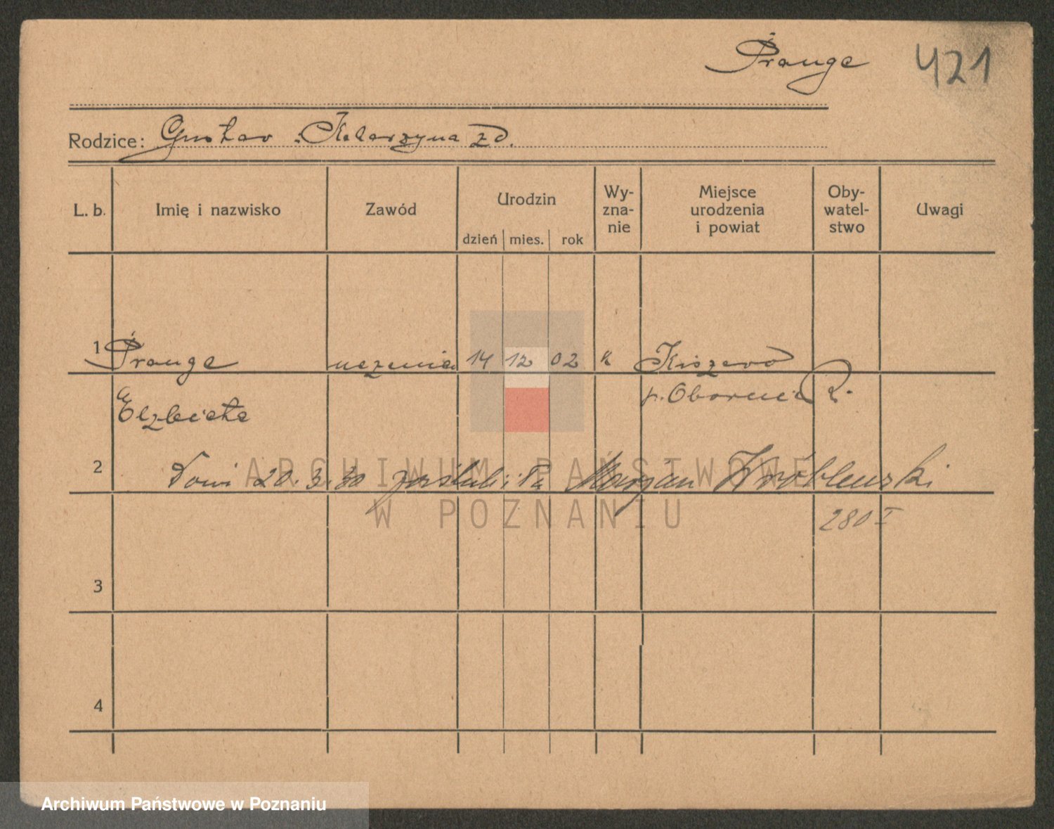 Podgląd karty osobowej dostępny jest po kliknięciu na nazwisko lub ikonkę karty. Można dokonywać powiększenia (ikony na górze) lub przechodzić między kolejnymi skanami (strzałki po bokach).
