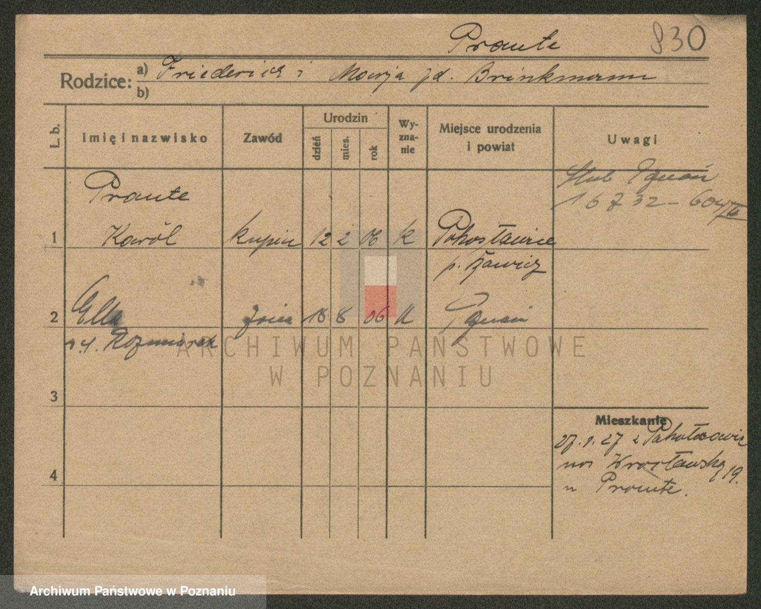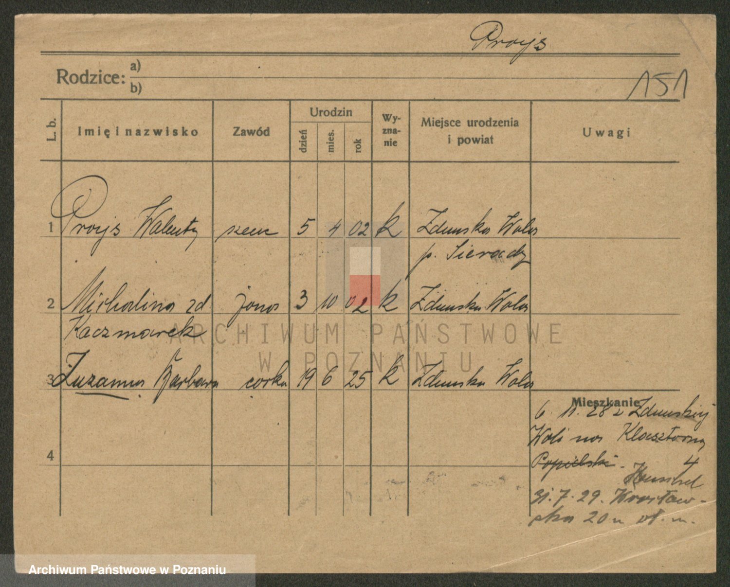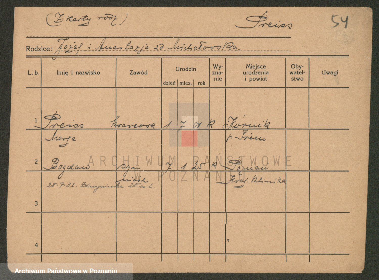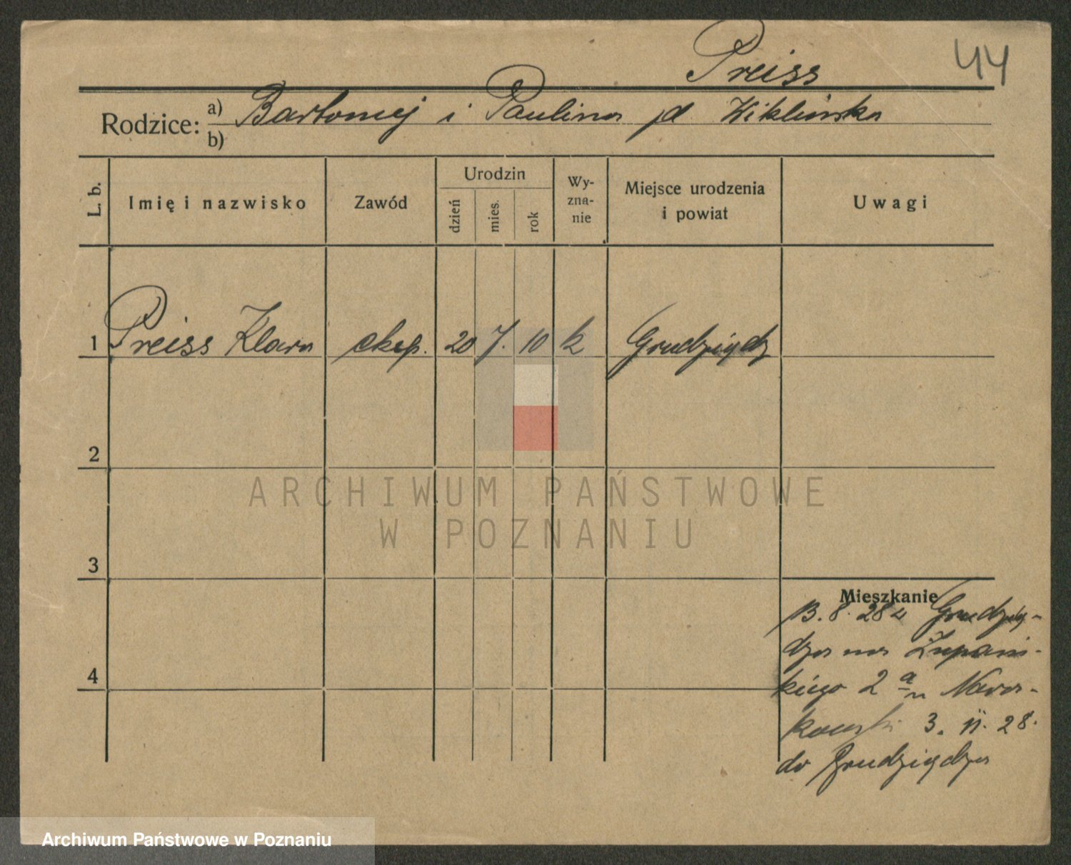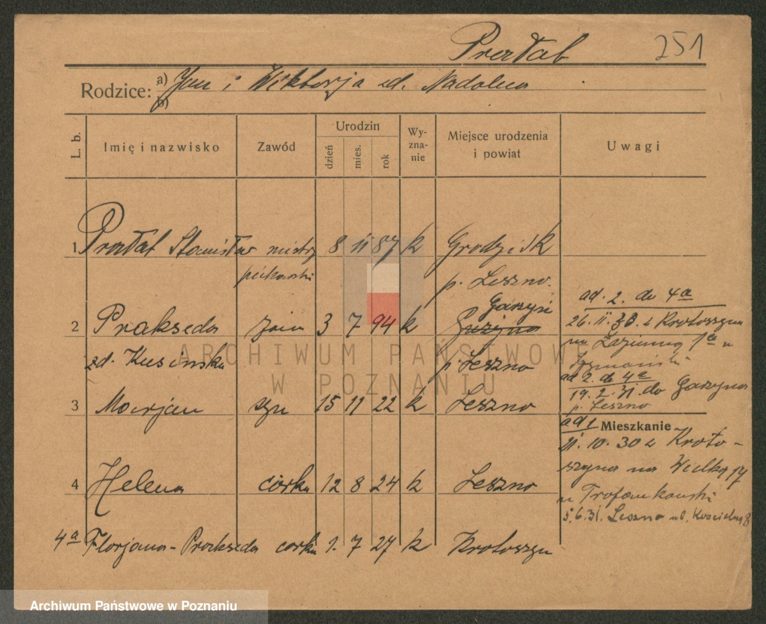 Podgląd karty osobowej dostępny jest po kliknięciu na nazwisko lub ikonkę karty. Można dokonywać powiększenia (ikony na górze) lub przechodzić między kolejnymi skanami (strzałki po bokach).