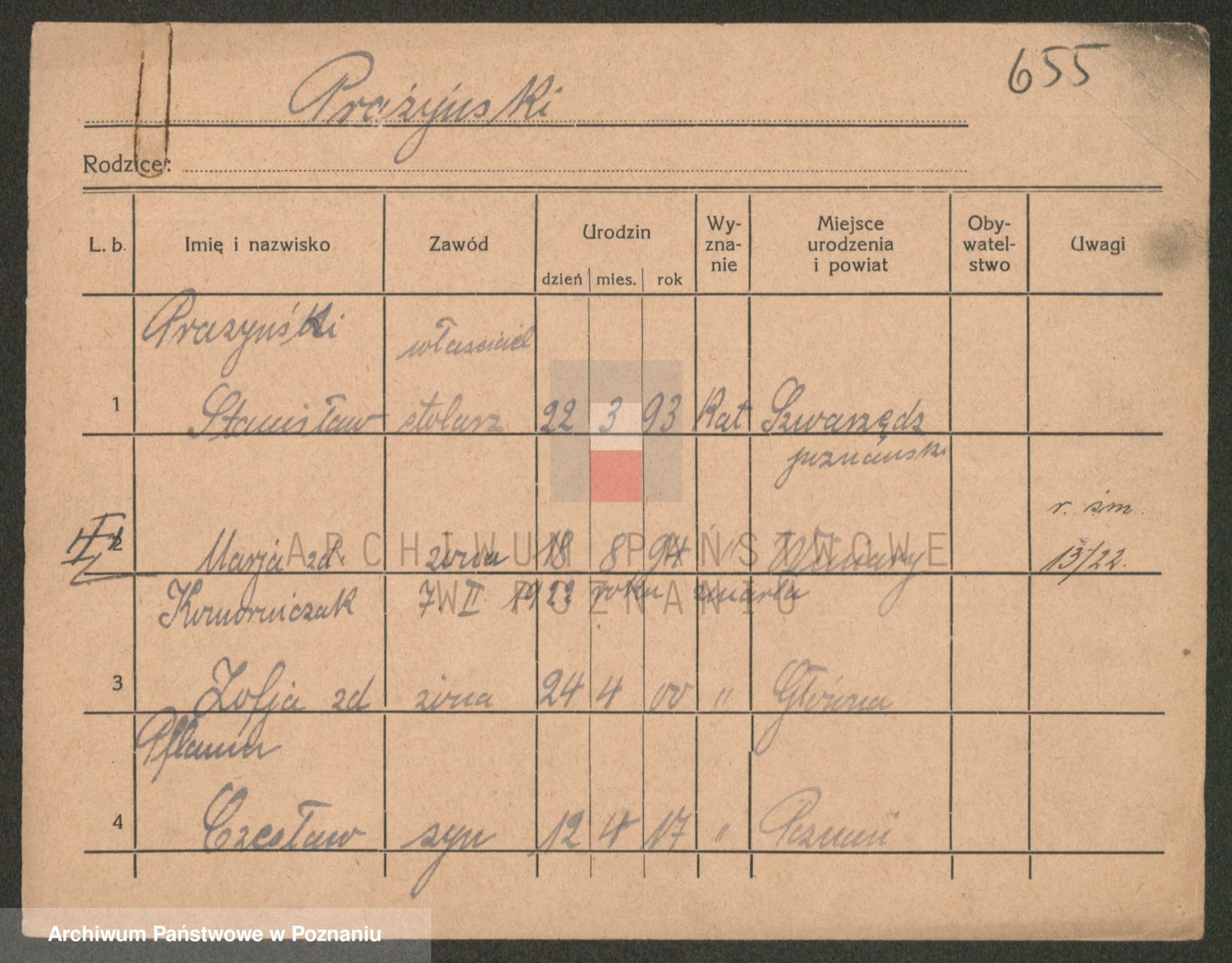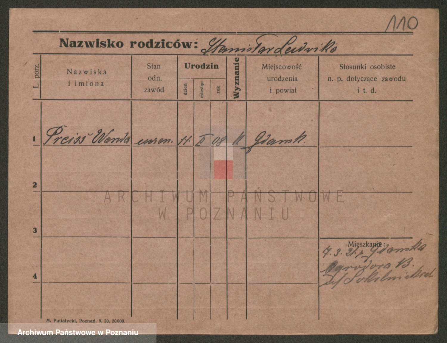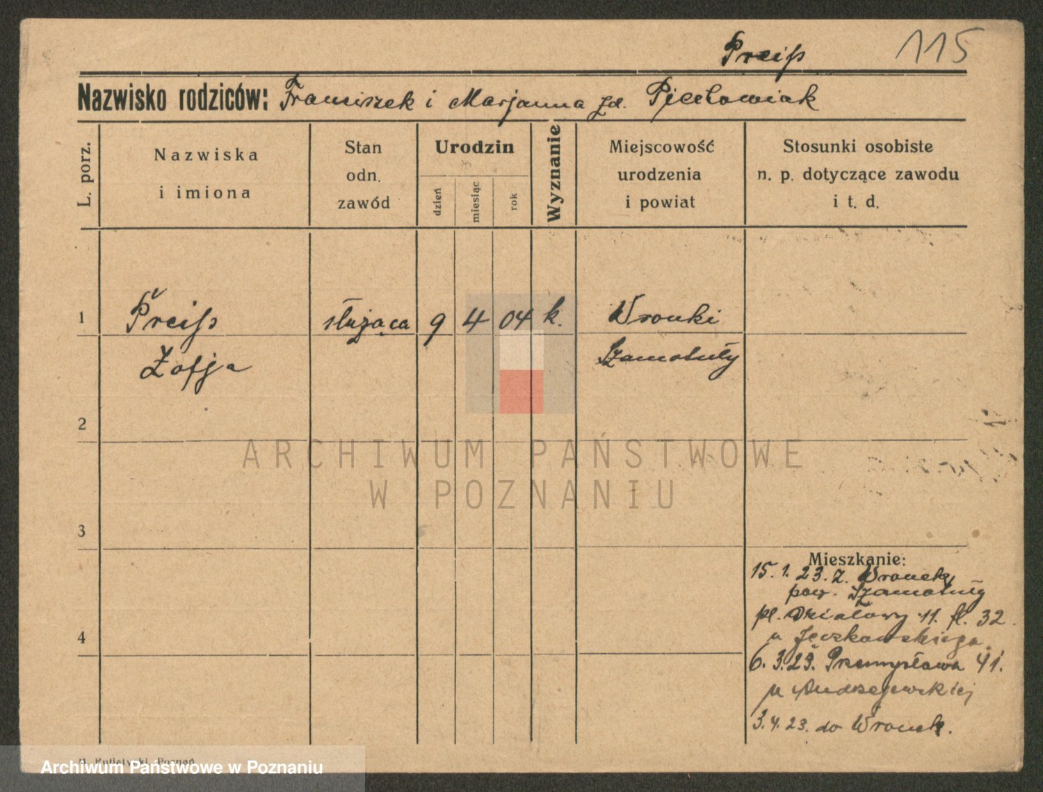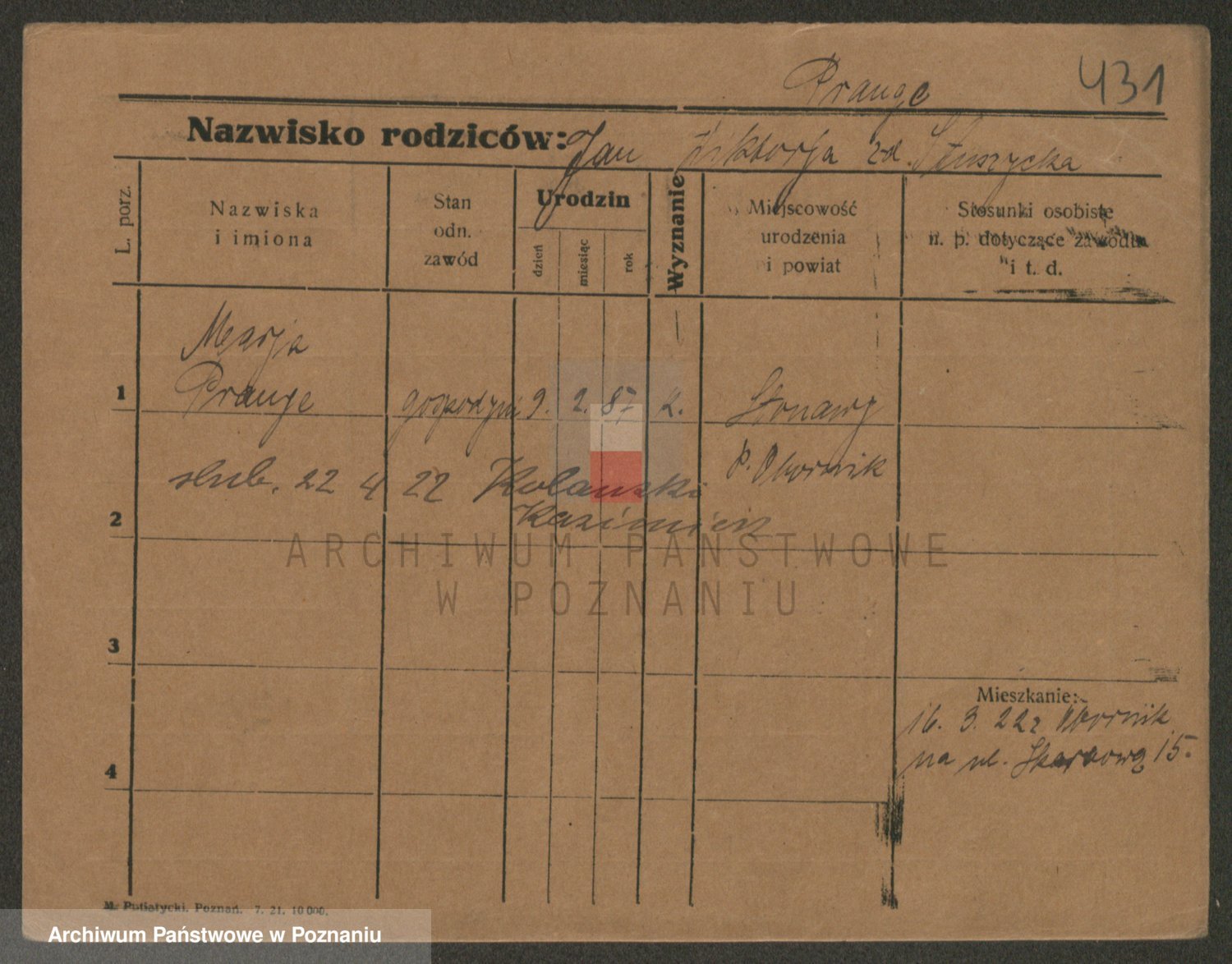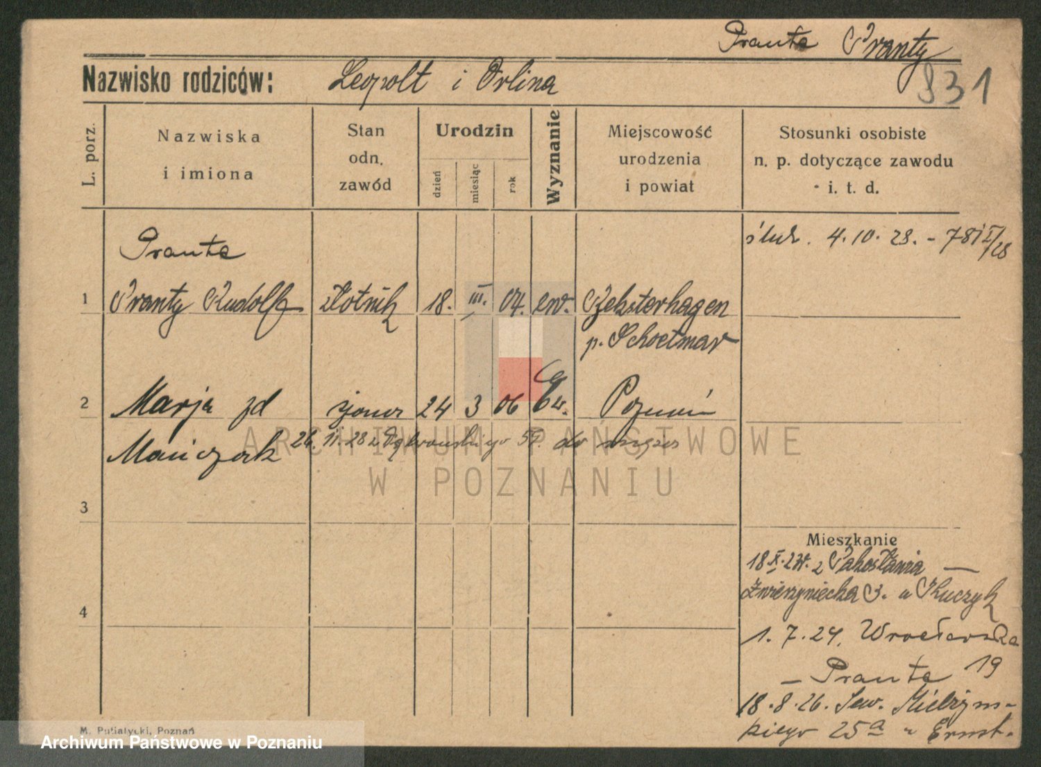 Podgląd karty osobowej dostępny jest po kliknięciu na nazwisko lub ikonkę karty. Można dokonywać powiększenia (ikony na górze) lub przechodzić między kolejnymi skanami (strzałki po bokach).