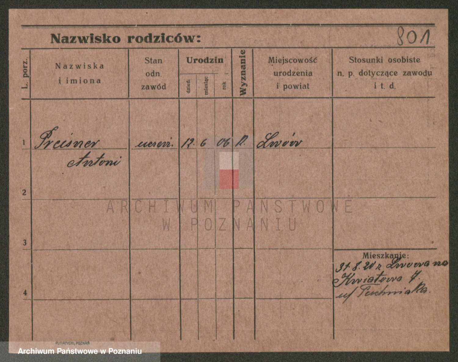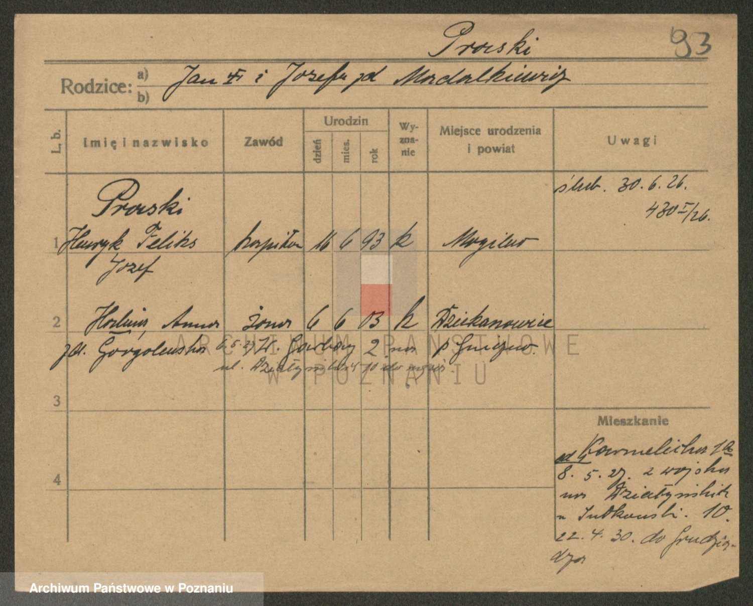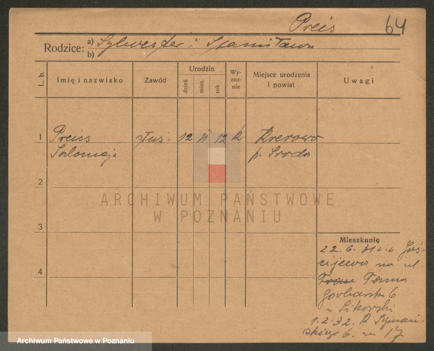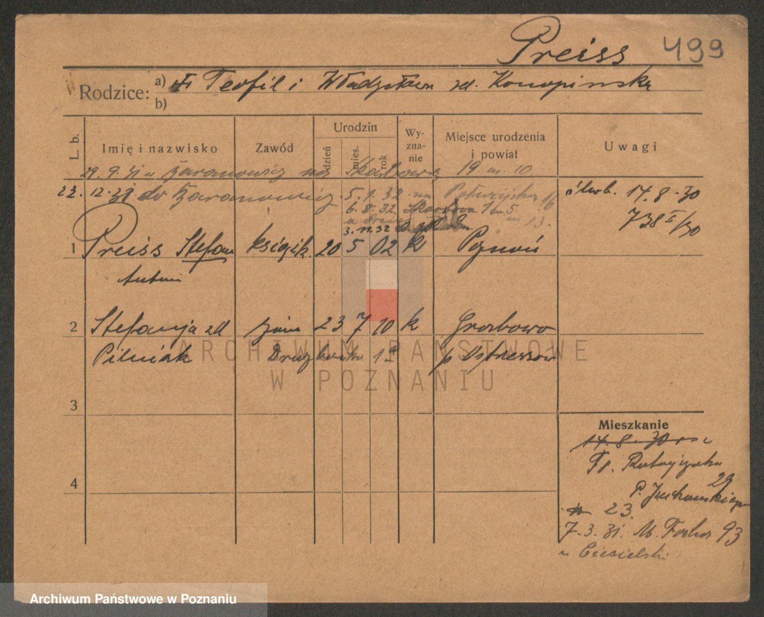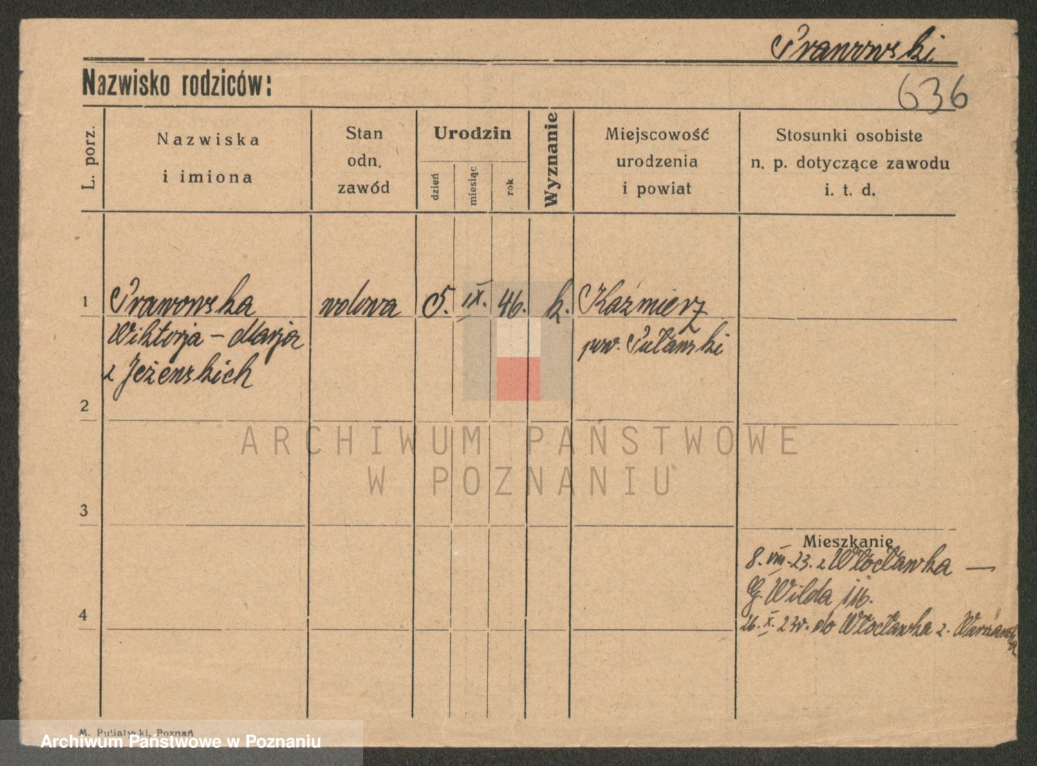 Podgląd karty osobowej dostępny jest po kliknięciu na nazwisko lub ikonkę karty. Można dokonywać powiększenia (ikony na górze) lub przechodzić między kolejnymi skanami (strzałki po bokach).