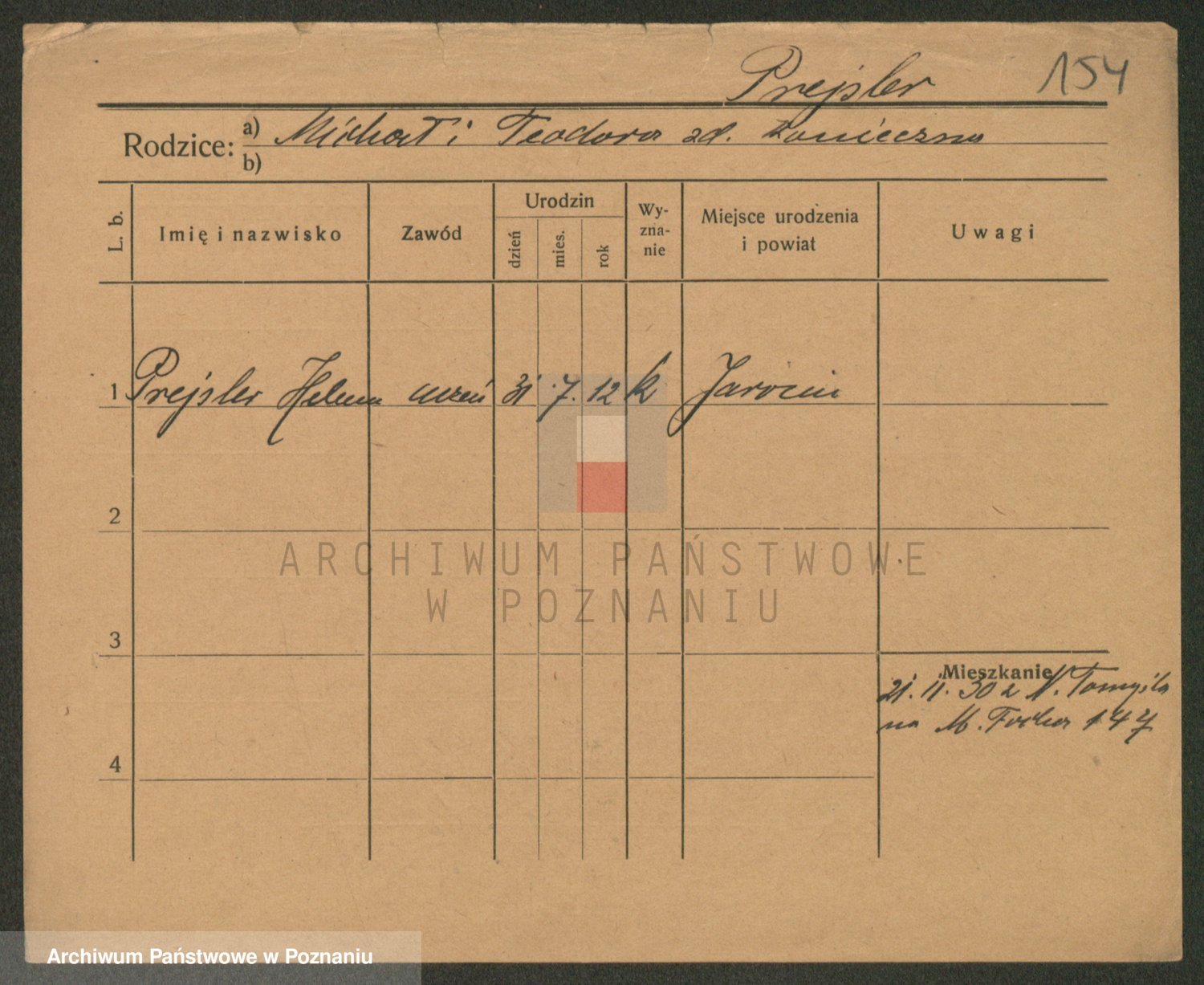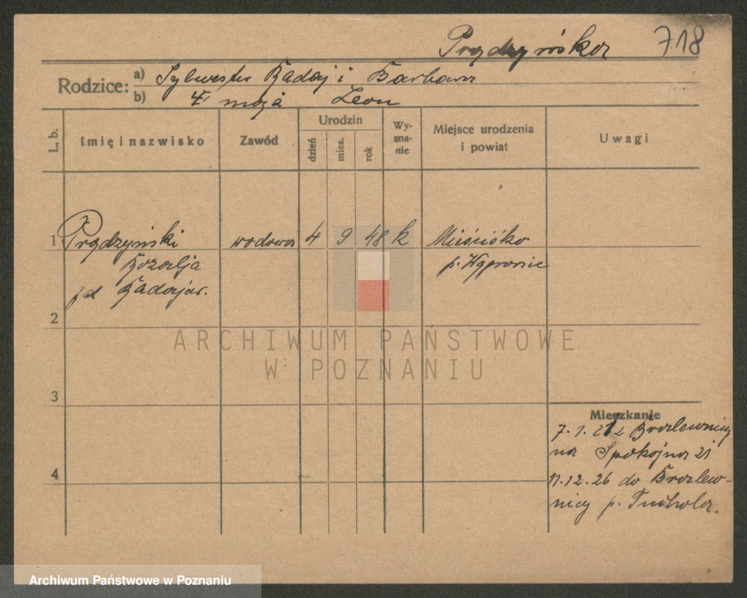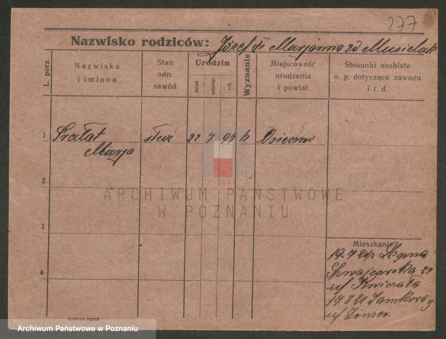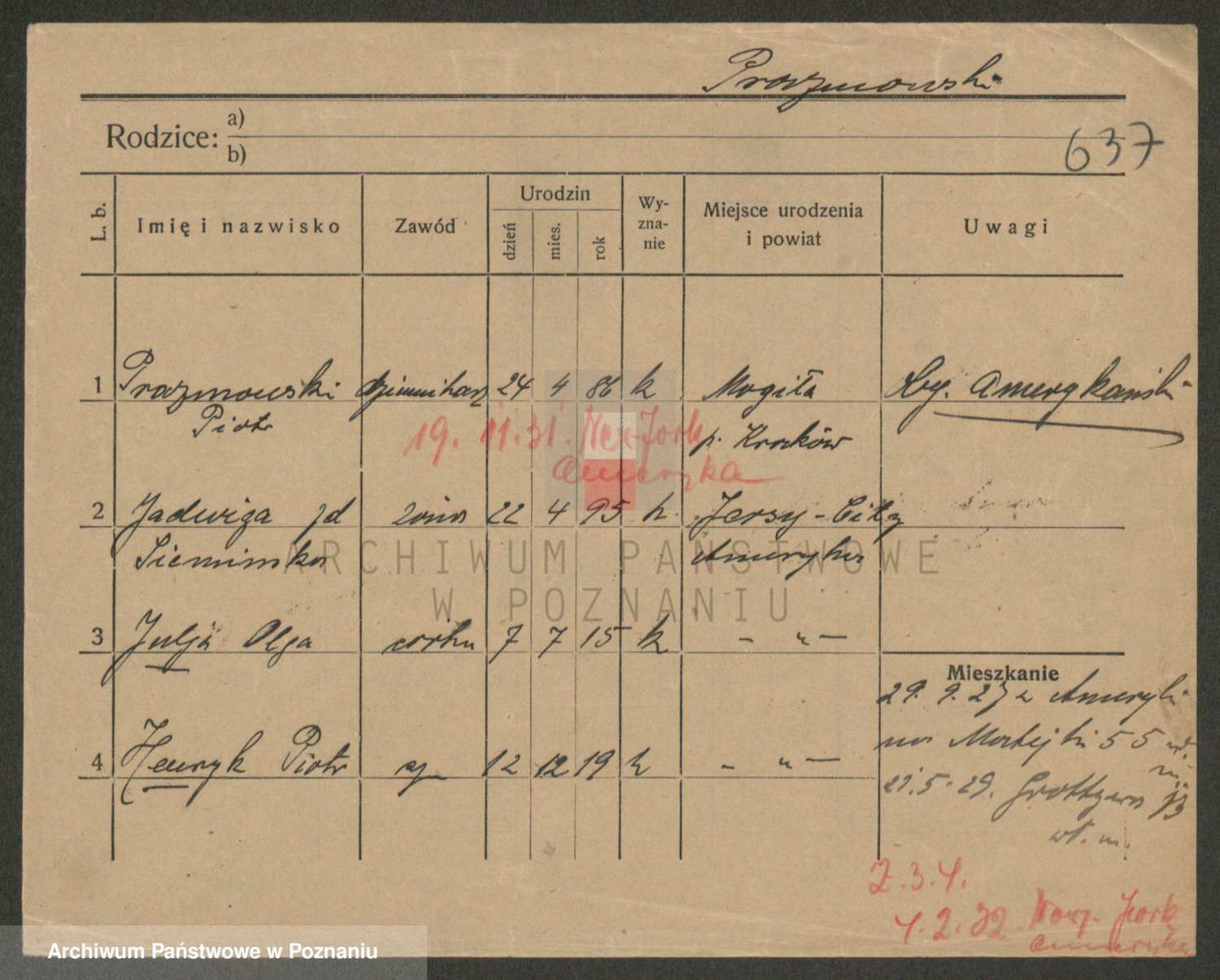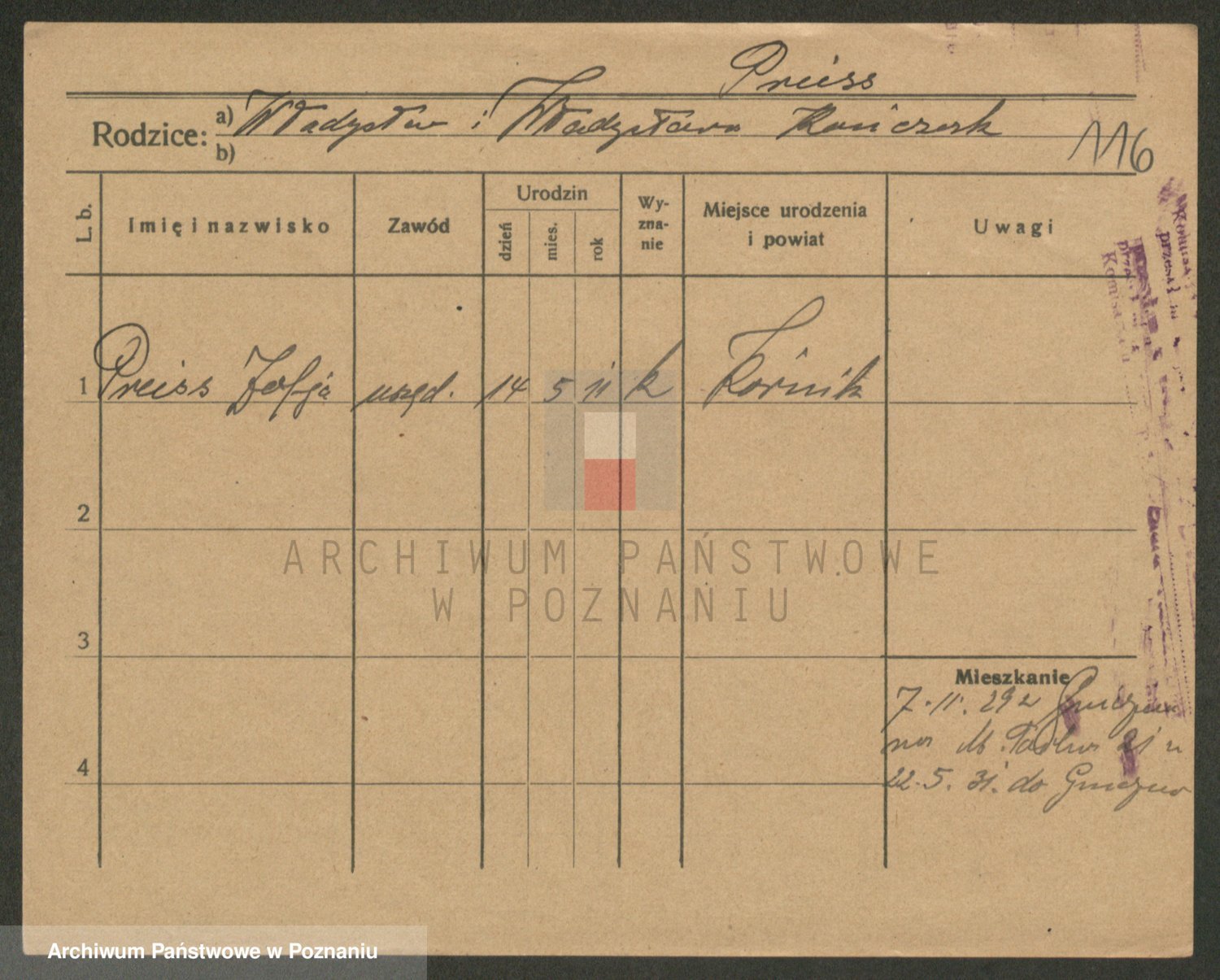 Podgląd karty osobowej dostępny jest po kliknięciu na nazwisko lub ikonkę karty. Można dokonywać powiększenia (ikony na górze) lub przechodzić między kolejnymi skanami (strzałki po bokach).