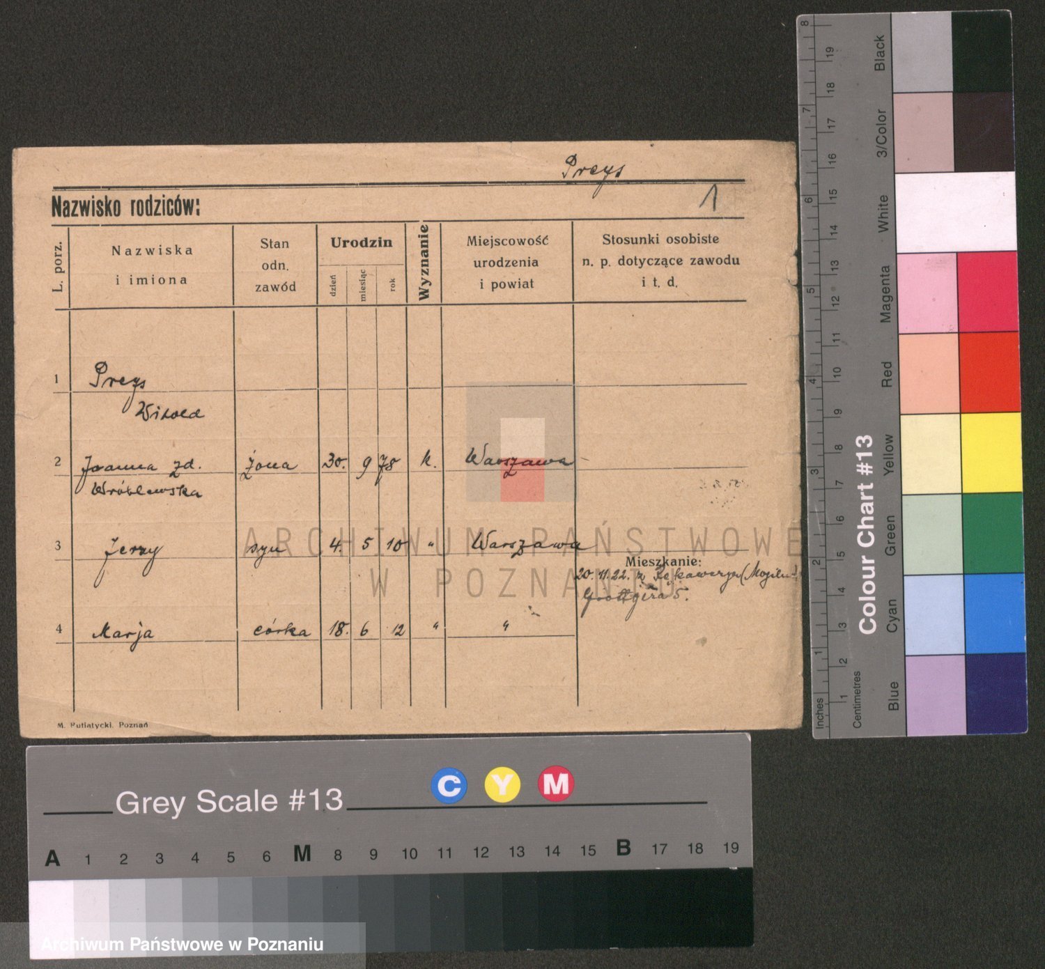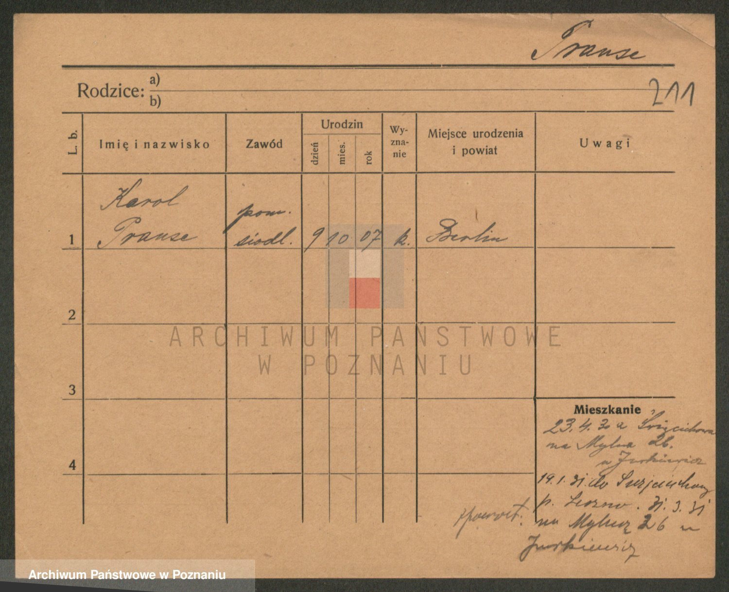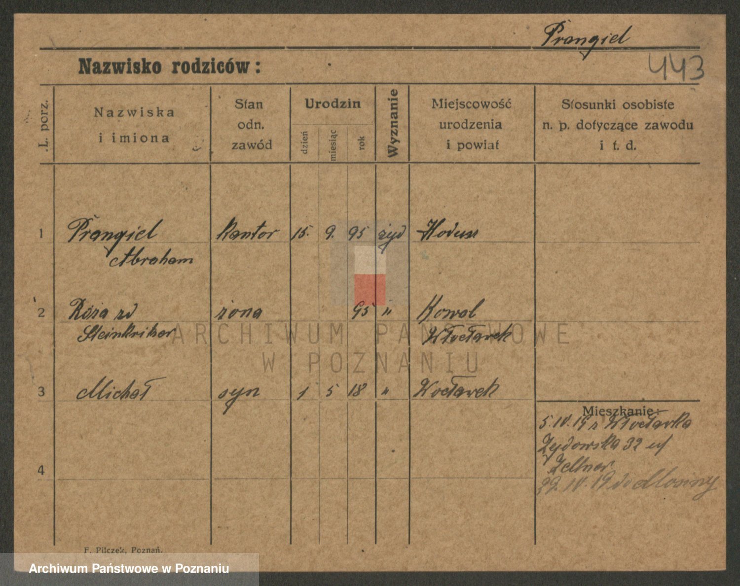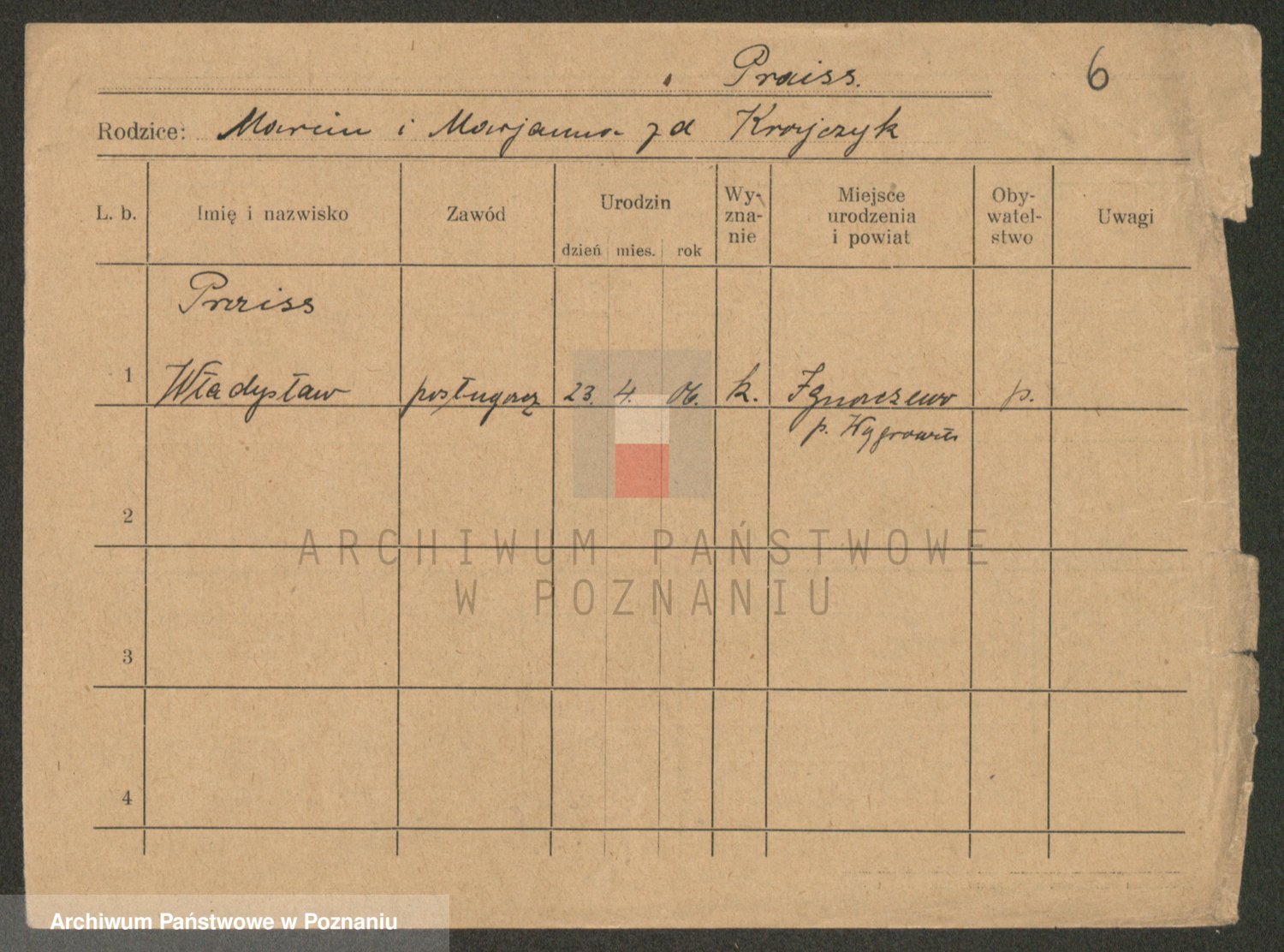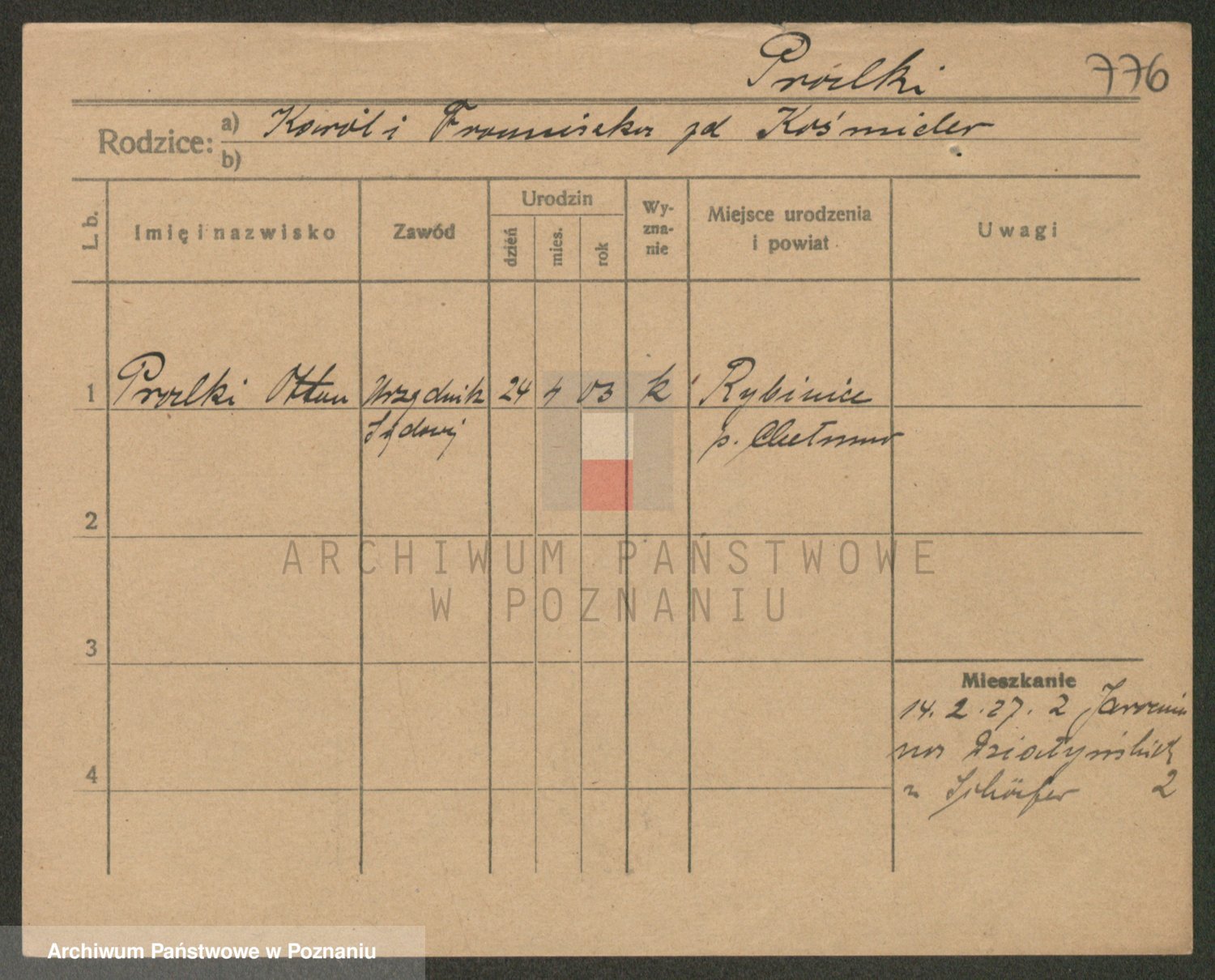 Podgląd karty osobowej dostępny jest po kliknięciu na nazwisko lub ikonkę karty. Można dokonywać powiększenia (ikony na górze) lub przechodzić między kolejnymi skanami (strzałki po bokach).