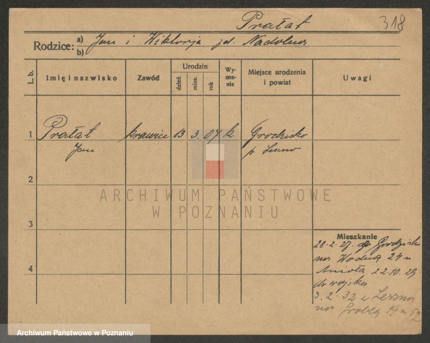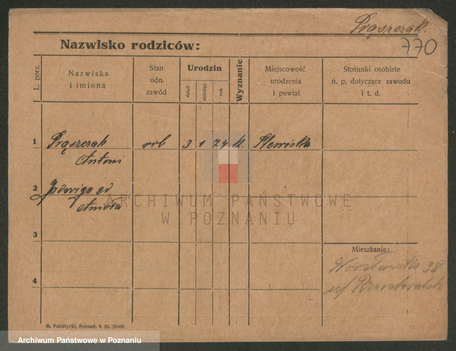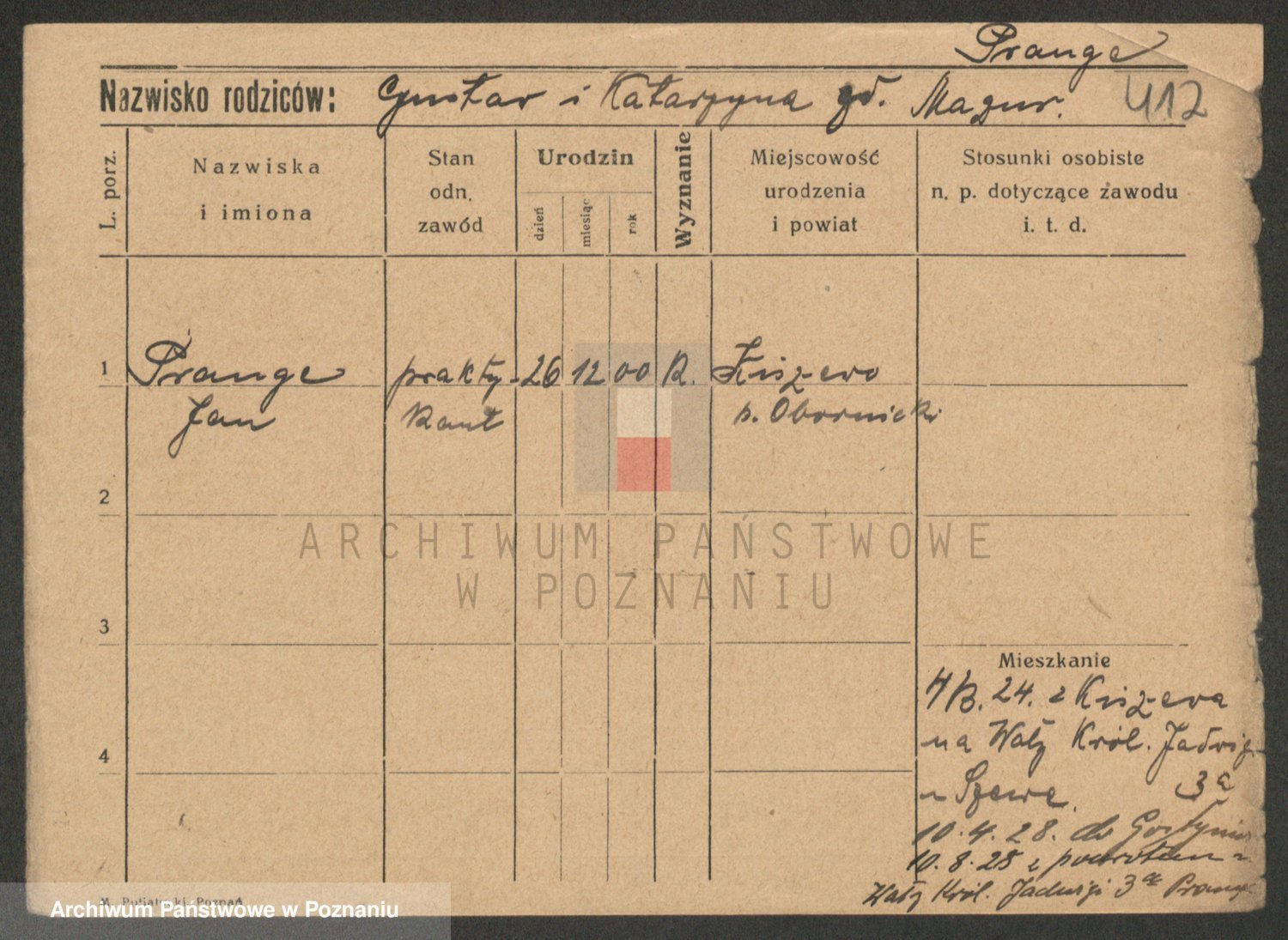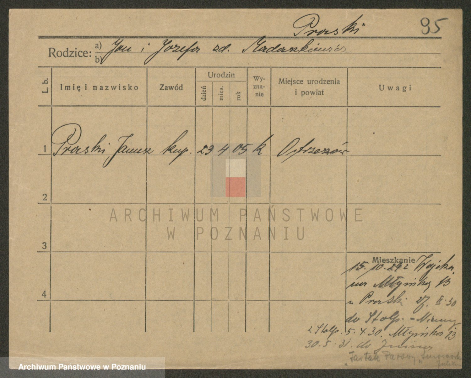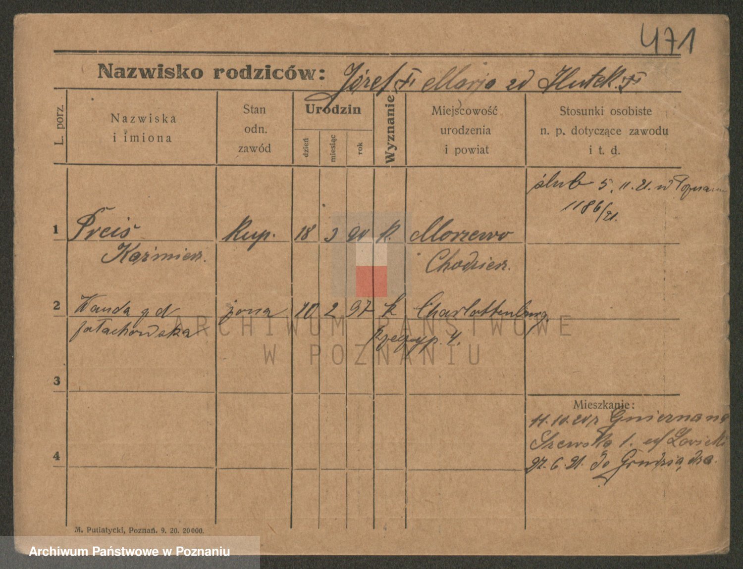 Podgląd karty osobowej dostępny jest po kliknięciu na nazwisko lub ikonkę karty. Można dokonywać powiększenia (ikony na górze) lub przechodzić między kolejnymi skanami (strzałki po bokach).