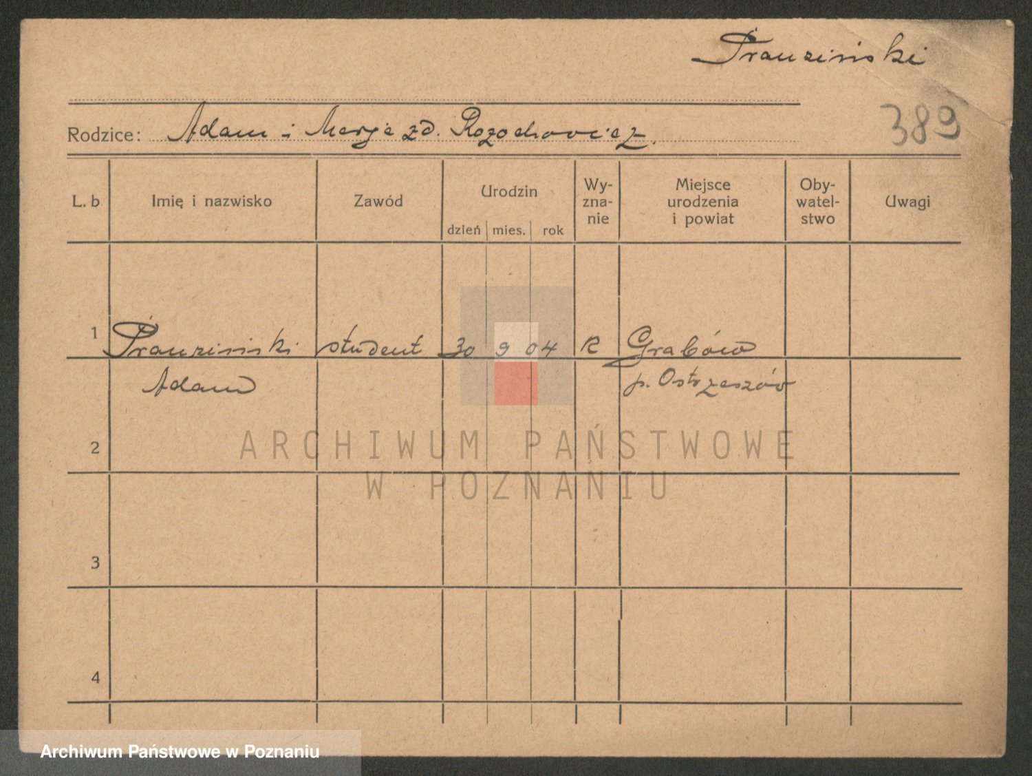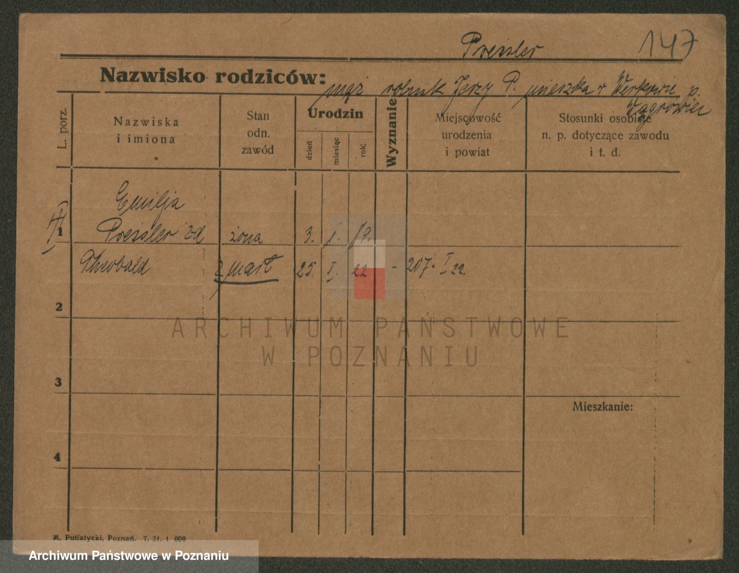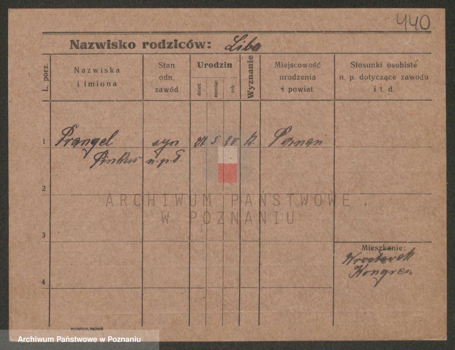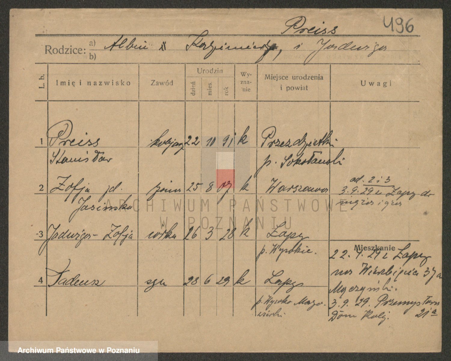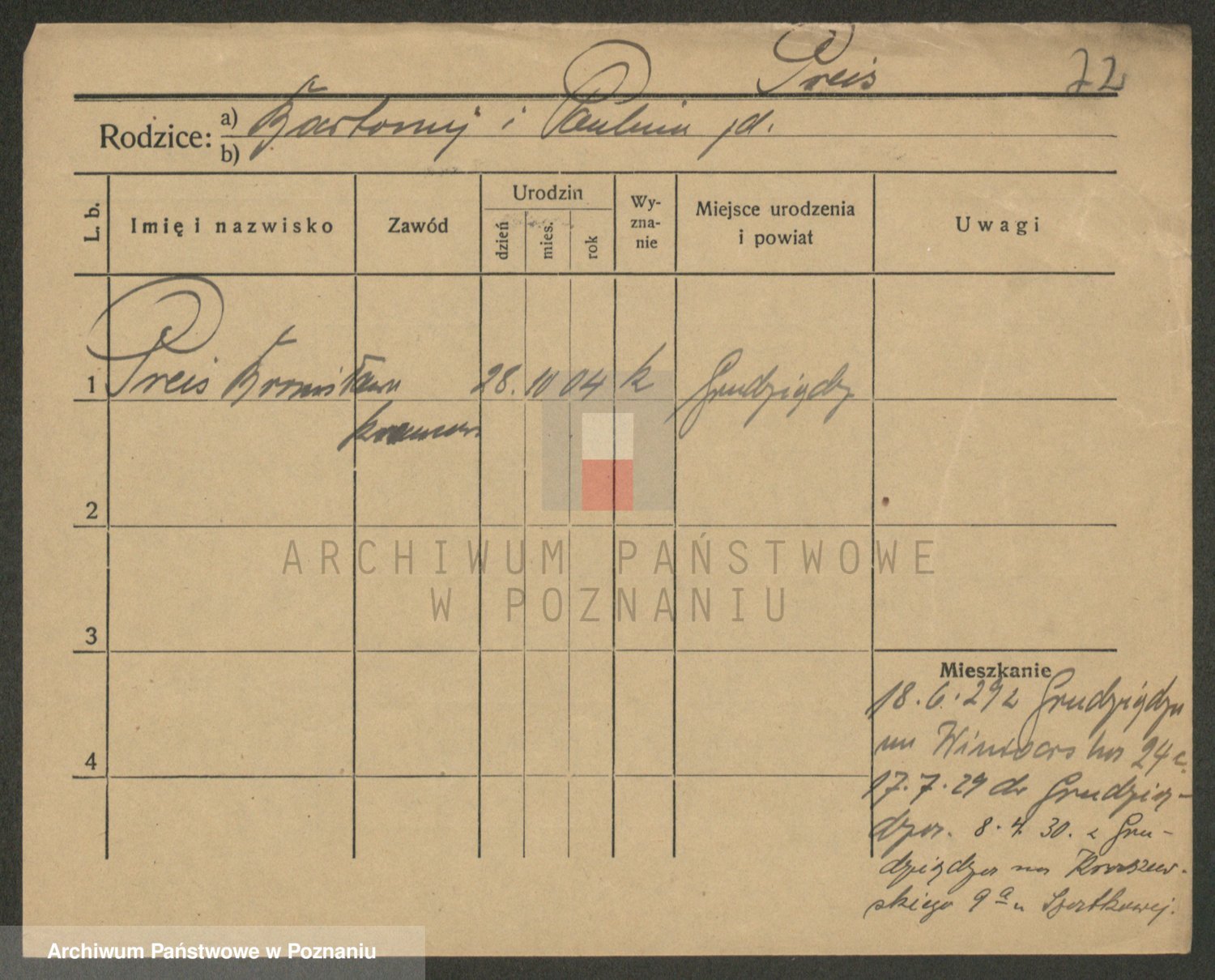 Podgląd karty osobowej dostępny jest po kliknięciu na nazwisko lub ikonkę karty. Można dokonywać powiększenia (ikony na górze) lub przechodzić między kolejnymi skanami (strzałki po bokach).